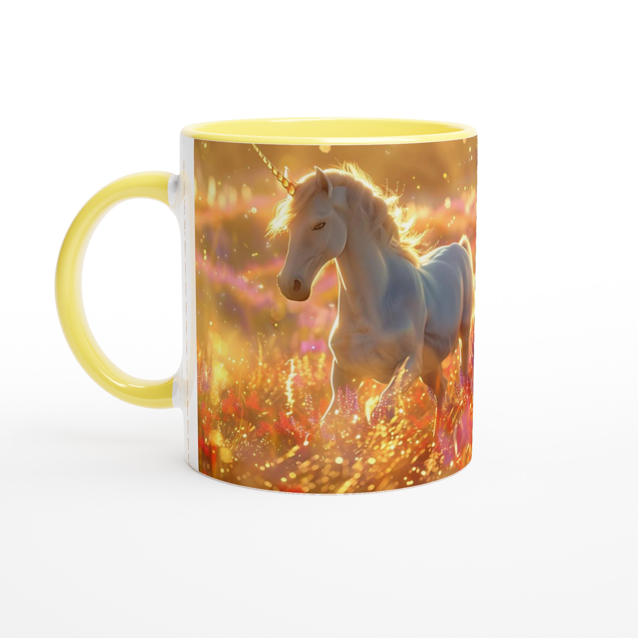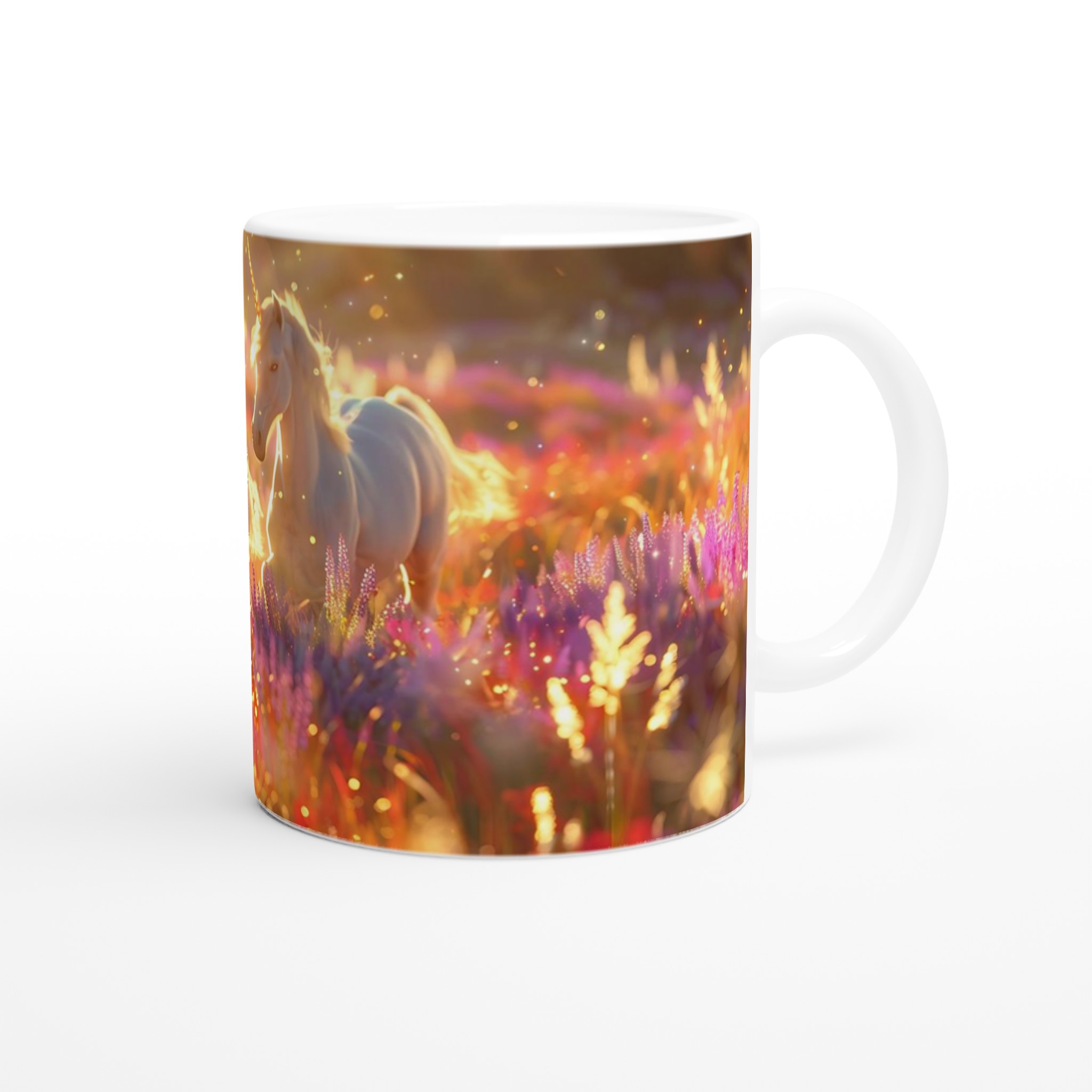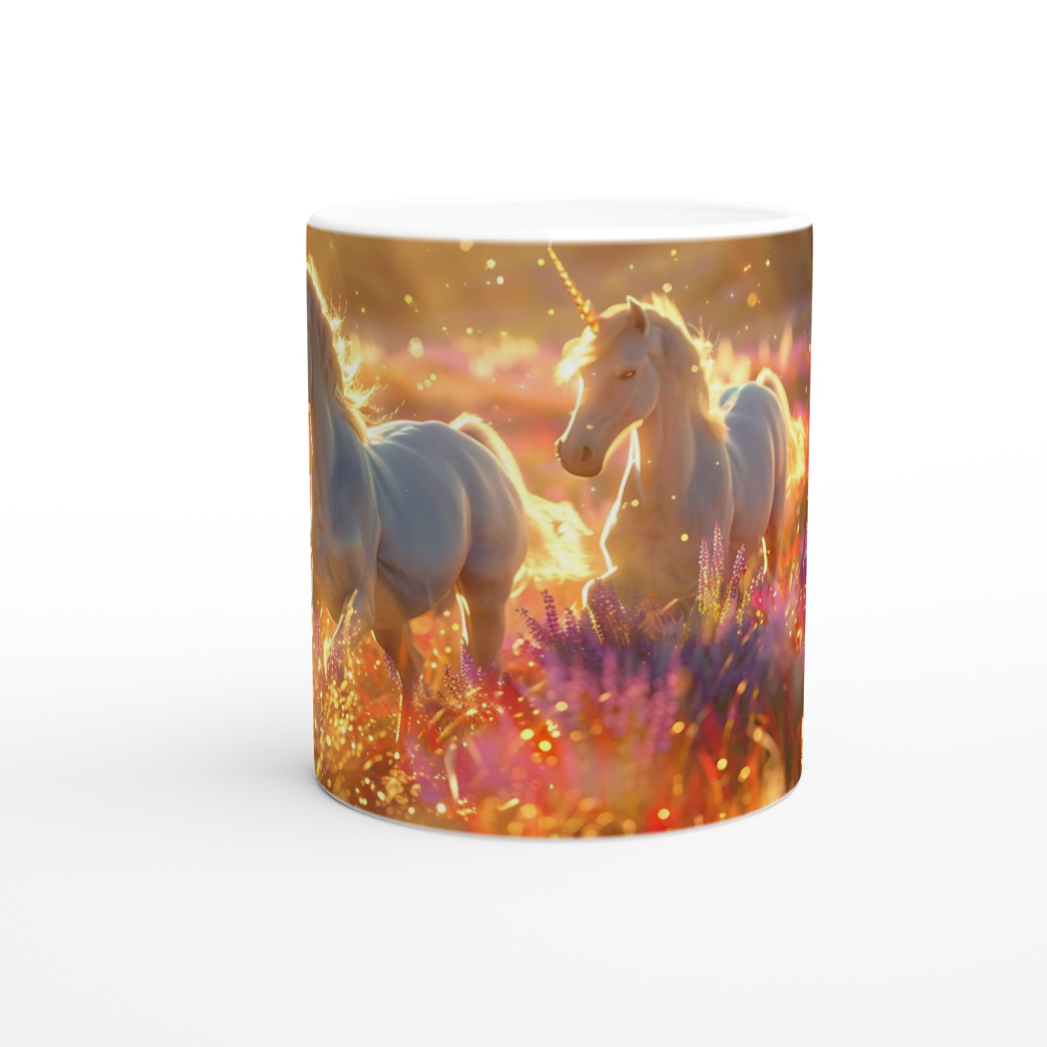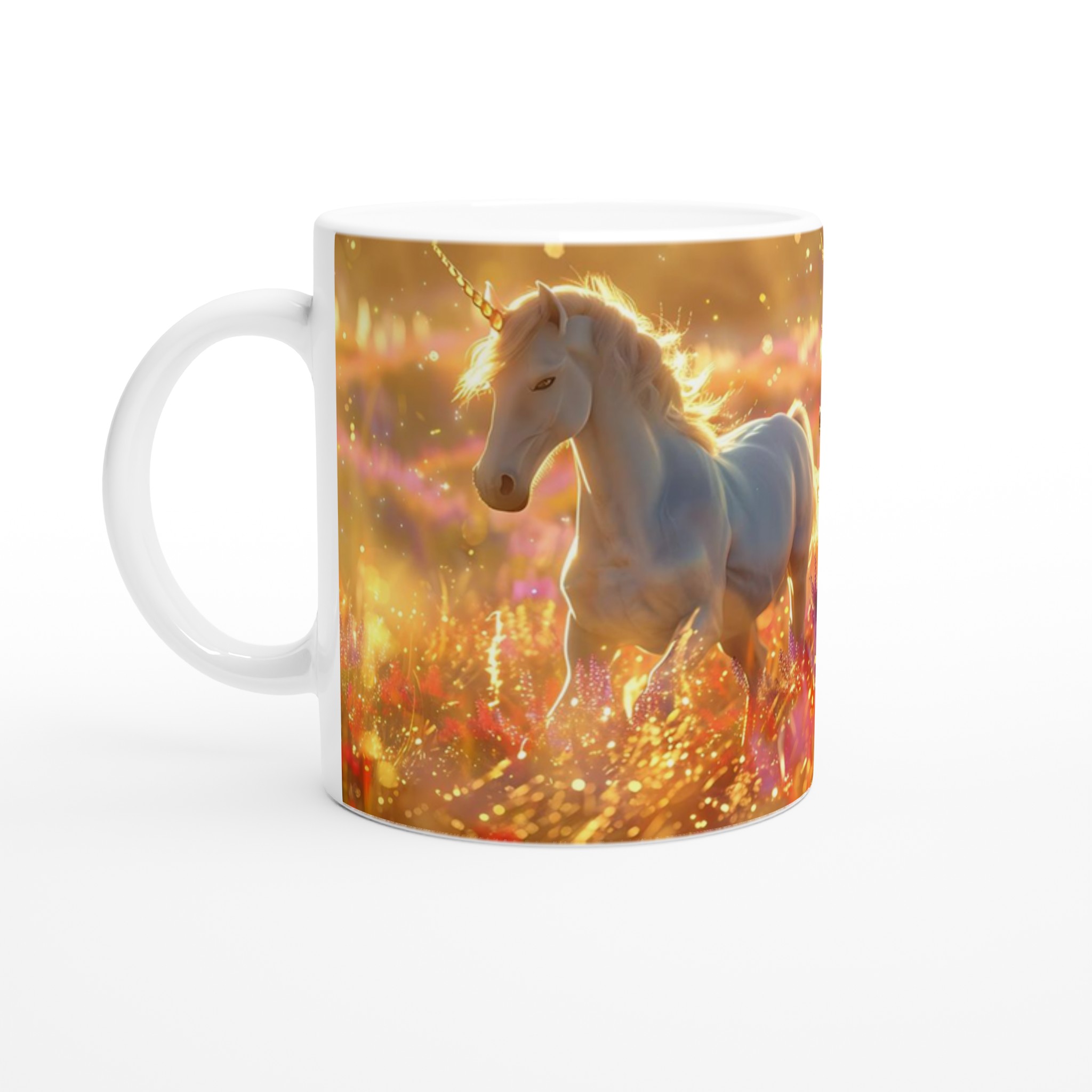 Fånga magin i varje klunk med vår förtrollande Keramiska Mugg, prydd med majestätiska enhörningar som dansar i ett hav av gyllene solsken och skimrande blommor. Denna mugg är mer än bara ett kärl; den är en inbjudan till en sagolik värld, perfekt för att lysa upp din morgonrutin eller addera en touch av fantasi till din fikastund.