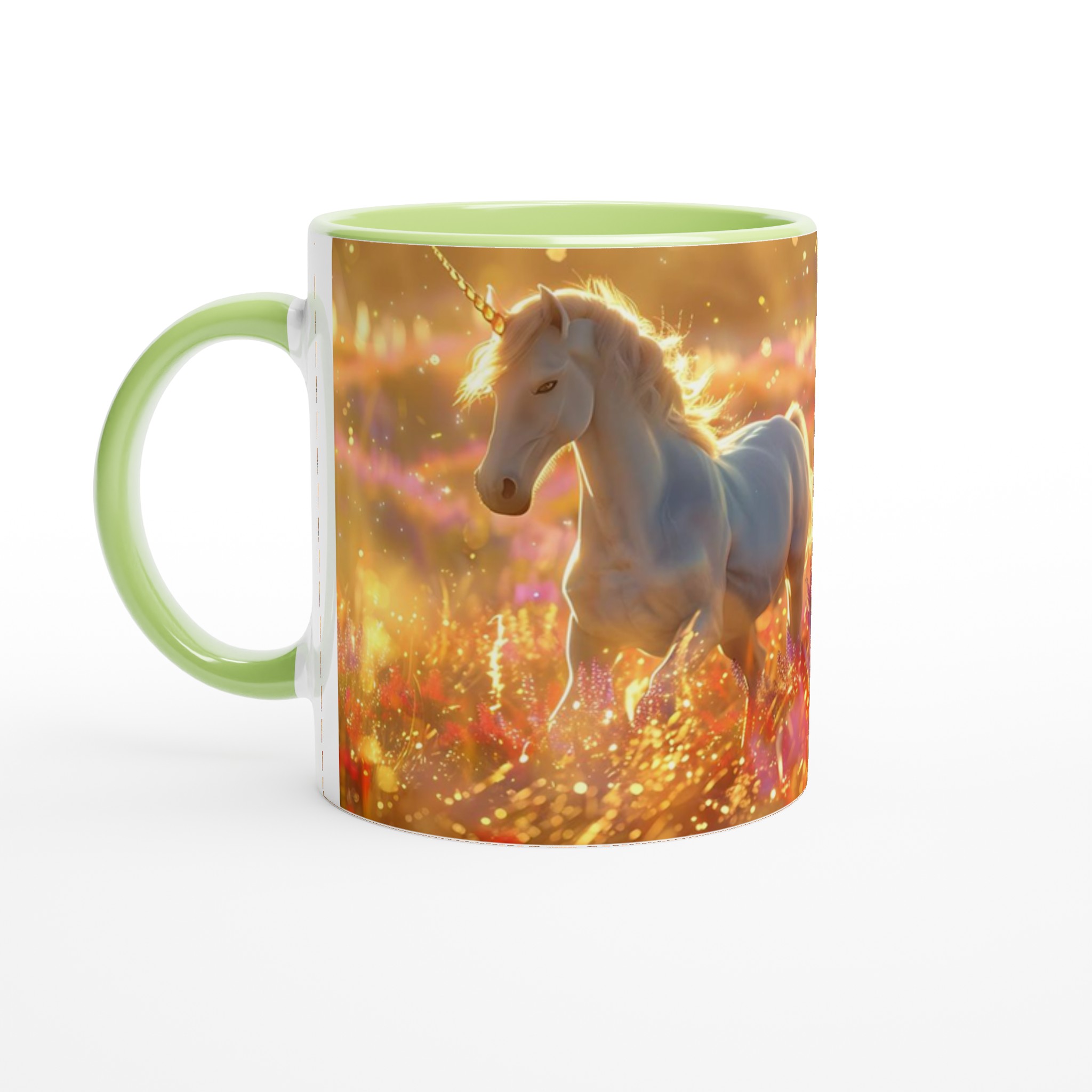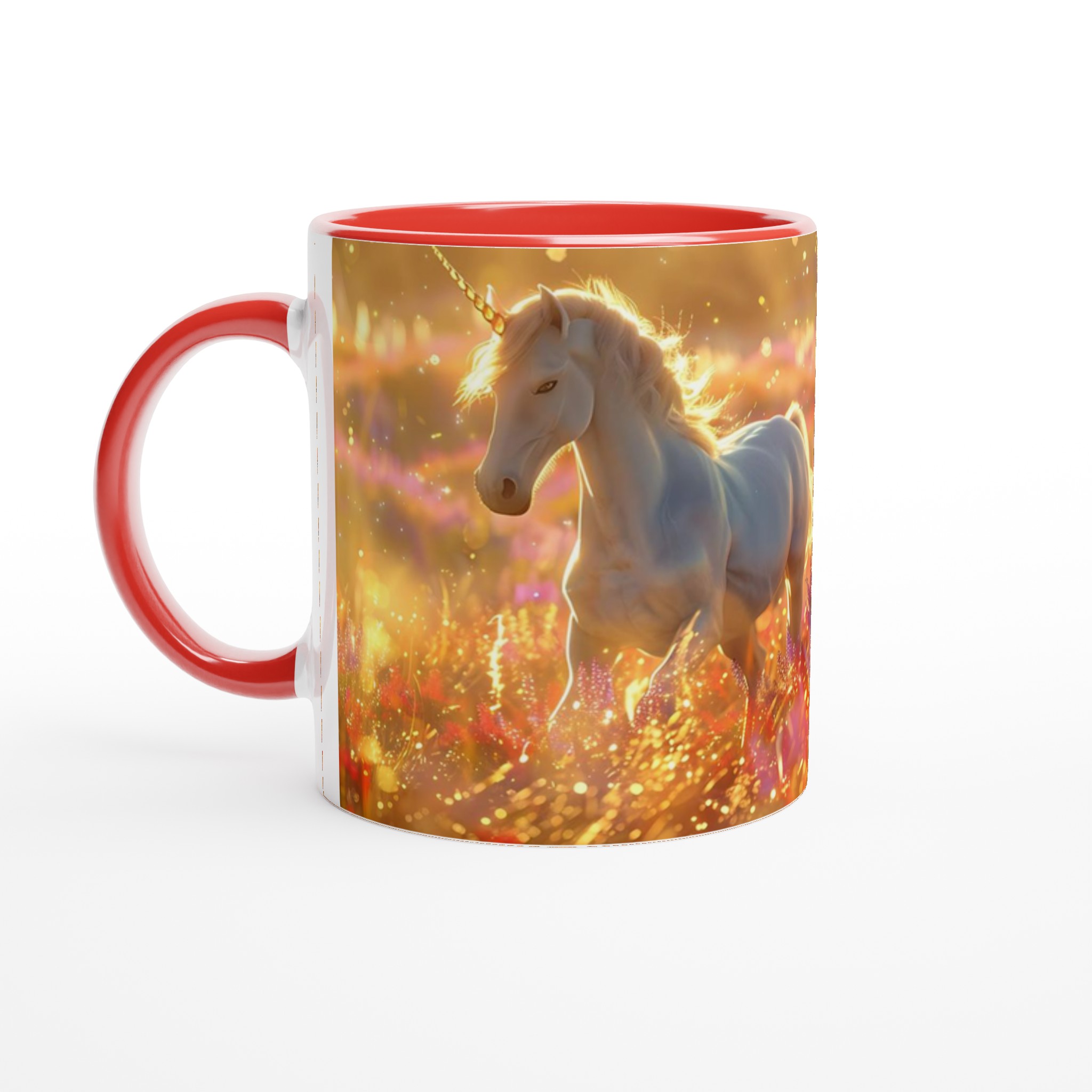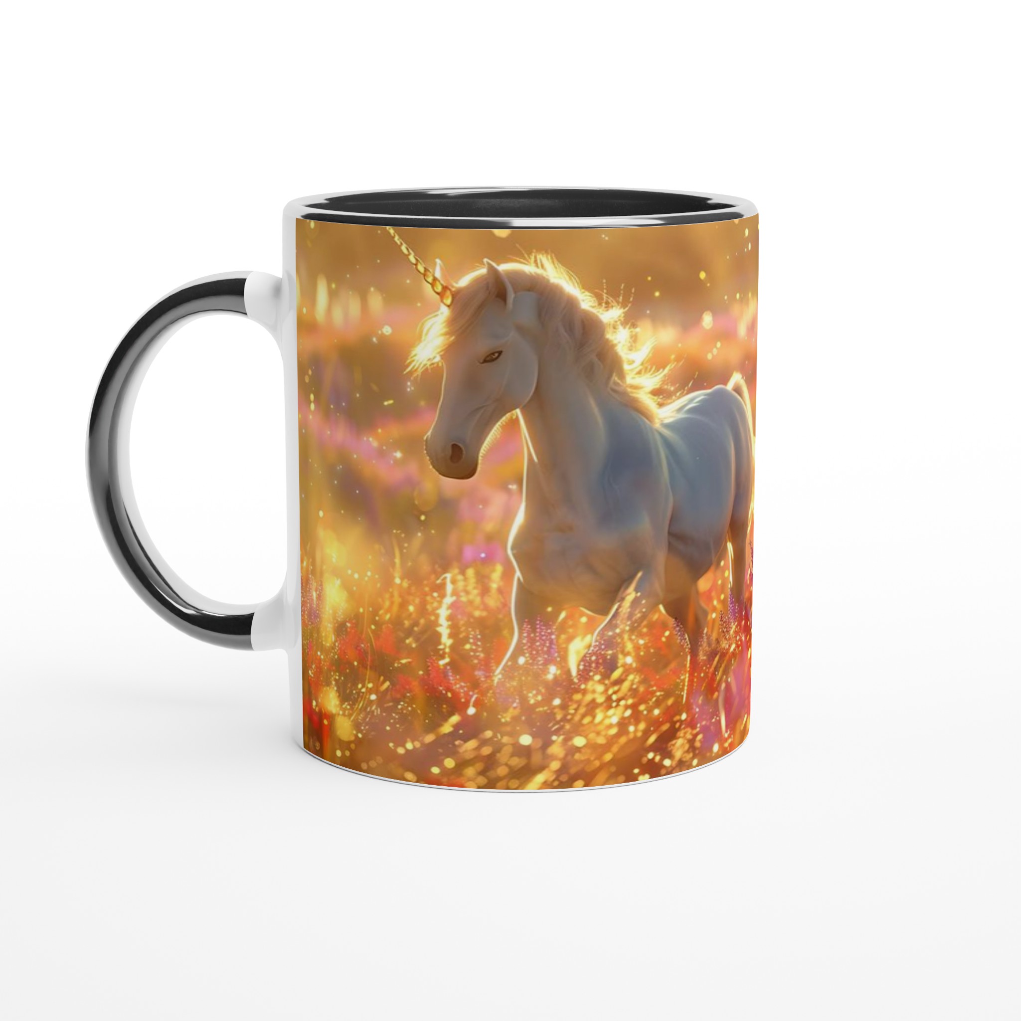 Fånga magin i varje klunk med vår förtrollande Keramiska Mugg, prydd med majestätiska enhörningar som dansar i ett hav av gyllene solsken och skimrande blommor. Denna mugg är mer än bara ett kärl; den är en inbjudan till en sagolik värld, perfekt för att lysa upp din morgonrutin eller addera en touch av fantasi till din fikastund.