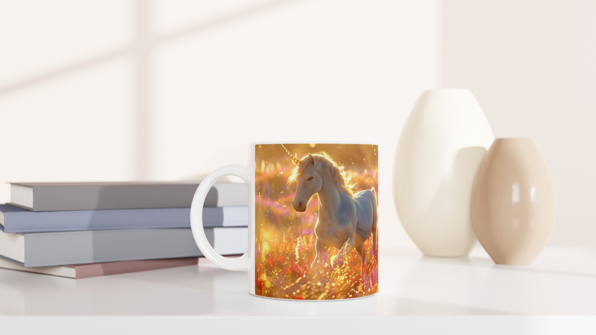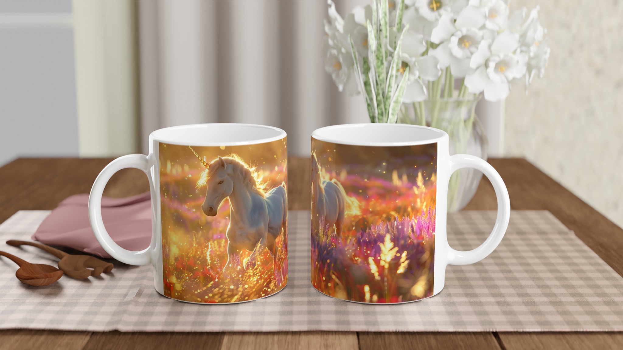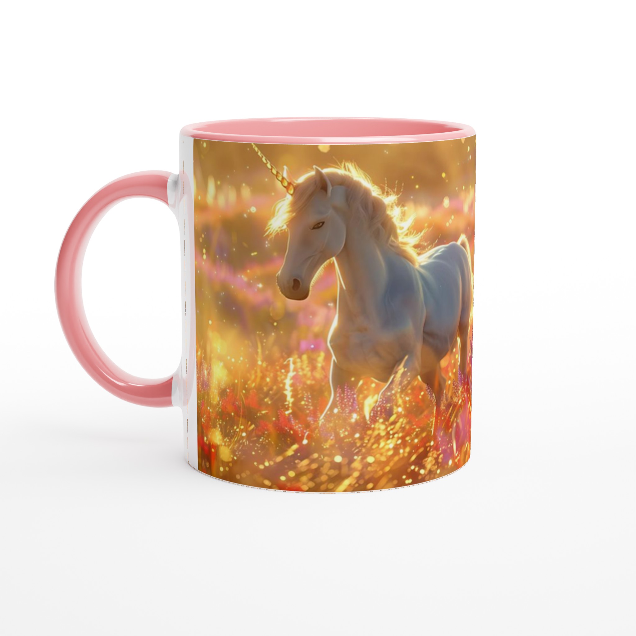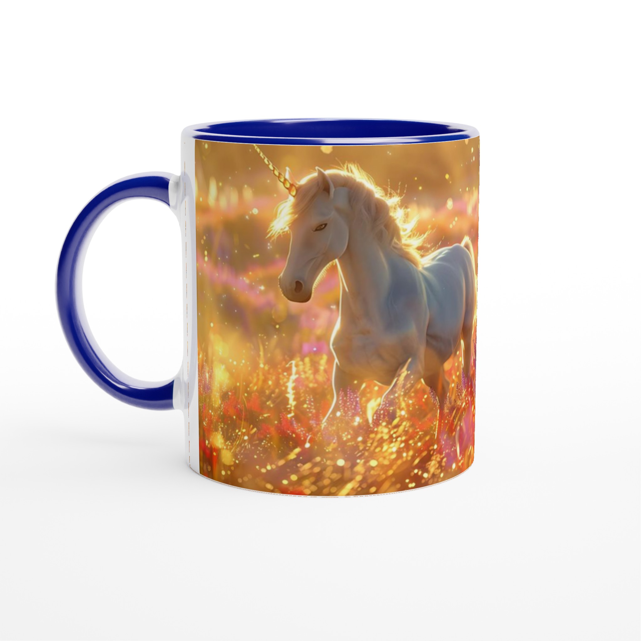 Fånga magin i varje klunk med vår förtrollande Keramiska Mugg, prydd med majestätiska enhörningar som dansar i ett hav av gyllene solsken och skimrande blommor. Denna mugg är mer än bara ett kärl; den är en inbjudan till en sagolik värld, perfekt för att lysa upp din morgonrutin eller addera en touch av fantasi till din fikastund.