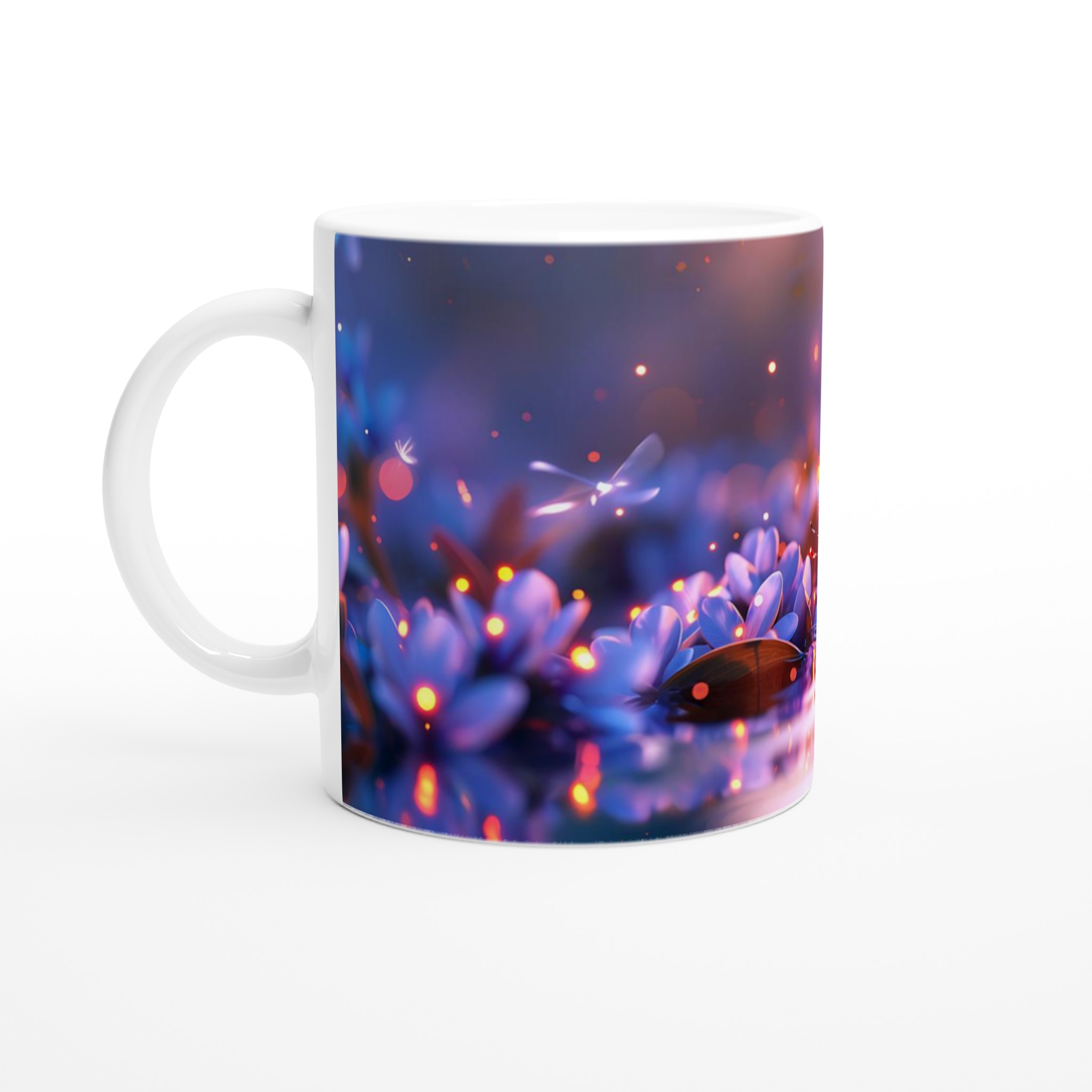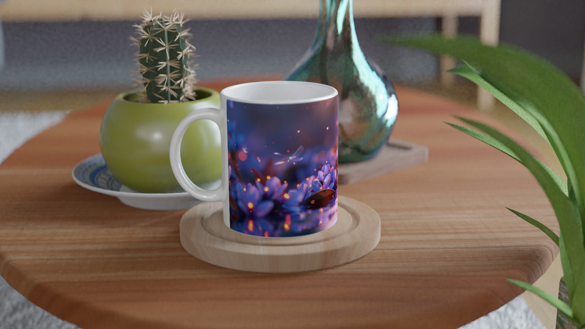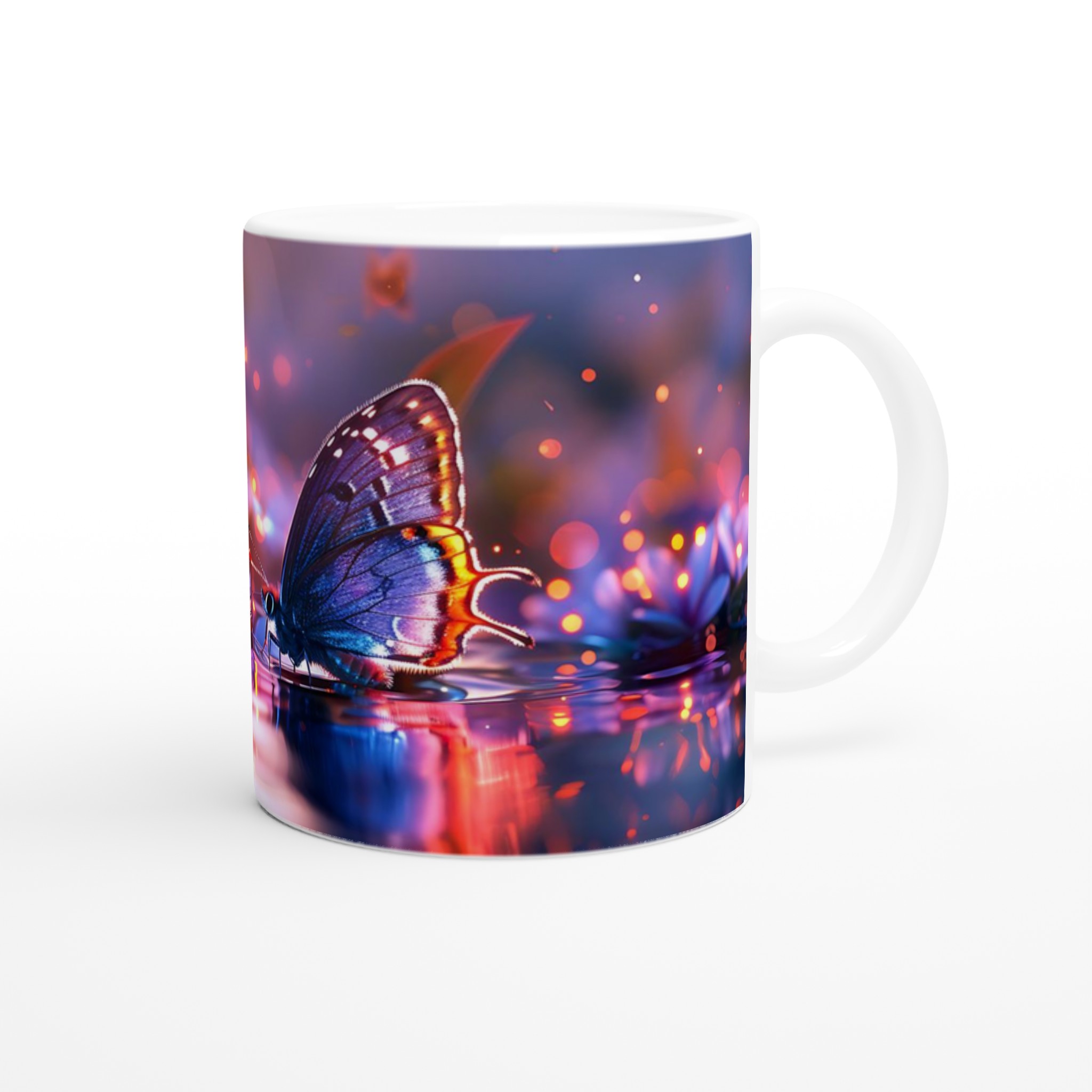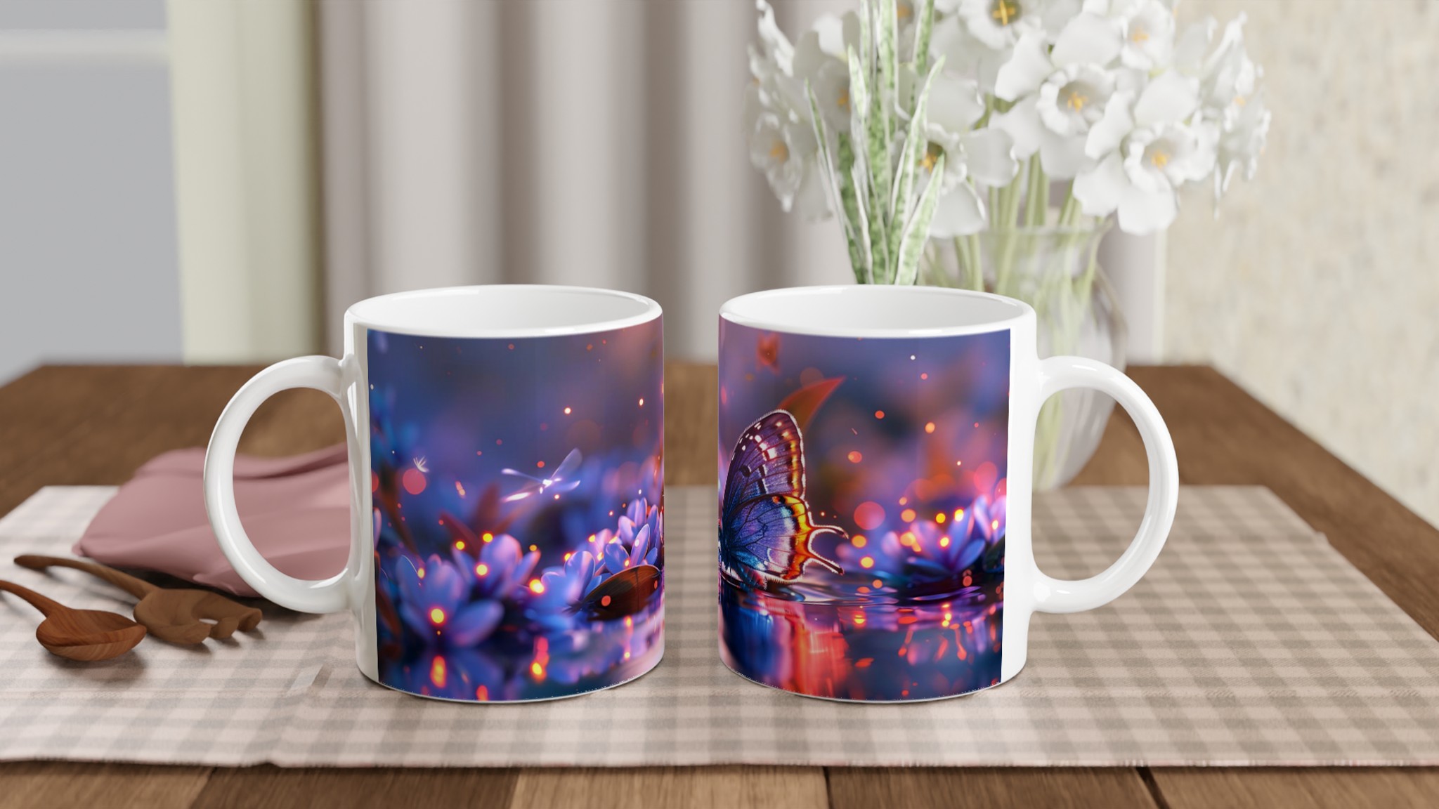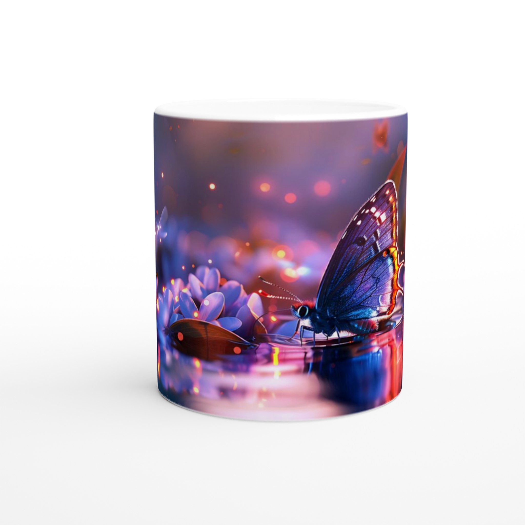 Låt dig svepas med av den magiska atmosfären med vår förtrollande keramiska mugg, som fångar skönheten hos en glödande fjäril i ett sagolikt landskap. Denna mugg blir snabbt en vardagsfavorit, perfekt för morgonkaffet, kvällens varma choklad eller när du bara vill njuta av en kopp te. Den blanka ytan låter det drömska motivet framhävas med klara och levande färger, som håller sig fina även efter många turer i mikron och diskmaskinen.