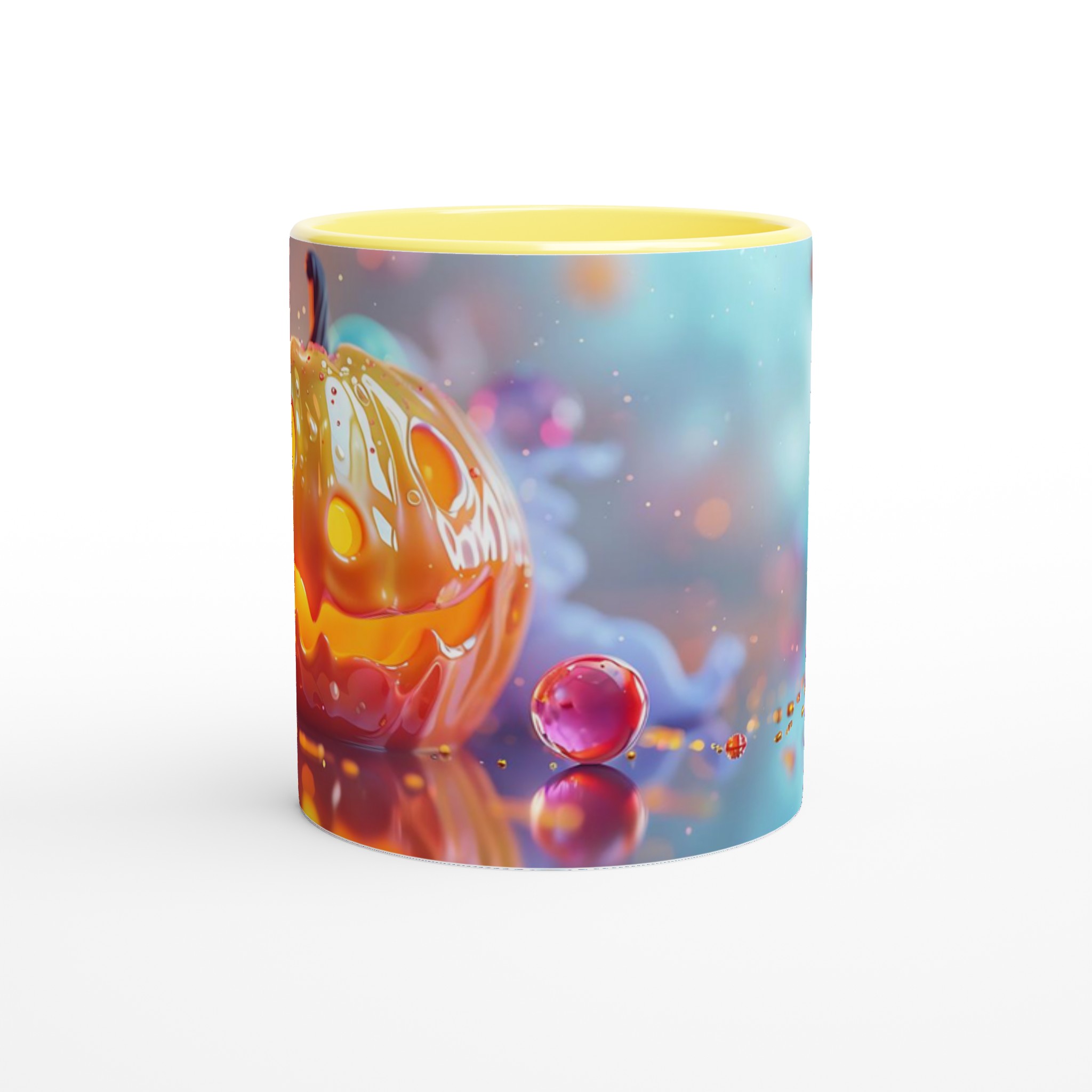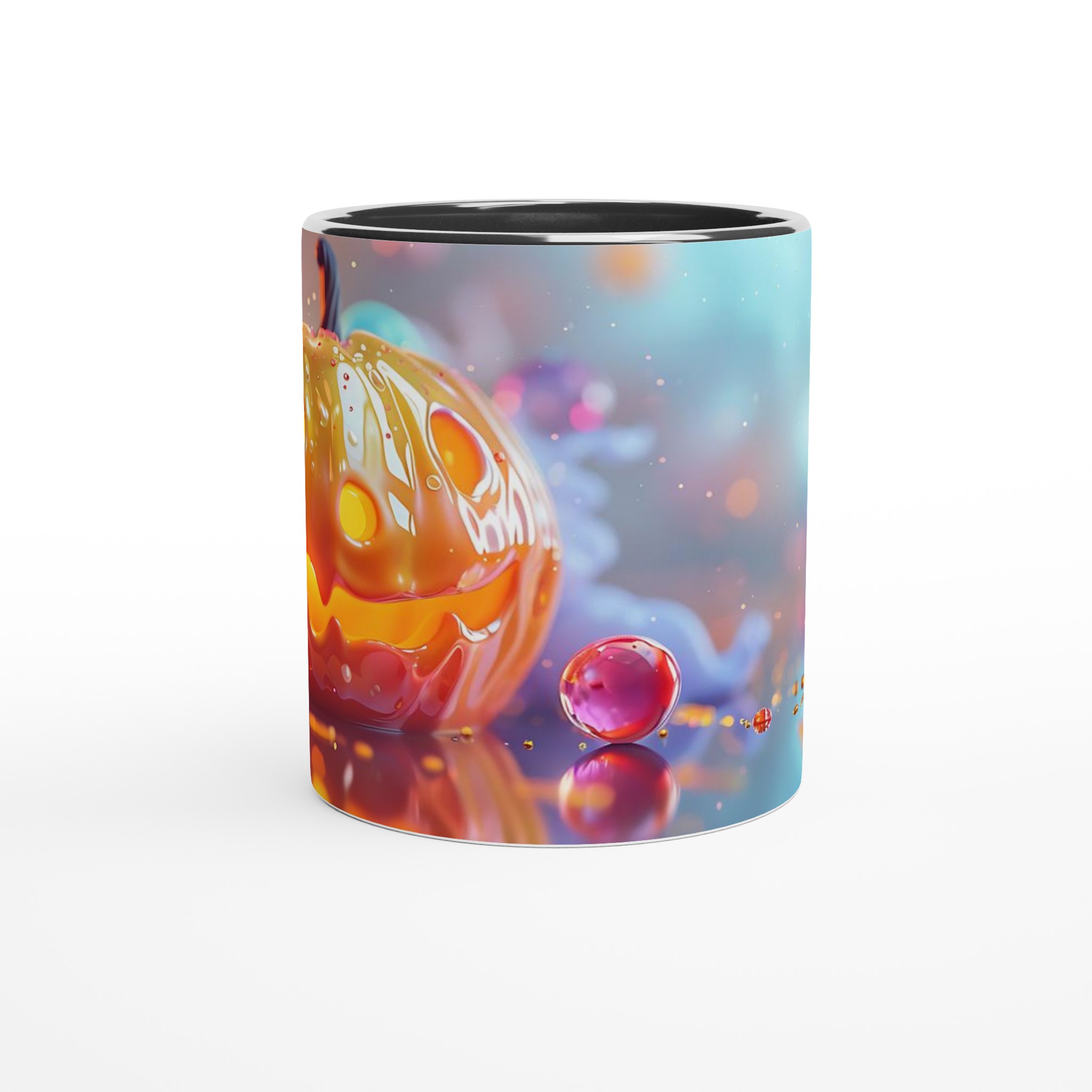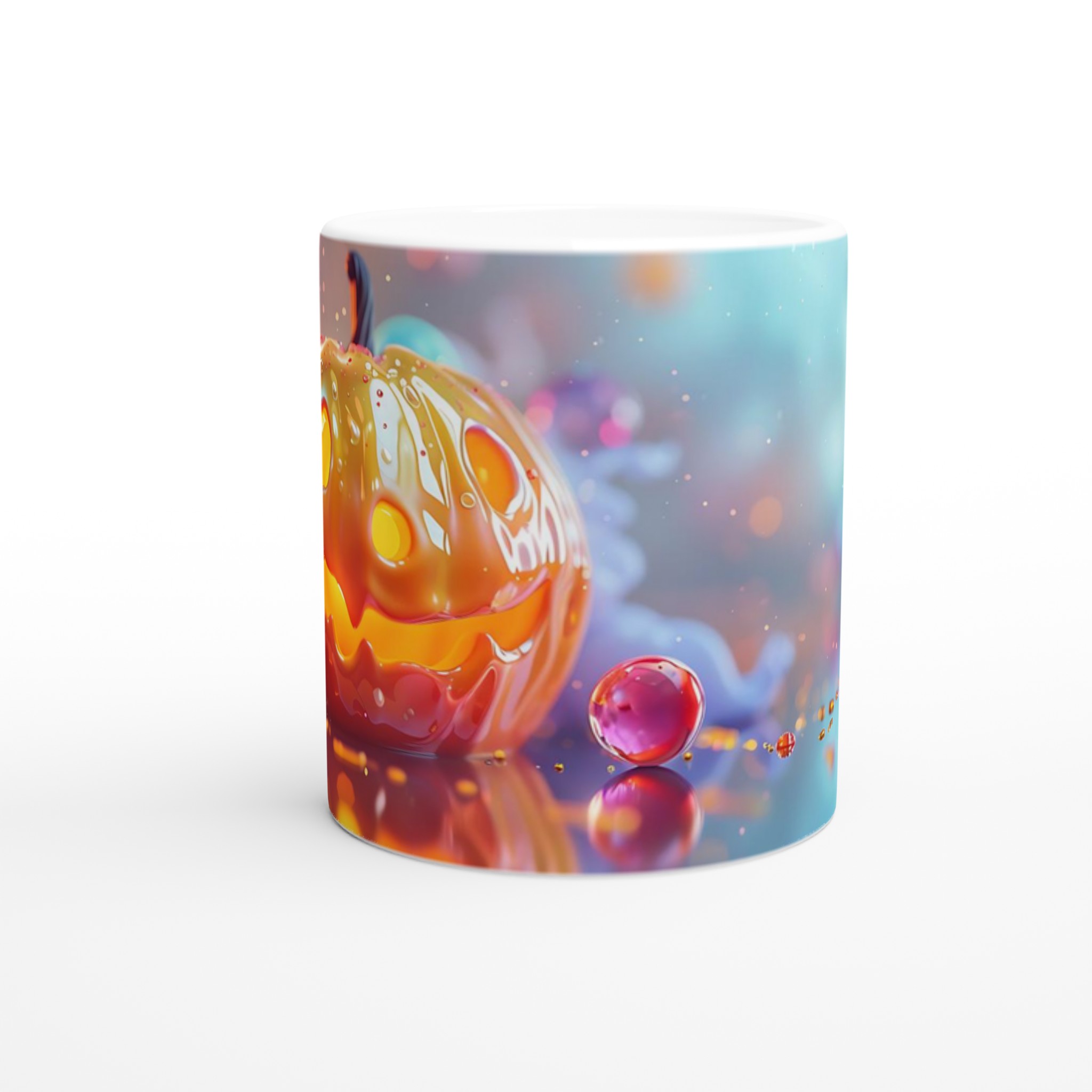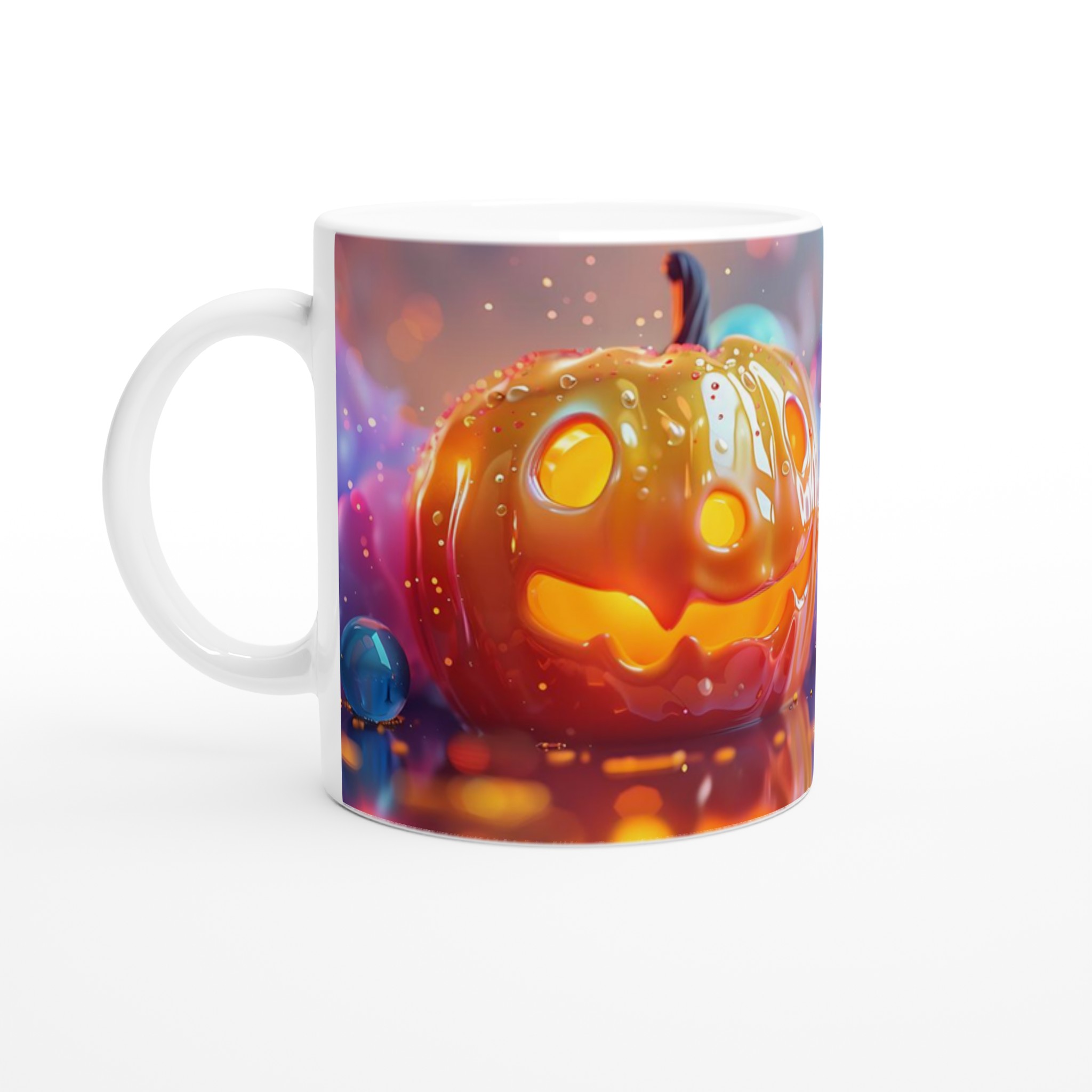 Fånga den magiska glöden från Halloween varje dag med denna förtrollande keramikmugg! Inspirerad av den lekfulla charmen hos en Jack-o’-Lantern som skimrar i ett hav av drömska bubblor, är denna mugg den perfekta följeslagaren för alla dina favoritdrycker. Oavsett om det är morgonkaffet, en värmande kopp te under kyliga kvällar, eller en festlig varm choklad, kommer denna mugg att fylla din stund med glädje och mystik.