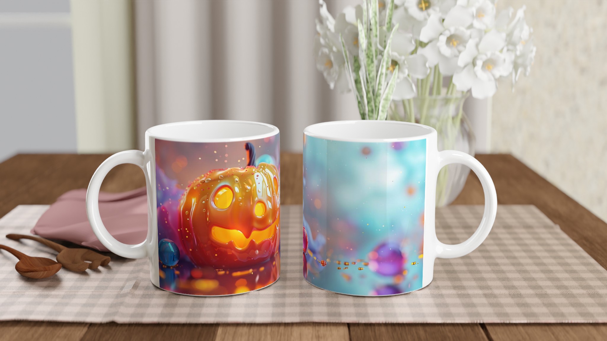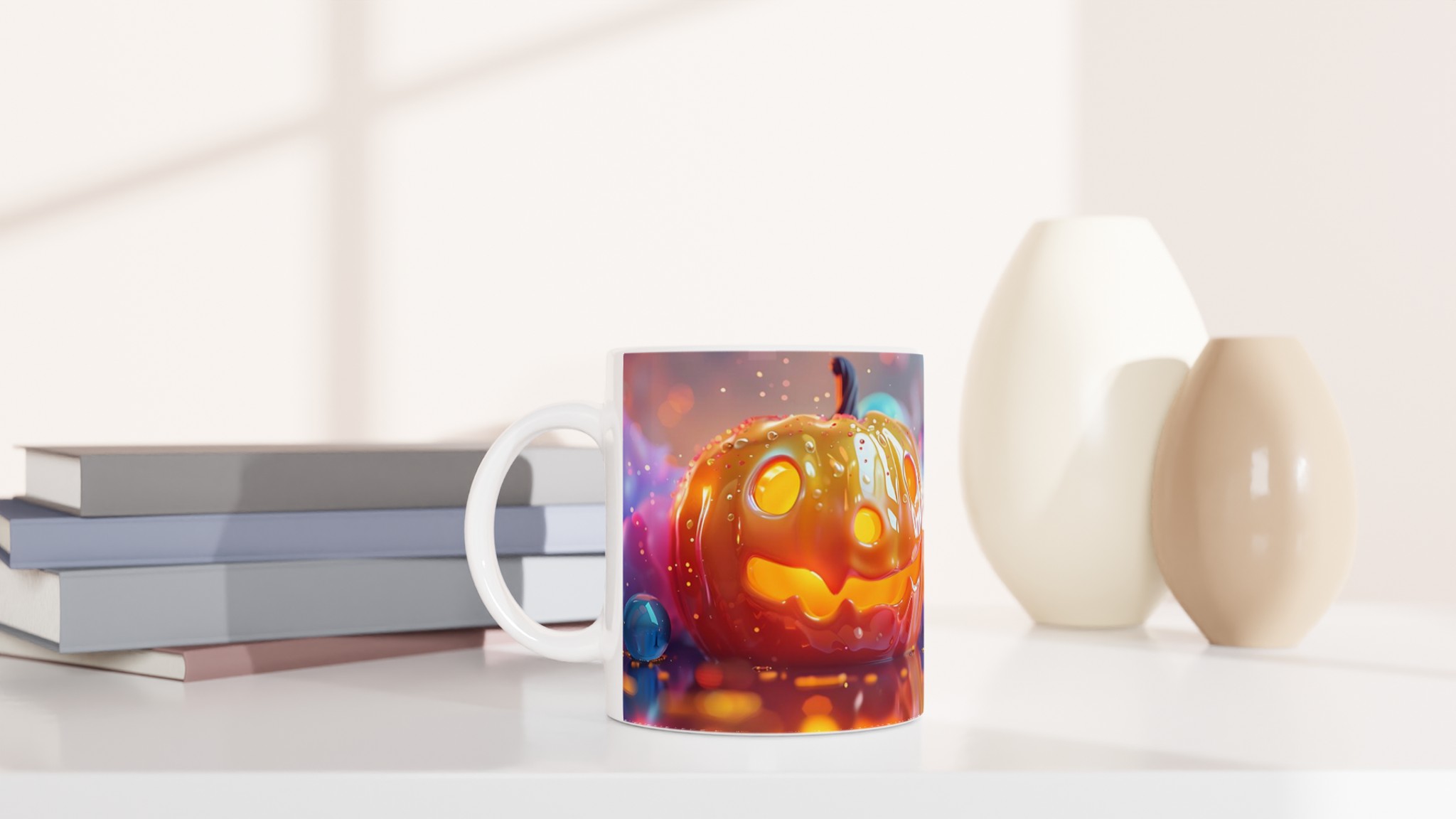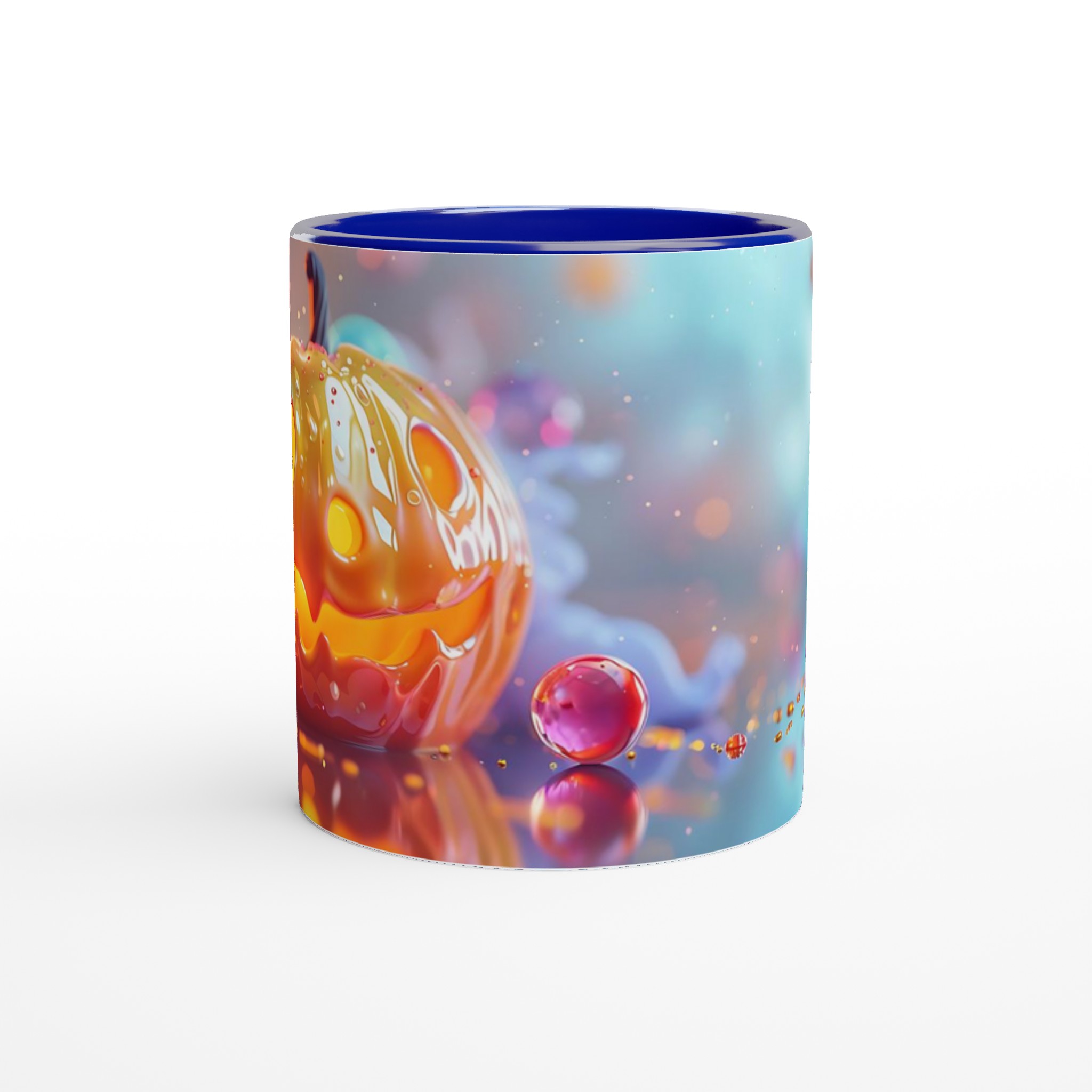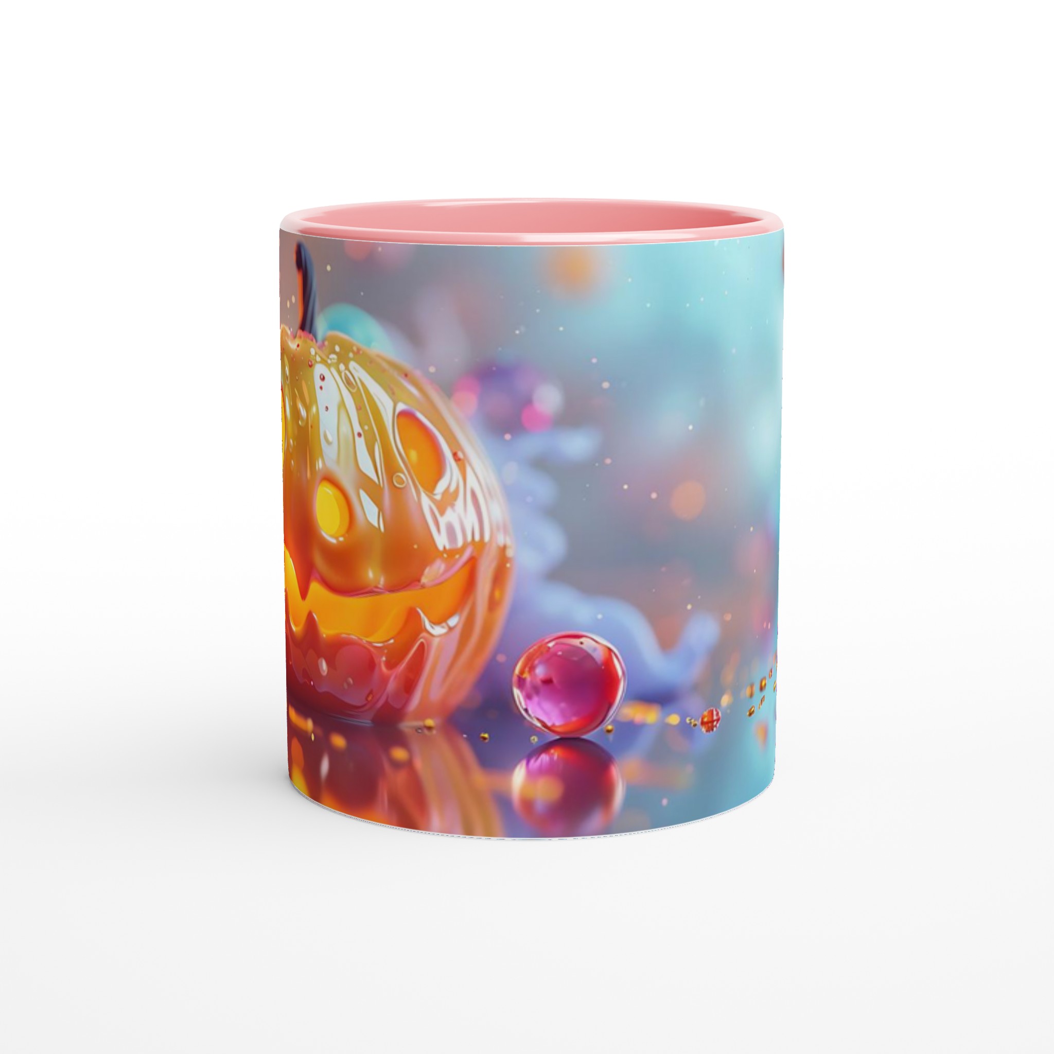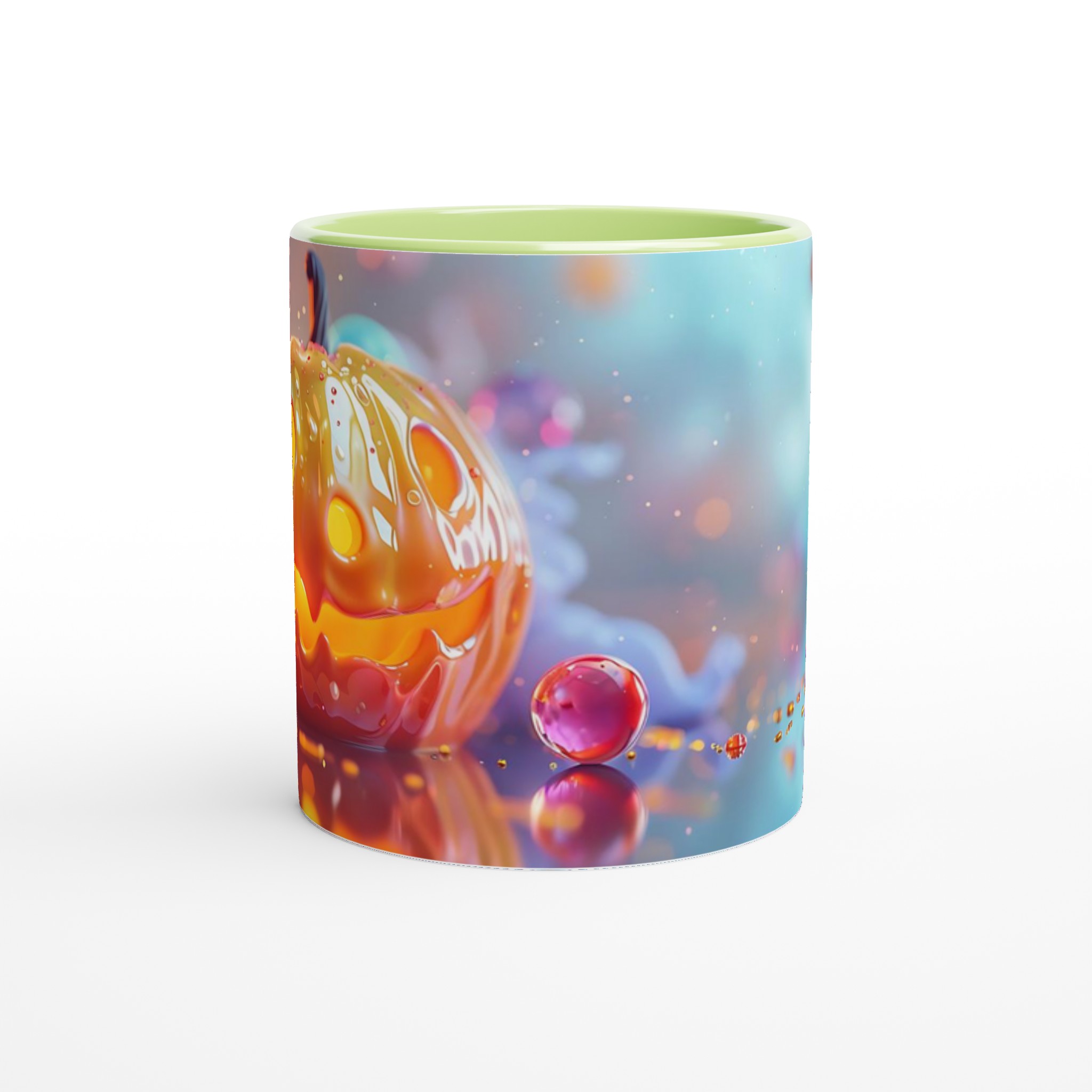 Fånga den magiska glöden från Halloween varje dag med denna förtrollande keramikmugg! Inspirerad av den lekfulla charmen hos en Jack-o’-Lantern som skimrar i ett hav av drömska bubblor, är denna mugg den perfekta följeslagaren för alla dina favoritdrycker. Oavsett om det är morgonkaffet, en värmande kopp te under kyliga kvällar, eller en festlig varm choklad, kommer denna mugg att fylla din stund med glädje och mystik.