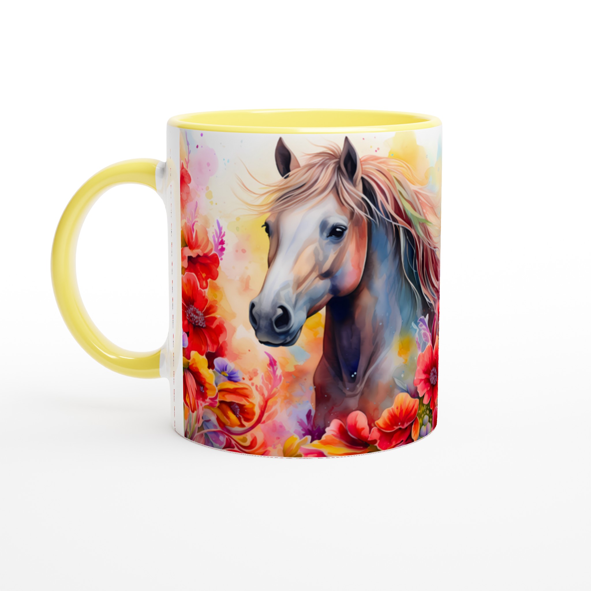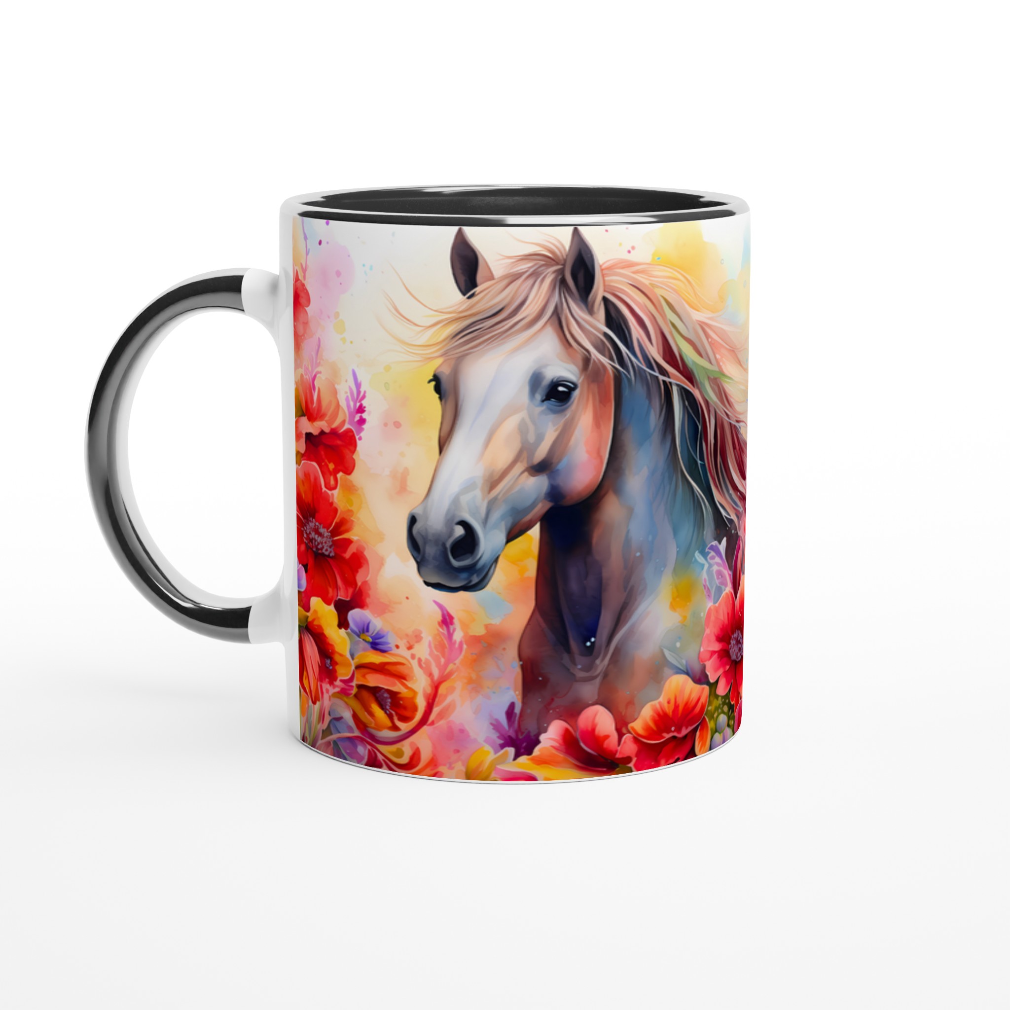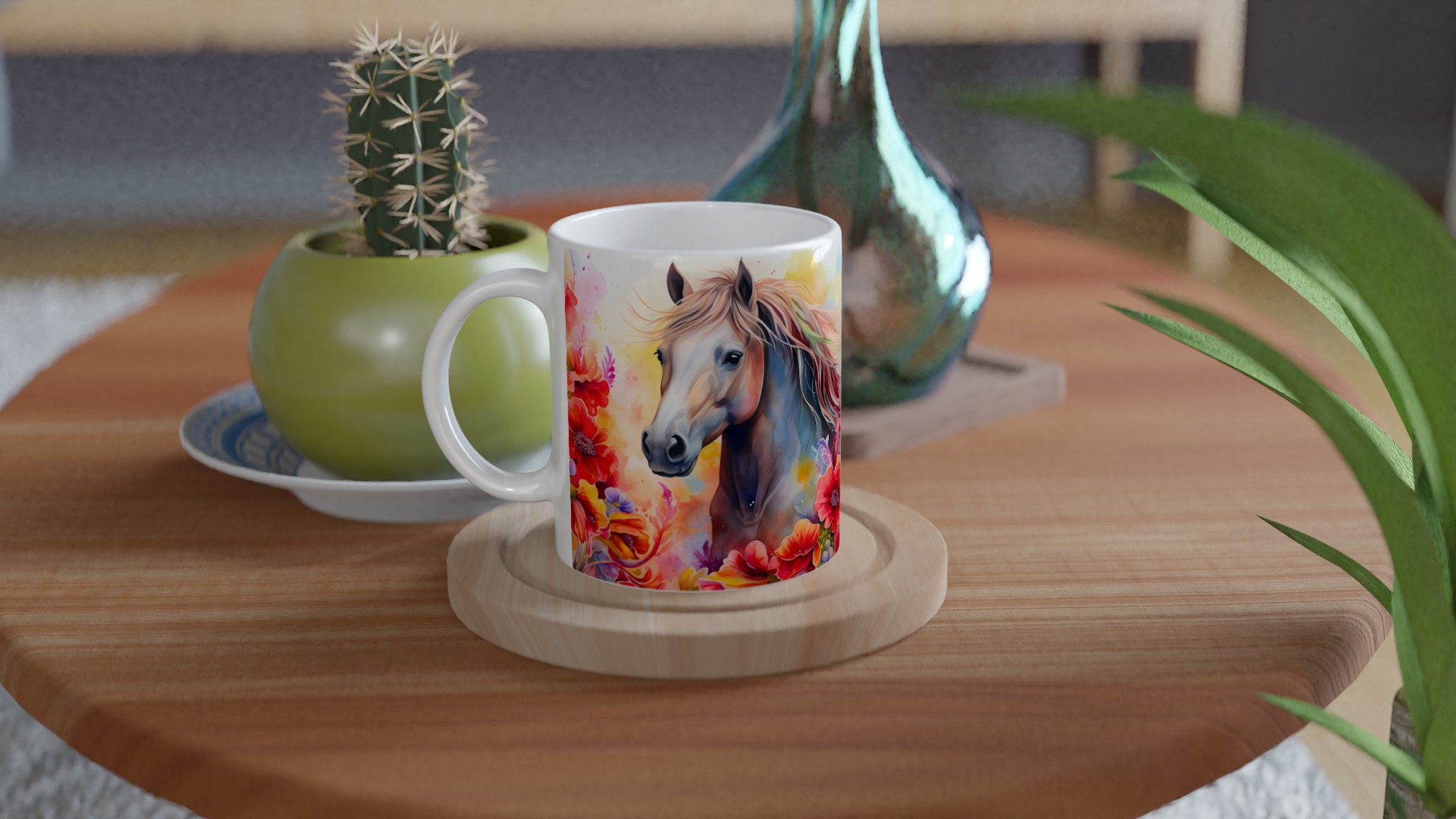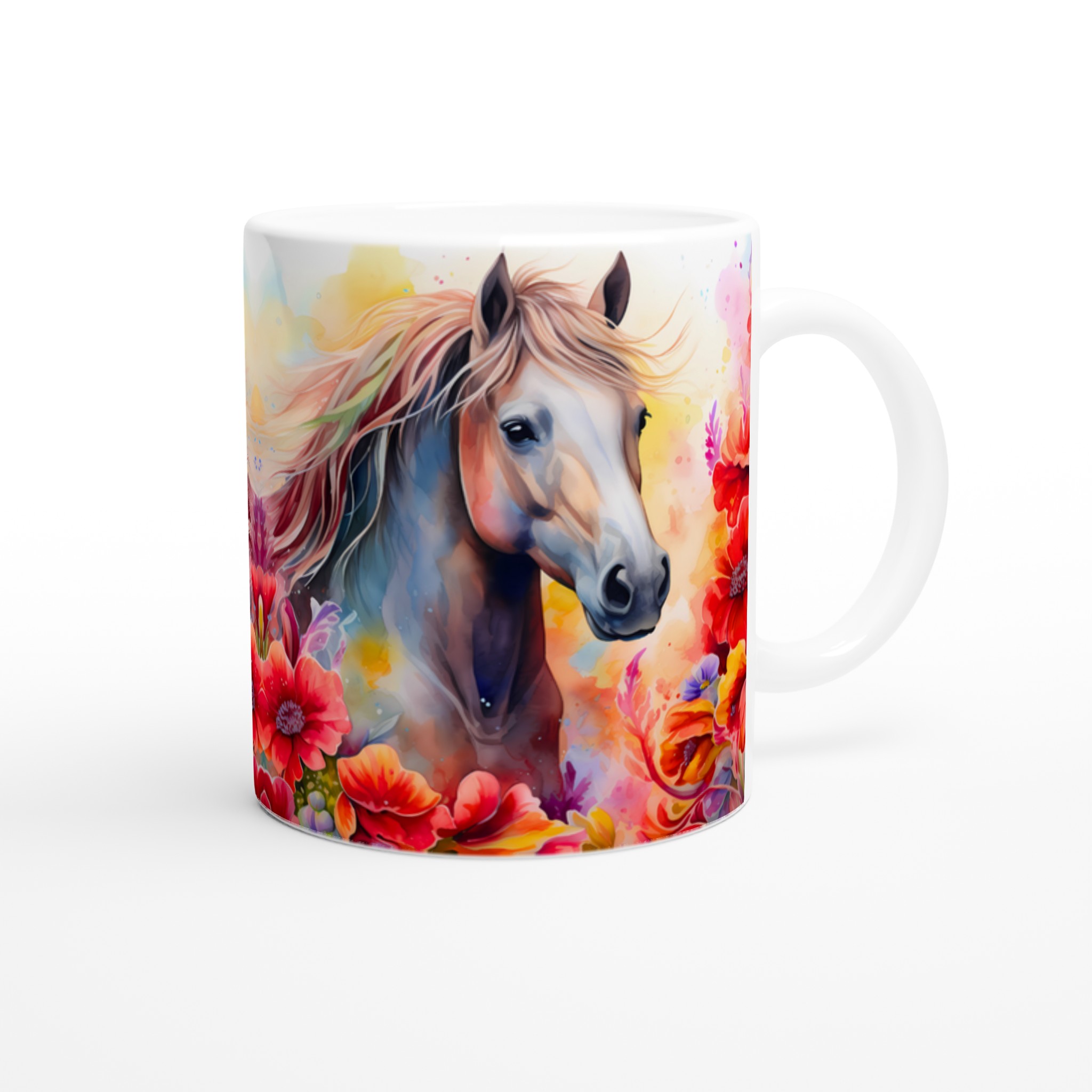 Låt dig svepas med av denna förtrollande keramiska mugg, som fångar den livfulla skönheten hos akvarellmålade hästar omgivna av ett hav av blommor. Varje klunk blir en stund av lugn och inspiration, perfekt för morgonkaffet, en avkopplande kvällsdröm med varm choklad, eller när du bara vill njuta av en kopp te medan du beundrar den konstfulla designen. Den blanka ytan lyfter fram de klara och levande färgerna från den drömska häst- och blomillustrationen, som håller sig lika strålande även efter otaliga turer i mikron och diskmaskinen.