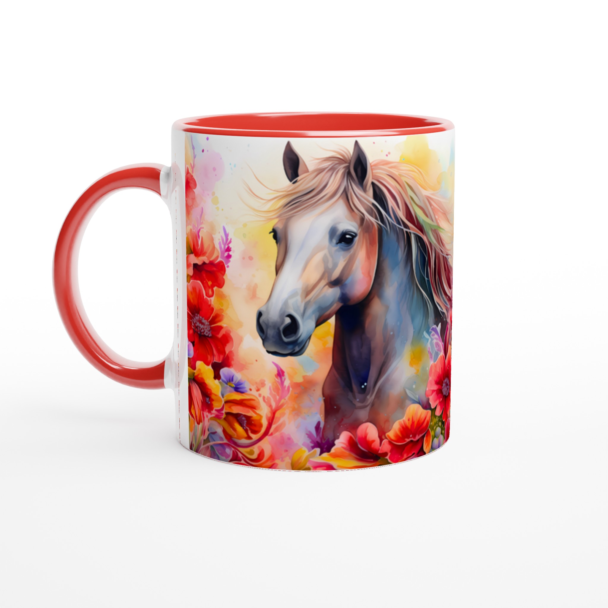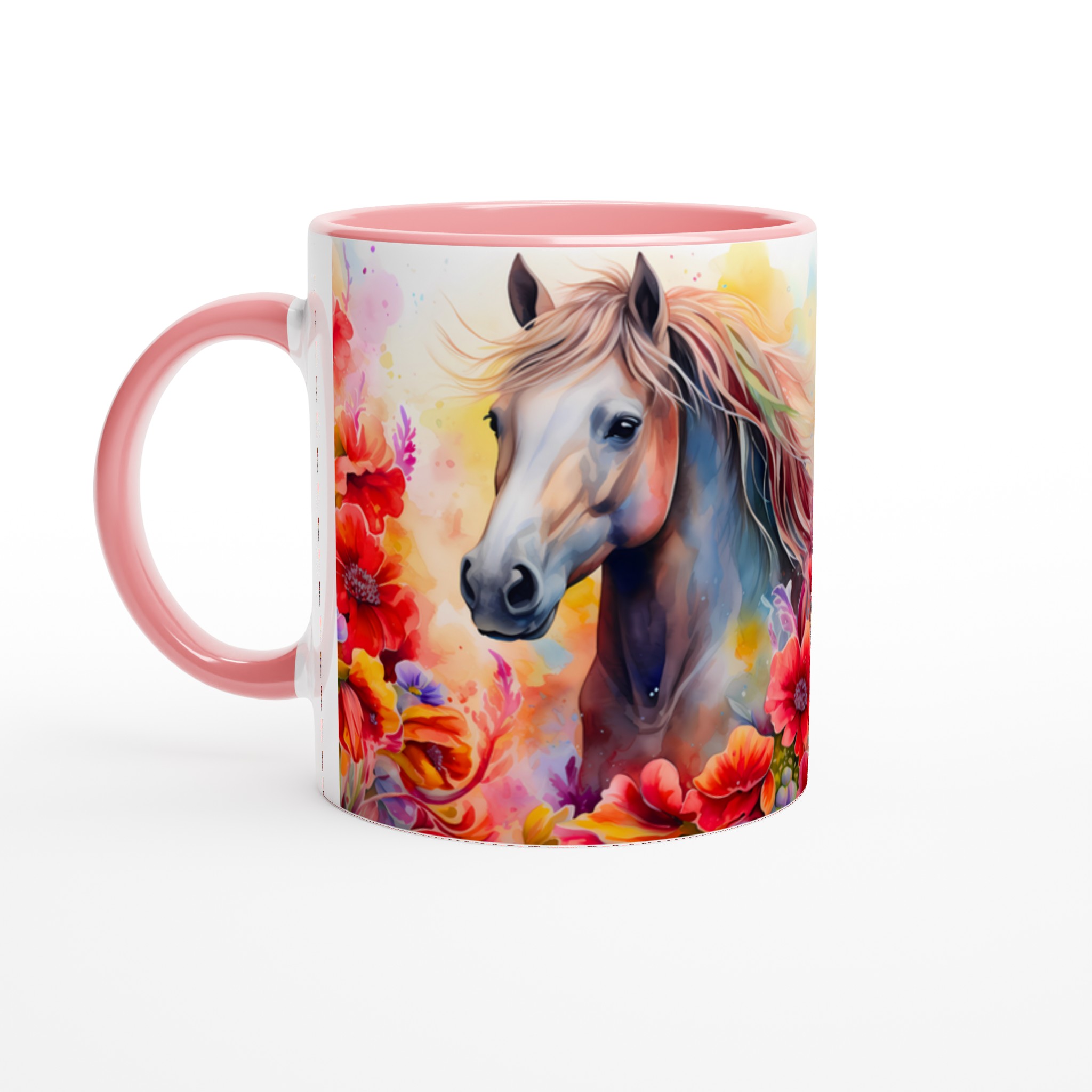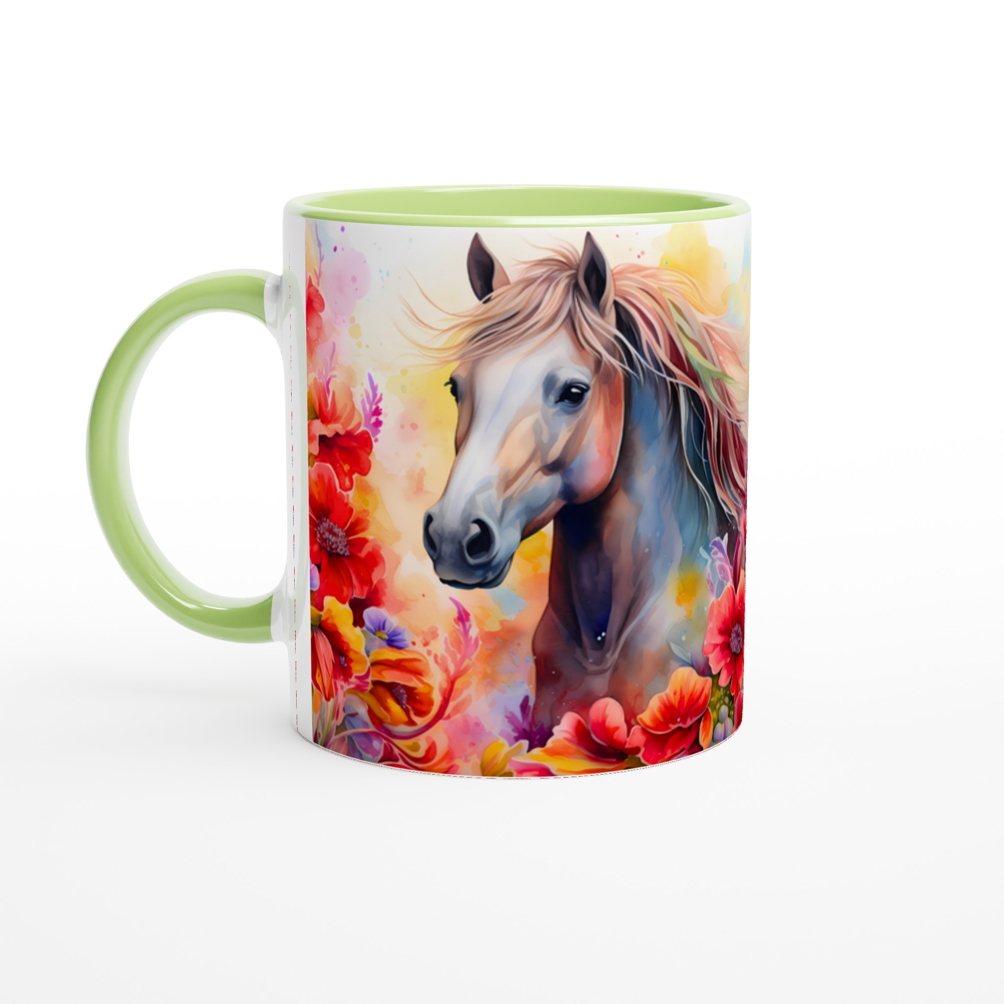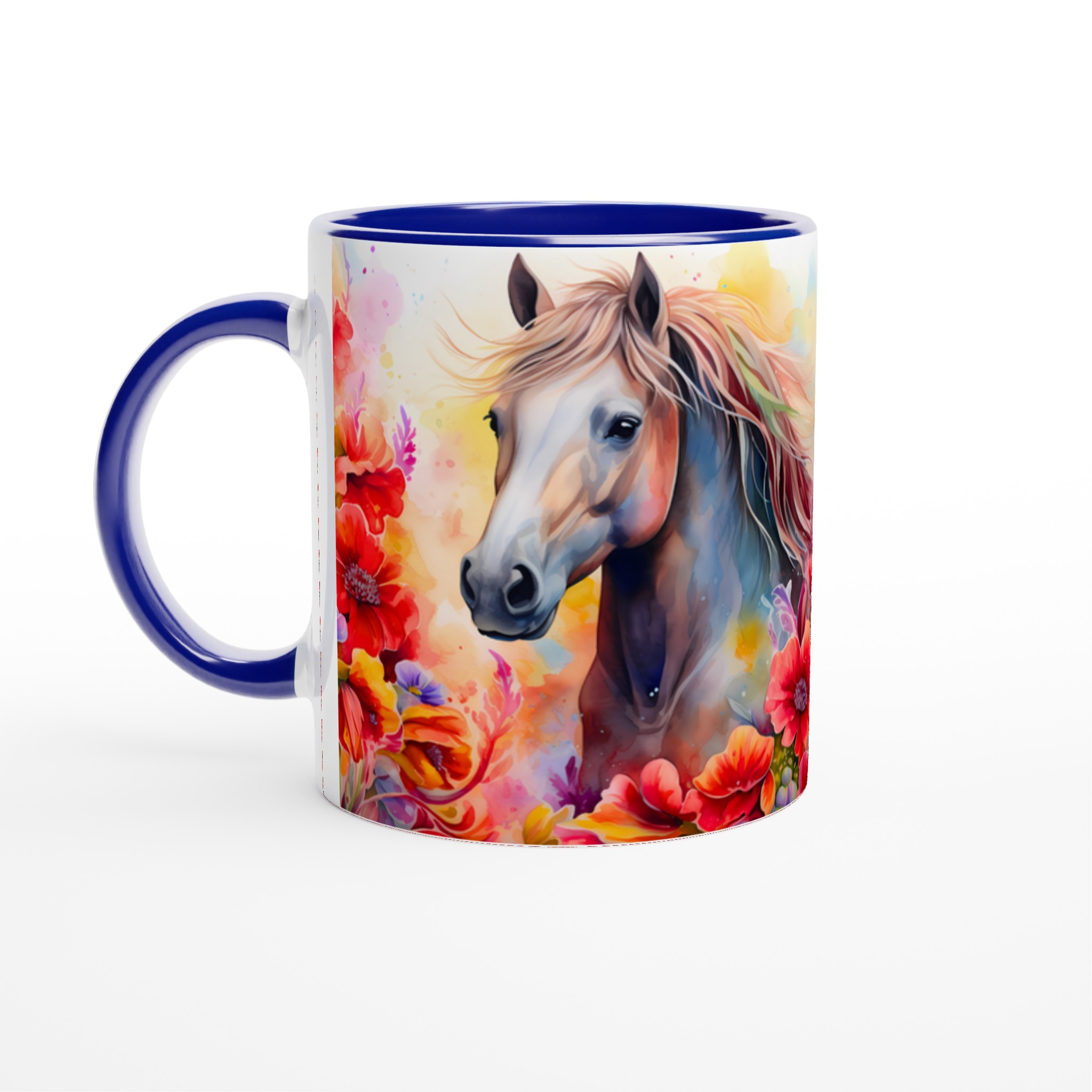Låt dig svepas med av denna förtrollande keramiska mugg, som fångar den livfulla skönheten hos akvarellmålade hästar omgivna av ett hav av blommor. Varje klunk blir en stund av lugn och inspiration, perfekt för morgonkaffet, en avkopplande kvällsdröm med varm choklad, eller när du bara vill njuta av en kopp te medan du beundrar den konstfulla designen. Den blanka ytan lyfter fram de klara och levande färgerna från den drömska häst- och blomillustrationen, som håller sig lika strålande även efter otaliga turer i mikron och diskmaskinen.