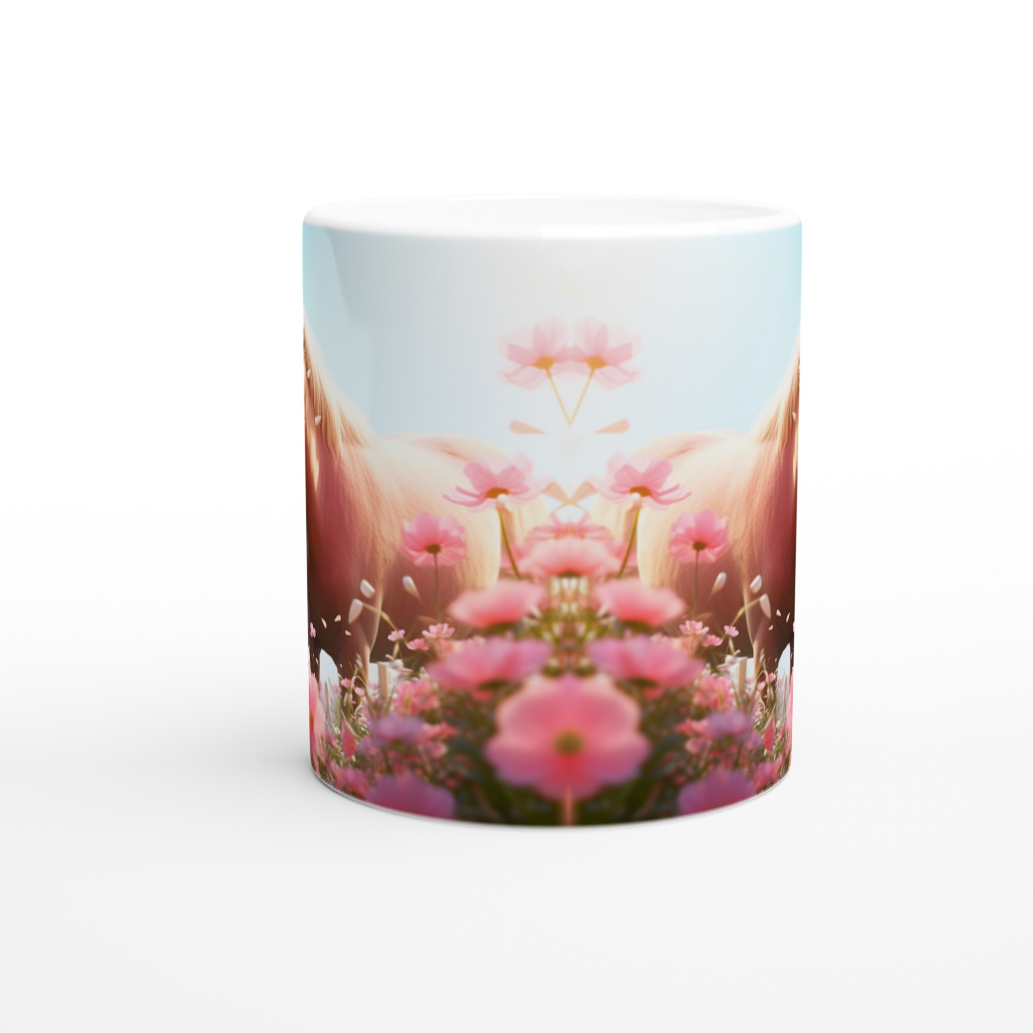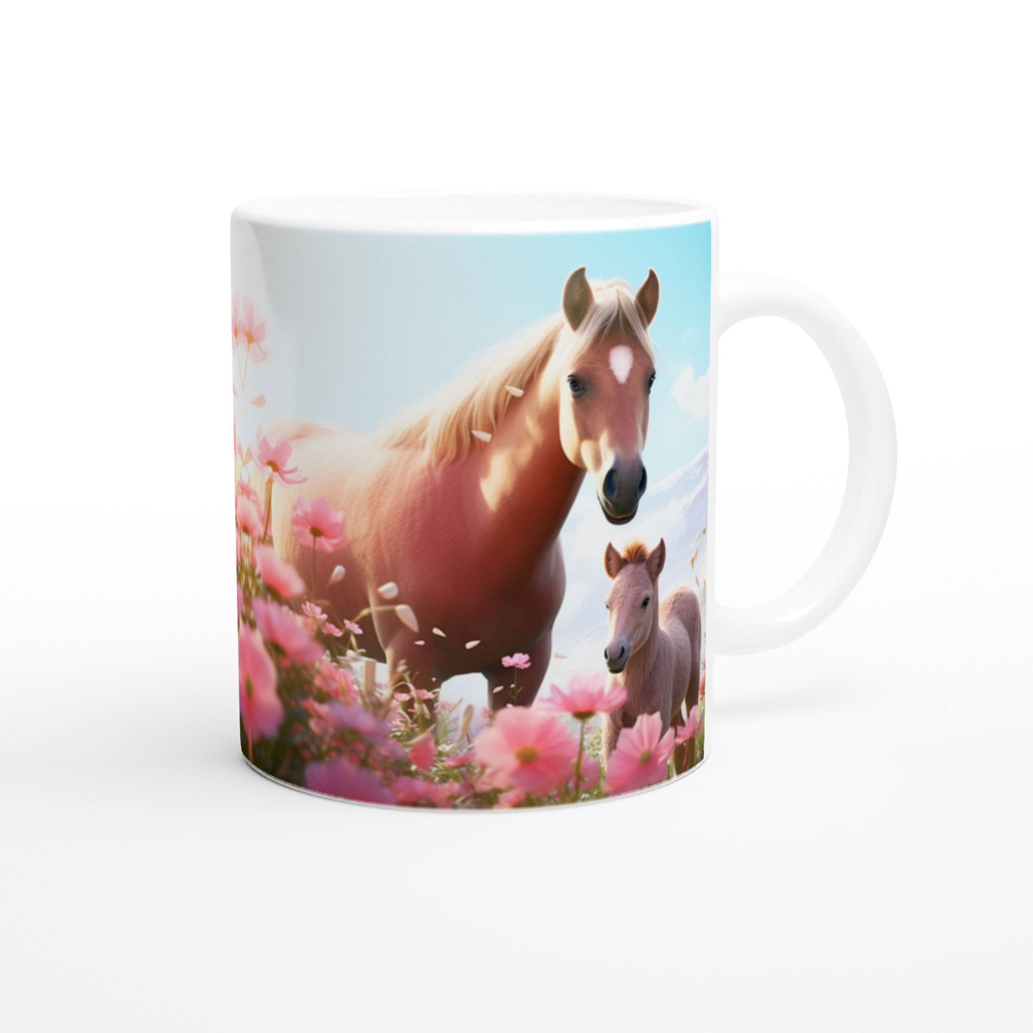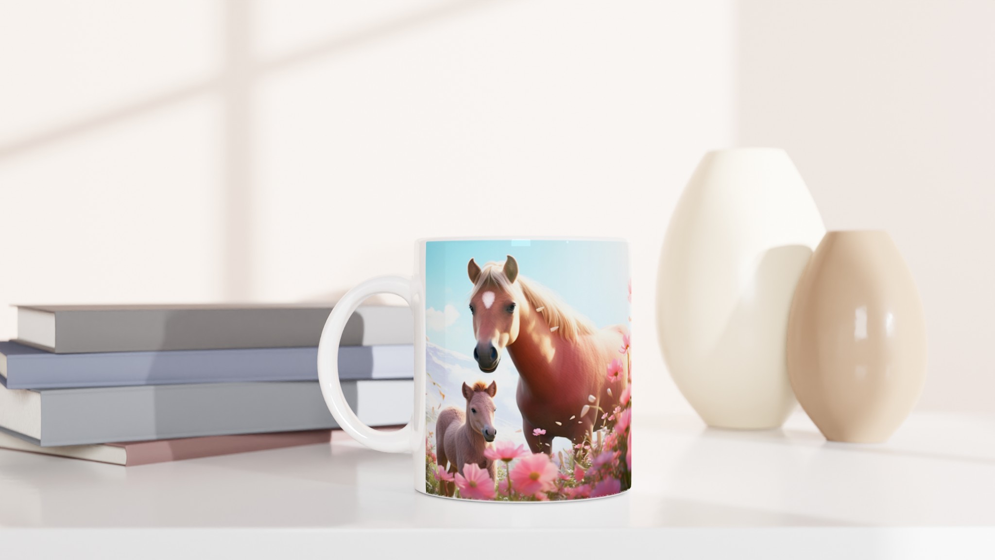 Låt dig svepas med till en sagolik värld varje gång du tar en klunk! Denna förtrollande keramiska mugg fångar den idylliska skönheten hos en hästfamilj i ett rosaskimrande blomsterfält, badande i ett mjukt, drömskt ljus. Perfekt för morgonkaffet, kvällens varma choklad eller när du bara vill njuta av en kopp te. Den blanka ytan säkerställer att detta magiska motiv framhävs med klara och levande färger, som håller sig fina även efter många turer i mikron och diskmaskinen.