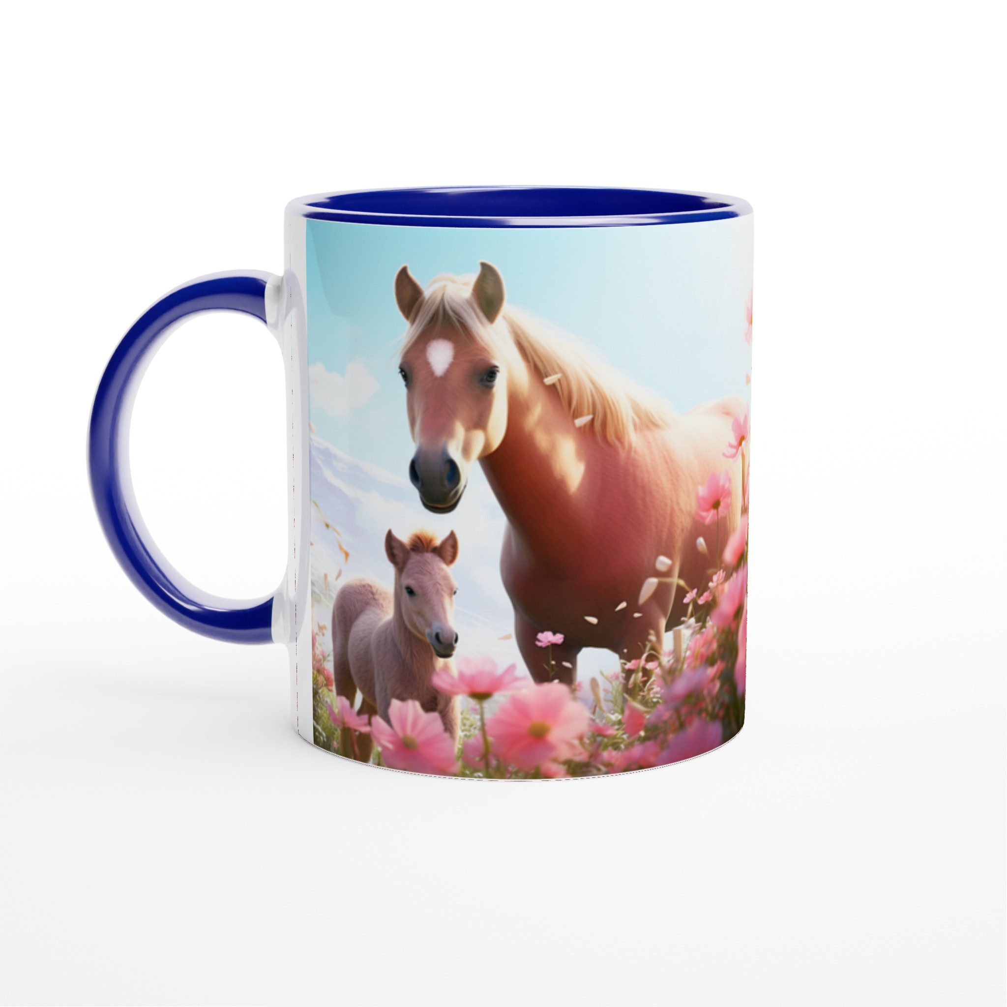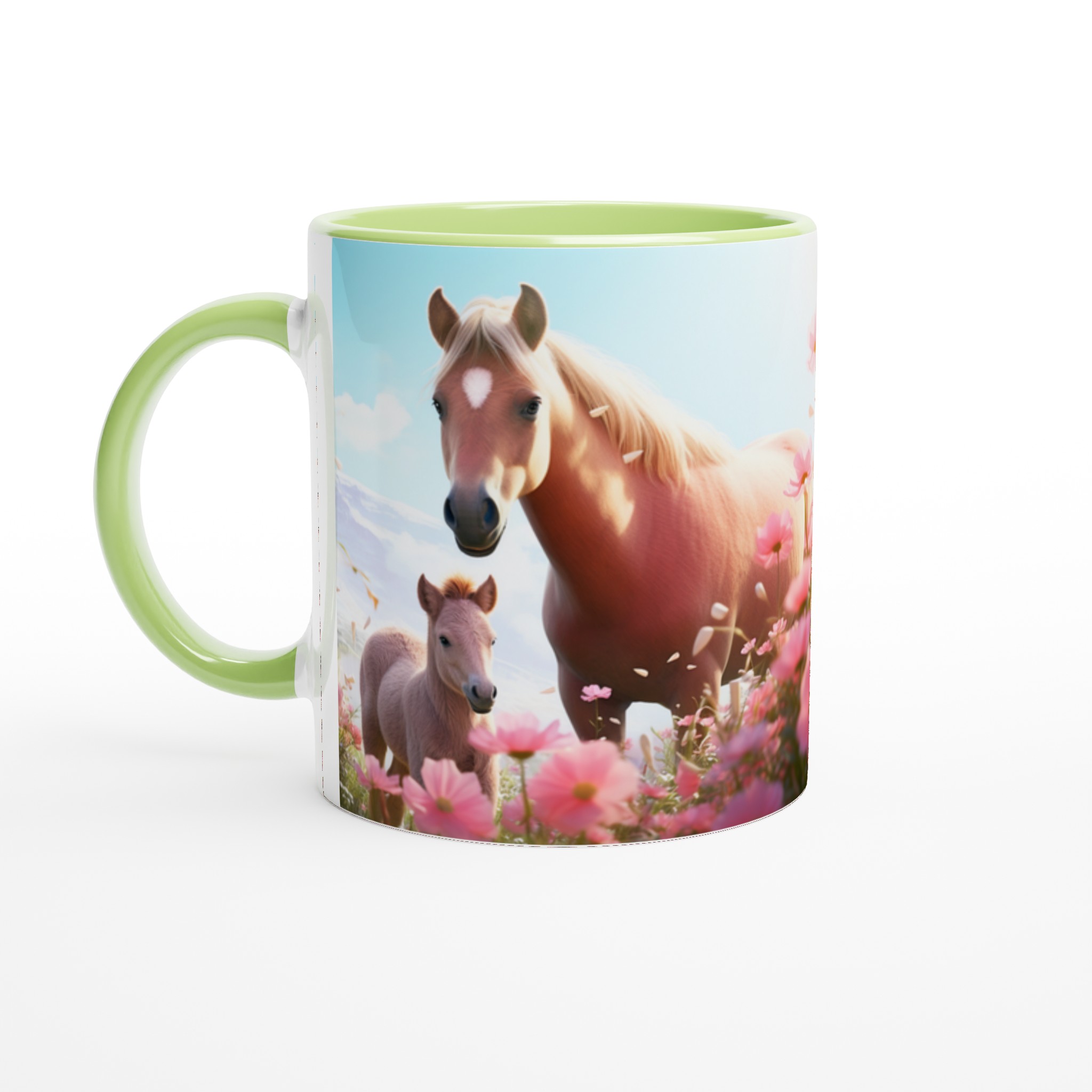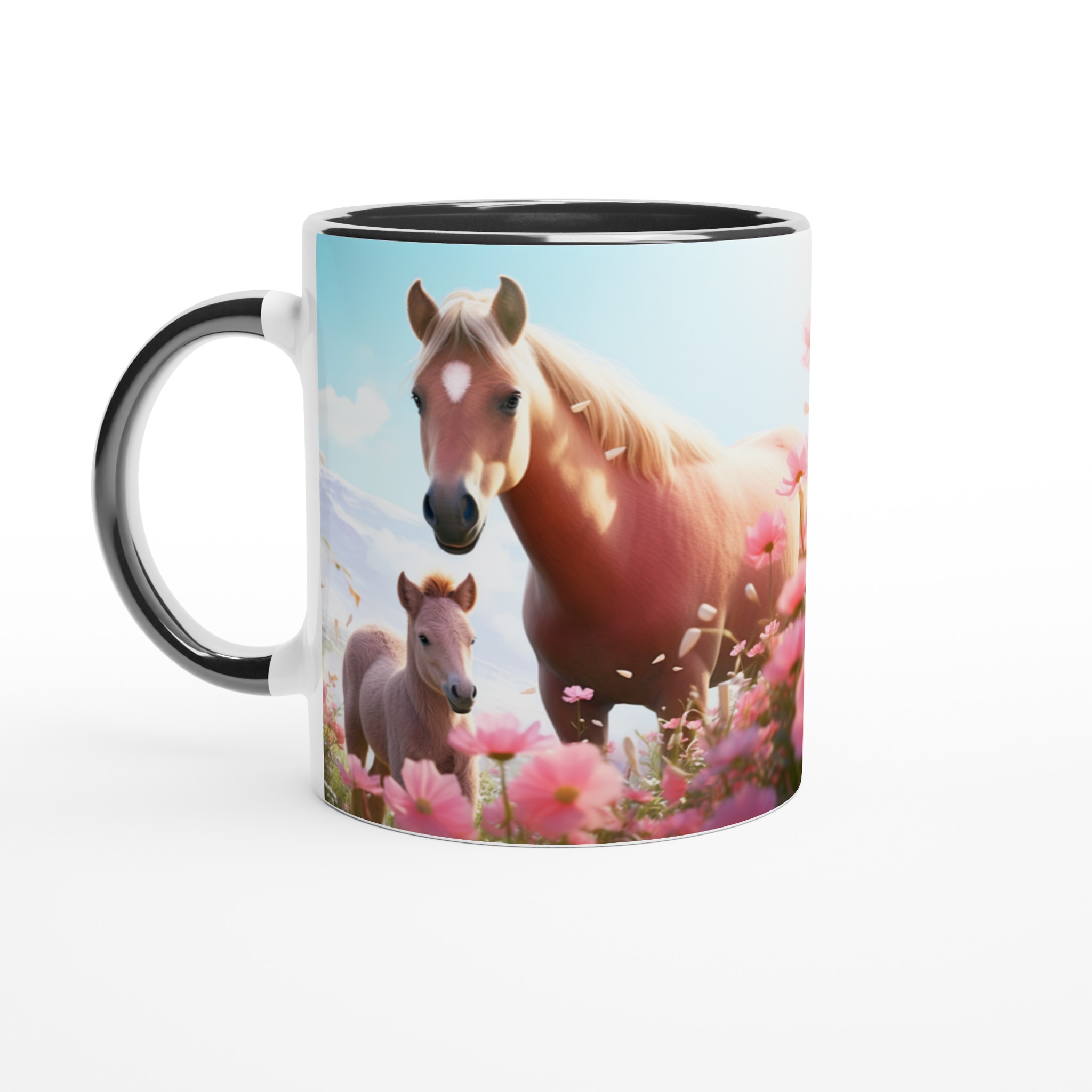 Låt dig svepas med till en sagolik värld varje gång du tar en klunk! Denna förtrollande keramiska mugg fångar den idylliska skönheten hos en hästfamilj i ett rosaskimrande blomsterfält, badande i ett mjukt, drömskt ljus. Perfekt för morgonkaffet, kvällens varma choklad eller när du bara vill njuta av en kopp te. Den blanka ytan säkerställer att detta magiska motiv framhävs med klara och levande färger, som håller sig fina även efter många turer i mikron och diskmaskinen.