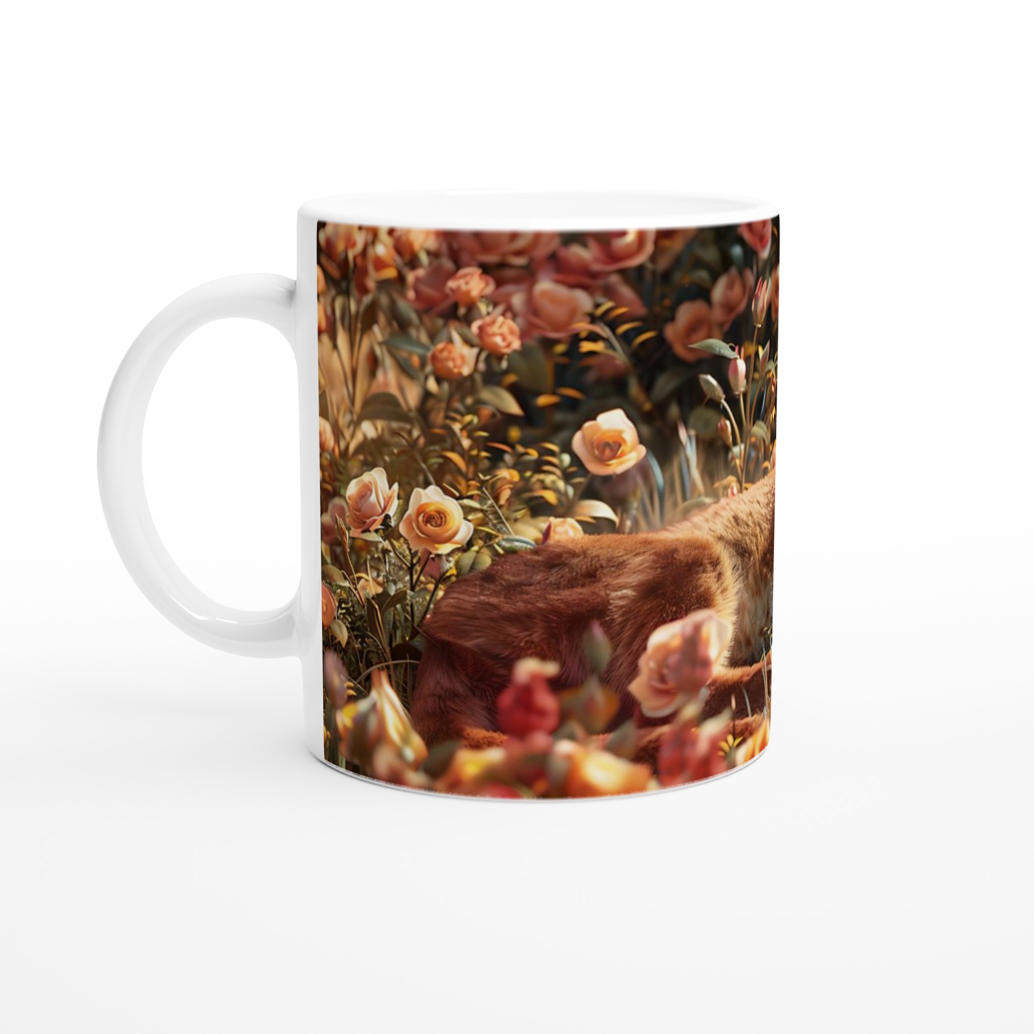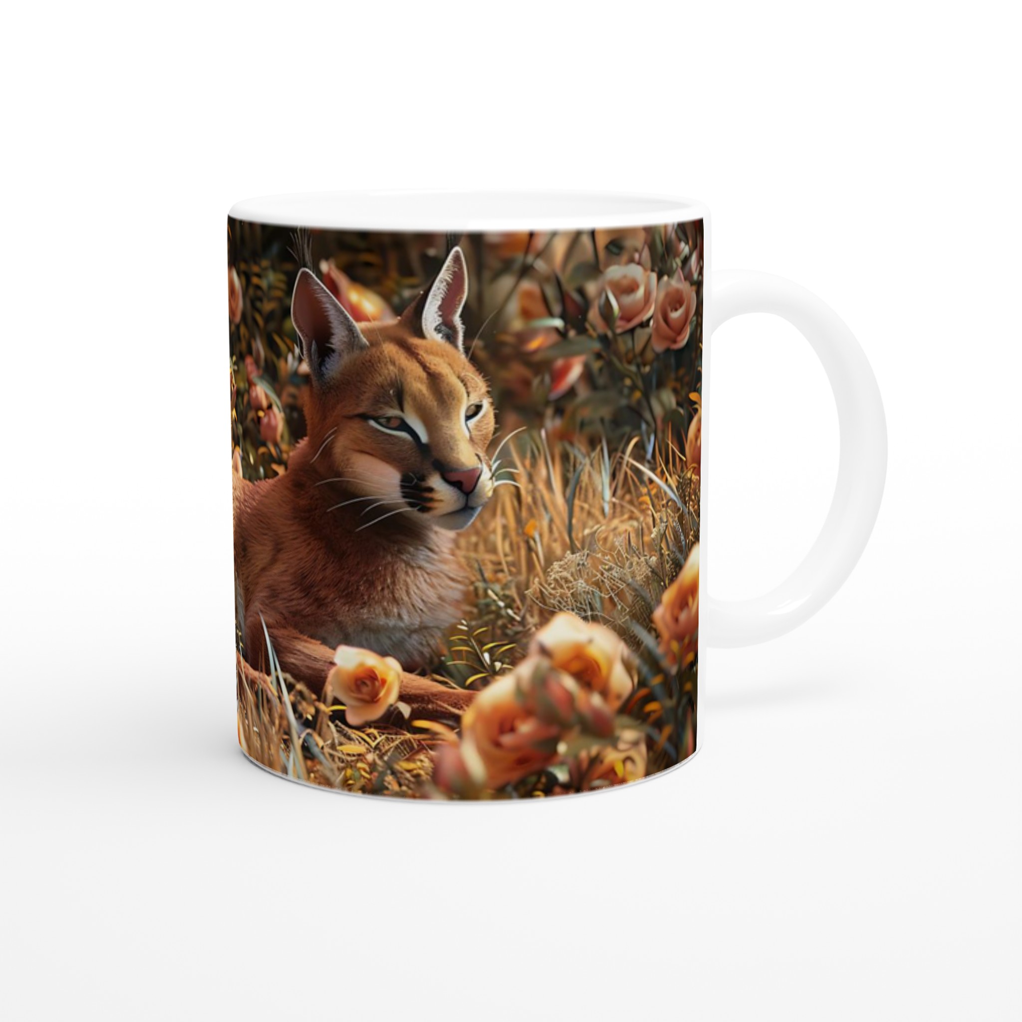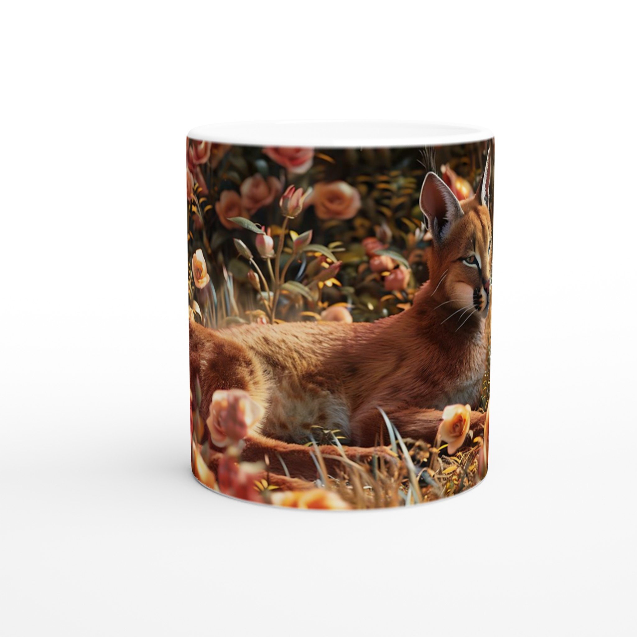 Låt dig förtrollas varje dag med denna underbara keramiska mugg, prydd med en majestätisk karakal vilande bland gyllene rosor. Denna mugg blir snabbt en vardagsfavorit, perfekt för morgonkaffet, kvällens varma choklad eller när du bara vill njuta av en kopp te i lugn och ro. Den blanka ytan framhäver trycket med klara och levande färger, som håller sig fina även efter många turer i mikron och diskmaskinen, vilket garanterar att din magiska stund bevaras.