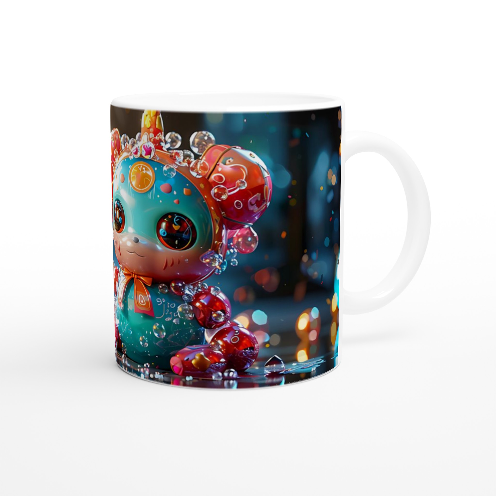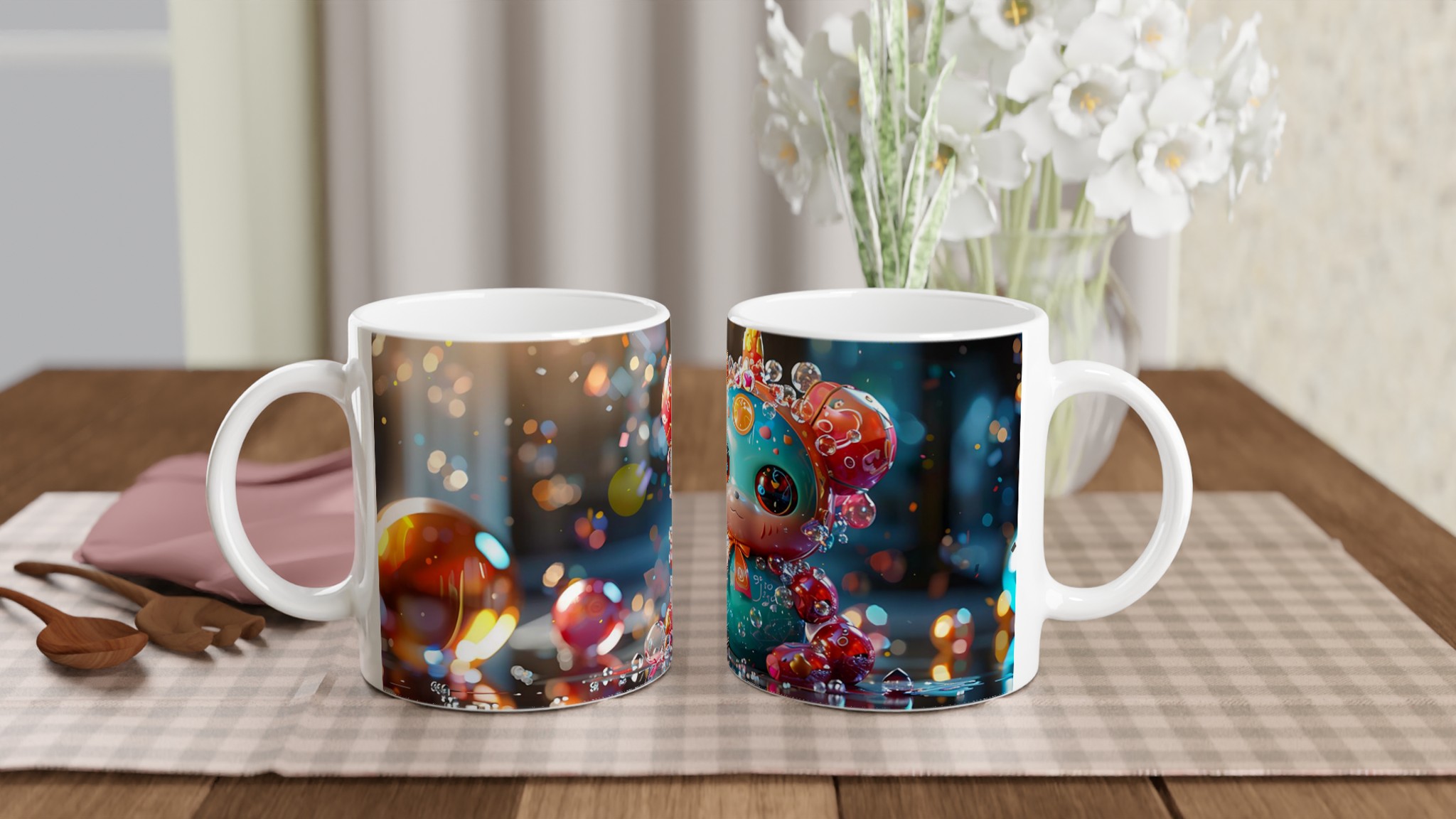 Låt varje klunk bli en del av en magisk berättelse med vår förtrollande keramiska mugg. Inspirerad av en värld av glädje och fantastiska detaljer, framhäver denna mugg ett levande, nästan drömlikt motiv som fångar ögat. Med sin glänsande vita yta kommer de rika färgerna till liv, vilket gör din mugg till en omedelbar konversationsstartare och en källa till daglig inspiration.