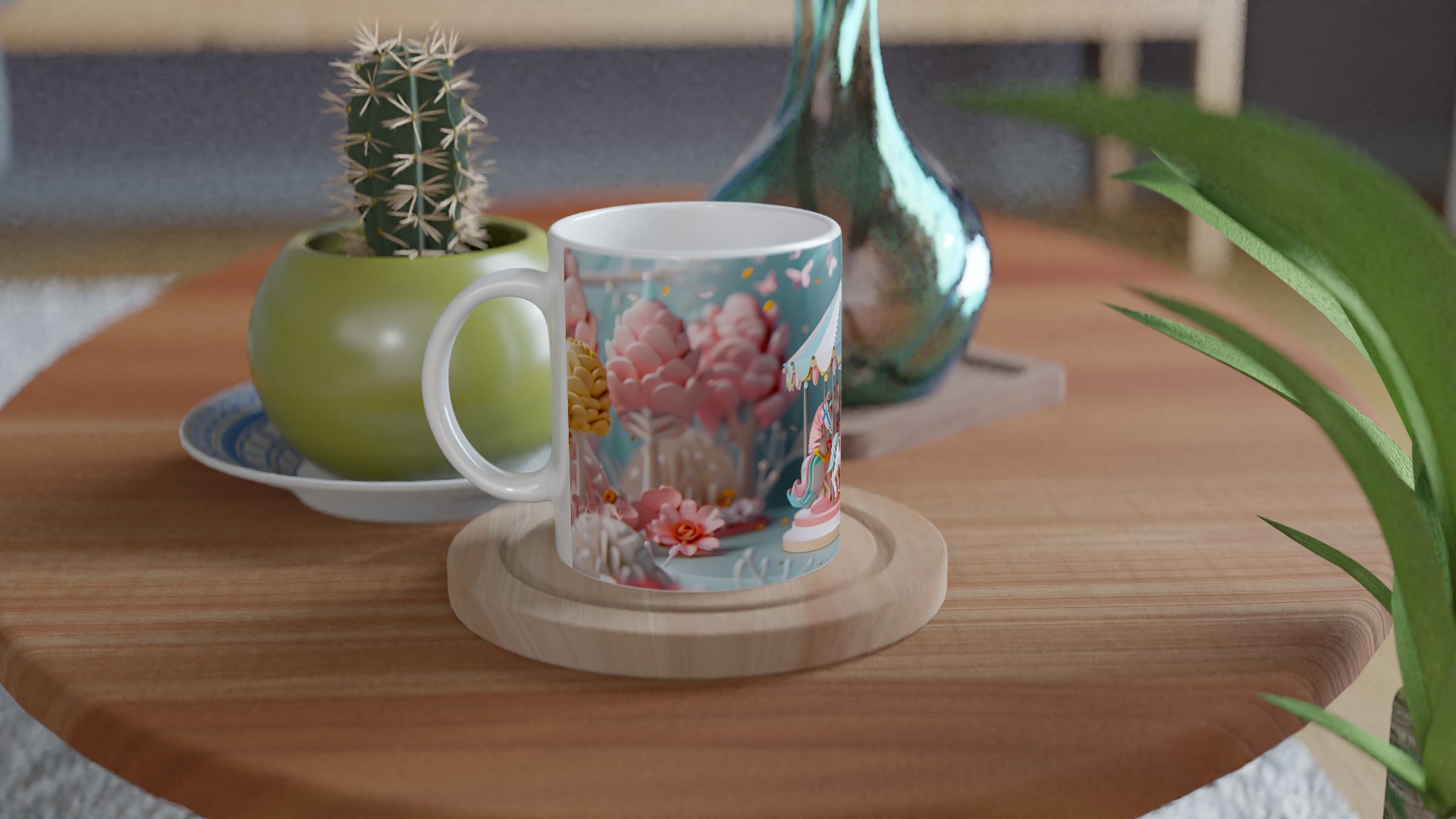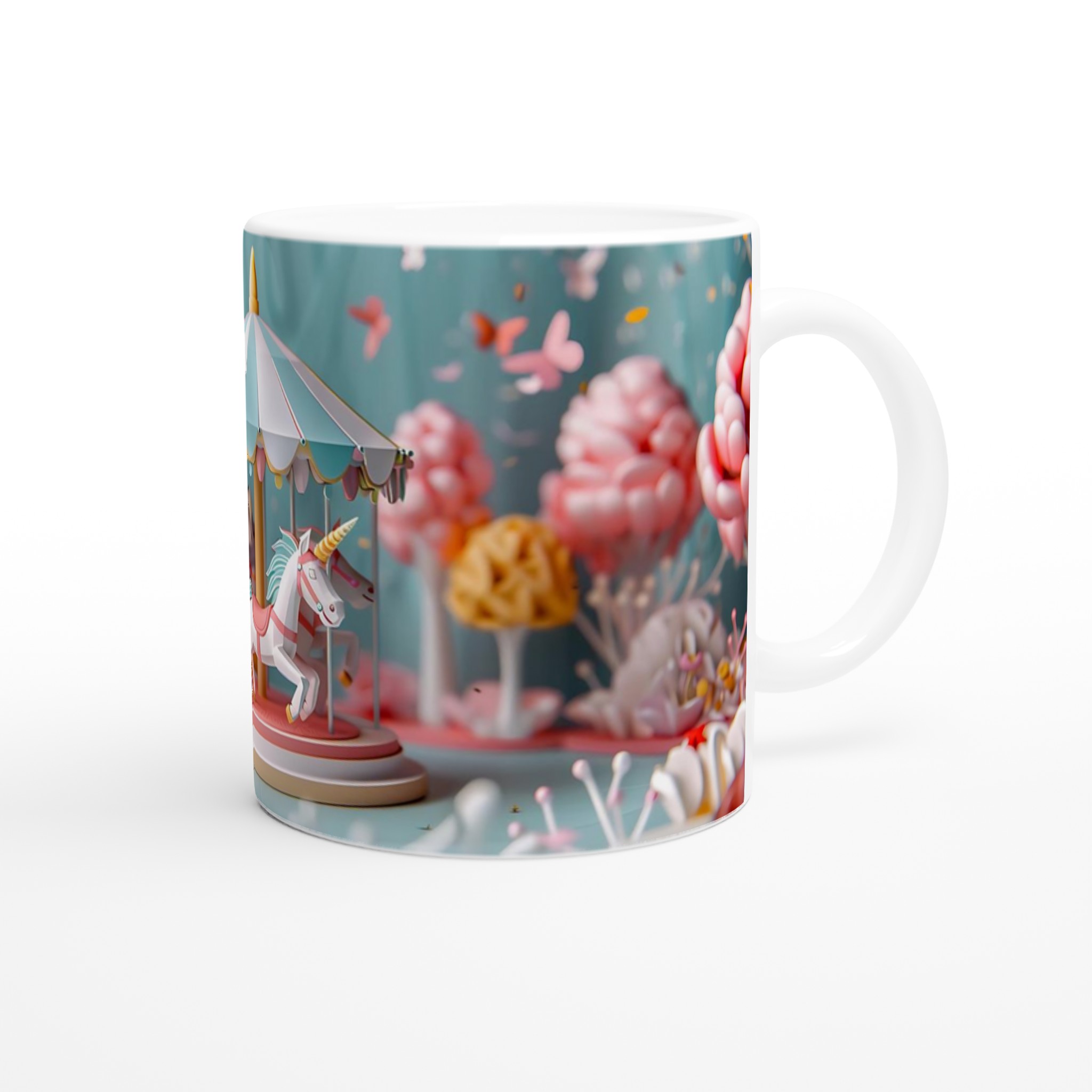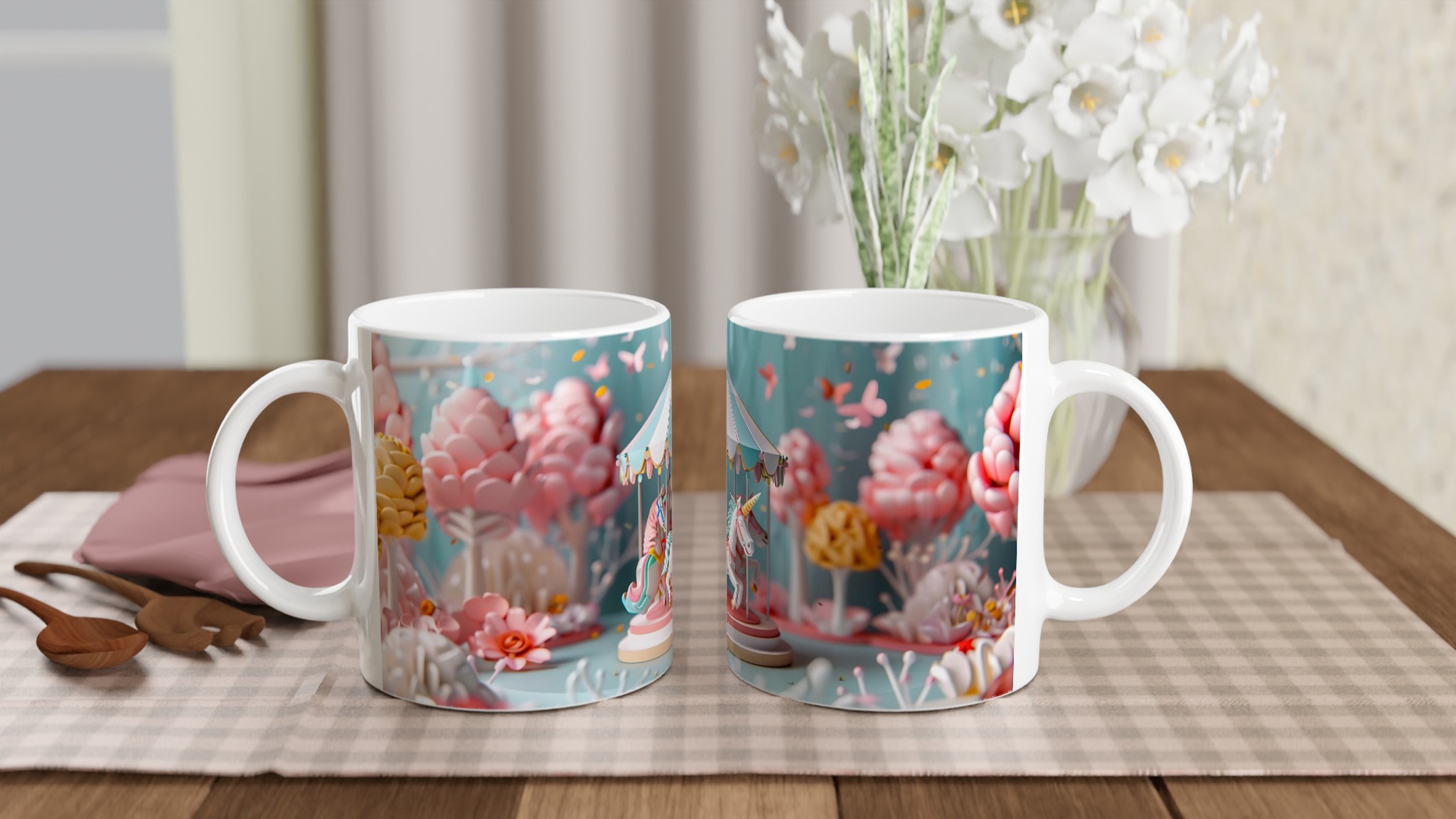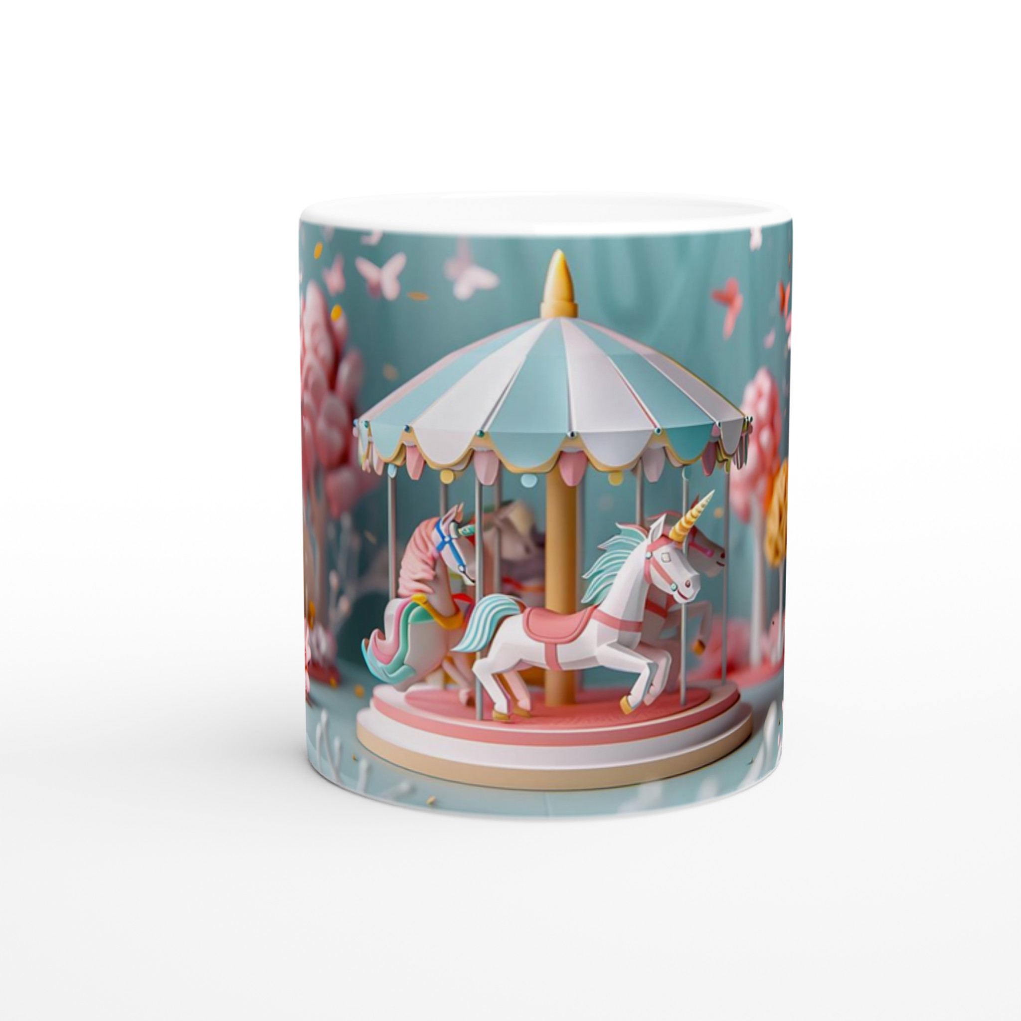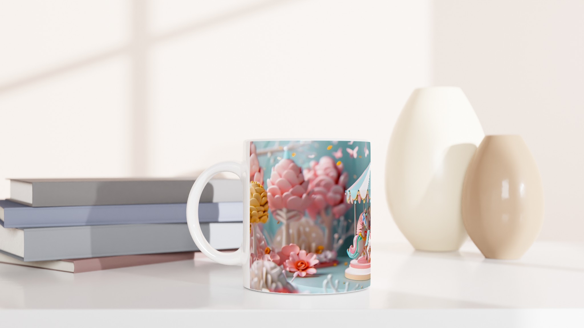 Låt varje fikastund bli en magisk resa med vår förtrollande Keramisk Mugg, inspirerad av karusellens drömlika värld! Perfekt för morgonkaffet, kvällens varma choklad eller när du bara vill njuta av en kopp te. Den blanka ytan framhäver det lekfulla enhörningsmotivet med klara och levande färger, som håller sig fina även efter många turer i mikron och diskmaskinen.