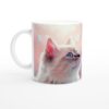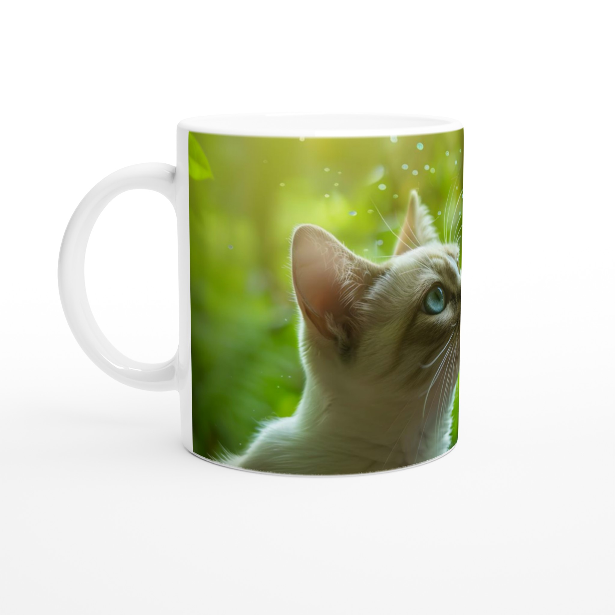 Låt dig förtrollas av denna underbara keramikmugg, prydd med en katt som drömskt blickar upp mot det frodiga gröna. Den mjuka färgpaletten och det fridfulla motivet skapar en känsla av lugn och harmoni, perfekt för att starta dagen med en kopp kaffe eller te, eller för en avkopplande stund när som helst. Den blanka vita ytan framhäver trycket på ett levande sätt, vilket gör denna mugg till en omedelbar favorit för alla katt- och naturälskare.