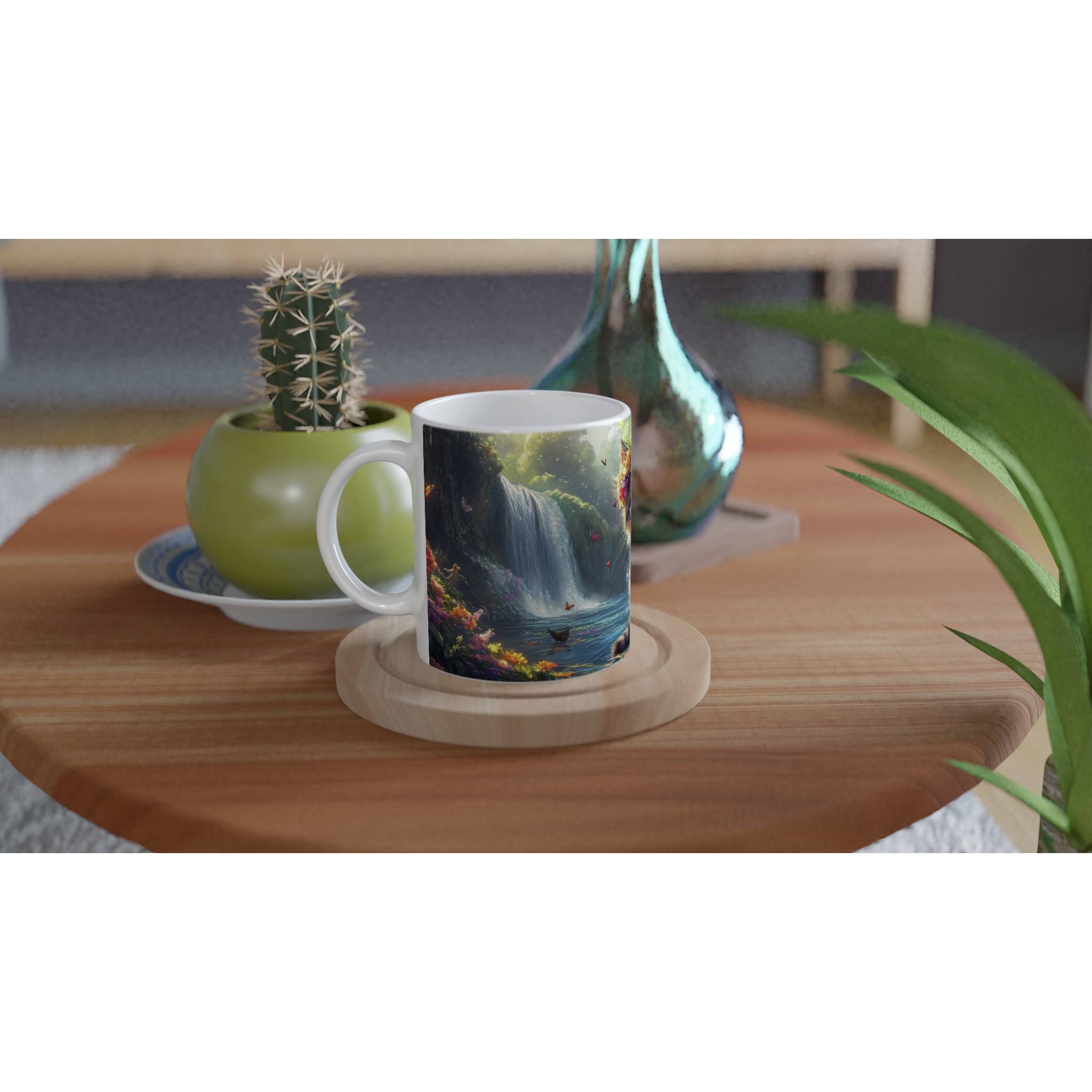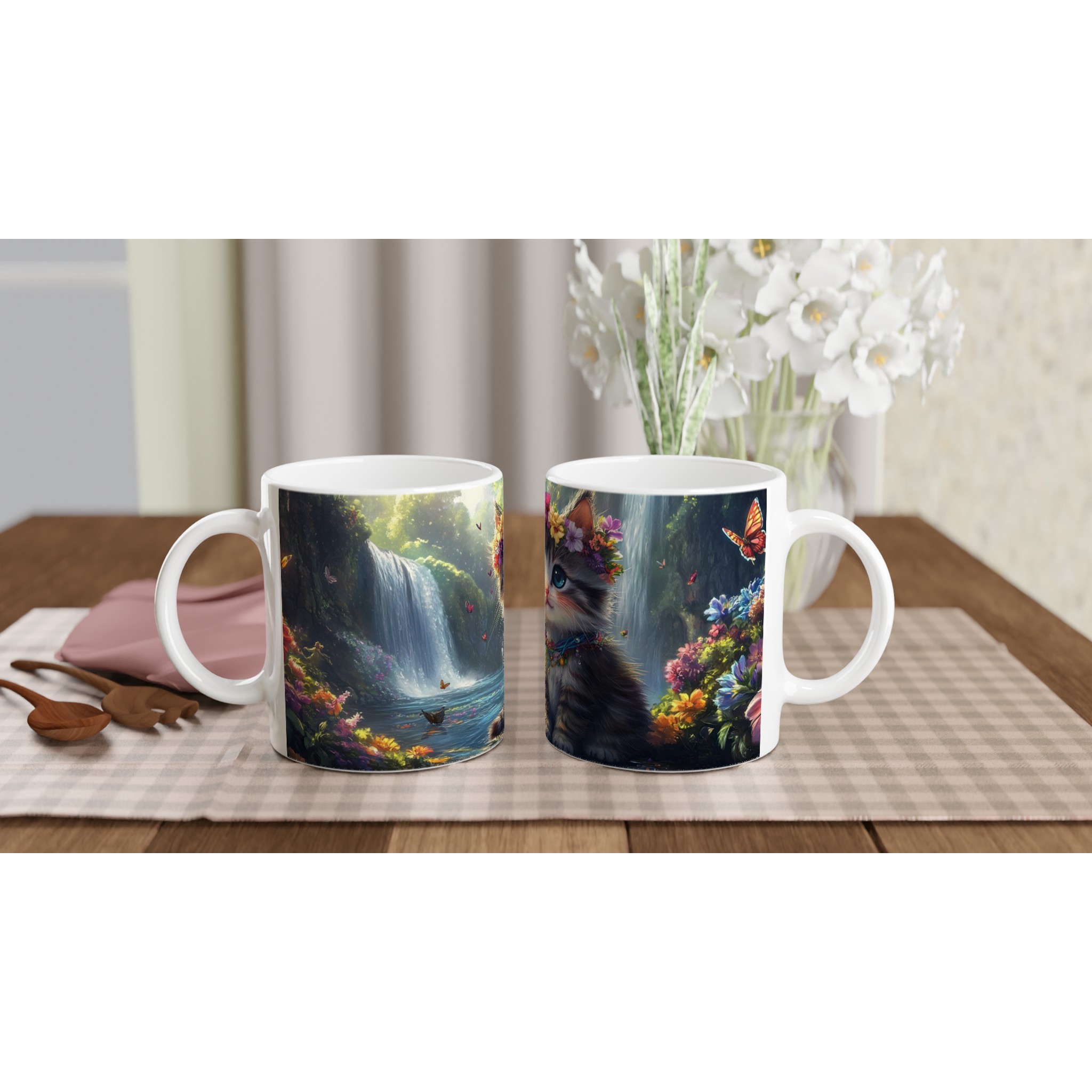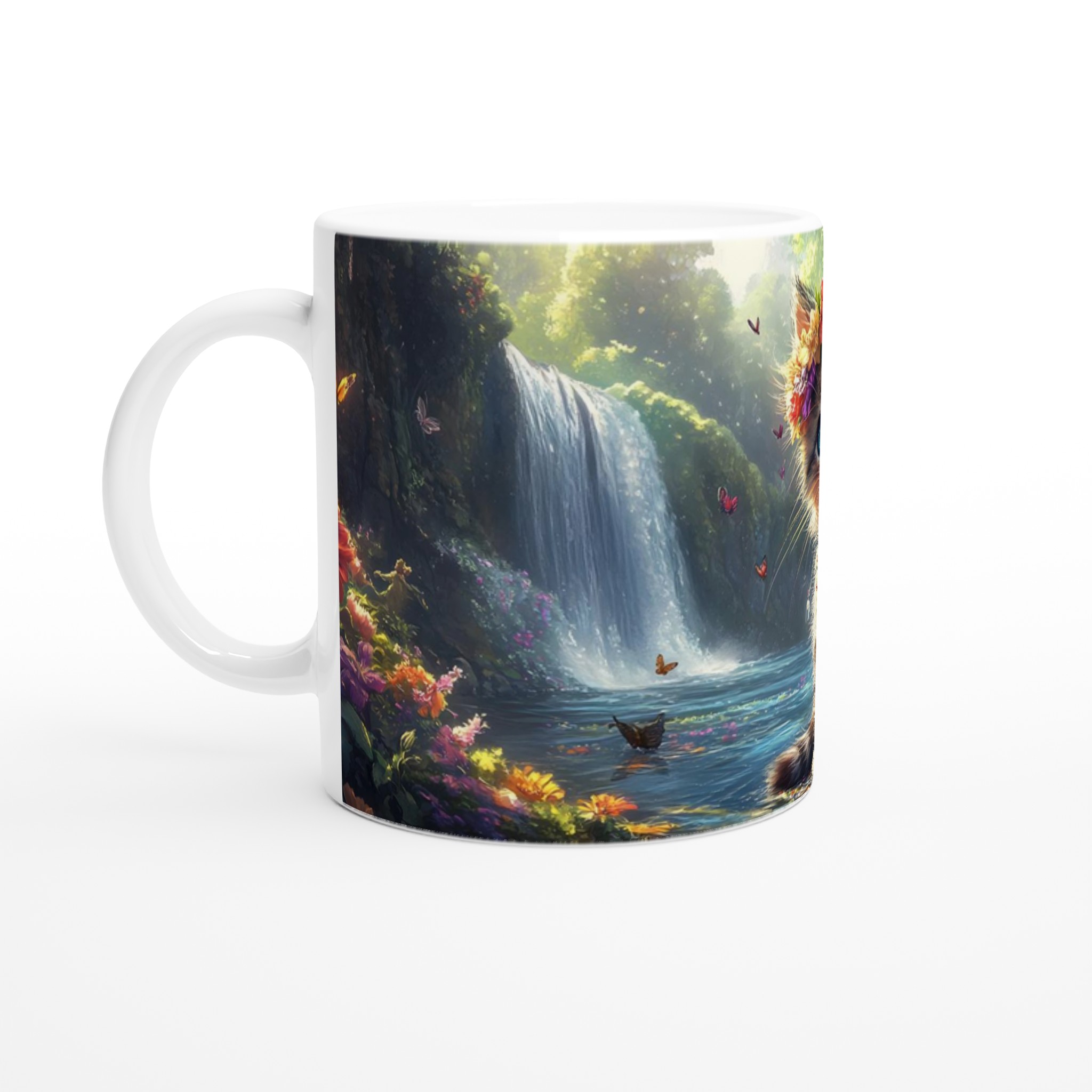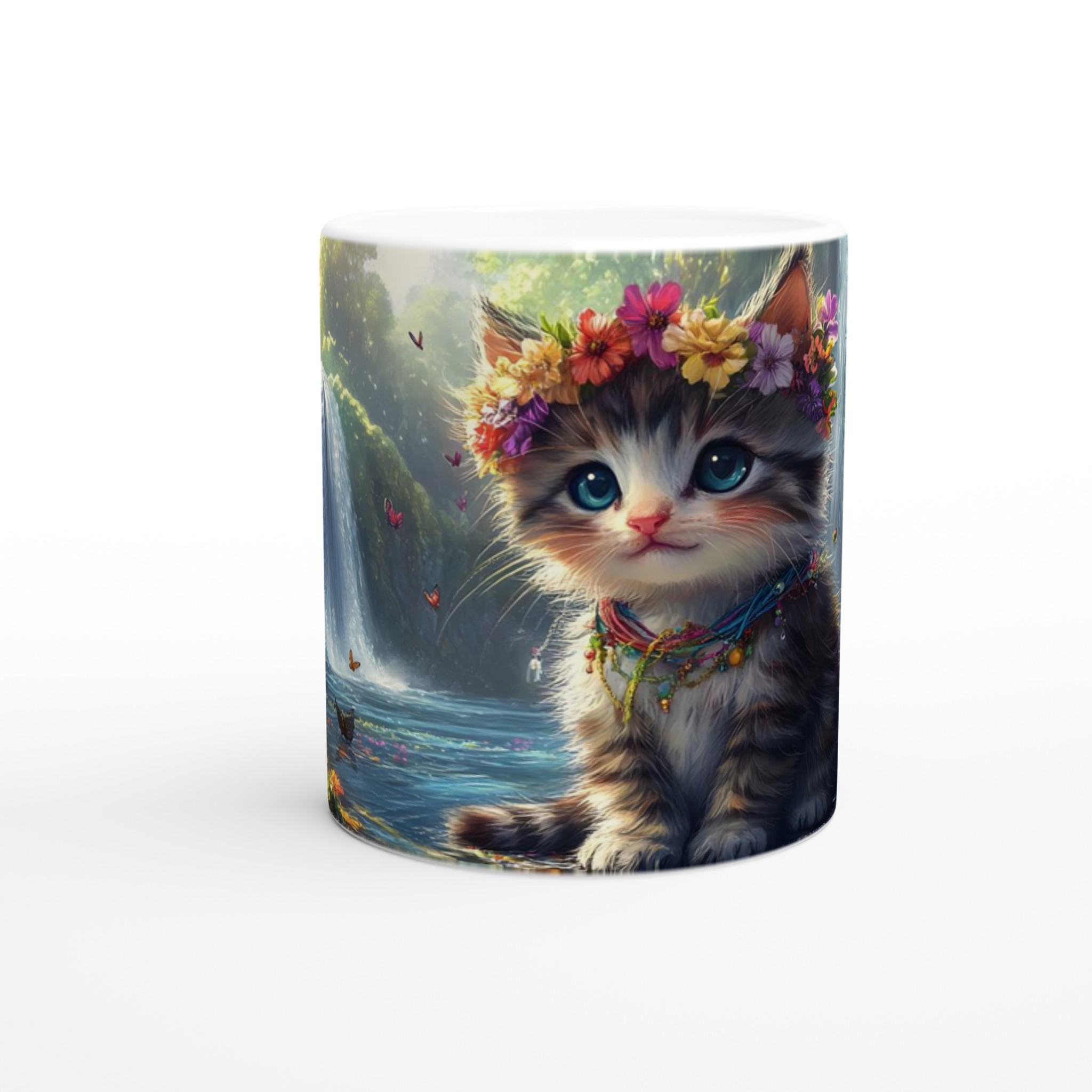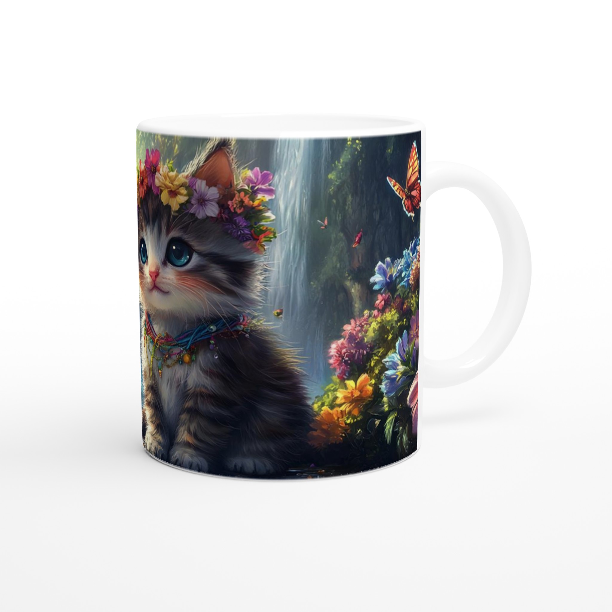 Låt dig förtrollas varje dag med denna underbara keramikmugg, prydd med en bedårande kattunge som bär en blomsterkrans, omgiven av ett magiskt landskap med vattenfall och skimrande fjärilar. Denna mugg är inte bara en behållare för din favoritdryck; den är en portal till en drömvärld, perfekt för att förgylla morgonkaffet, en värmande kopp te eller en mysig varm choklad.