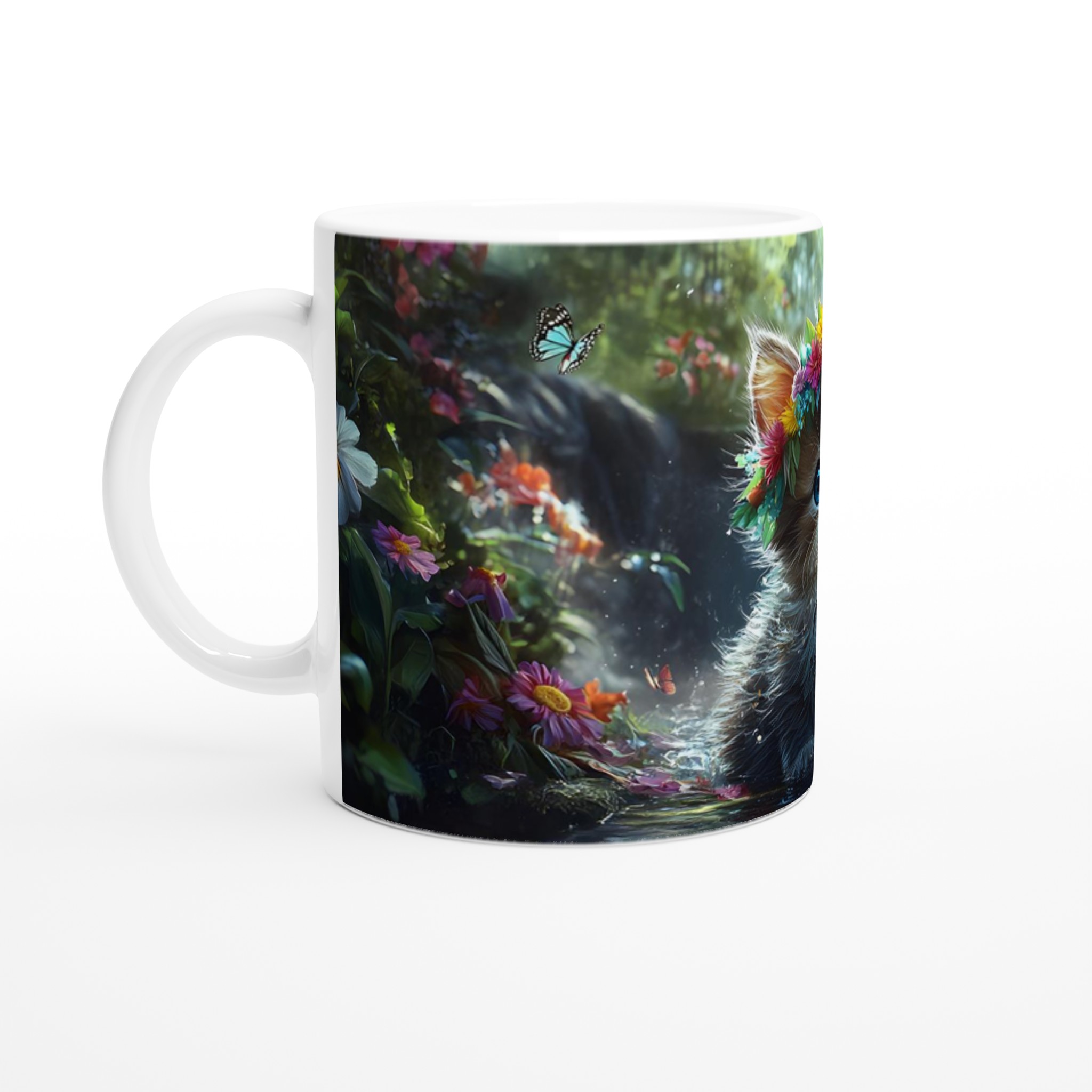 Fånga den magiska känslan av en förtrollad skog med denna underbara keramikmugg! Den bedårande kattungen, prydd med en livfull blomsterkrans och omgiven av glittrande fjärilar och ett porlande vattenfall, kommer att förgylla varje fika eller kaffestund. Muggens design med sin drömska färgpalett och charmerande motiv skapar en känsla av lugn och glädje, perfekt för den som älskar söta djur och naturens skönhet.