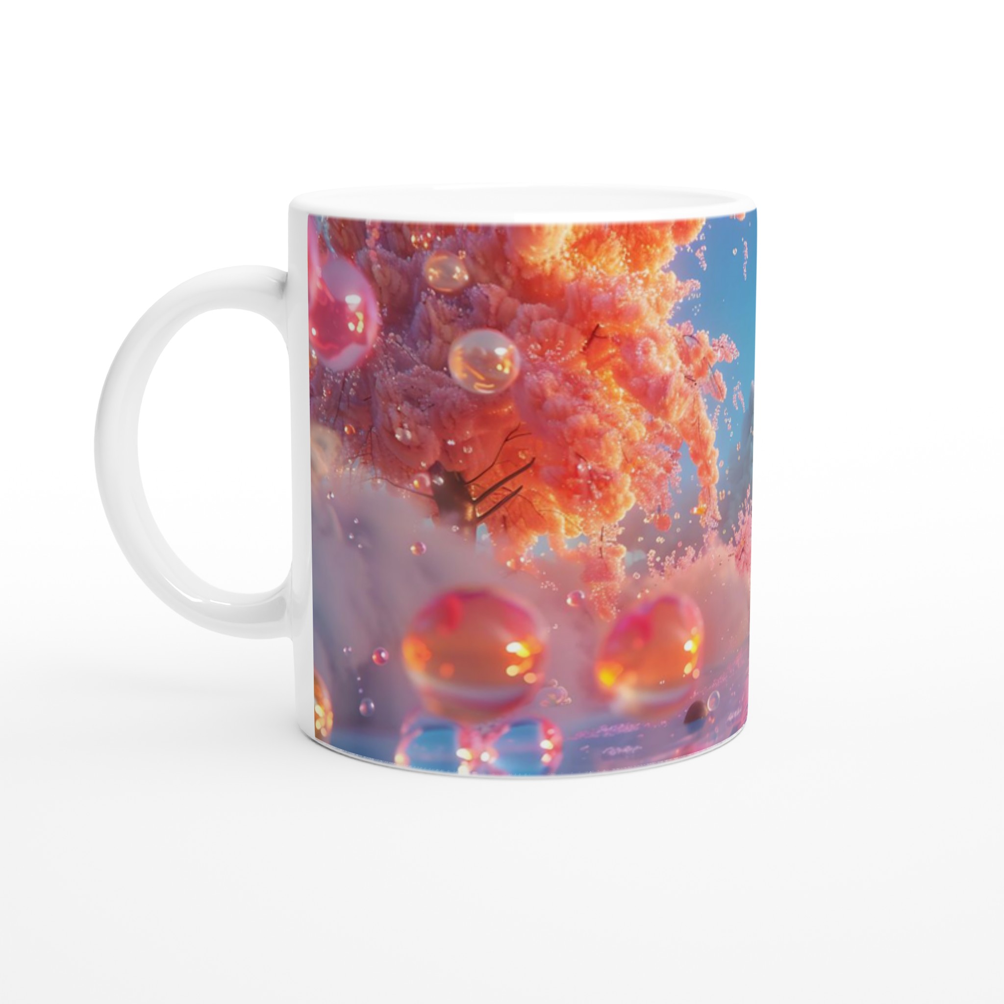 Inspirerad av en magisk värld av skira blommande träd, fluffiga pastellmoln och lekfullt skimrande bubblor, är denna mugg mer än bara en dryckesbehållare. Den fångar en drömlik känsla som förvandlar varje sipp till en stund av lugn och fantasi.