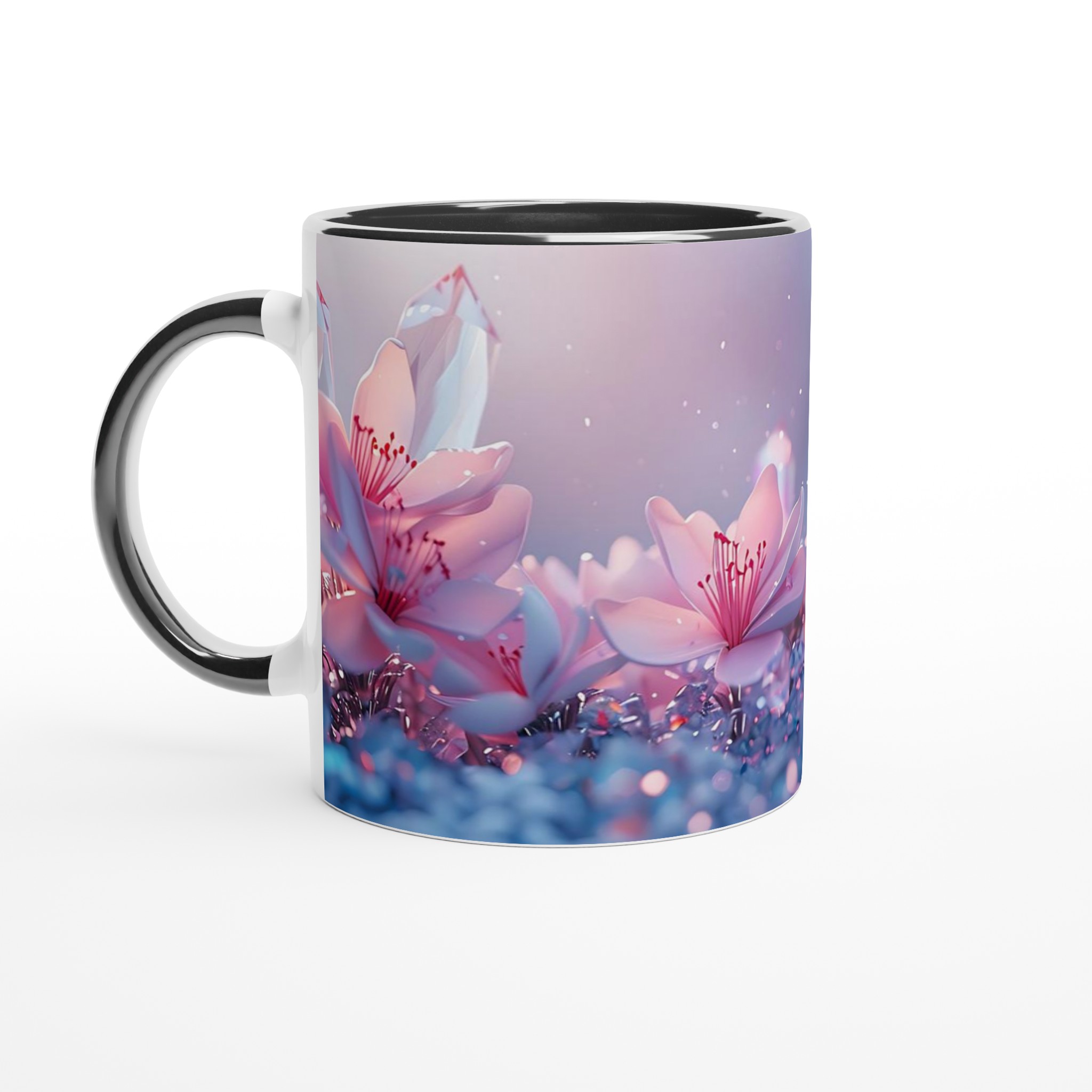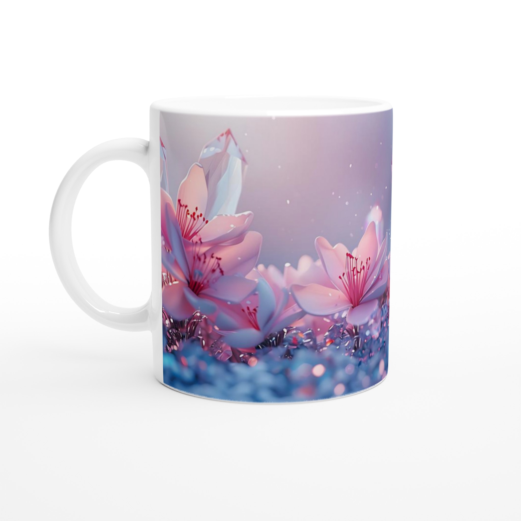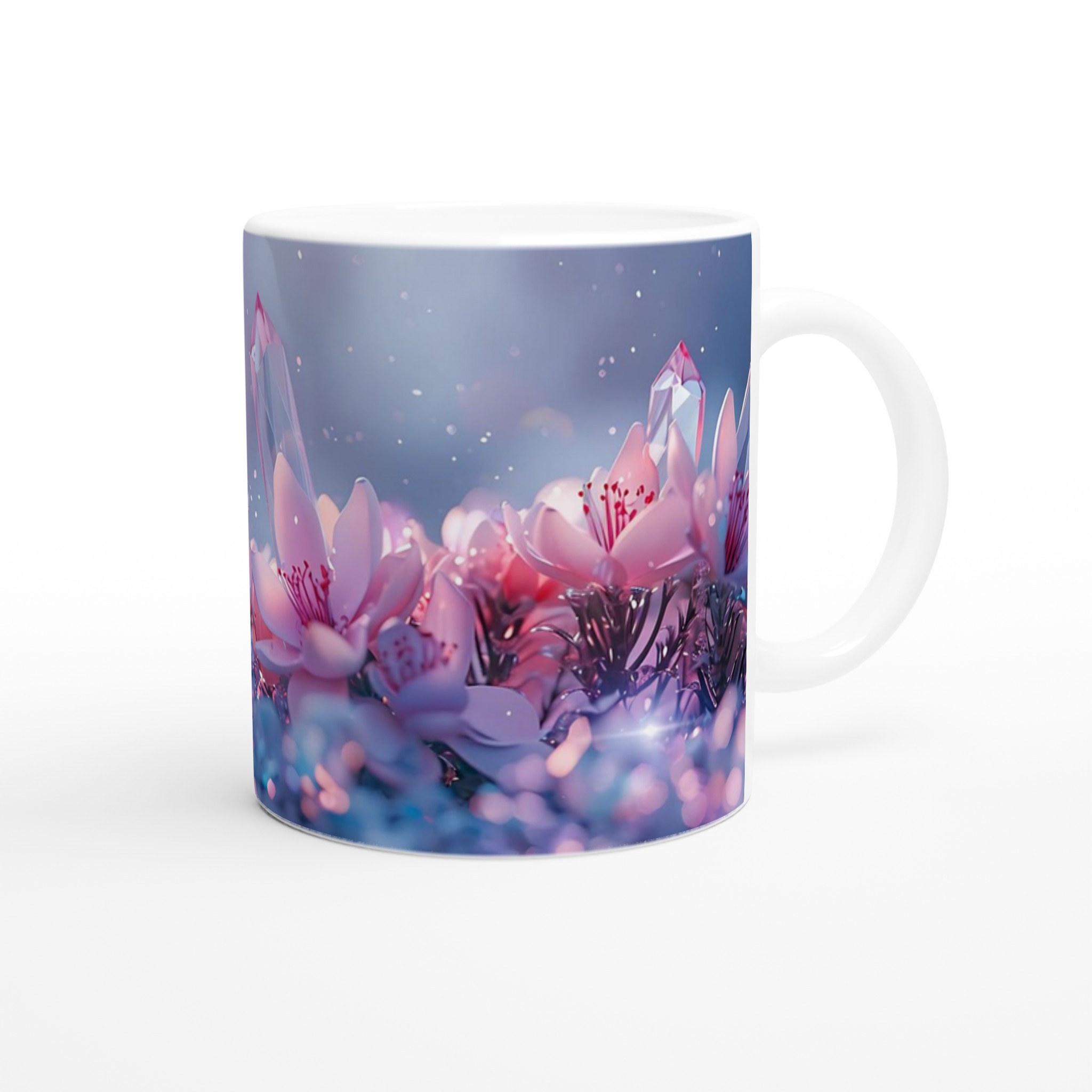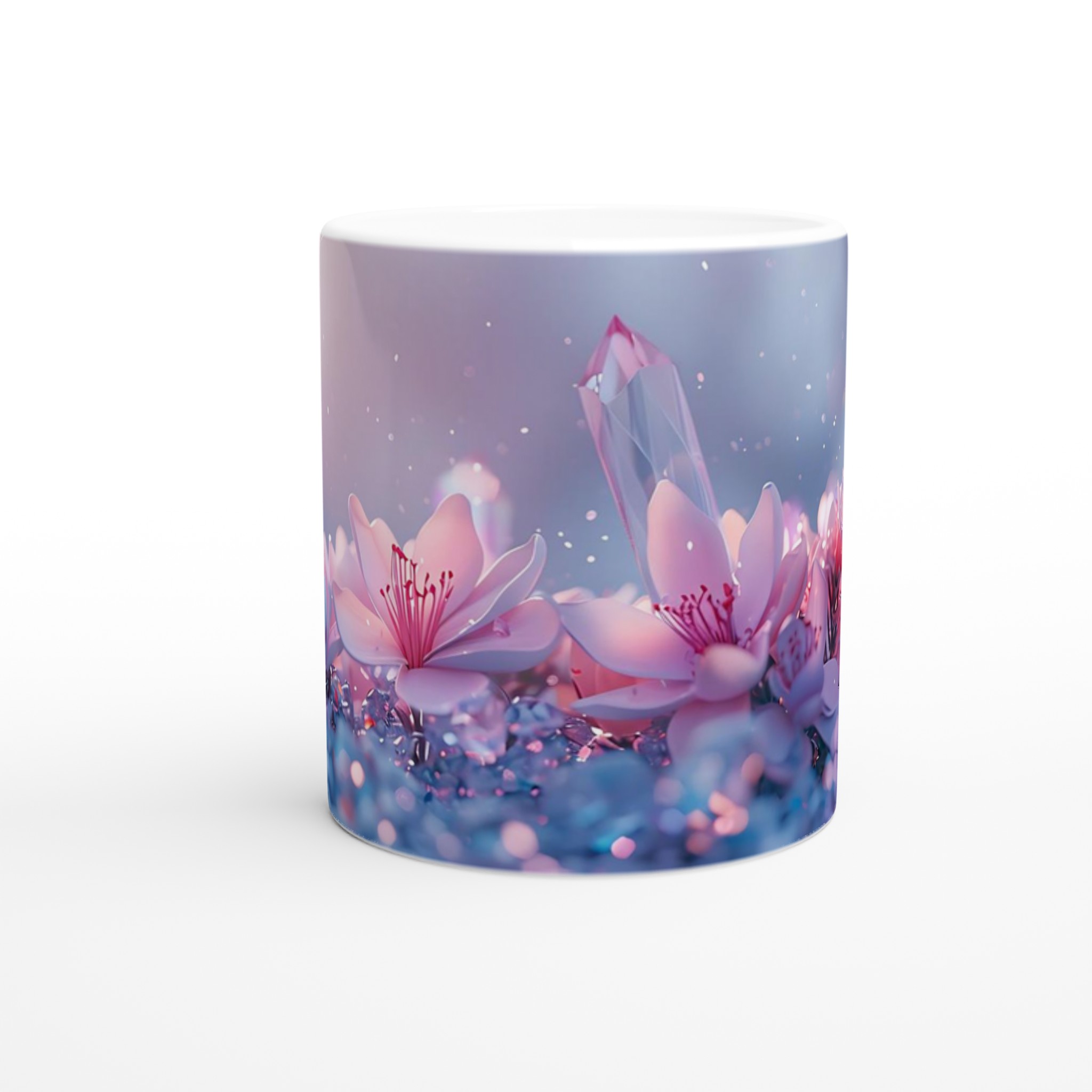 Låt dig svepas med av den eteriska skönheten från vår keramiska mugg, prydd med en drömsk bild av rosa blommor och gnistrande kristaller mot en mjukt pastellfärgad bakgrund. Denna mugg är inte bara en behållare för din dryck – den är en inbjudan till lugn och skönhet, en stunds avkoppling i en förtrollande värld. Perfekt för morgonkaffet, kvällens varma choklad eller när du bara vill njuta av en kopp te.