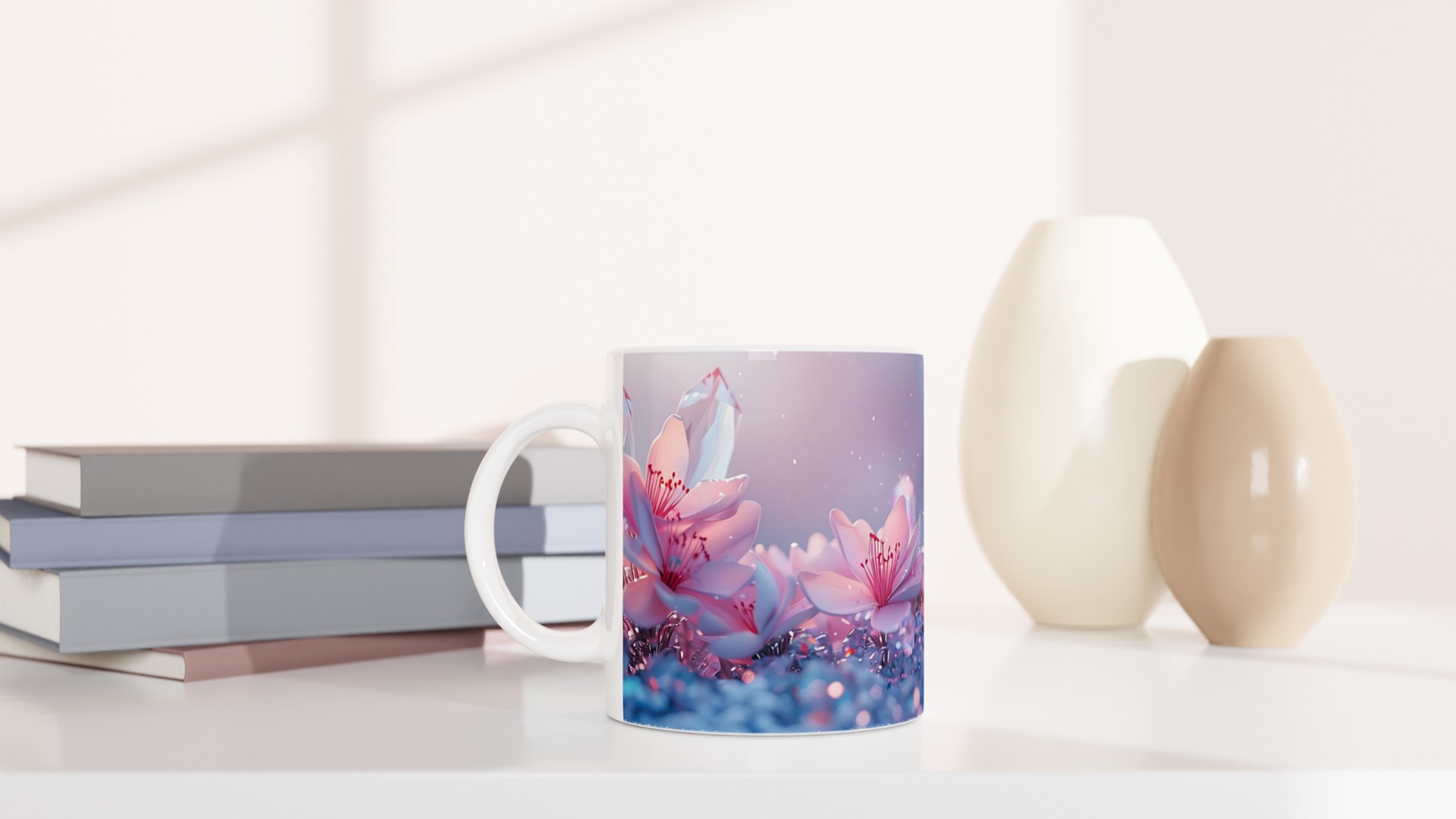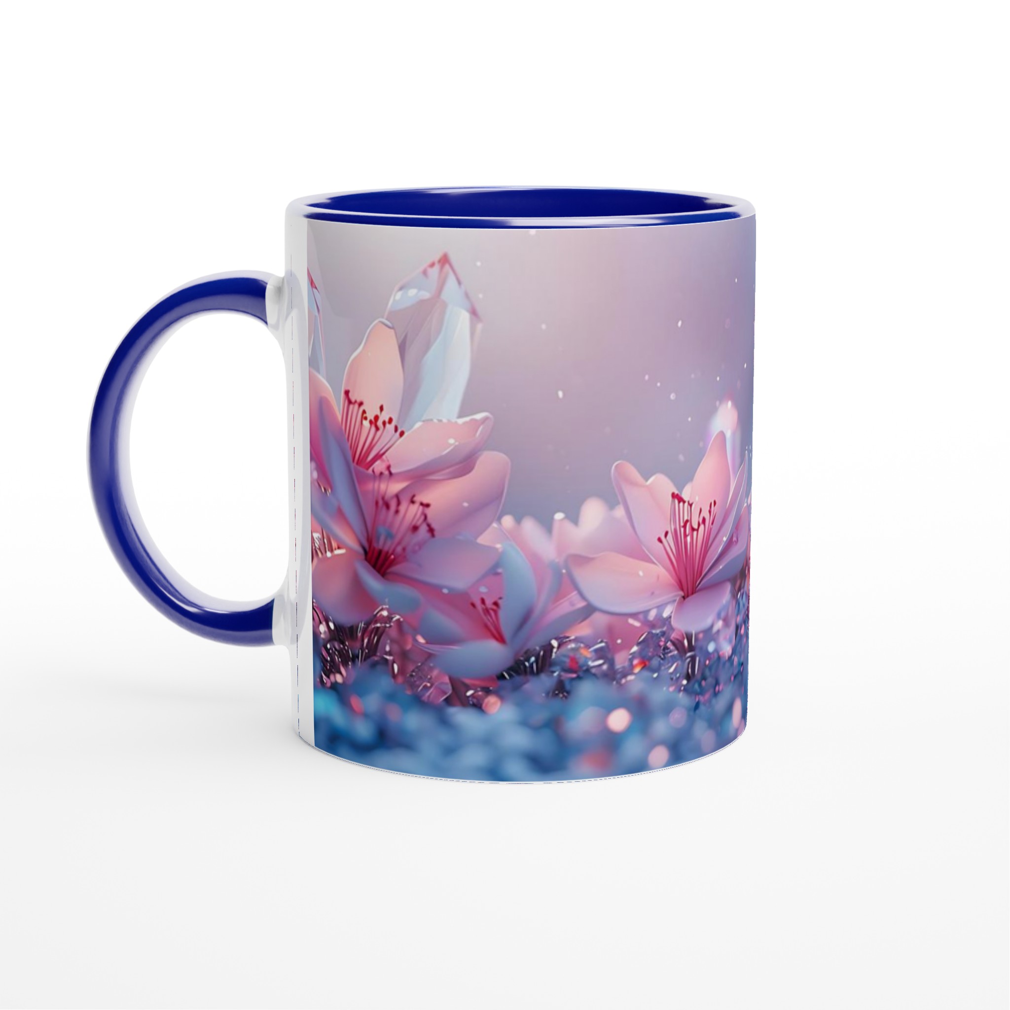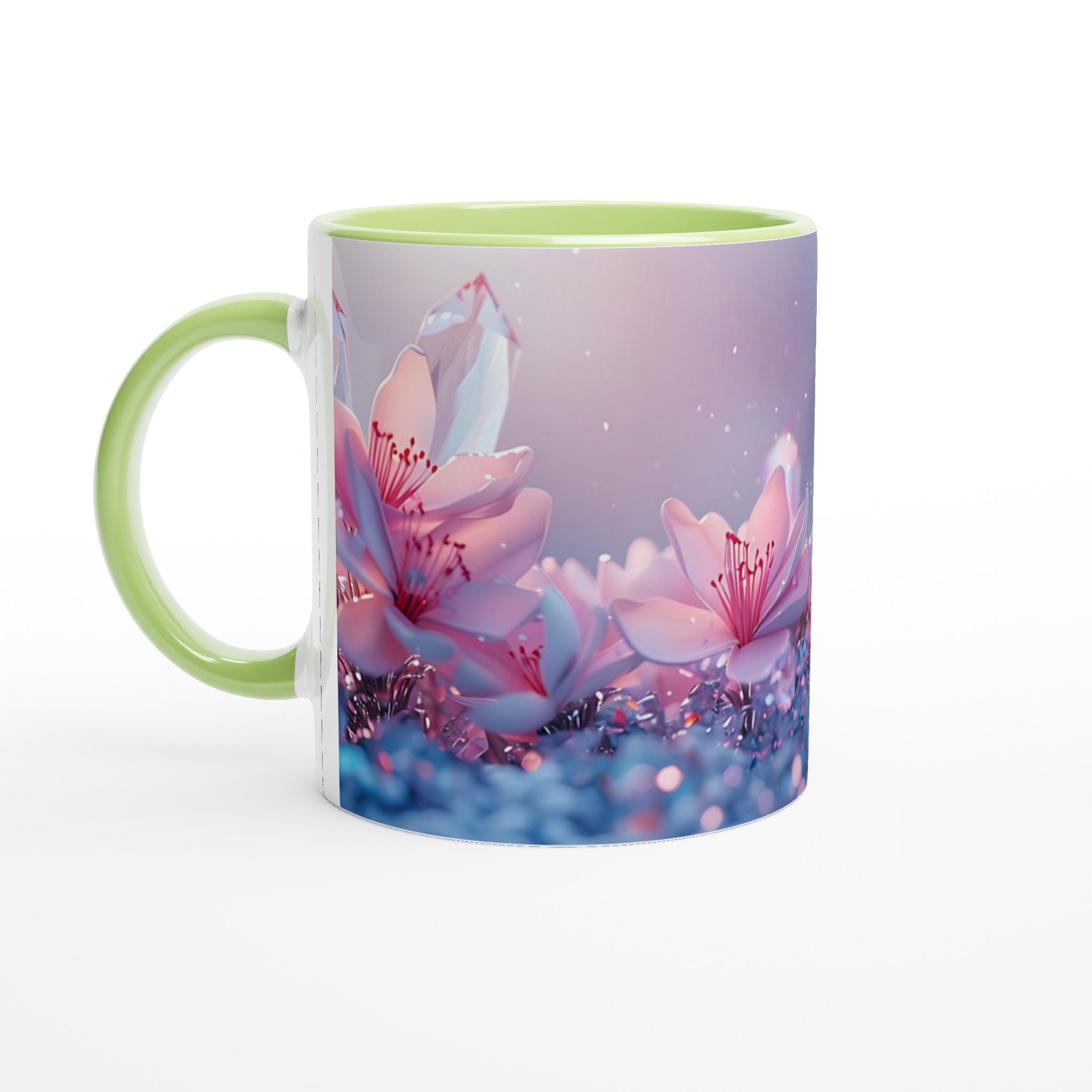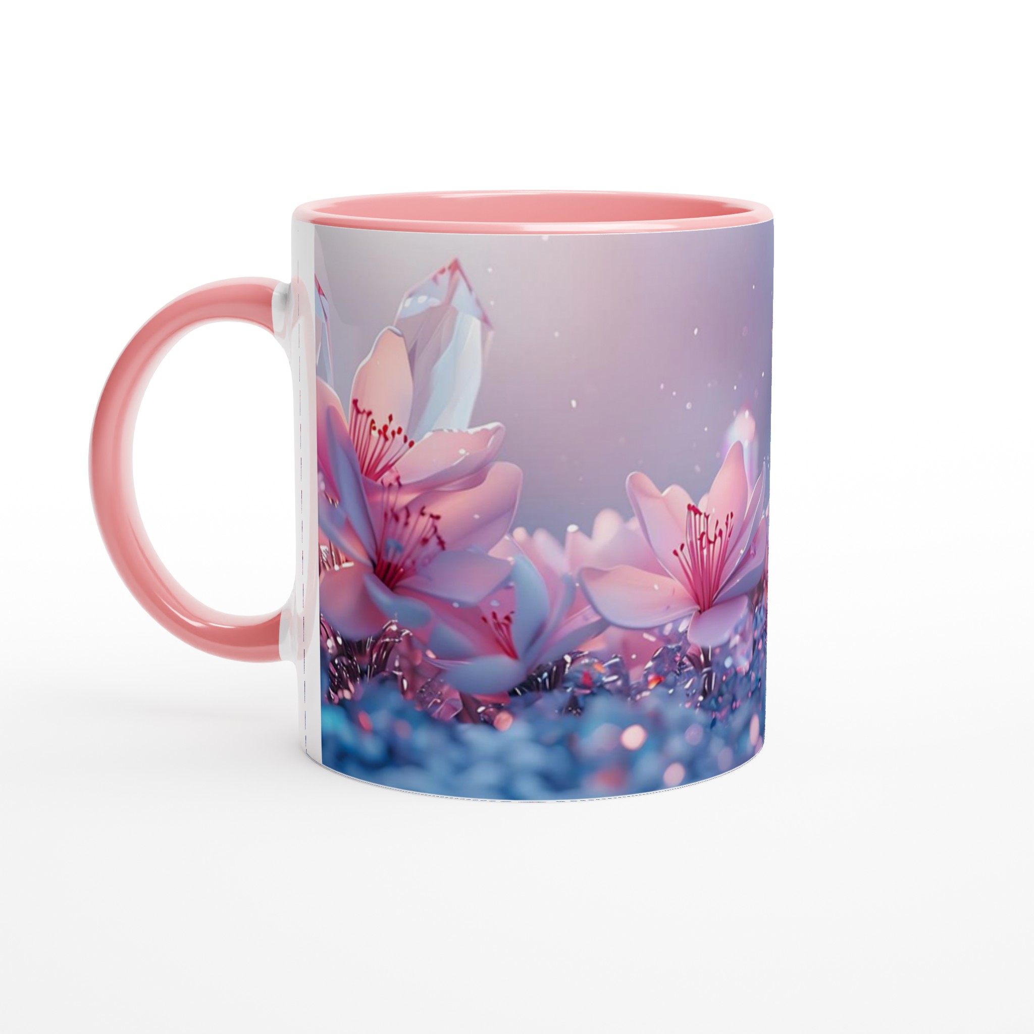Låt dig svepas med av den eteriska skönheten från vår keramiska mugg, prydd med en drömsk bild av rosa blommor och gnistrande kristaller mot en mjukt pastellfärgad bakgrund. Denna mugg är inte bara en behållare för din dryck – den är en inbjudan till lugn och skönhet, en stunds avkoppling i en förtrollande värld. Perfekt för morgonkaffet, kvällens varma choklad eller när du bara vill njuta av en kopp te.