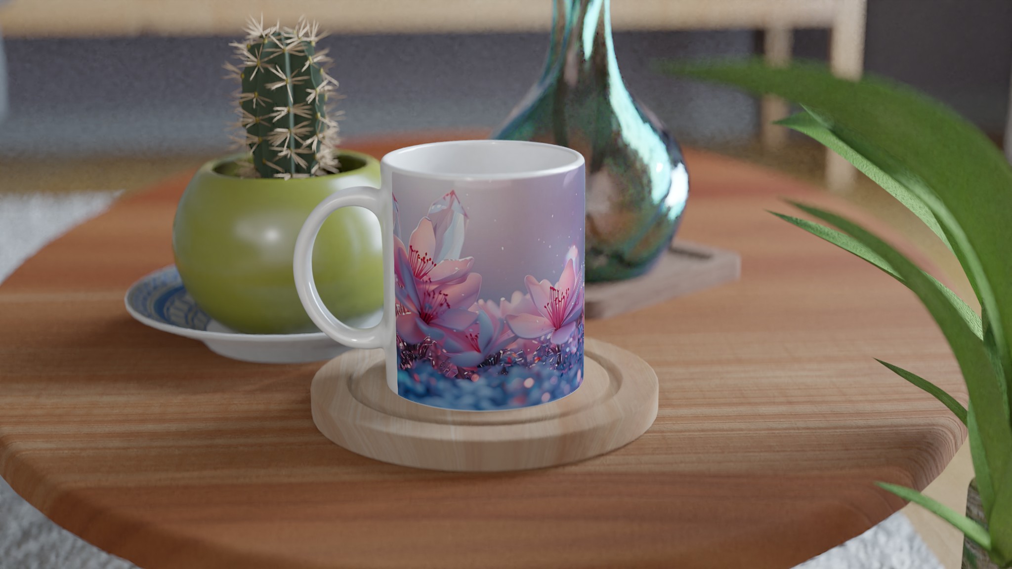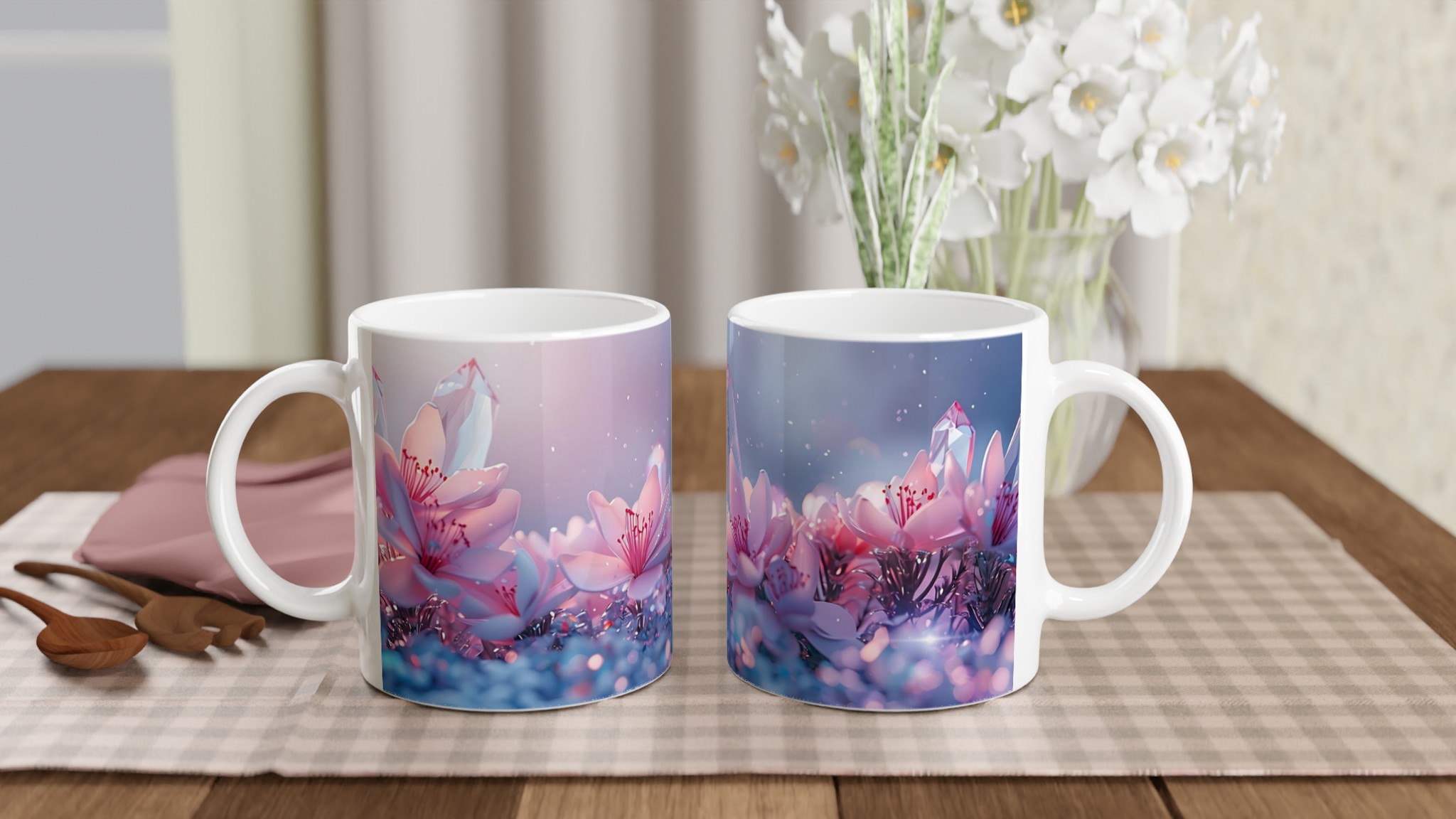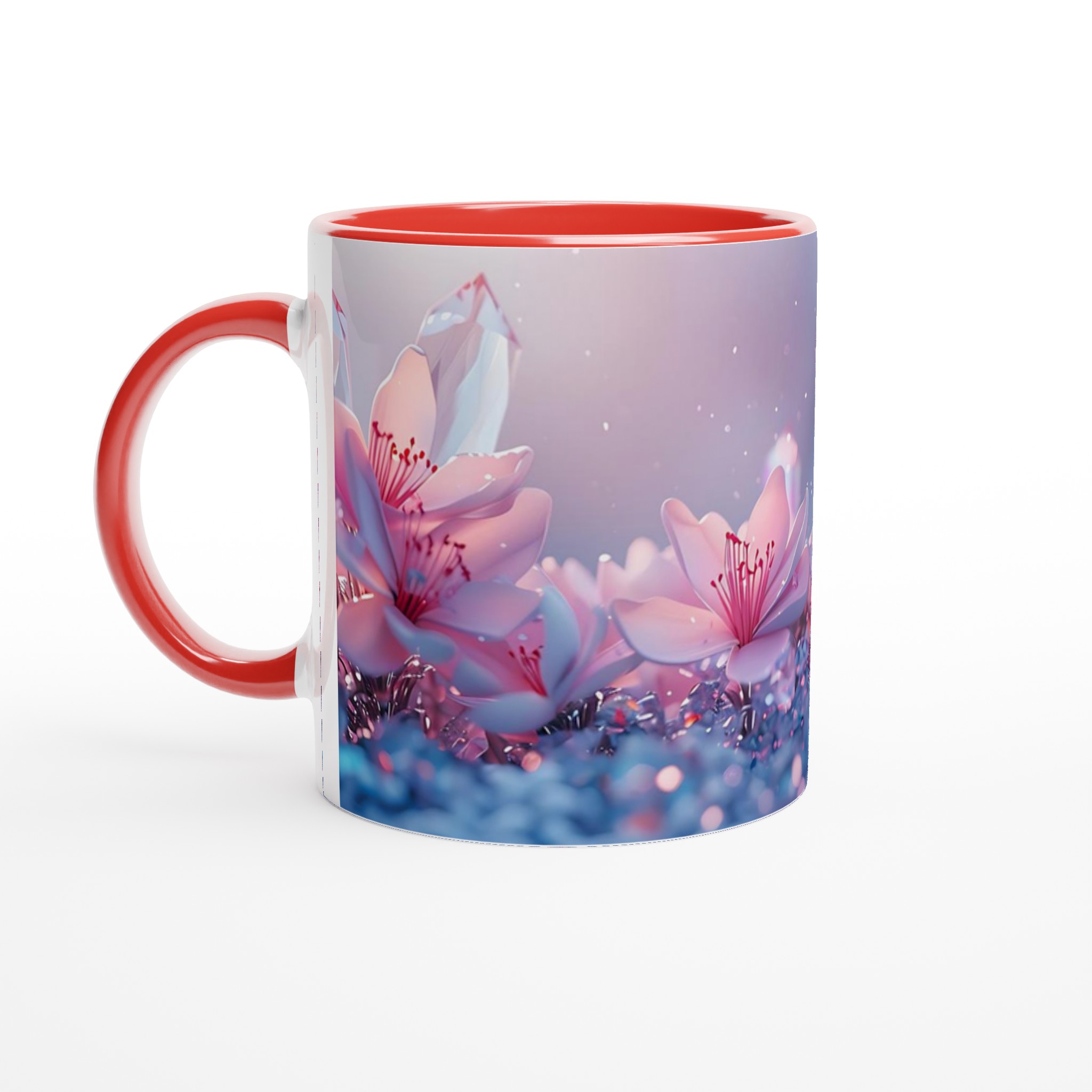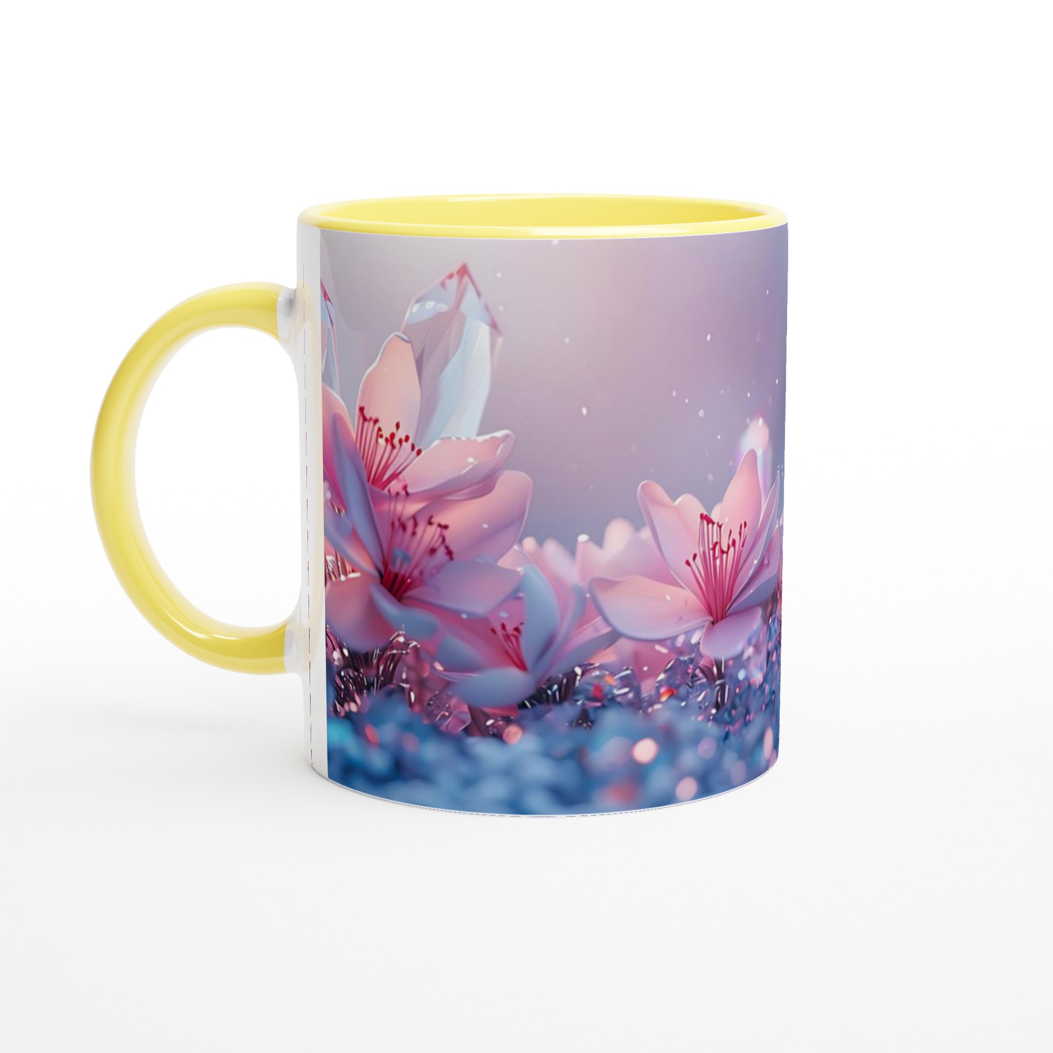 Låt dig svepas med av den eteriska skönheten från vår keramiska mugg, prydd med en drömsk bild av rosa blommor och gnistrande kristaller mot en mjukt pastellfärgad bakgrund. Denna mugg är inte bara en behållare för din dryck – den är en inbjudan till lugn och skönhet, en stunds avkoppling i en förtrollande värld. Perfekt för morgonkaffet, kvällens varma choklad eller när du bara vill njuta av en kopp te.