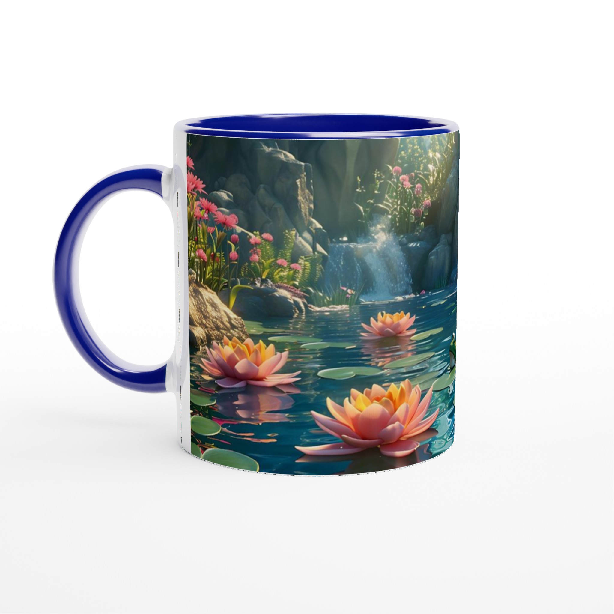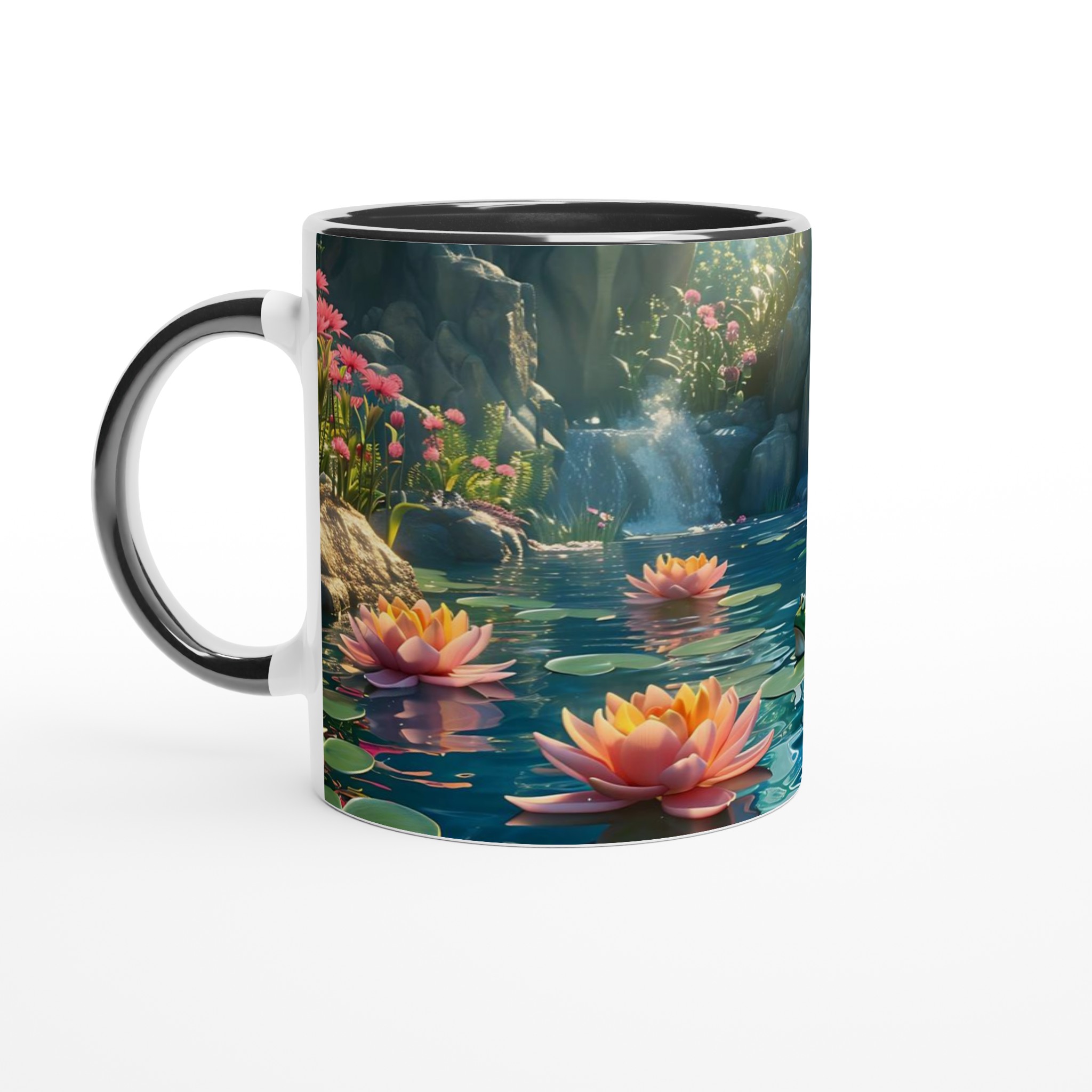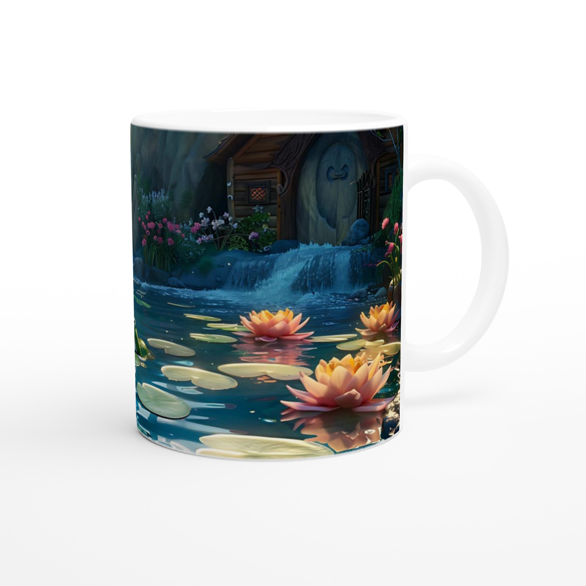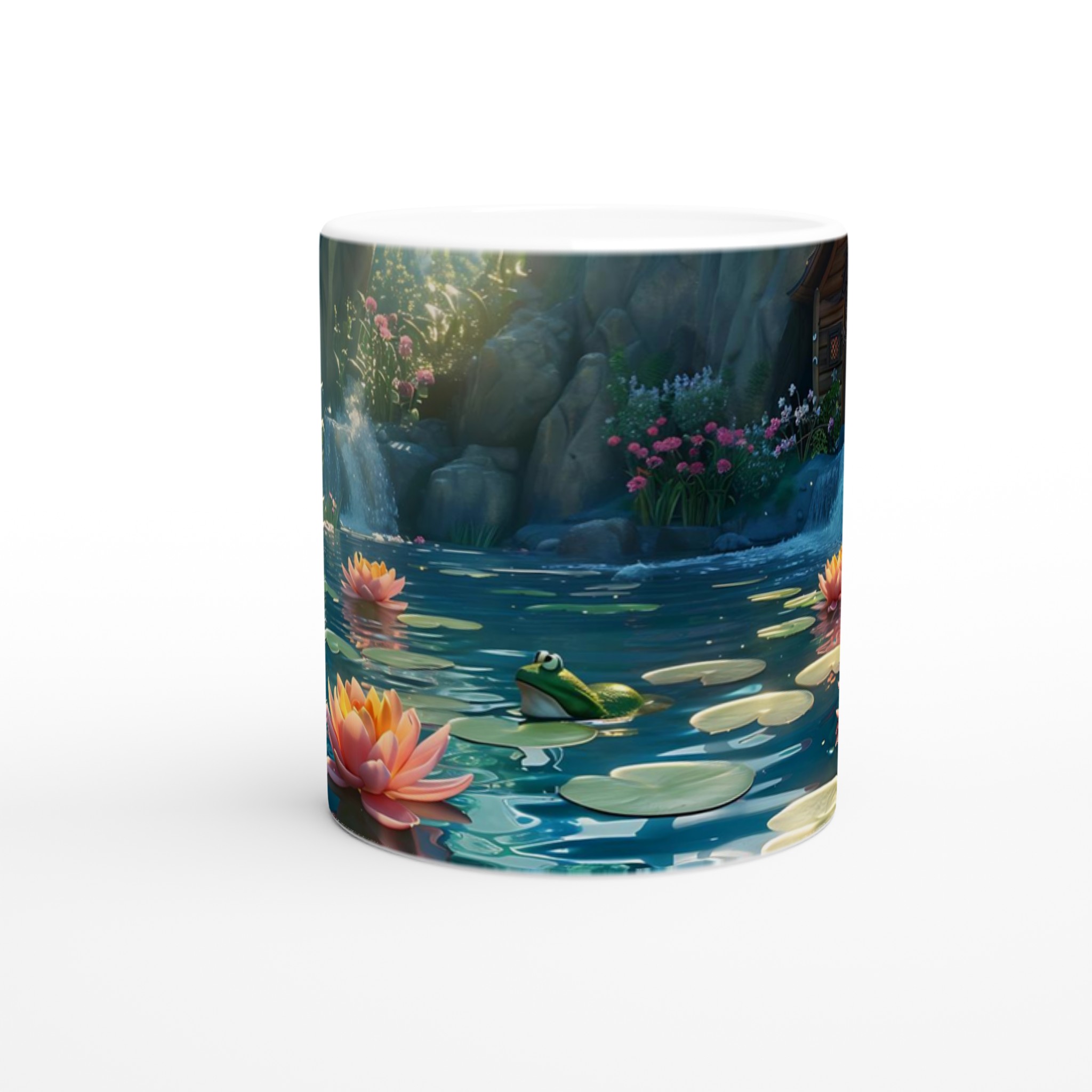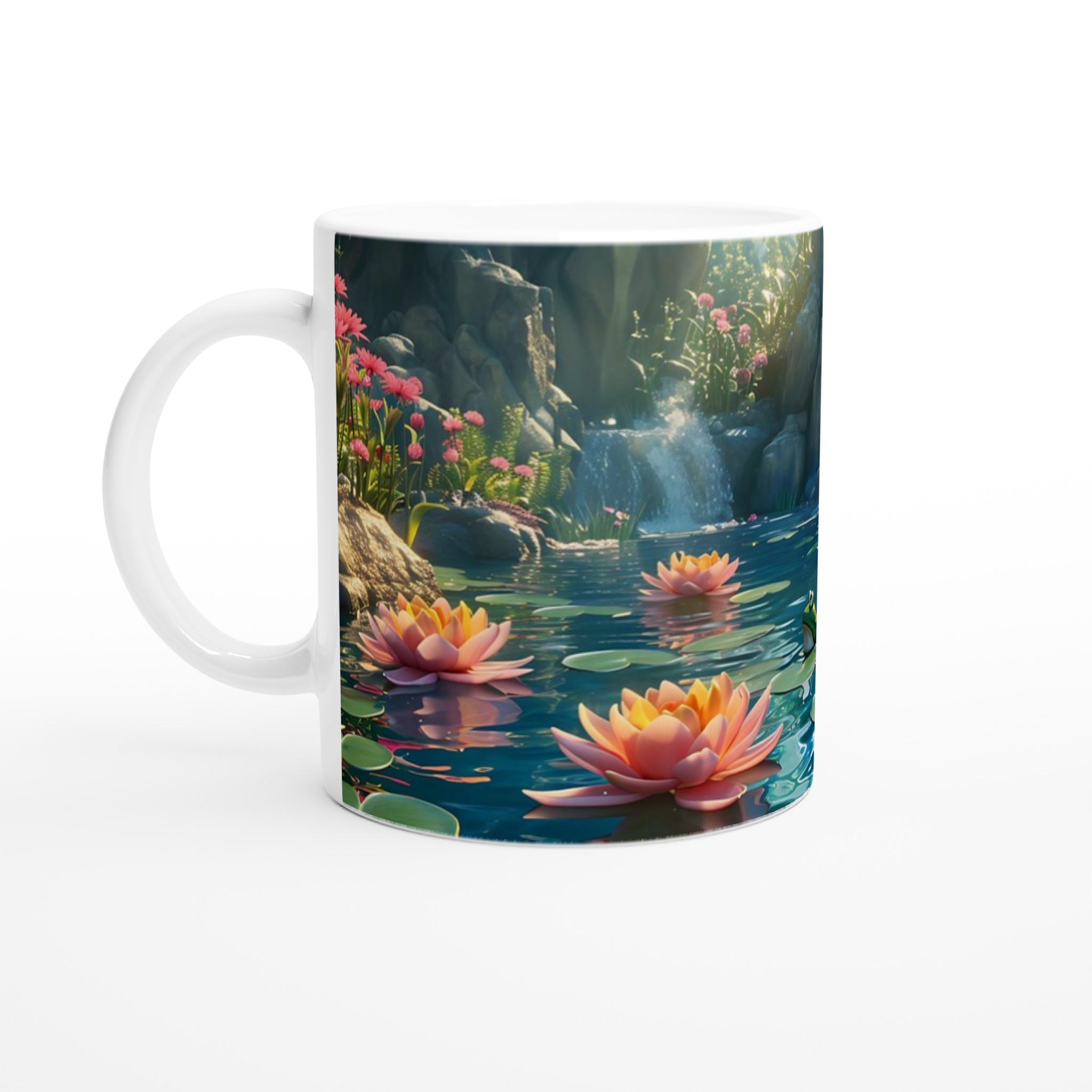Kliv in i en värld av lugn och förtrollning med denna magiska keramiska mugg. Varje klunk blir en resa till en drömlik lotusdamm, där en liten, söt groda vilar bland blommande näckrosor och speglande vattenfall under en solbelyst himmel. Denna unika design fångar skönheten i naturens under, med en palett av lugnande blått, ljust korallrosa och frodiga gröna toner som ger en känsla av ro och inspiration till din dag.