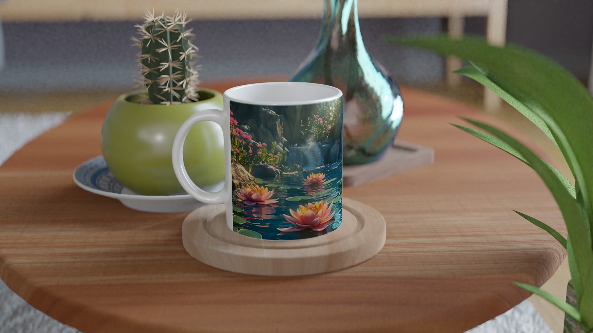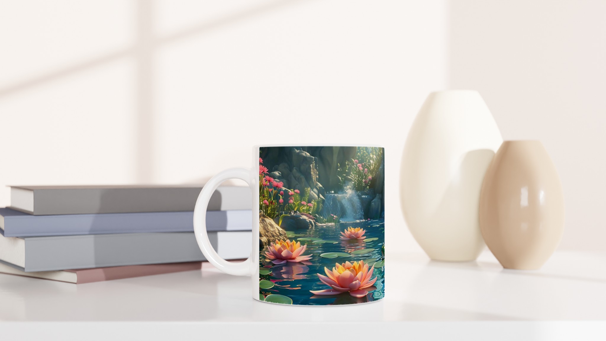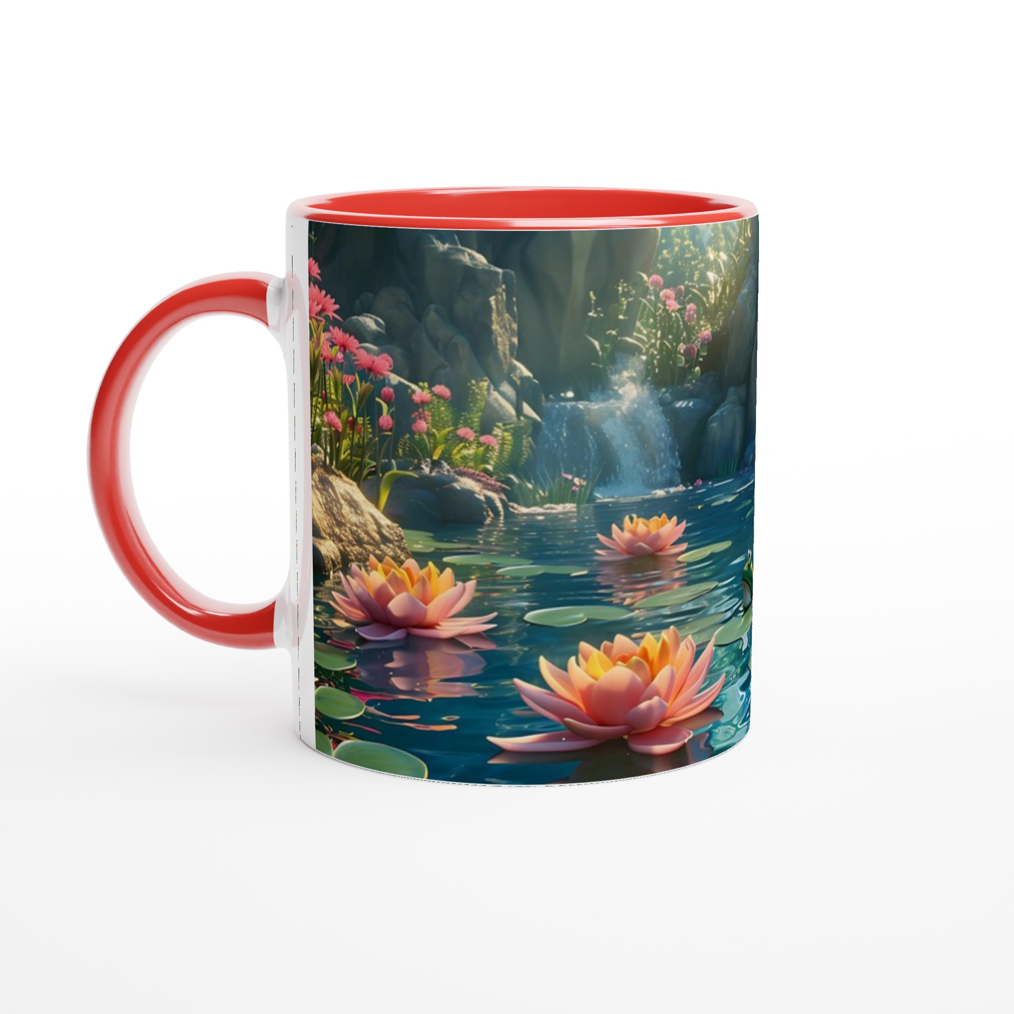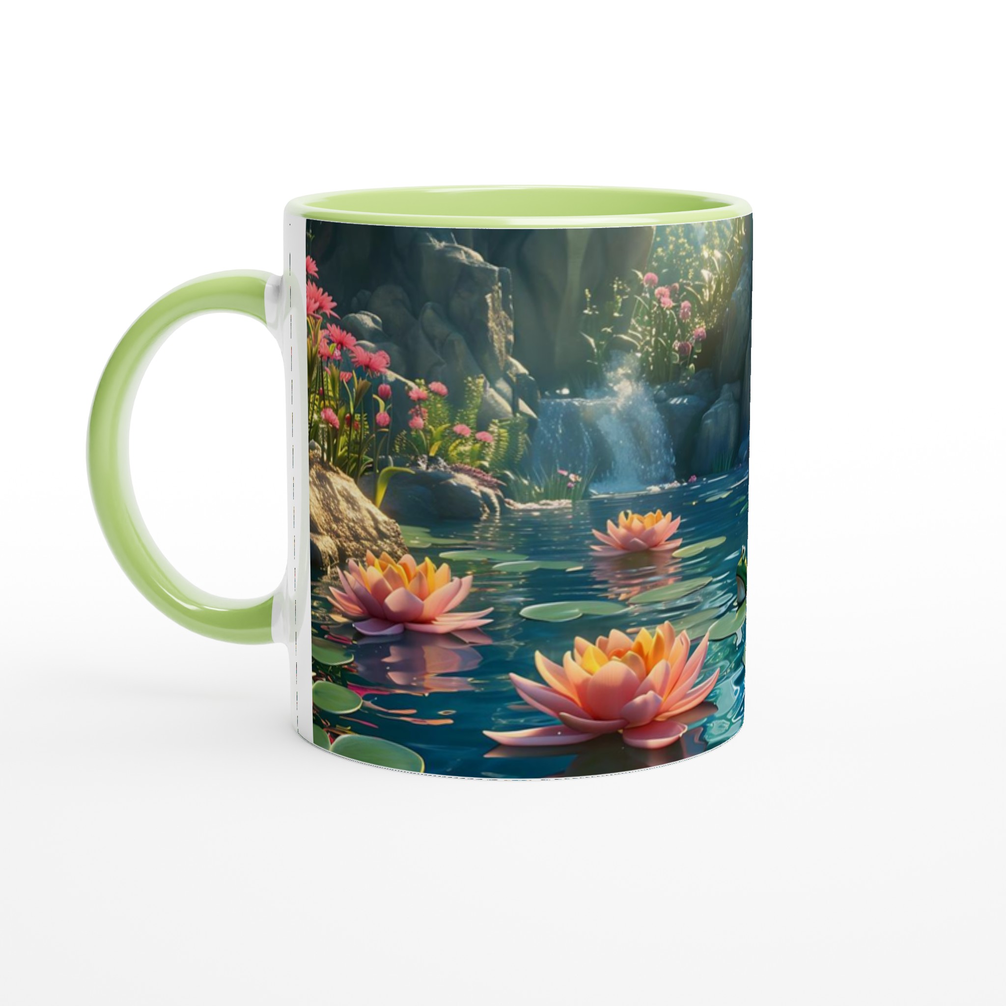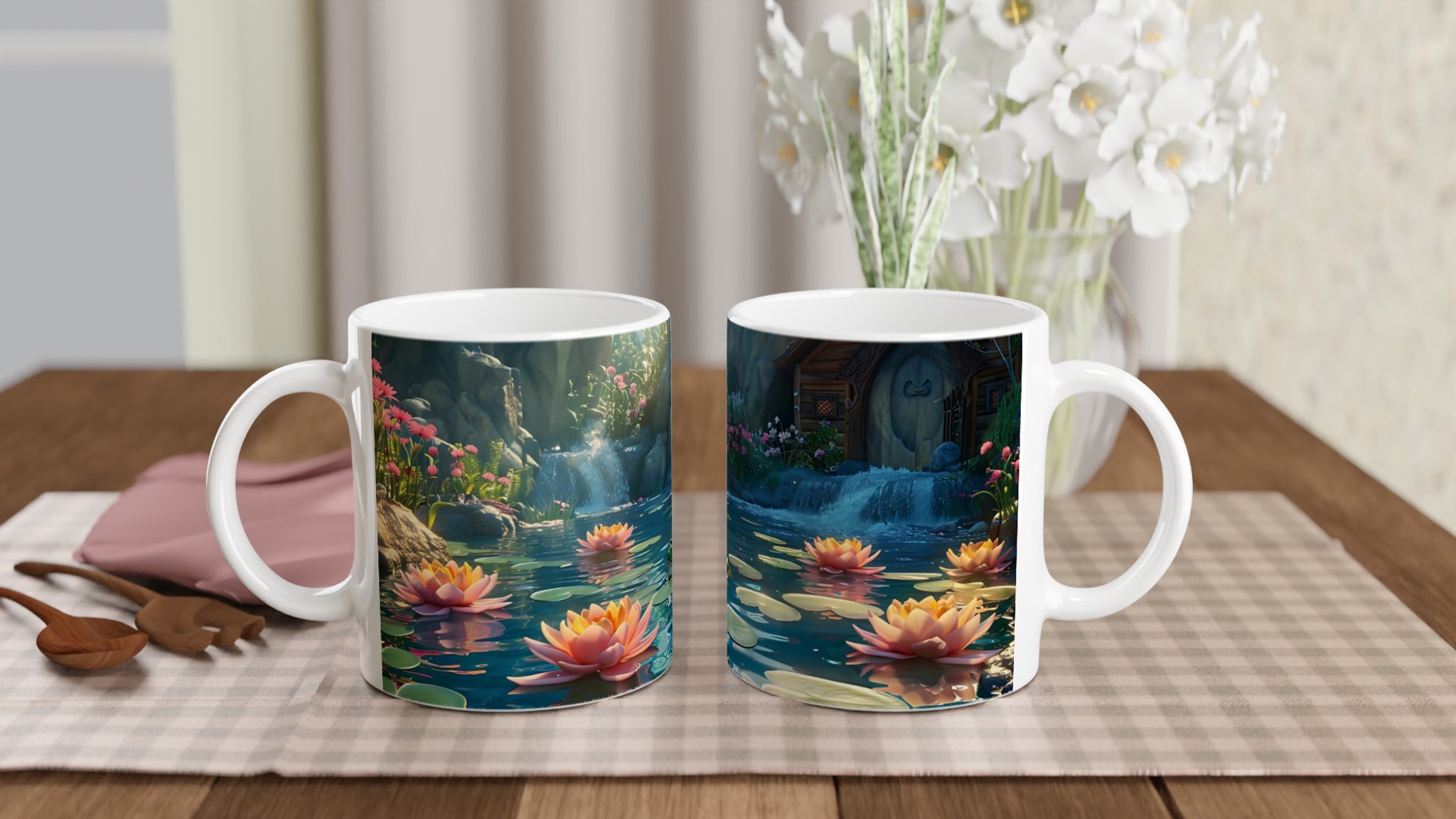 Kliv in i en värld av lugn och förtrollning med denna magiska keramiska mugg. Varje klunk blir en resa till en drömlik lotusdamm, där en liten, söt groda vilar bland blommande näckrosor och speglande vattenfall under en solbelyst himmel. Denna unika design fångar skönheten i naturens under, med en palett av lugnande blått, ljust korallrosa och frodiga gröna toner som ger en känsla av ro och inspiration till din dag.