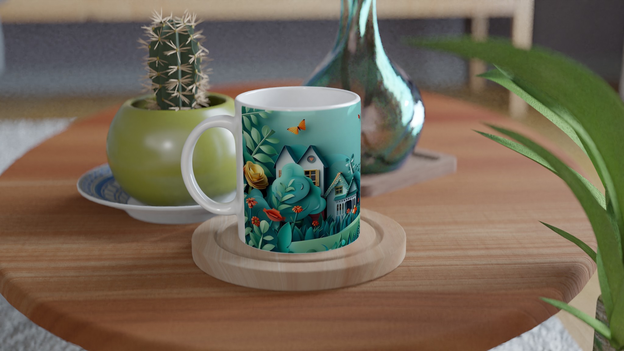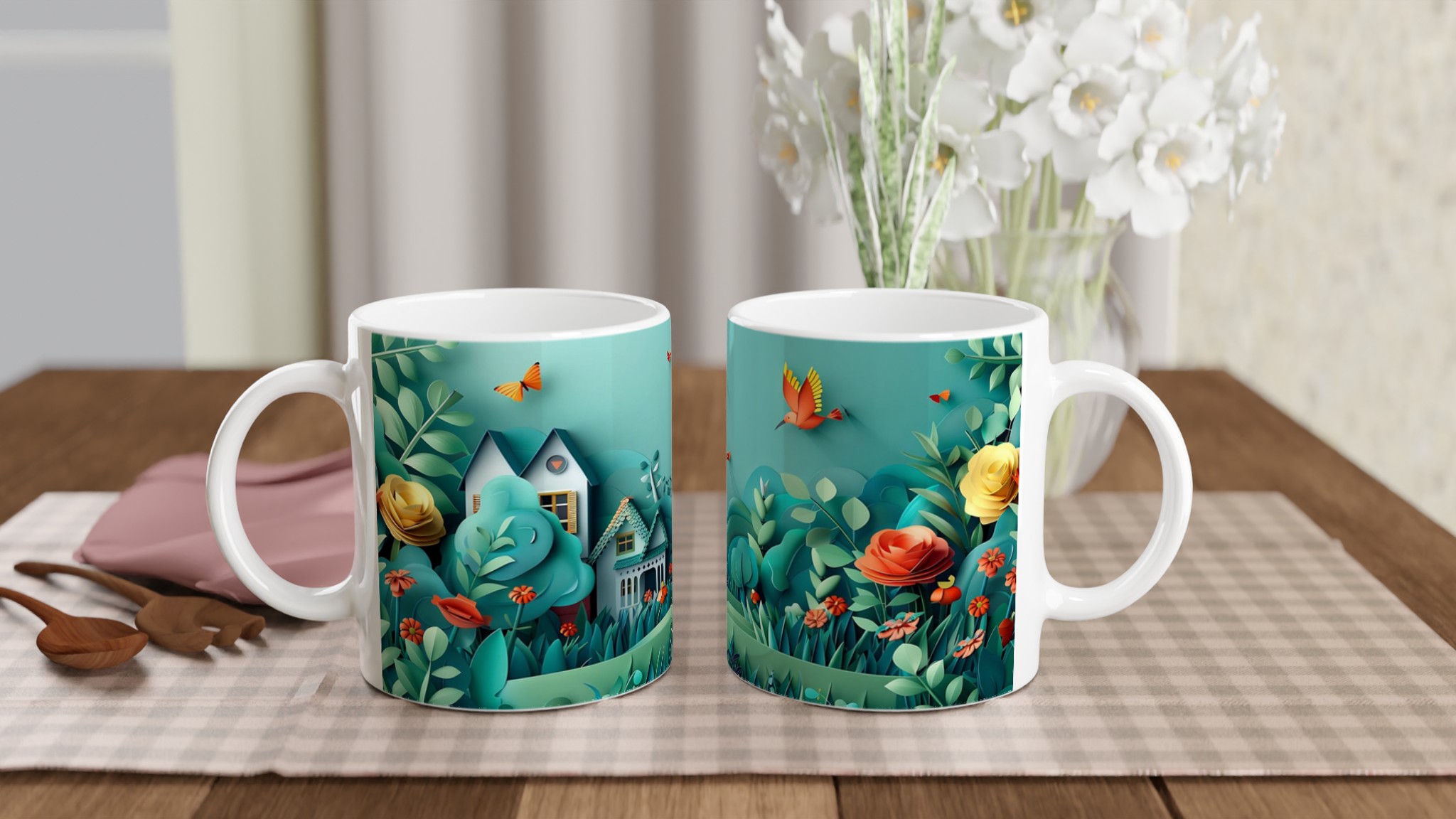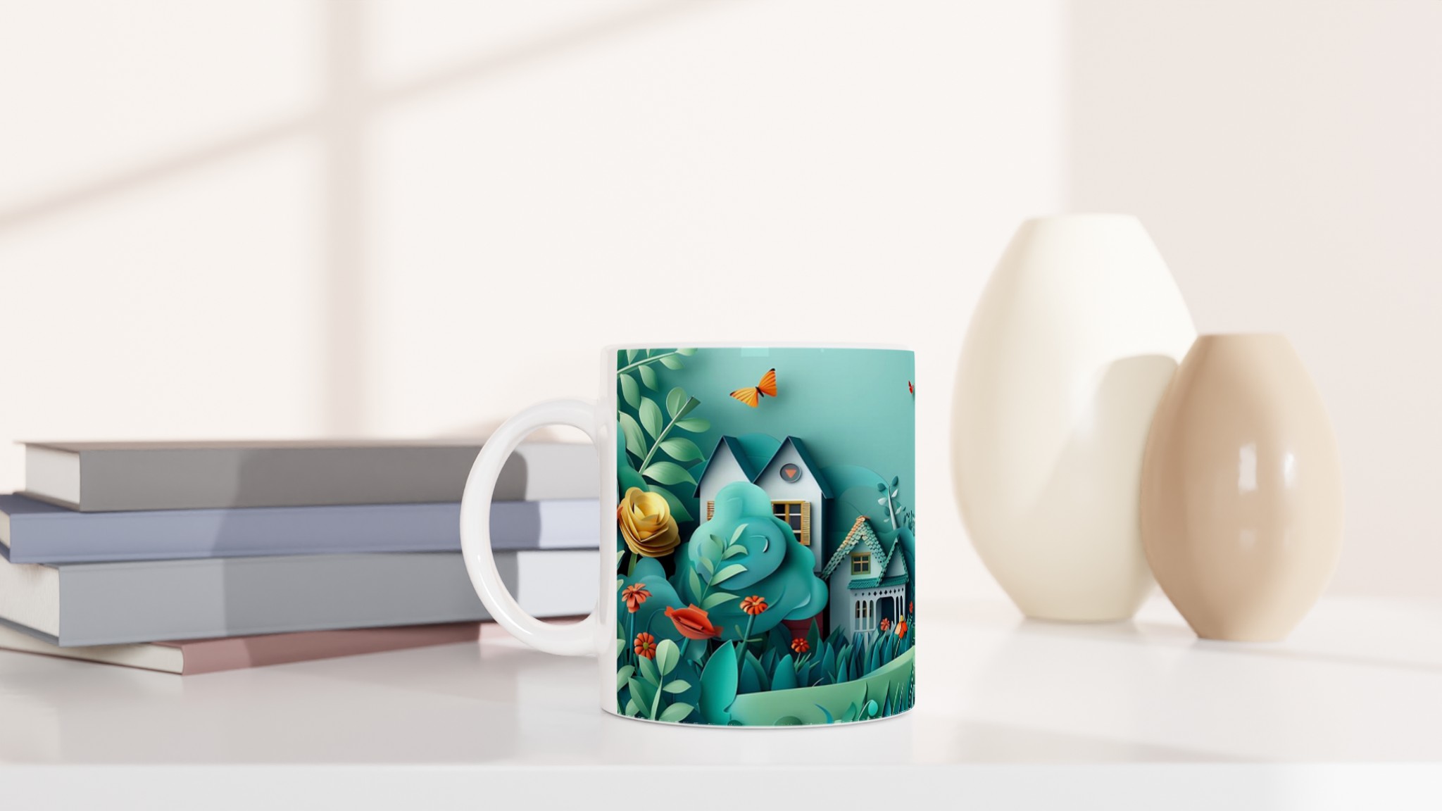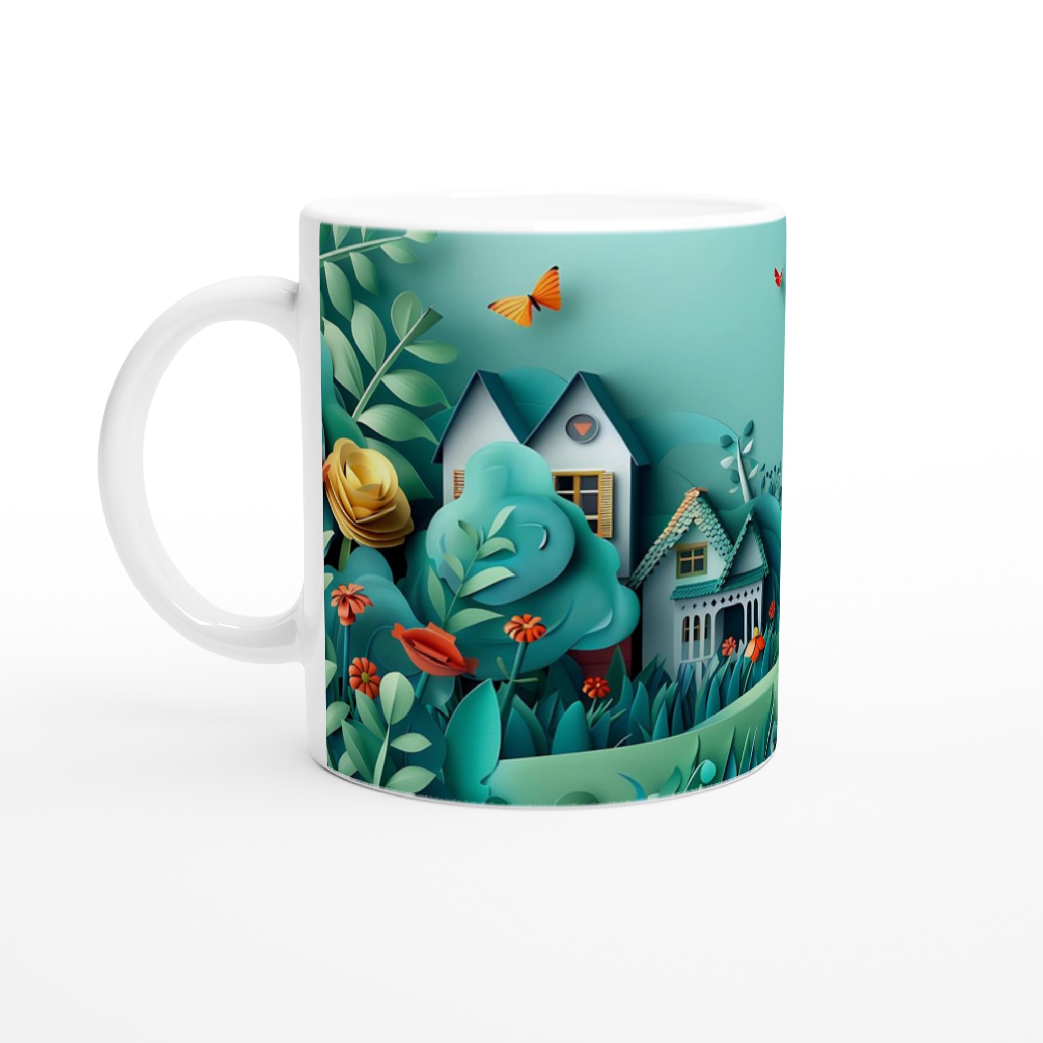 Stig in i en förtrollande sagovärld varje gång du tar en klunk! Den här stilrena keramiska muggen, prydd med ett drömskt landskap av frodiga gröna toner, lekfulla hus och livfulla pappersblommor, blir snabbt en vardagsfavorit. Perfekt för morgonkaffet, kvällens varma choklad eller när du bara vill njuta av en kopp te i en inspirerande miljö. Den blanka vita ytan gör att trycken framhävs med klara och levande färger, som håller sig fina även efter många turer i mikron och diskmaskinen.