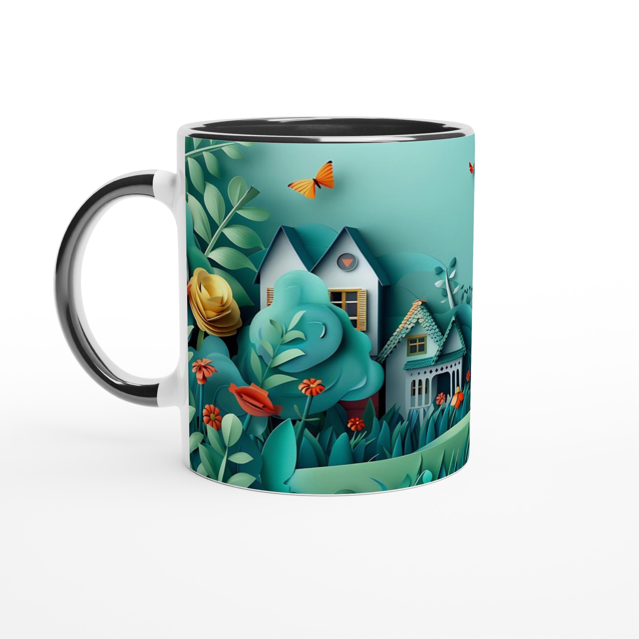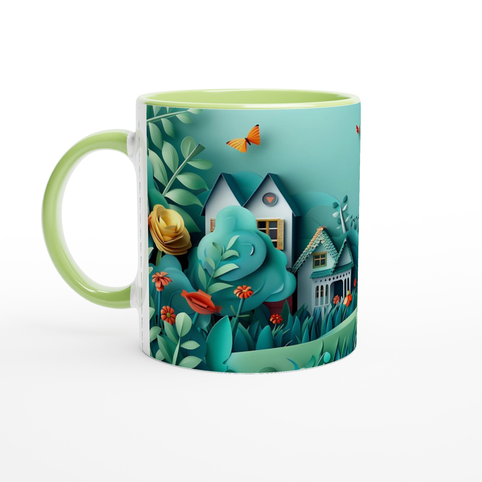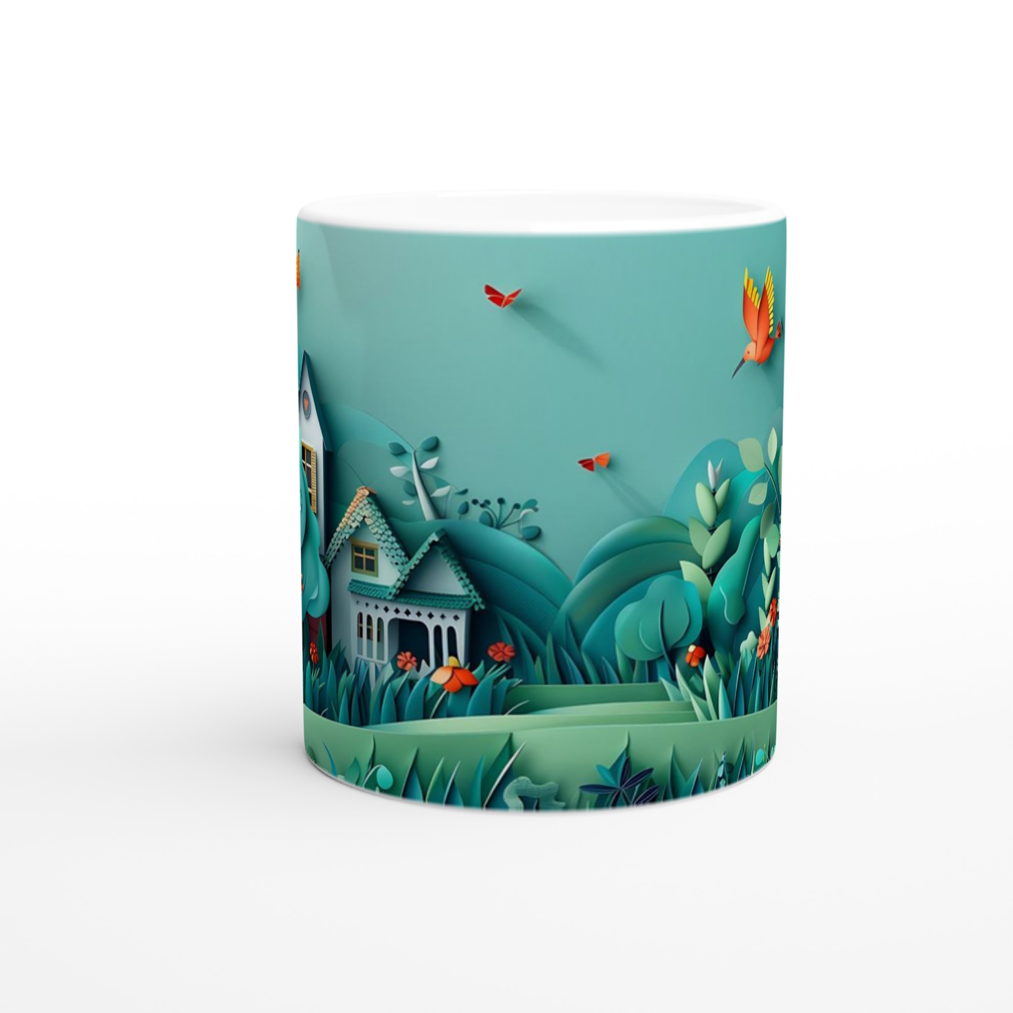 Stig in i en förtrollande sagovärld varje gång du tar en klunk! Den här stilrena keramiska muggen, prydd med ett drömskt landskap av frodiga gröna toner, lekfulla hus och livfulla pappersblommor, blir snabbt en vardagsfavorit. Perfekt för morgonkaffet, kvällens varma choklad eller när du bara vill njuta av en kopp te i en inspirerande miljö. Den blanka vita ytan gör att trycken framhävs med klara och levande färger, som håller sig fina även efter många turer i mikron och diskmaskinen.