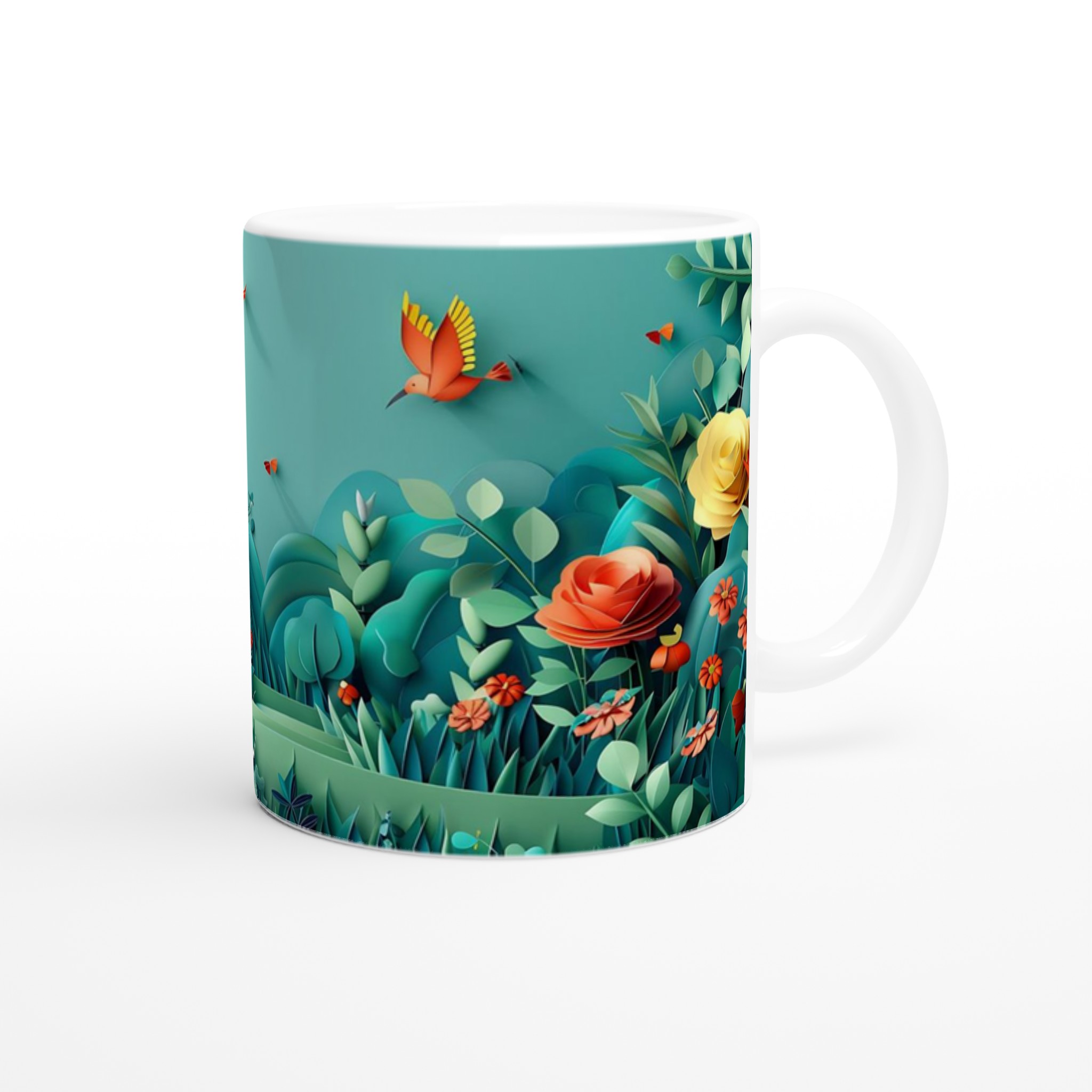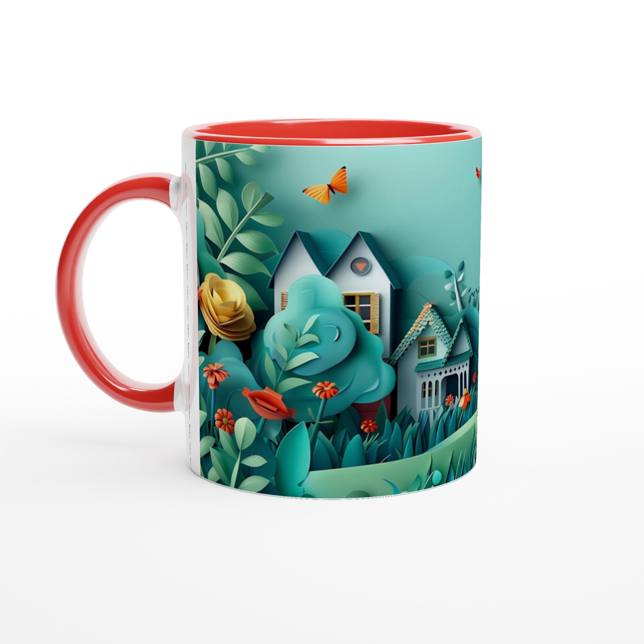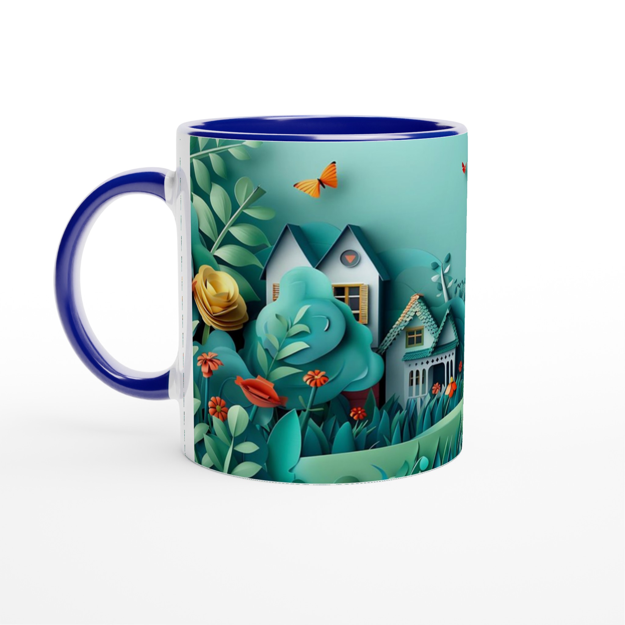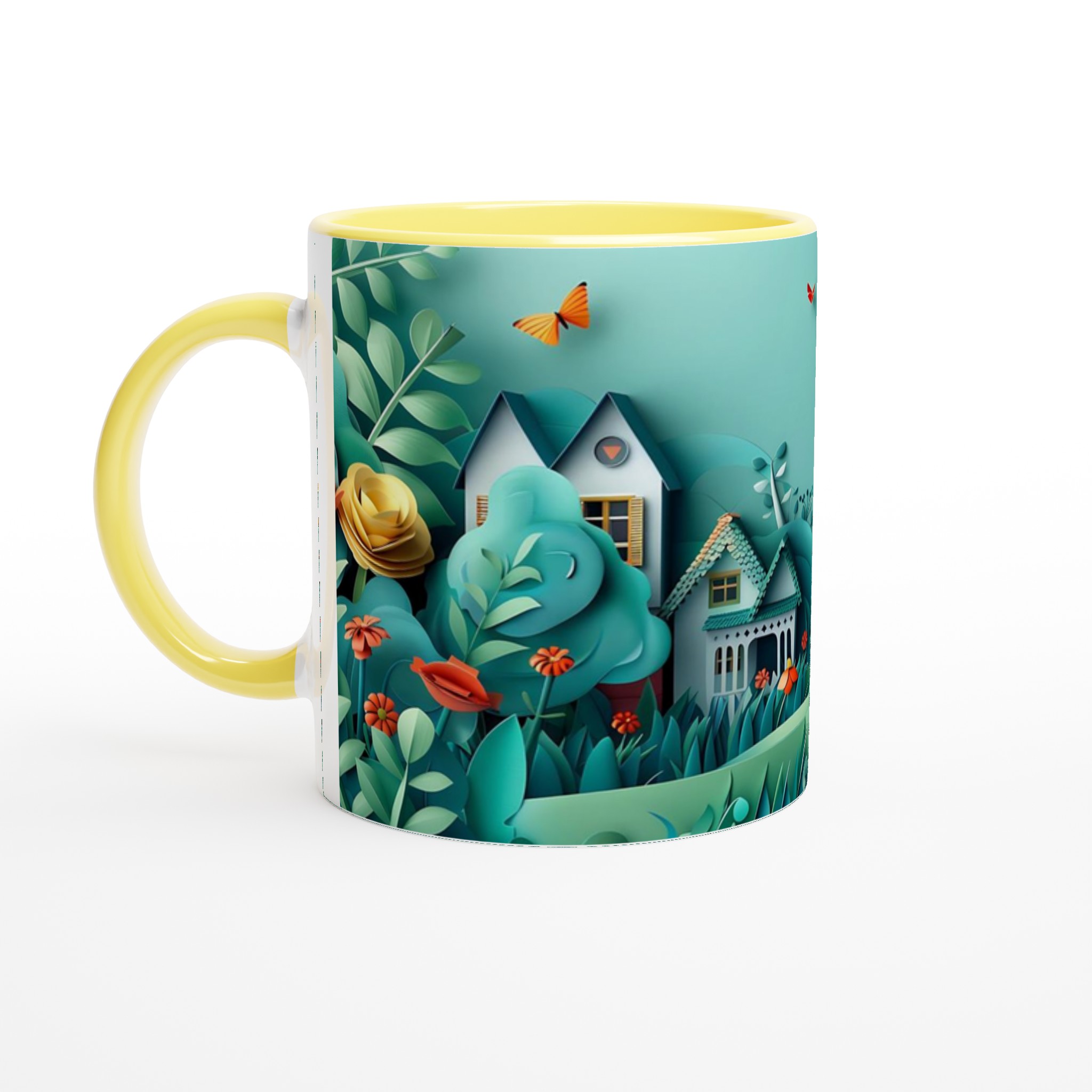 Stig in i en förtrollande sagovärld varje gång du tar en klunk! Den här stilrena keramiska muggen, prydd med ett drömskt landskap av frodiga gröna toner, lekfulla hus och livfulla pappersblommor, blir snabbt en vardagsfavorit. Perfekt för morgonkaffet, kvällens varma choklad eller när du bara vill njuta av en kopp te i en inspirerande miljö. Den blanka vita ytan gör att trycken framhävs med klara och levande färger, som håller sig fina även efter många turer i mikron och diskmaskinen.