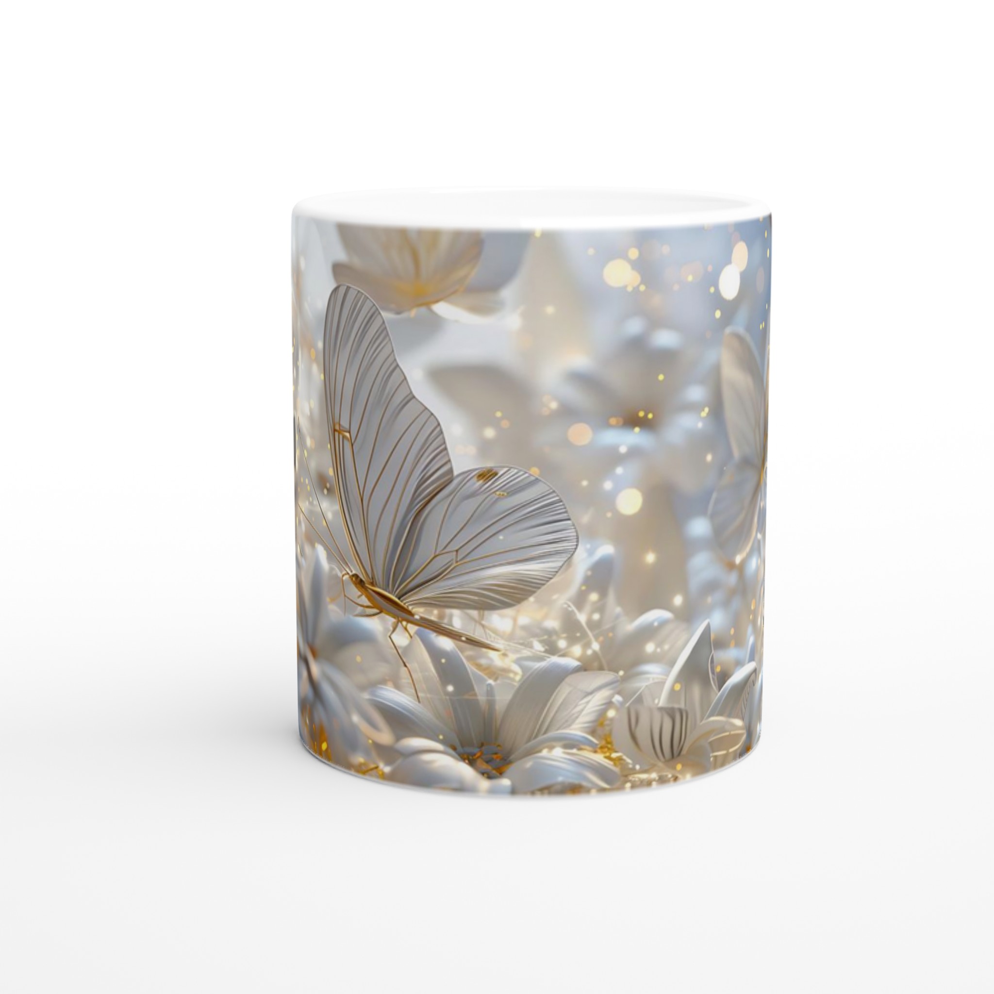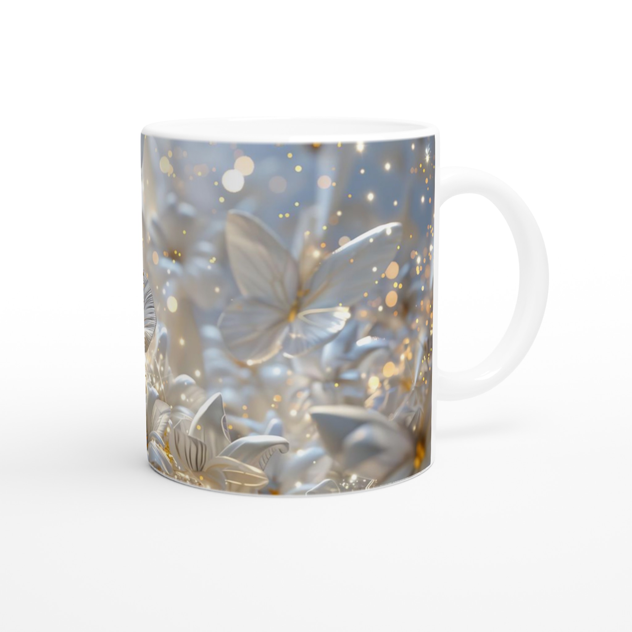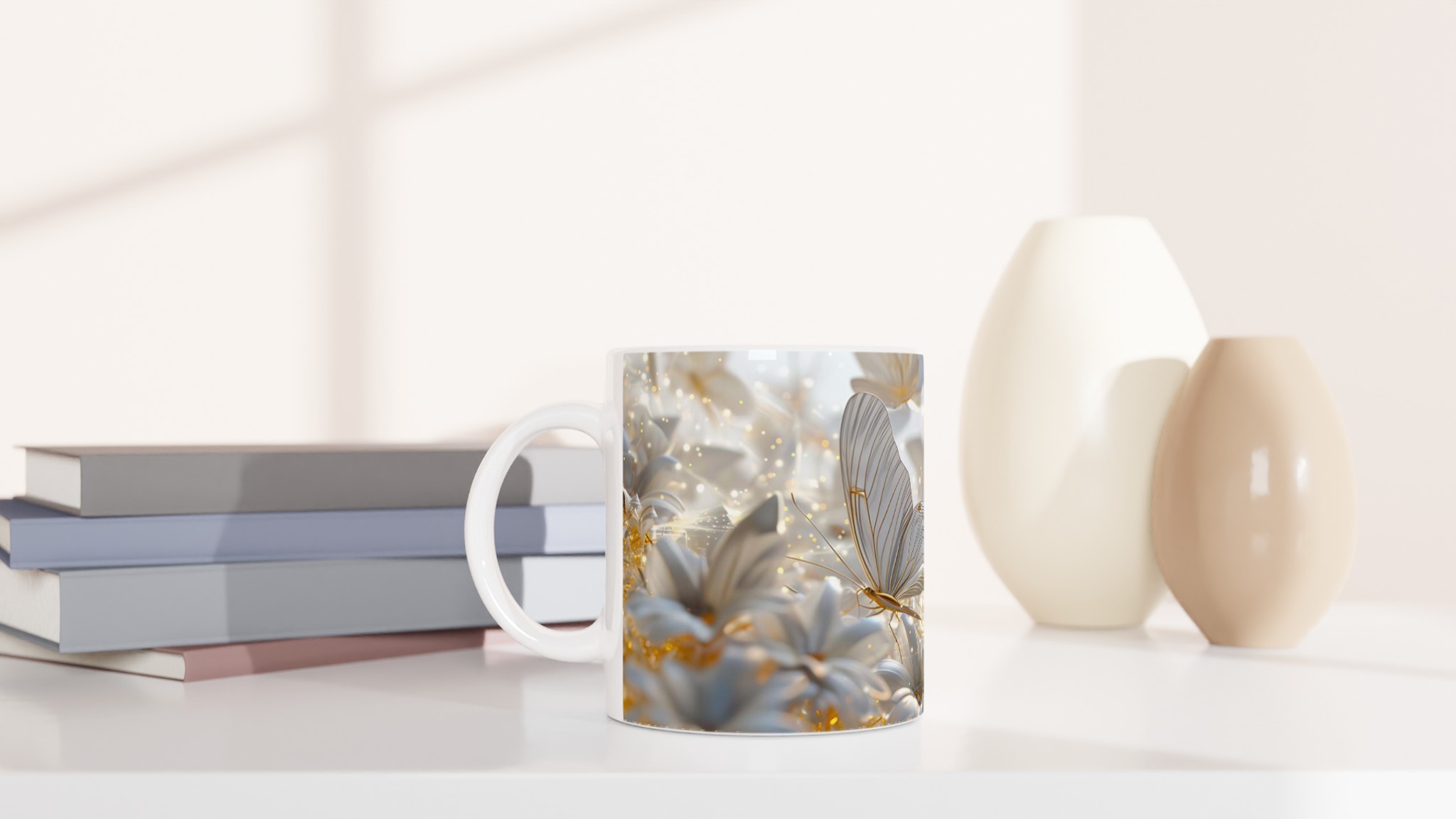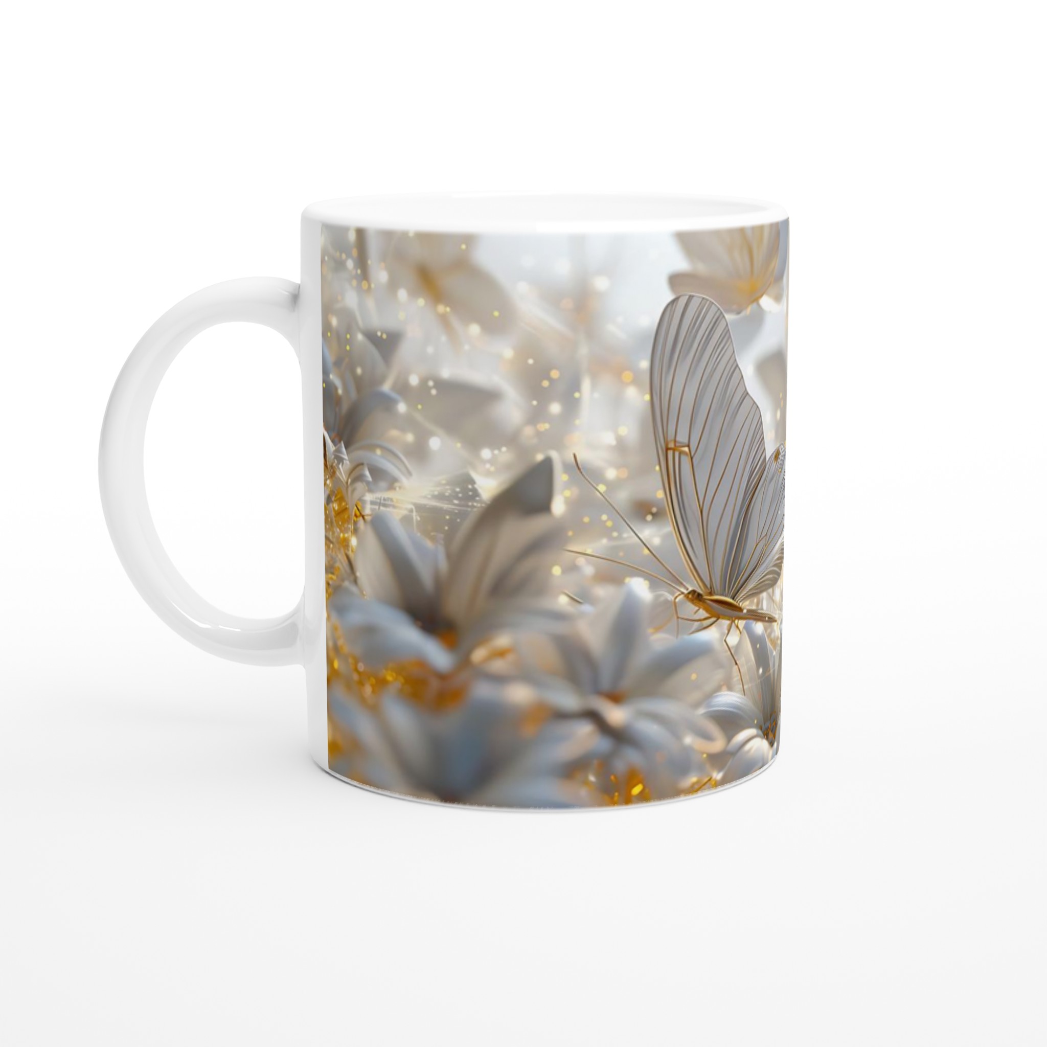 Låt varje klunk transportera dig till en magisk trädgård badad i gyllene ljus med vår förtrollande keramiska mugg. Med sitt eteriska motiv av skimrande fjärilar och drömlika blommor i vitt och guld, blir denna mugg snabbt en vardagsfavorit. Den är perfekt för morgonkaffet, kvällens varma choklad eller när du bara vill njuta av en kopp te i en värld av lugn och skönhet.
