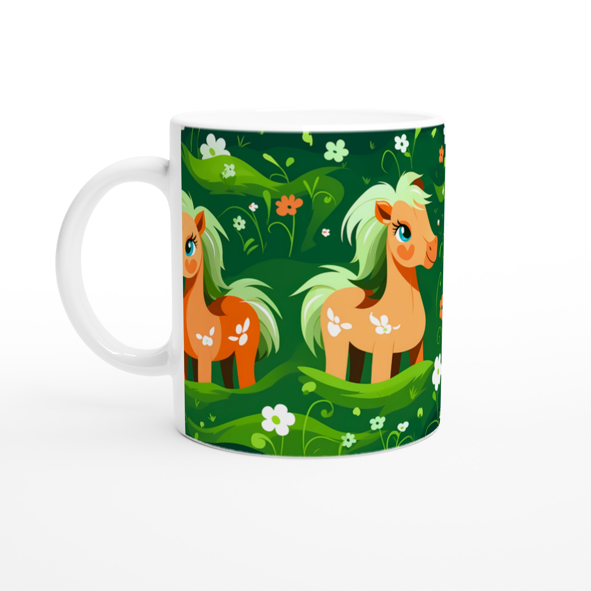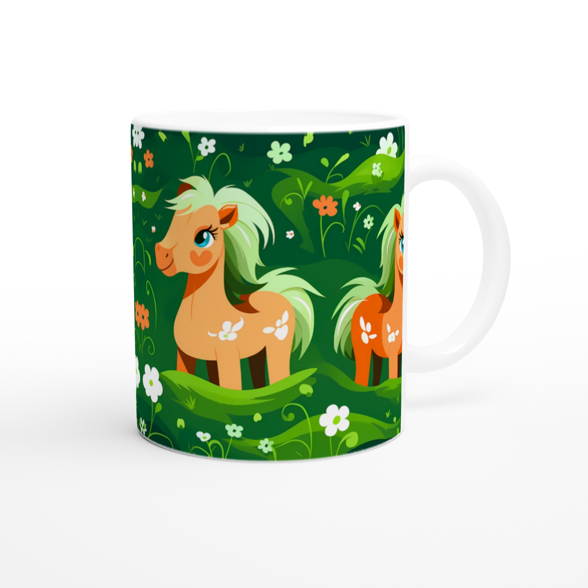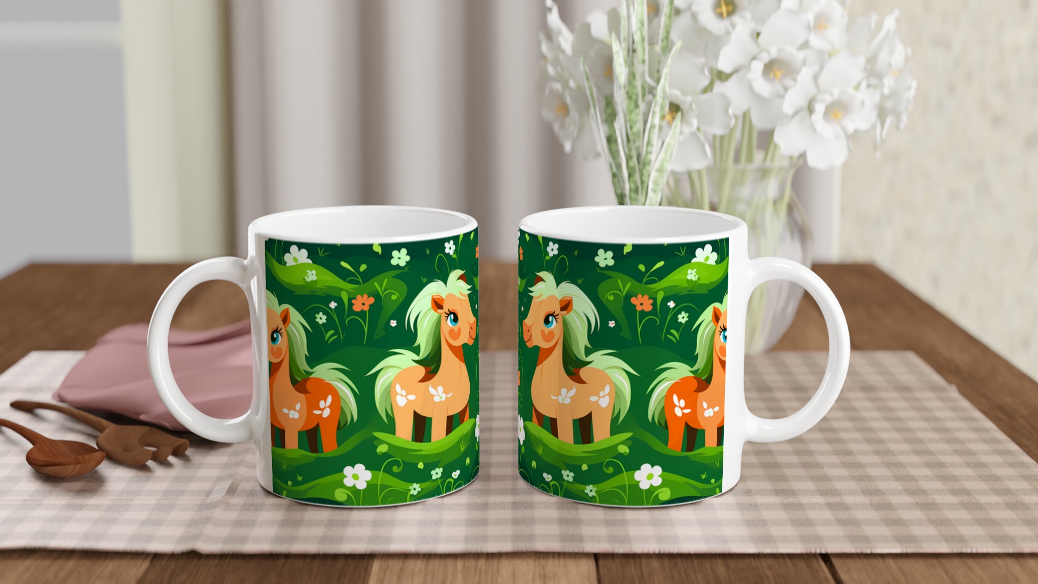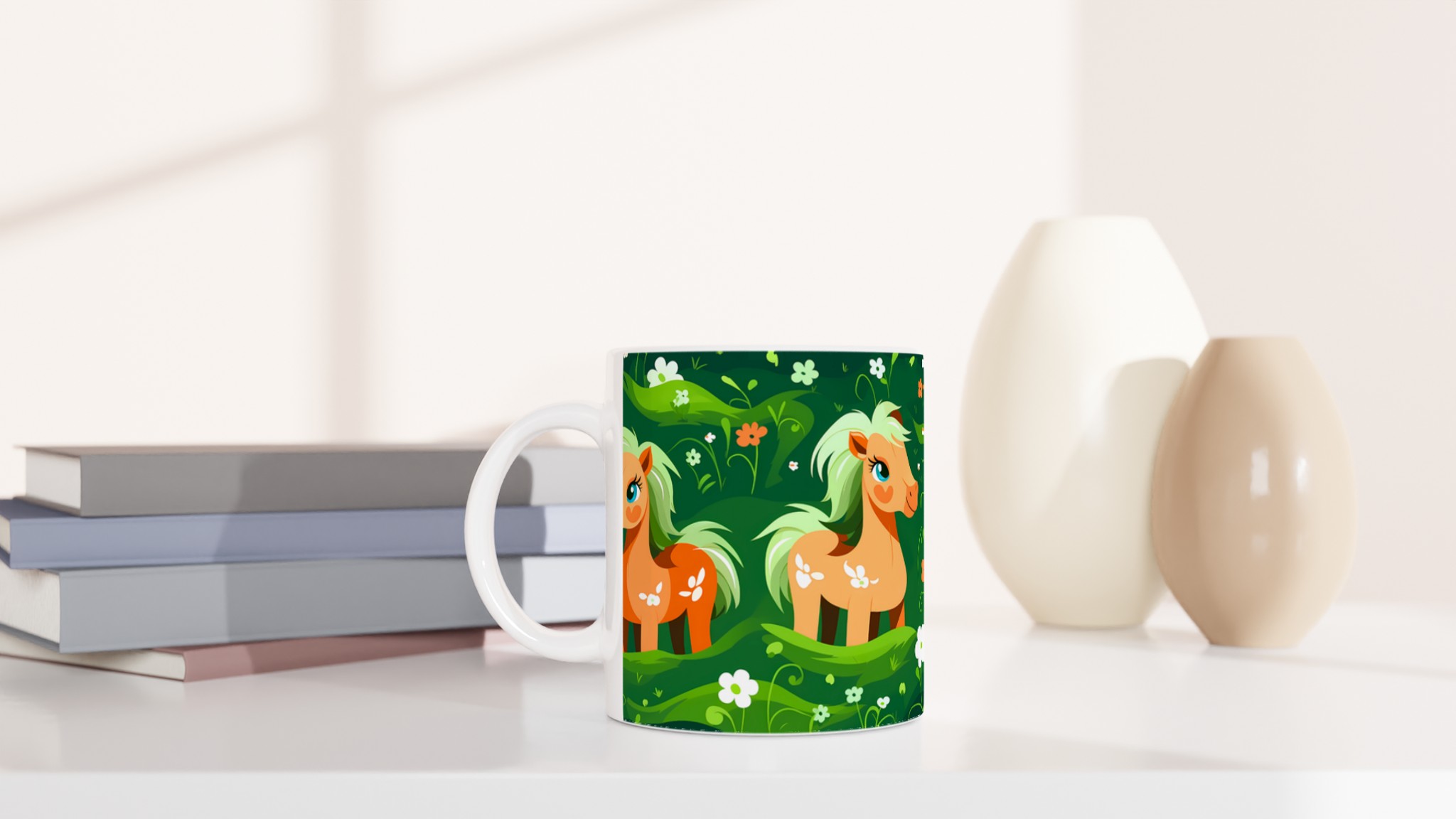 Väck morgonrutinen till liv med denna förtrollande keramiska mugg, prydd med en illustration av charmiga, lekfulla ponnyer omgivna av blommande grönska. De levande färgerna och den sagolika designen skapar en känsla av glädje och mystik som gör varje klunk till en liten flykt. Denna stilrena keramiska mugg blir snabbt en vardagsfavorit. Perfekt för morgonkaffet, kvällens varma choklad eller när du bara vill njuta av en kopp te. Den blanka ytan framhäver ponny-trycket med klara och levande färger, som håller sig fina även efter många turer i mikron och diskmaskinen.