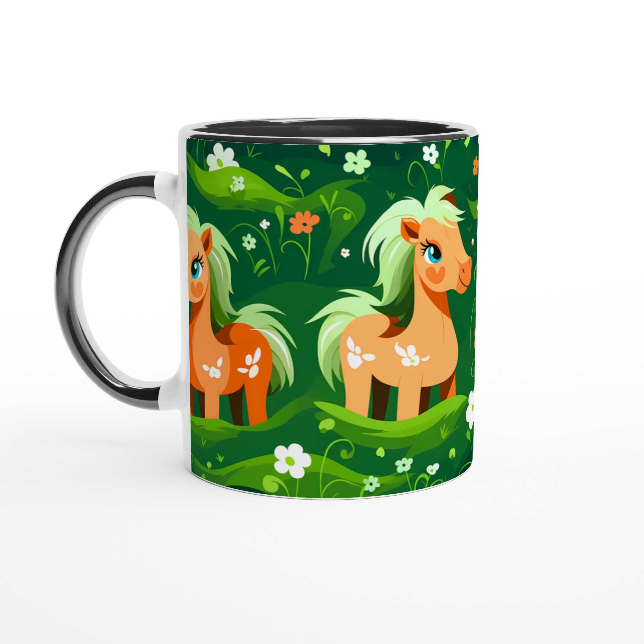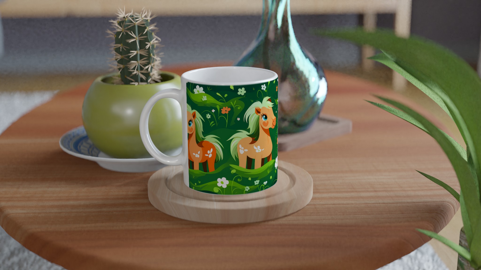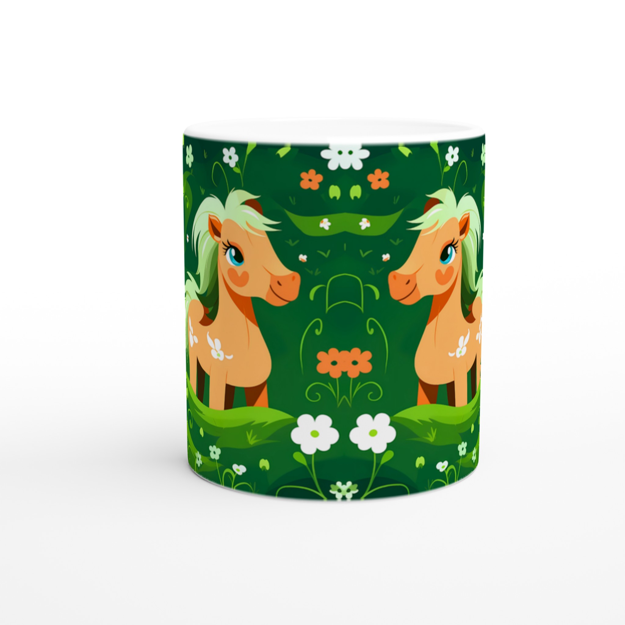 Väck morgonrutinen till liv med denna förtrollande keramiska mugg, prydd med en illustration av charmiga, lekfulla ponnyer omgivna av blommande grönska. De levande färgerna och den sagolika designen skapar en känsla av glädje och mystik som gör varje klunk till en liten flykt. Denna stilrena keramiska mugg blir snabbt en vardagsfavorit. Perfekt för morgonkaffet, kvällens varma choklad eller när du bara vill njuta av en kopp te. Den blanka ytan framhäver ponny-trycket med klara och levande färger, som håller sig fina även efter många turer i mikron och diskmaskinen.
