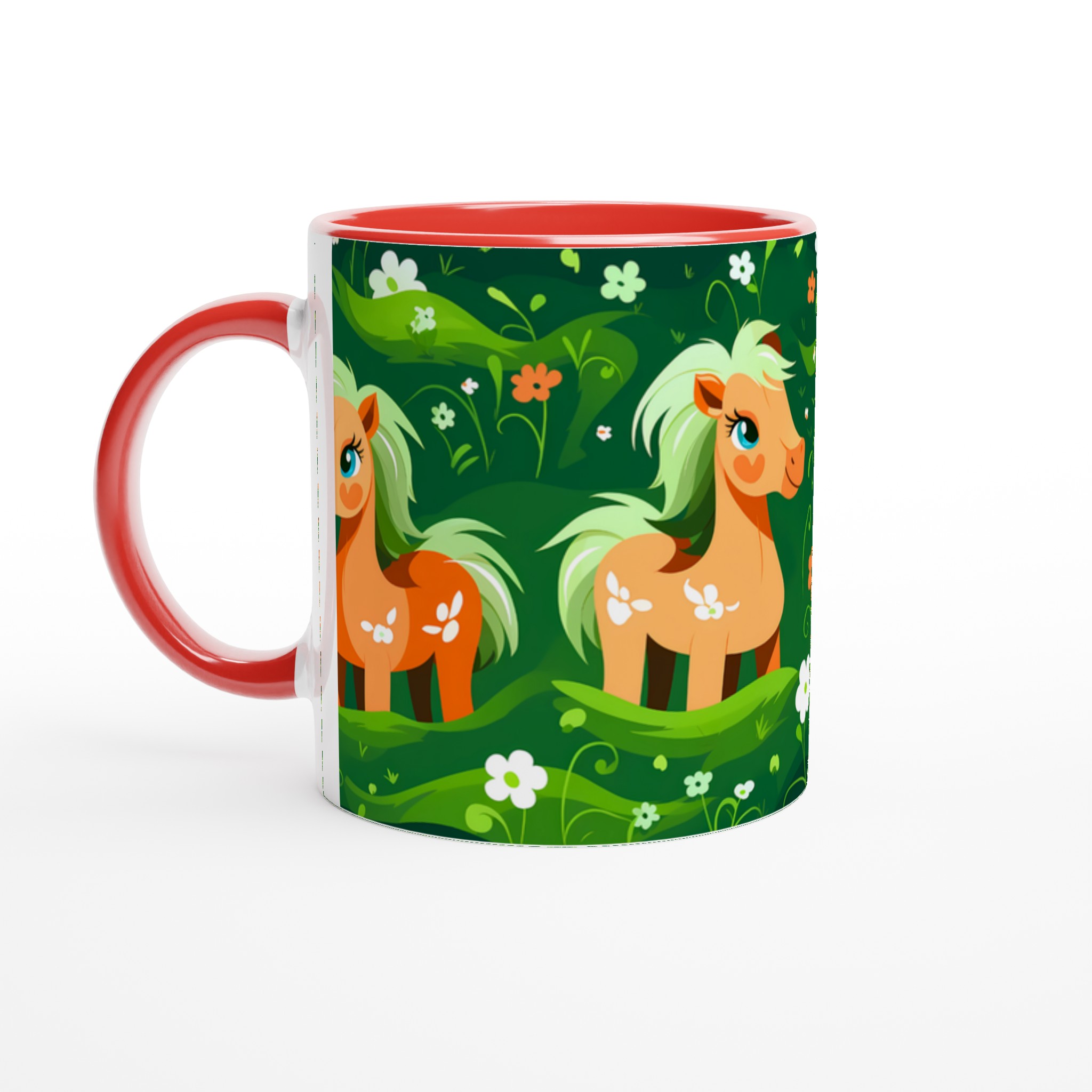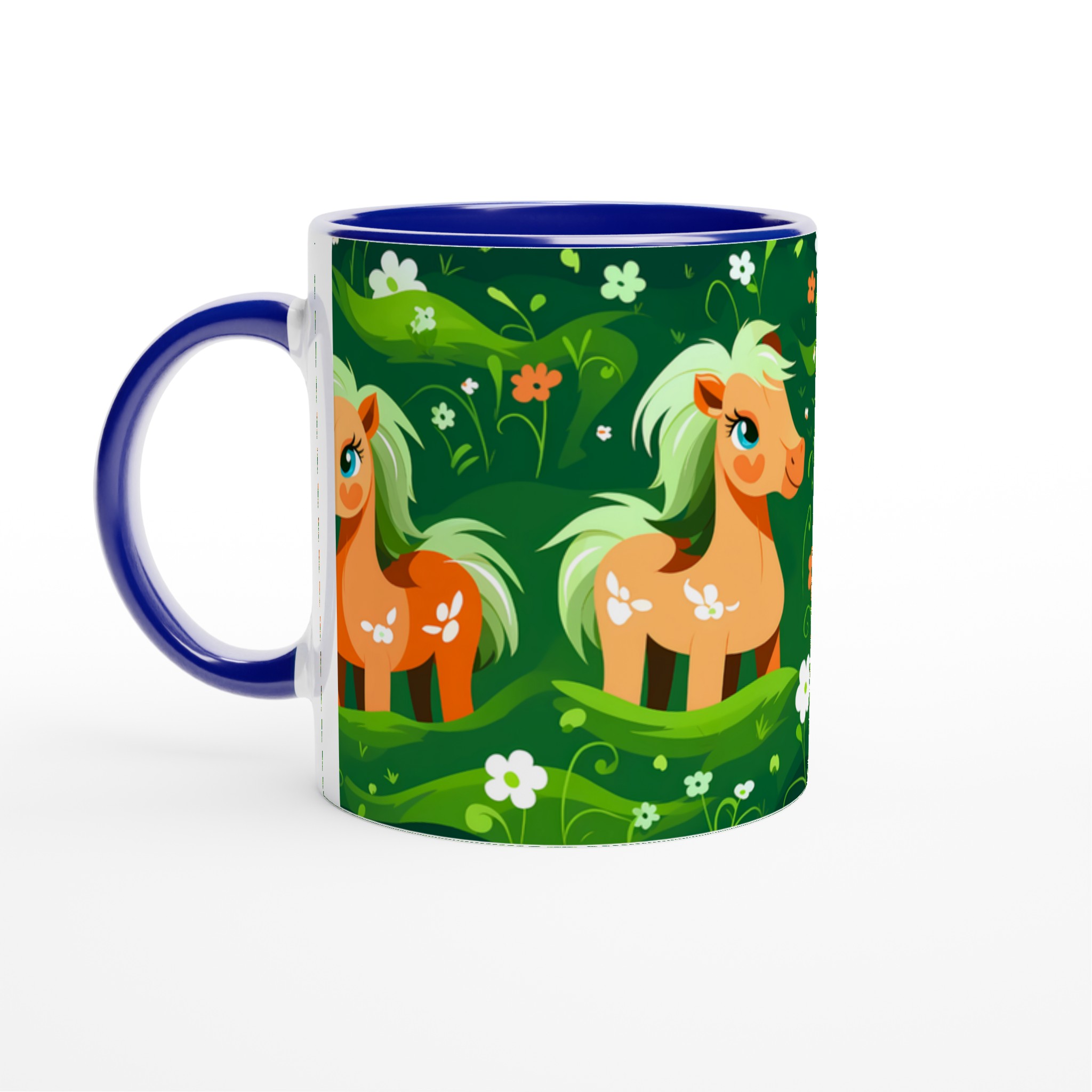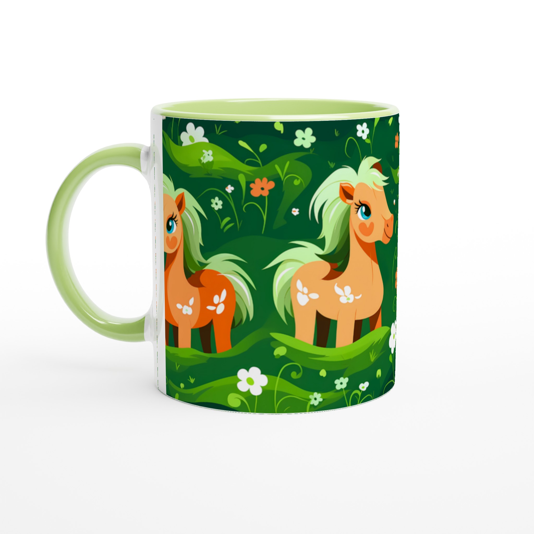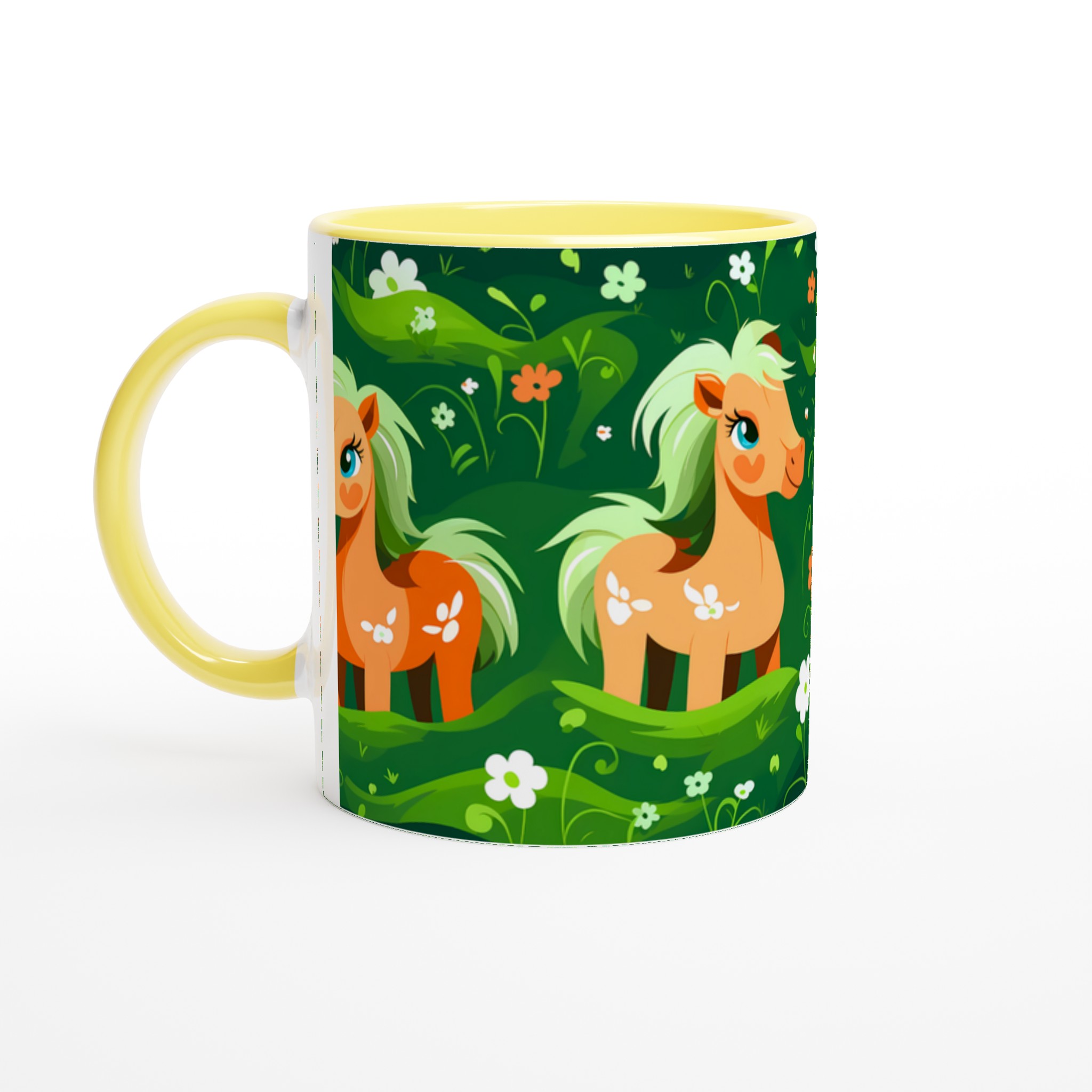 Väck morgonrutinen till liv med denna förtrollande keramiska mugg, prydd med en illustration av charmiga, lekfulla ponnyer omgivna av blommande grönska. De levande färgerna och den sagolika designen skapar en känsla av glädje och mystik som gör varje klunk till en liten flykt. Denna stilrena keramiska mugg blir snabbt en vardagsfavorit. Perfekt för morgonkaffet, kvällens varma choklad eller när du bara vill njuta av en kopp te. Den blanka ytan framhäver ponny-trycket med klara och levande färger, som håller sig fina även efter många turer i mikron och diskmaskinen.