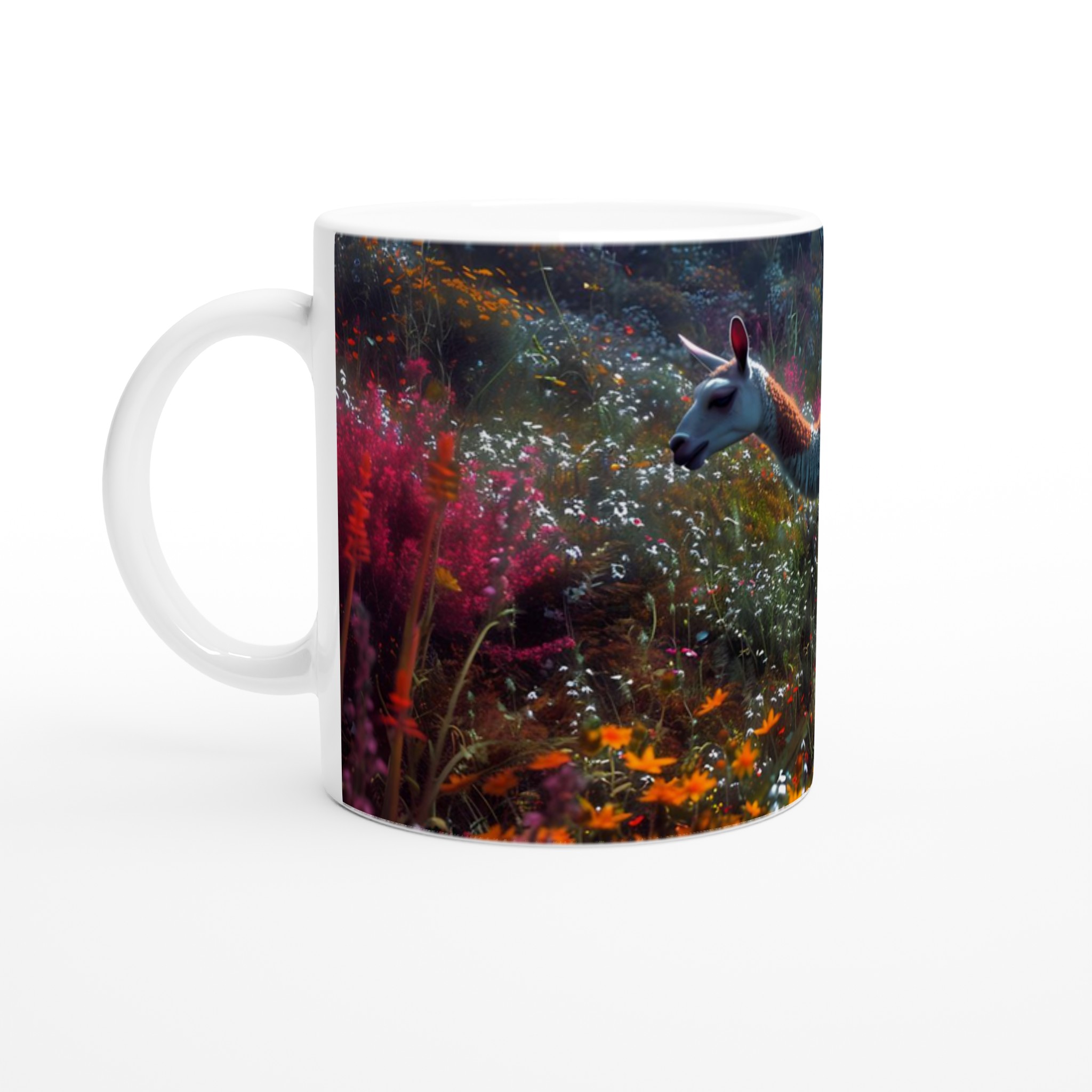 Denna förtrollande mugg fångar den lugna skönheten hos en lama i ett drömlikt landskap, omgiven av glödande röda och gyllene blommor under en mystisk, disig himmel. Det rika färgvalet och den eteriska stämningen gör varje sip till en stunds avkoppling och kontemplation, perfekt för djurälskare och de som uppskattar konstnärliga, lugnande motiv.