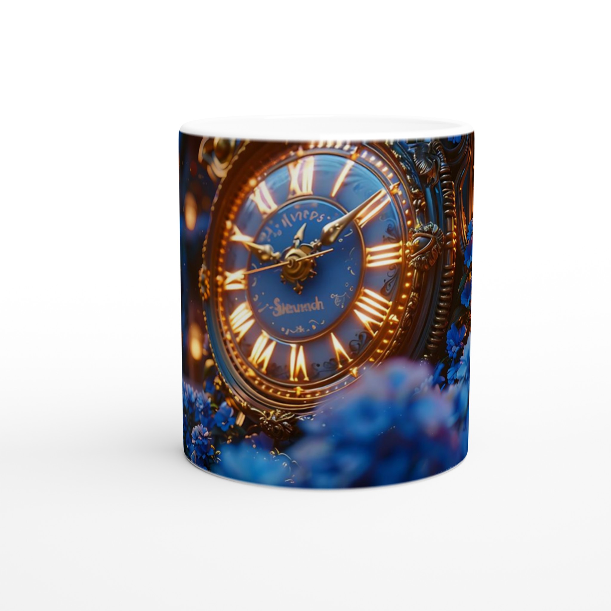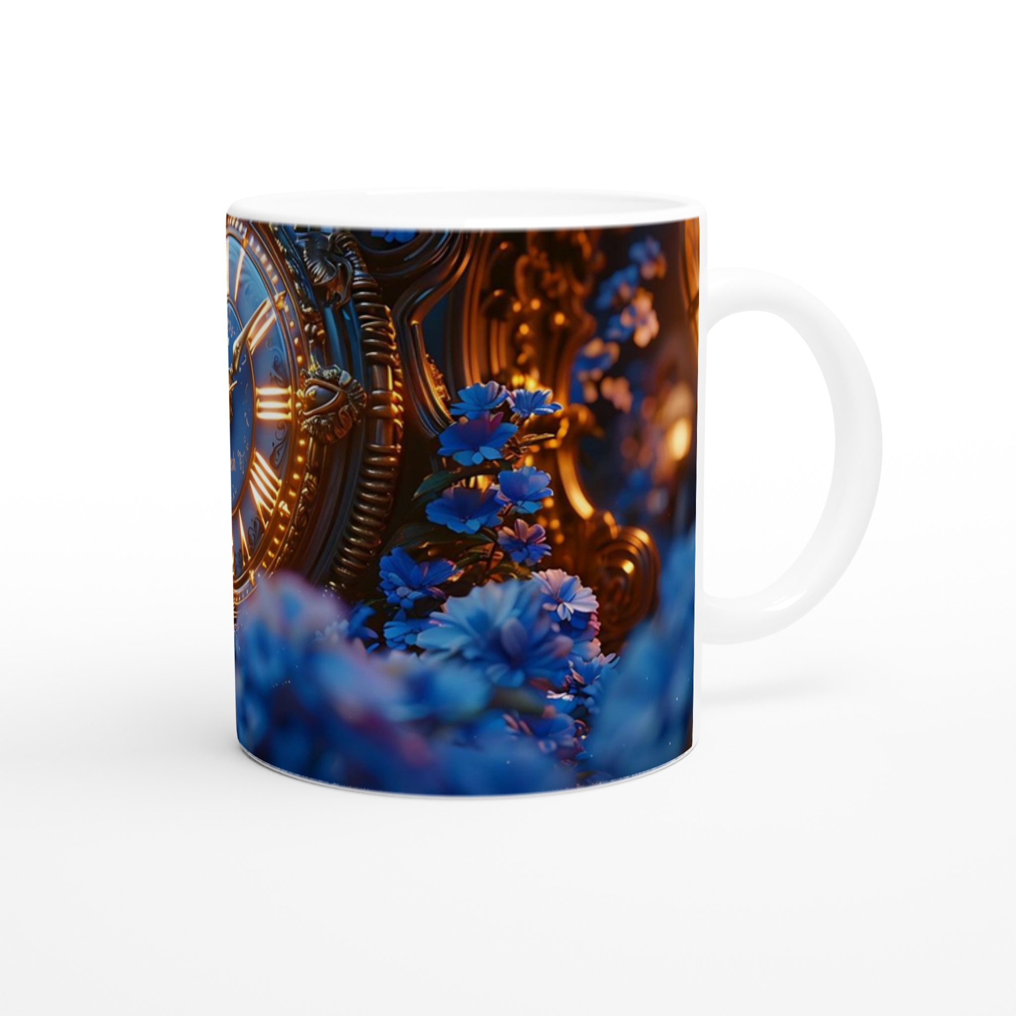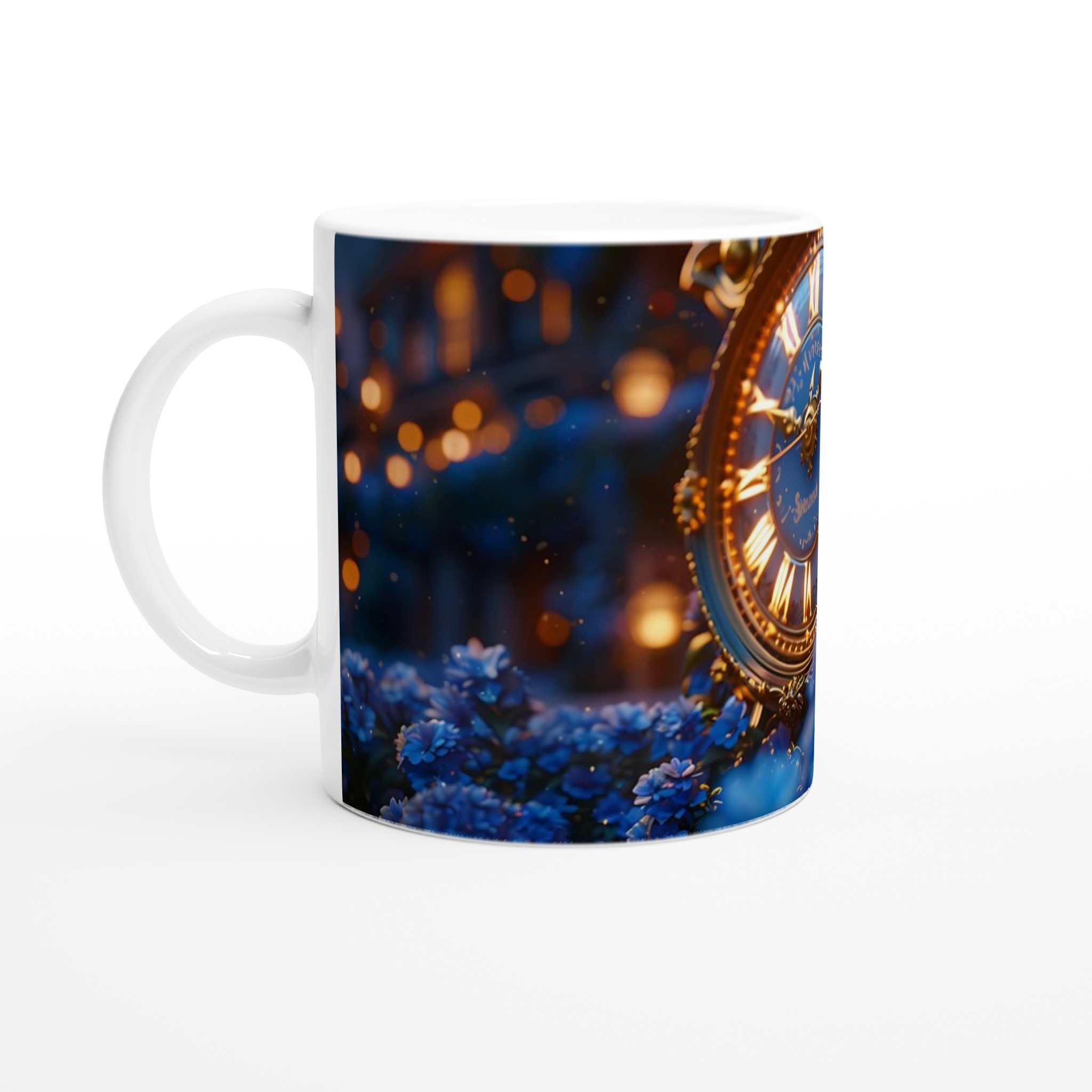Fånga magin från en stjärnklar natt med vår förtrollande Keramisk mugg. Denna mugg är inspirerad av bilden av en utsmyckad, gyllene klocka omgiven av skimrande blå blommor i ett mjukt, drömskt ljus, och förvandlar varje dryck till en sagolik upplevelse. Perfekt för morgonkaffet, kvällens varma choklad eller när du bara vill njuta av en kopp te i en atmosfär av tidlös elegans.