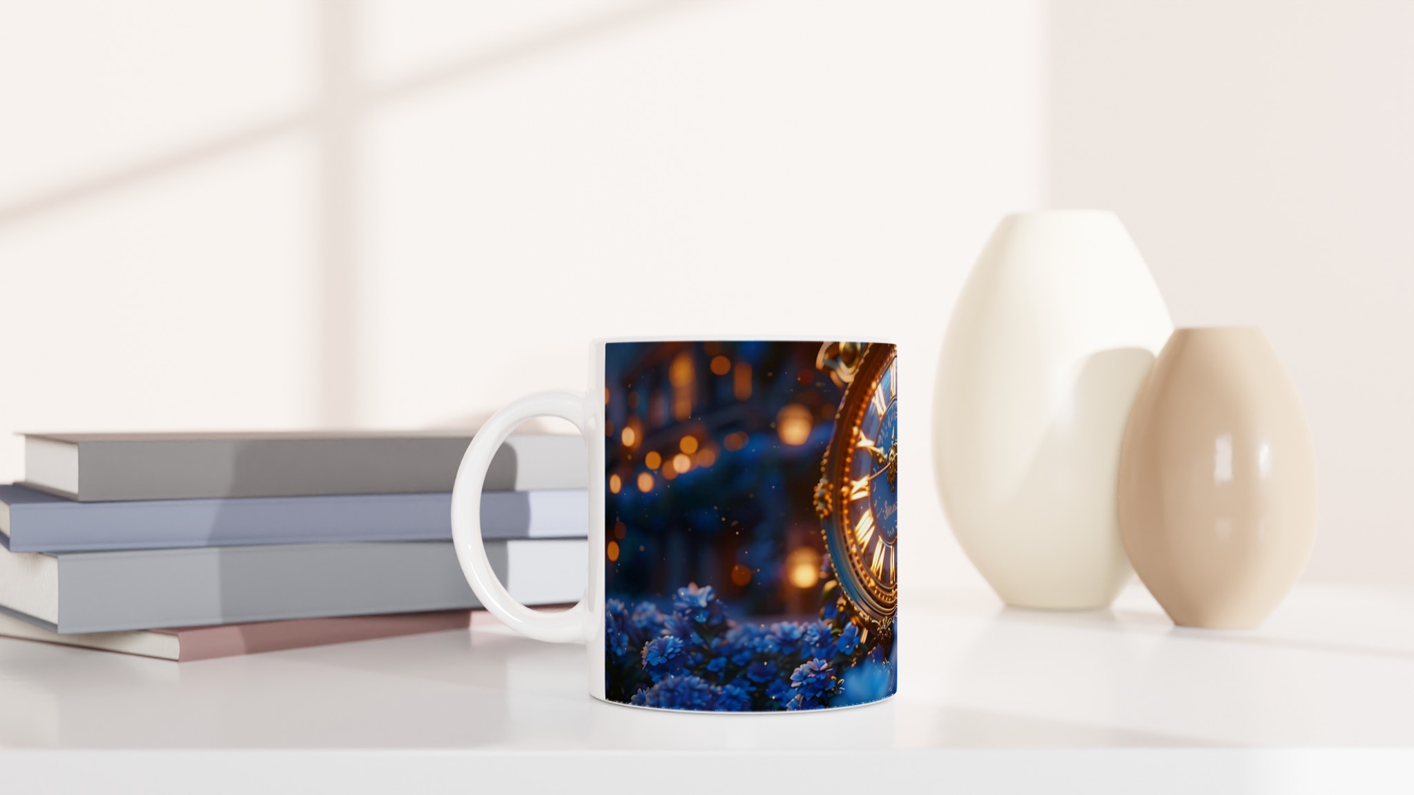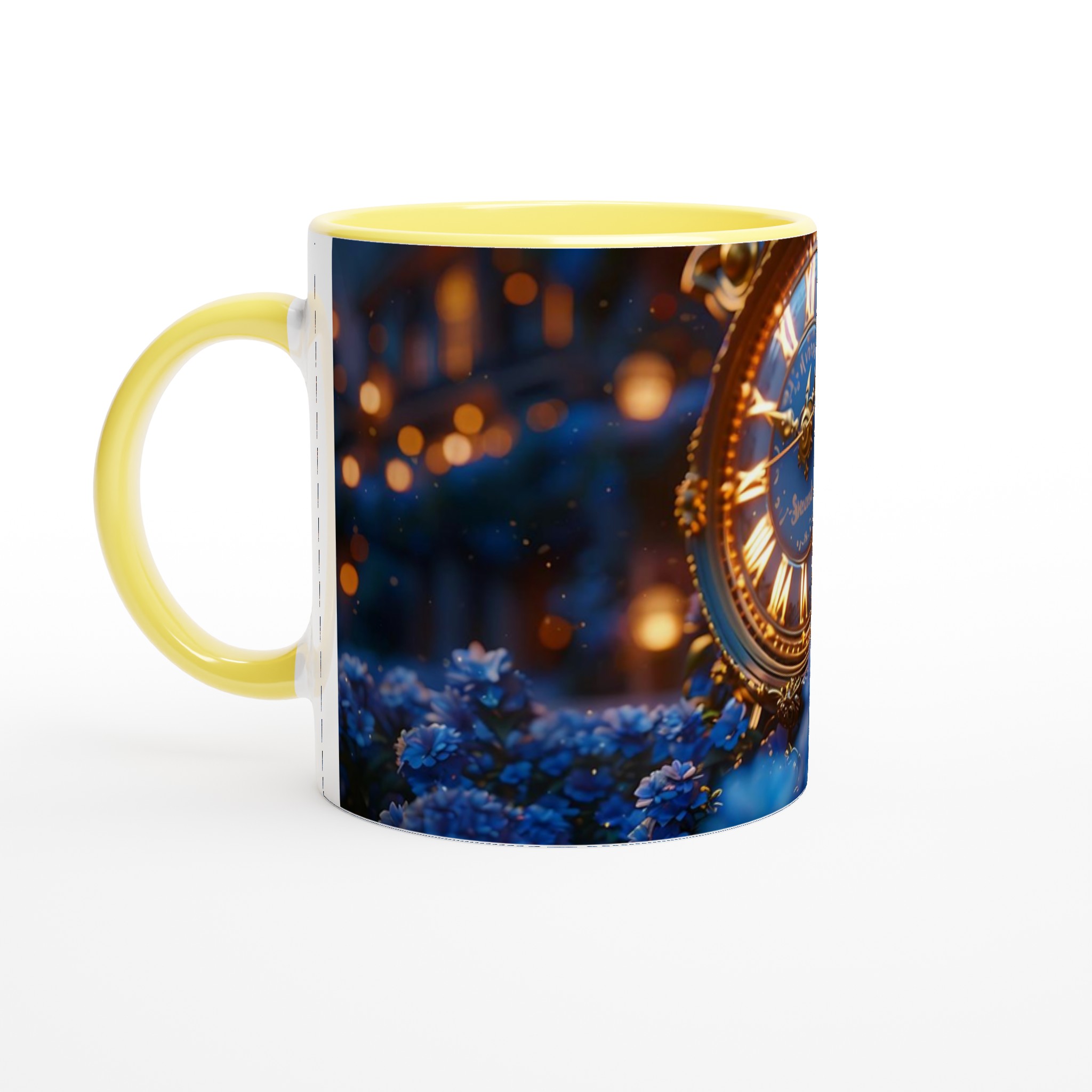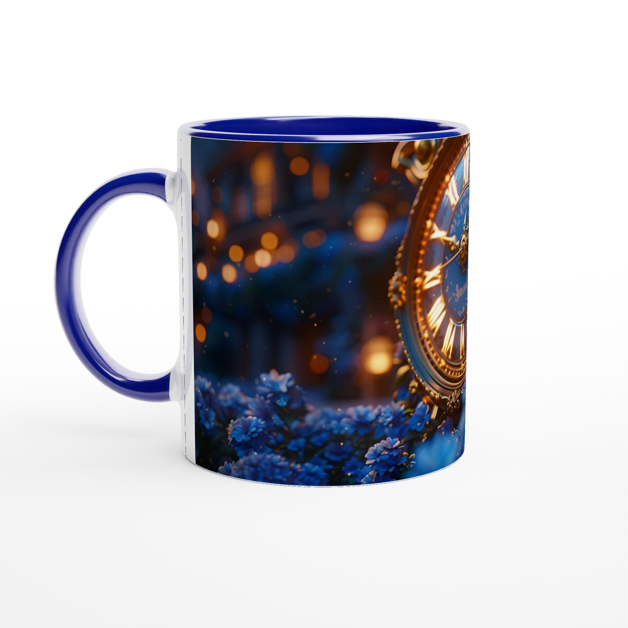 Fånga magin från en stjärnklar natt med vår förtrollande Keramisk mugg. Denna mugg är inspirerad av bilden av en utsmyckad, gyllene klocka omgiven av skimrande blå blommor i ett mjukt, drömskt ljus, och förvandlar varje dryck till en sagolik upplevelse. Perfekt för morgonkaffet, kvällens varma choklad eller när du bara vill njuta av en kopp te i en atmosfär av tidlös elegans.