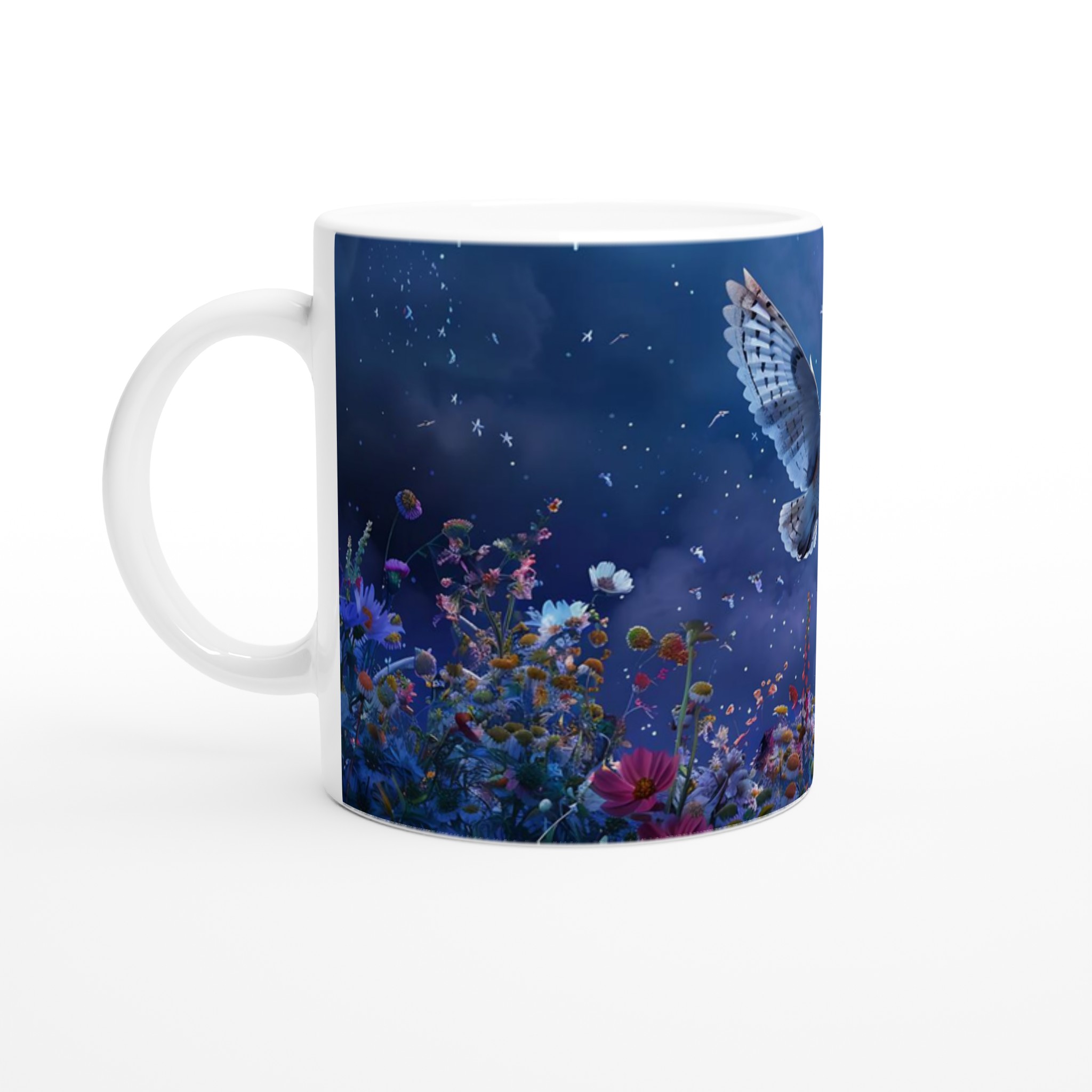 Föreställ dig att du sippar på din favoritdryck medan en majestätisk nattuggla svävar över en förtrollad blomsteräng under en lysande fullmåne. Denna magiska scen, med sina drömska blå nyanser och blommiga detaljer, ger varje klunk en känsla av lugn och under. Det blanka vita ytan ger ett skarpt och levande tryck som verkligen sticker ut, oavsett om det är en personlig design, ett roligt citat eller en present till någon du tycker om.