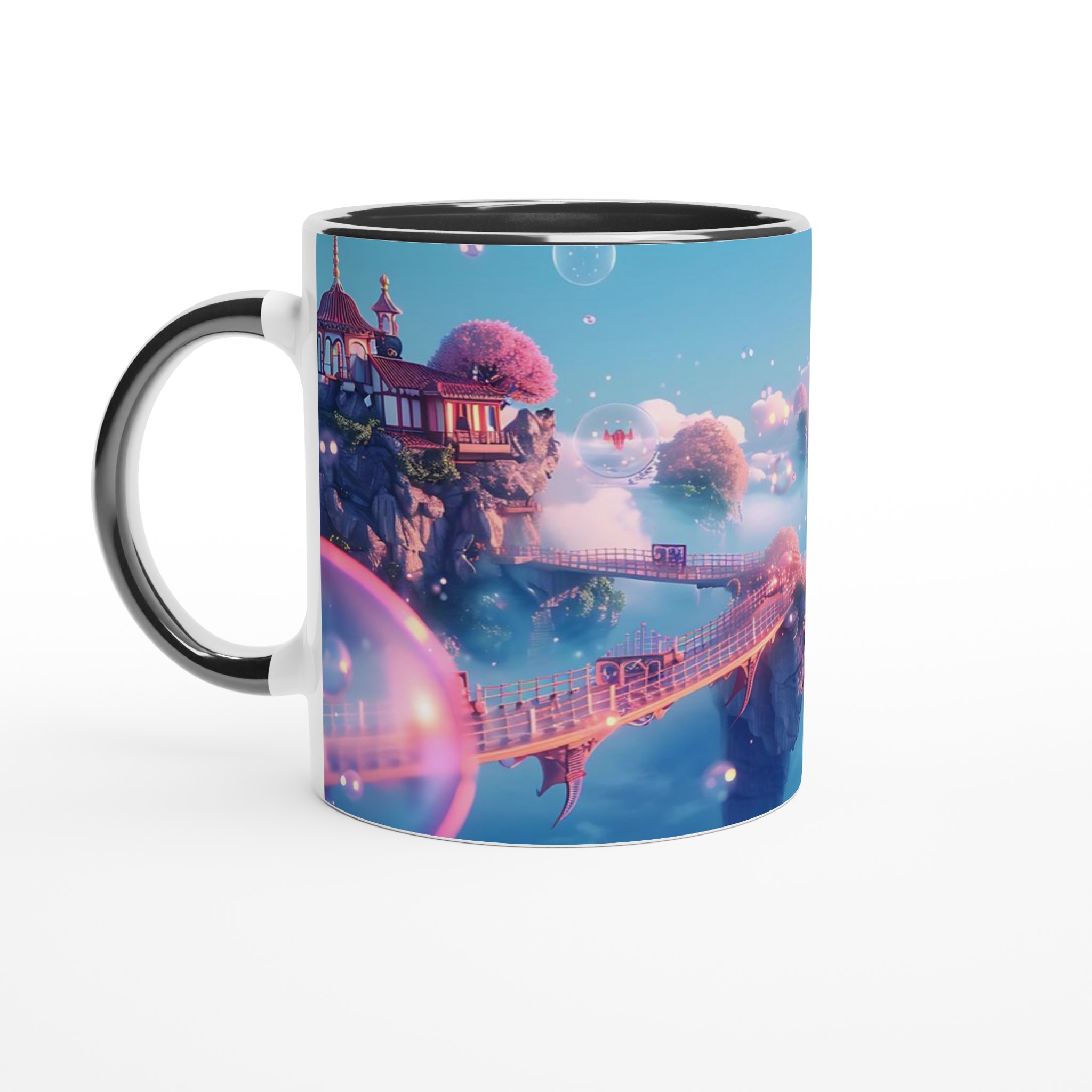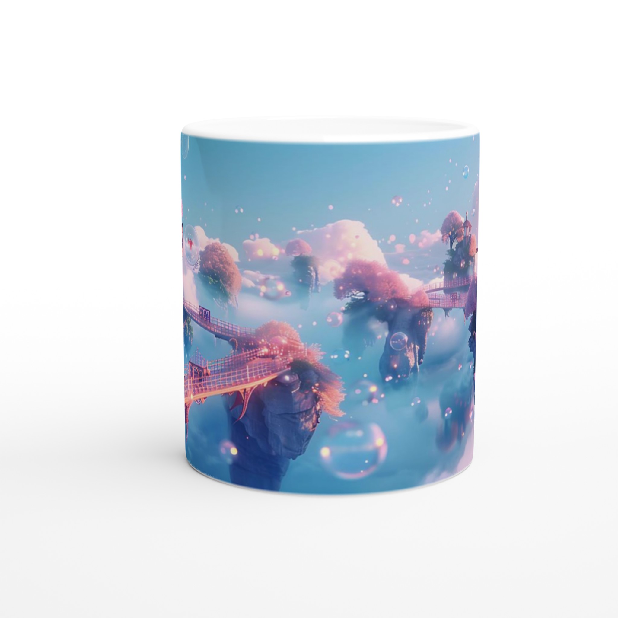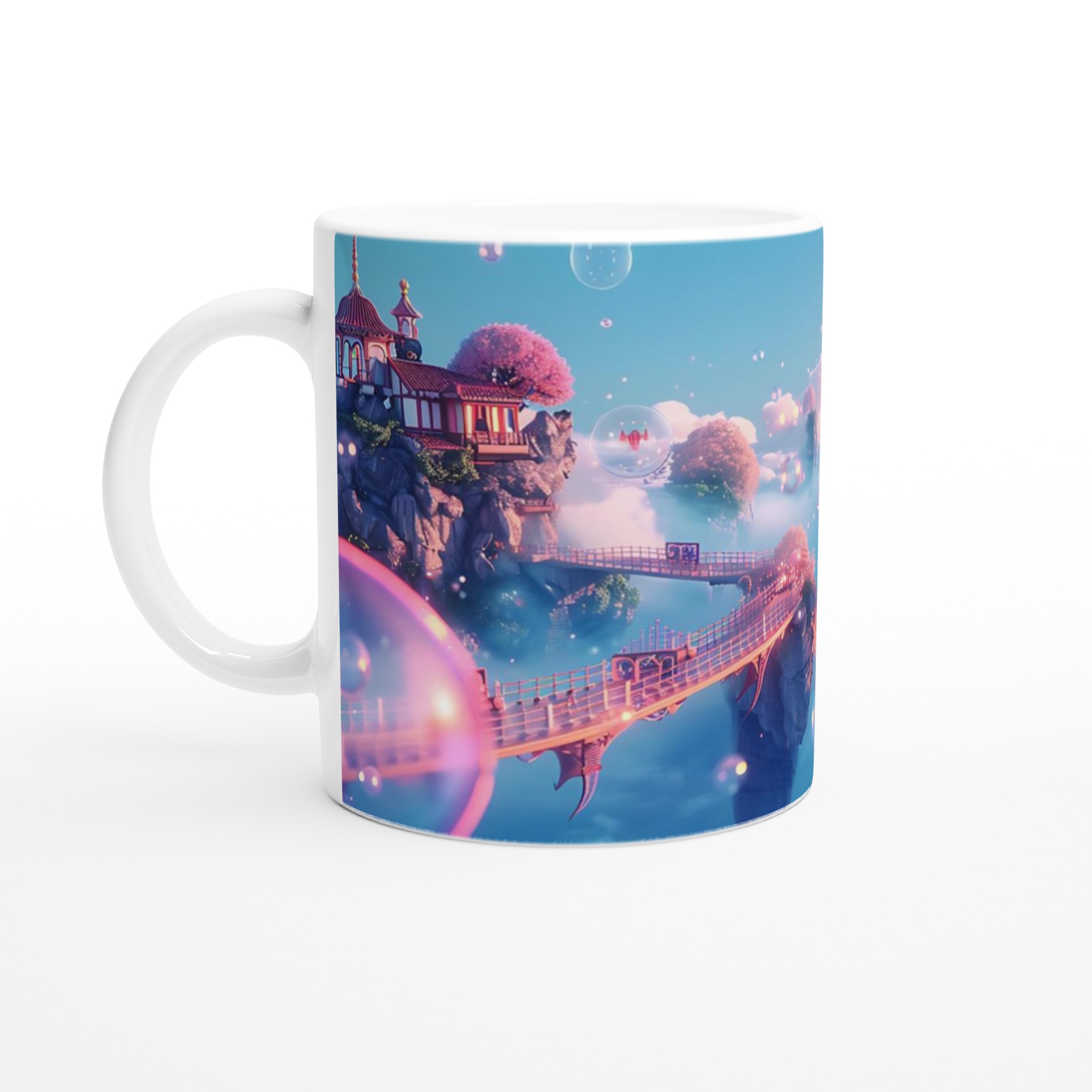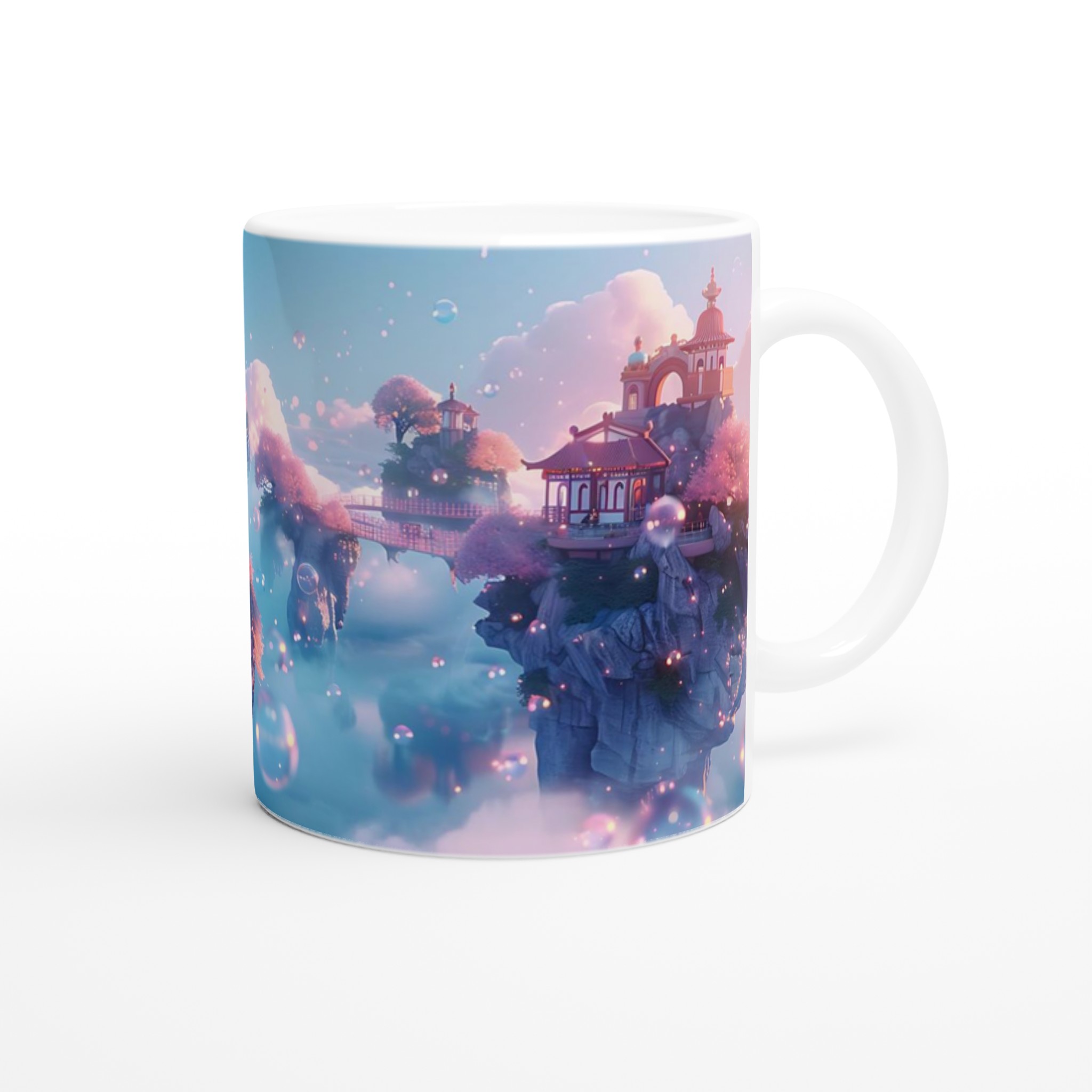 Stig in i en värld av lugn och skönhet med vår förtrollande keramiska mugg, inspirerad av himmelska landskap och drömska vyer. Denna mugg är inte bara ett kärl för din favoritdryck, utan en liten flykt till en plats där rosa körsbärsträd blommar på flygande öar och gyllene broar förbinder mystiska pagoder. Med sin mjuka, pastellfärgade palett och glittrande bubblor fångar den essensen av en stillsam soluppgång över molnen, perfekt för att starta din dag med en känsla av magi.
