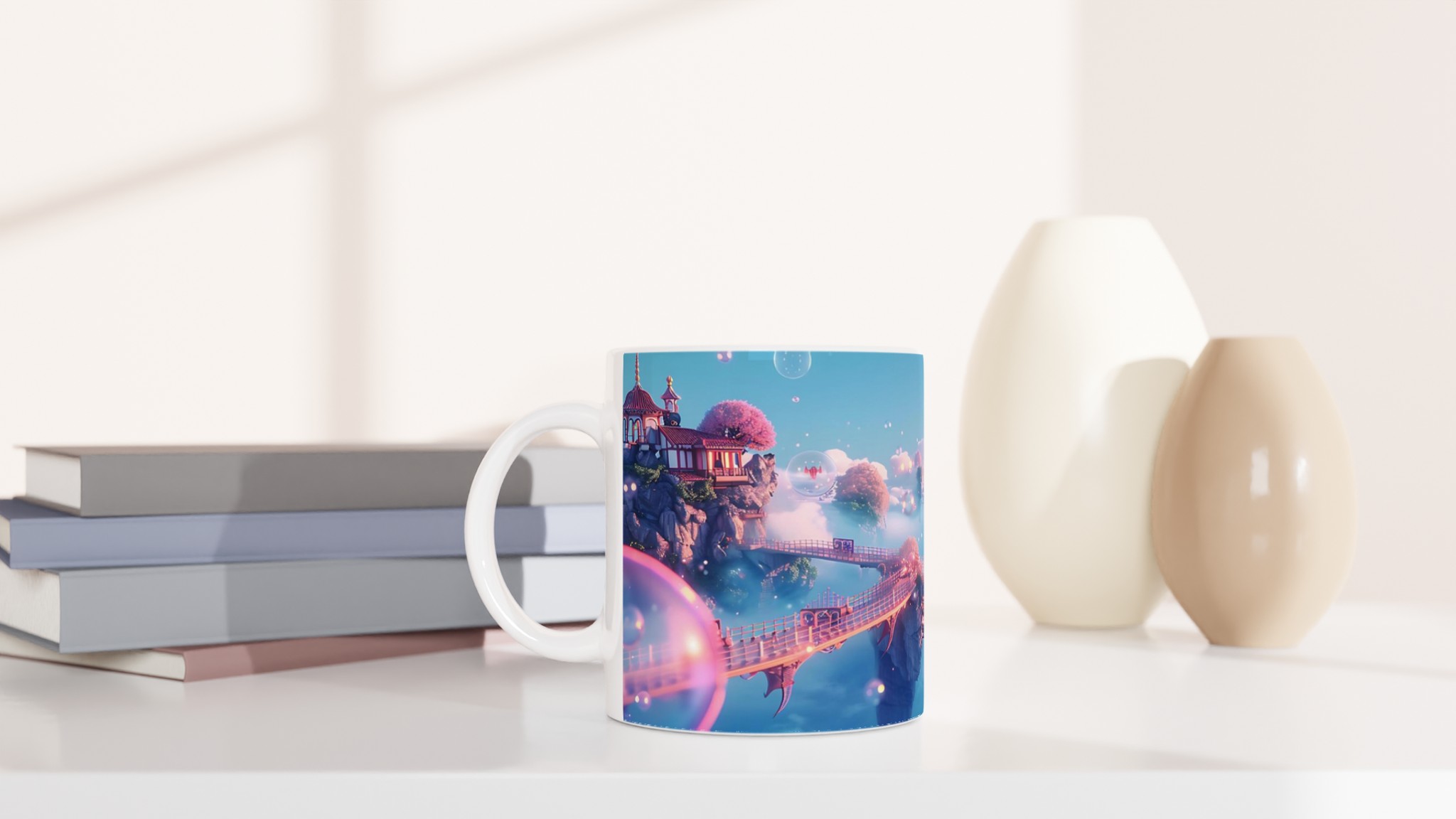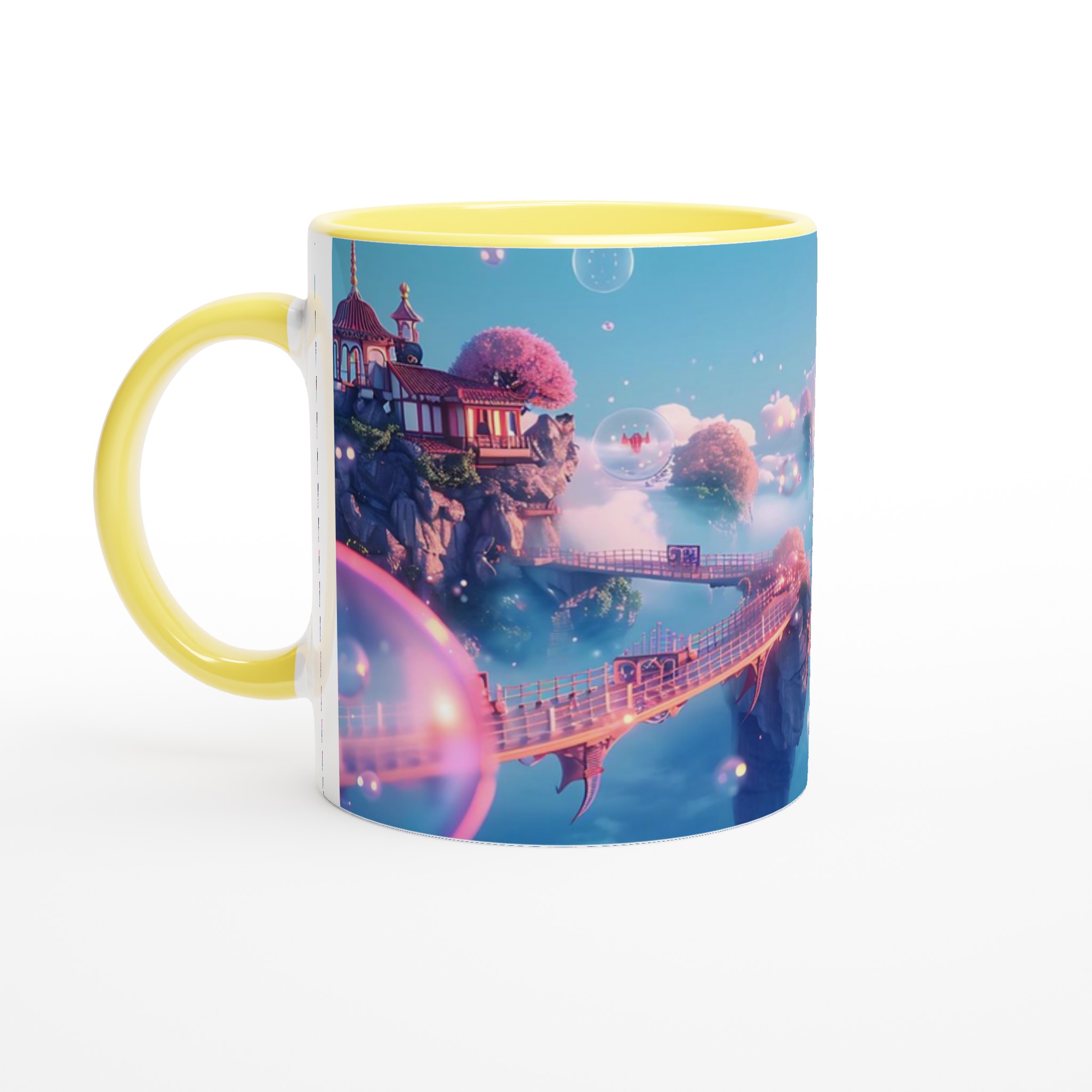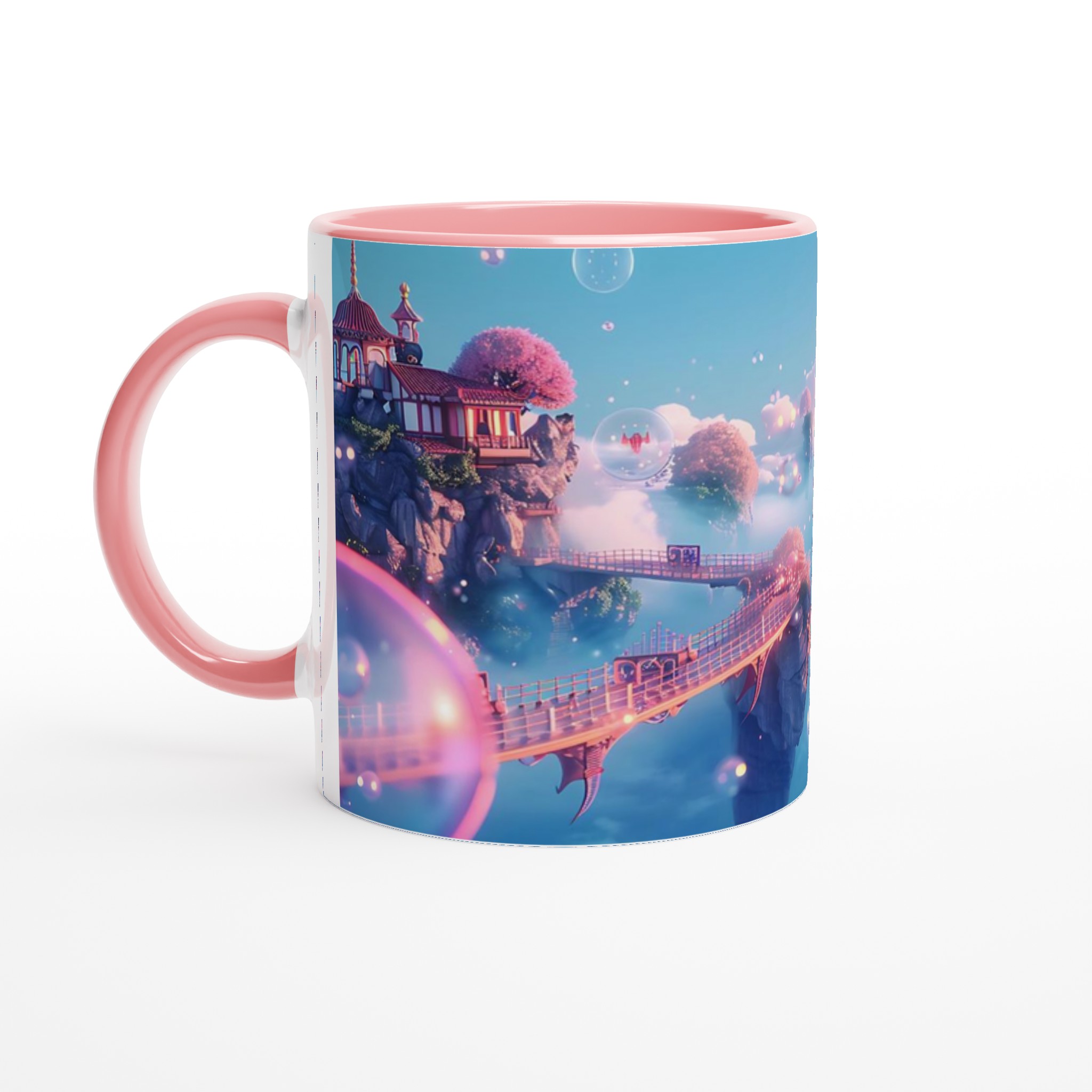 Stig in i en värld av lugn och skönhet med vår förtrollande keramiska mugg, inspirerad av himmelska landskap och drömska vyer. Denna mugg är inte bara ett kärl för din favoritdryck, utan en liten flykt till en plats där rosa körsbärsträd blommar på flygande öar och gyllene broar förbinder mystiska pagoder. Med sin mjuka, pastellfärgade palett och glittrande bubblor fångar den essensen av en stillsam soluppgång över molnen, perfekt för att starta din dag med en känsla av magi.