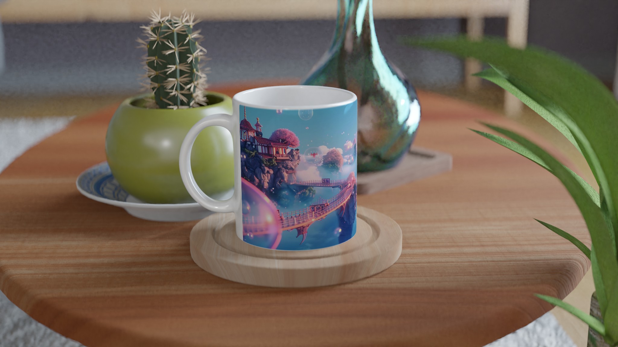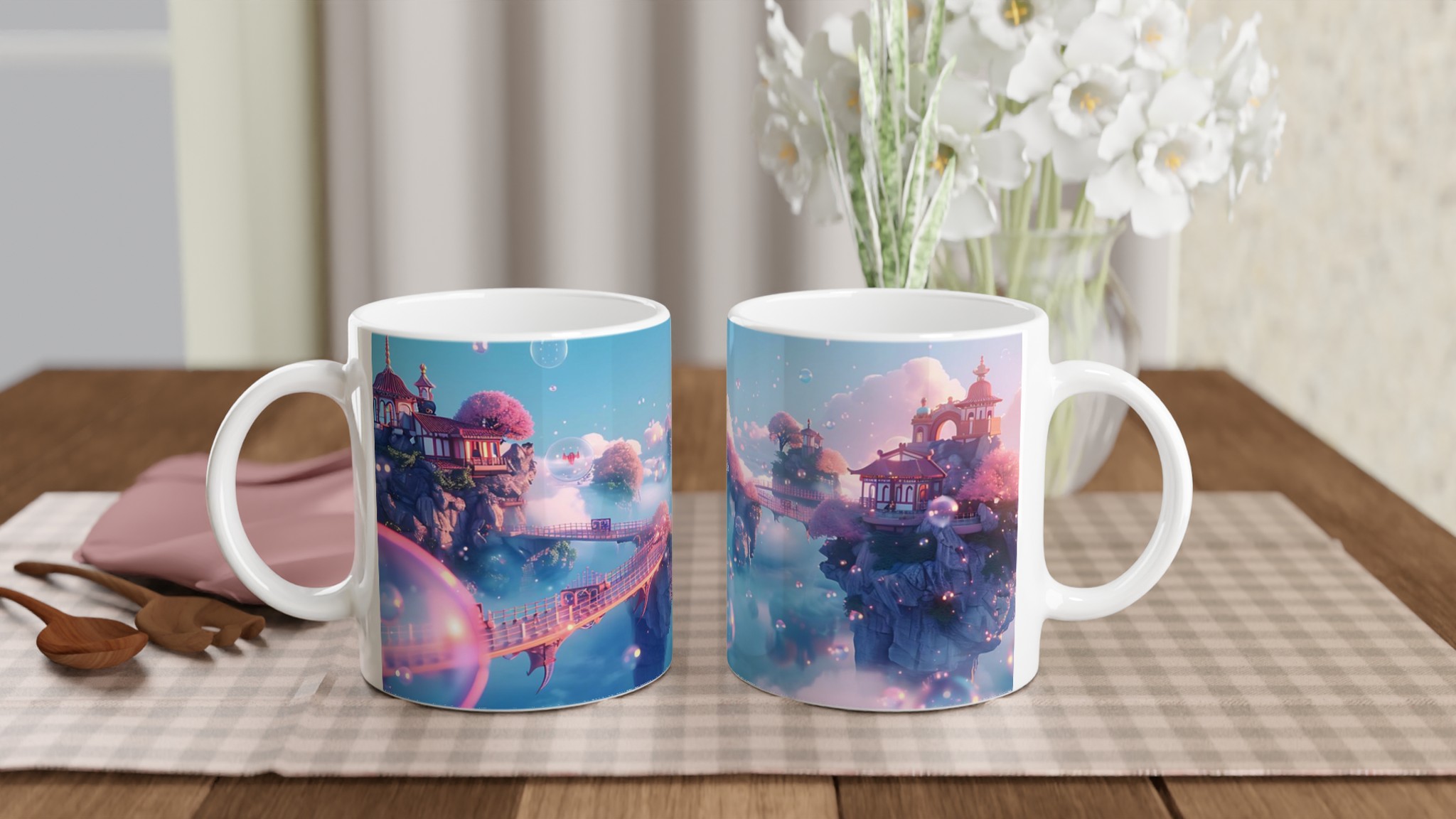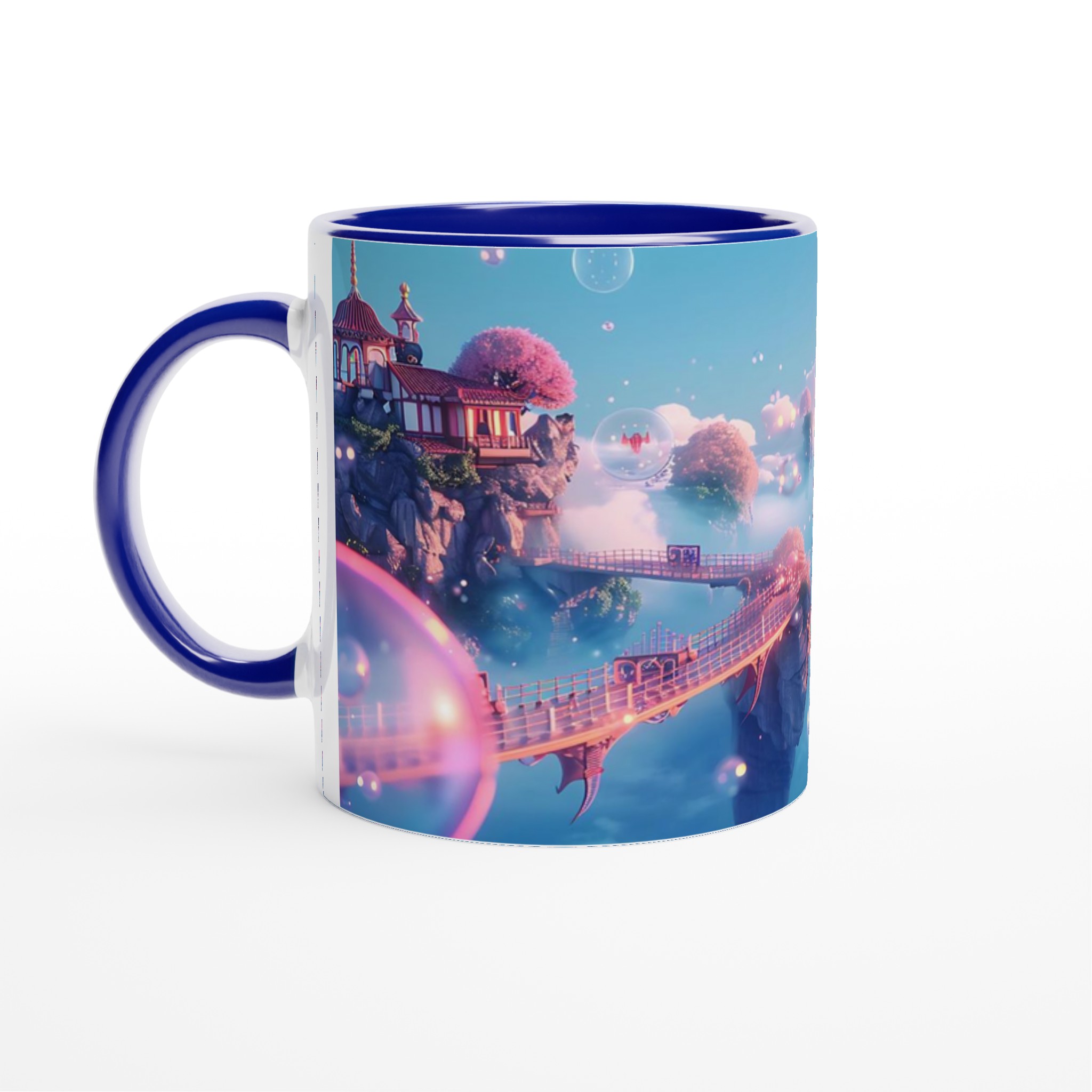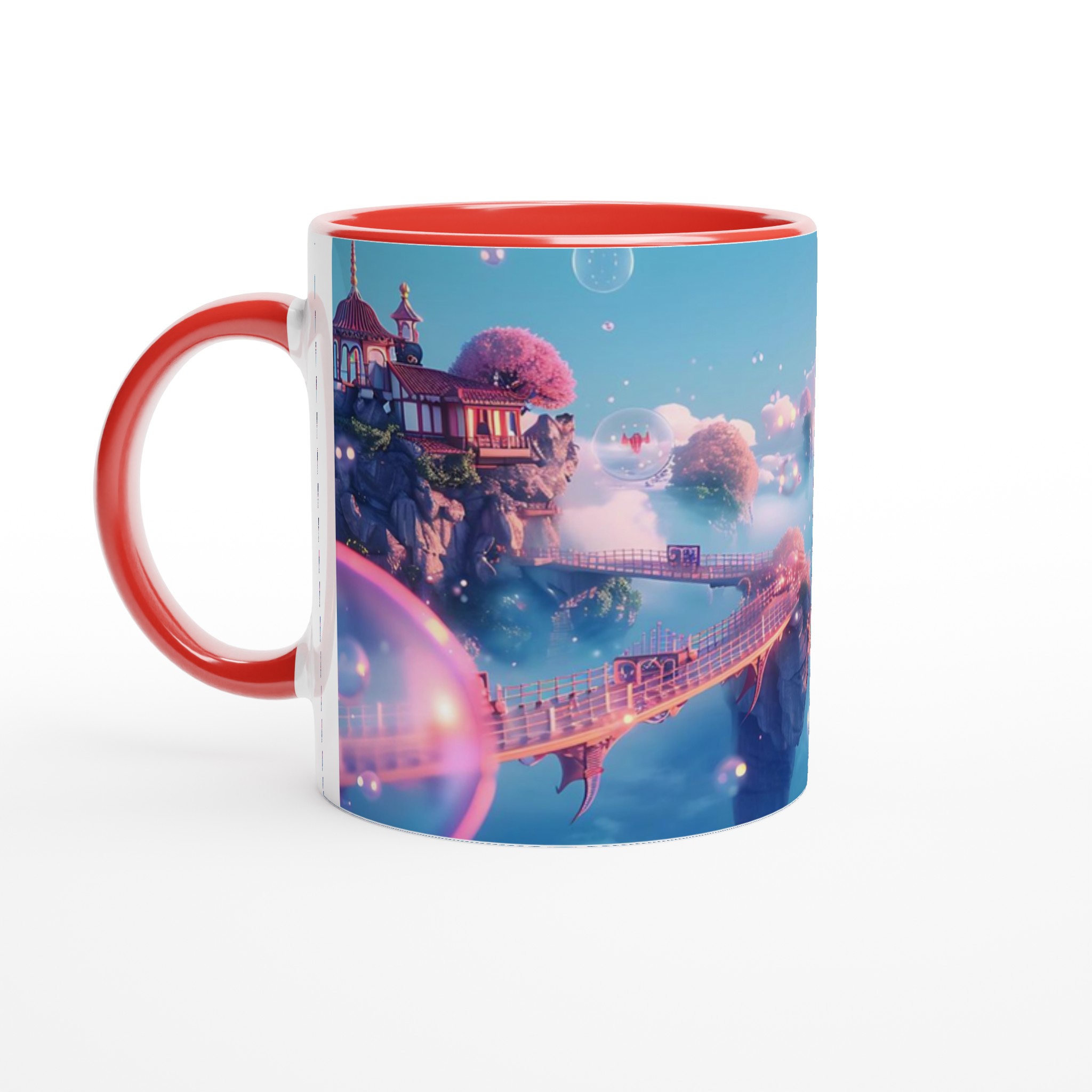 Stig in i en värld av lugn och skönhet med vår förtrollande keramiska mugg, inspirerad av himmelska landskap och drömska vyer. Denna mugg är inte bara ett kärl för din favoritdryck, utan en liten flykt till en plats där rosa körsbärsträd blommar på flygande öar och gyllene broar förbinder mystiska pagoder. Med sin mjuka, pastellfärgade palett och glittrande bubblor fångar den essensen av en stillsam soluppgång över molnen, perfekt för att starta din dag med en känsla av magi.
