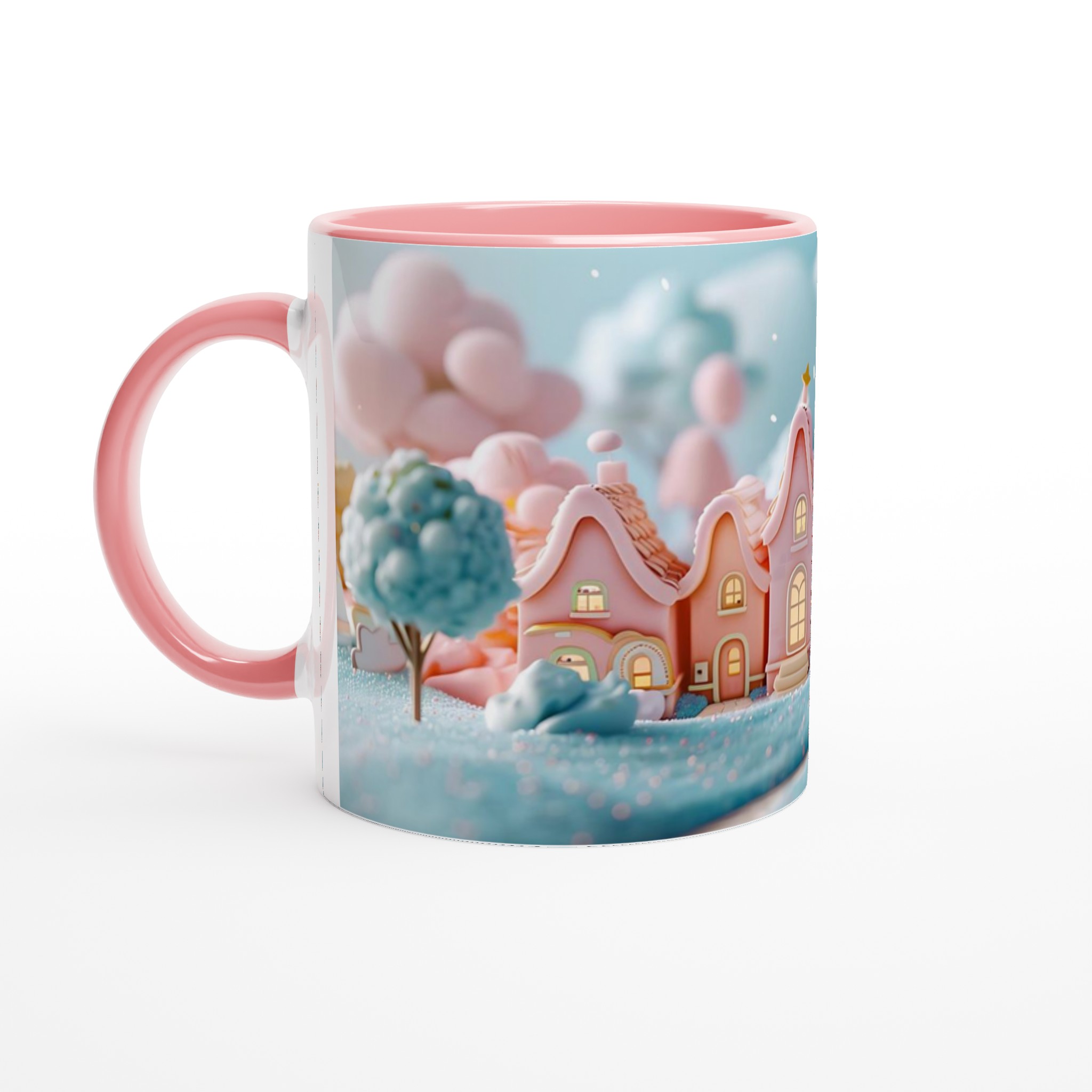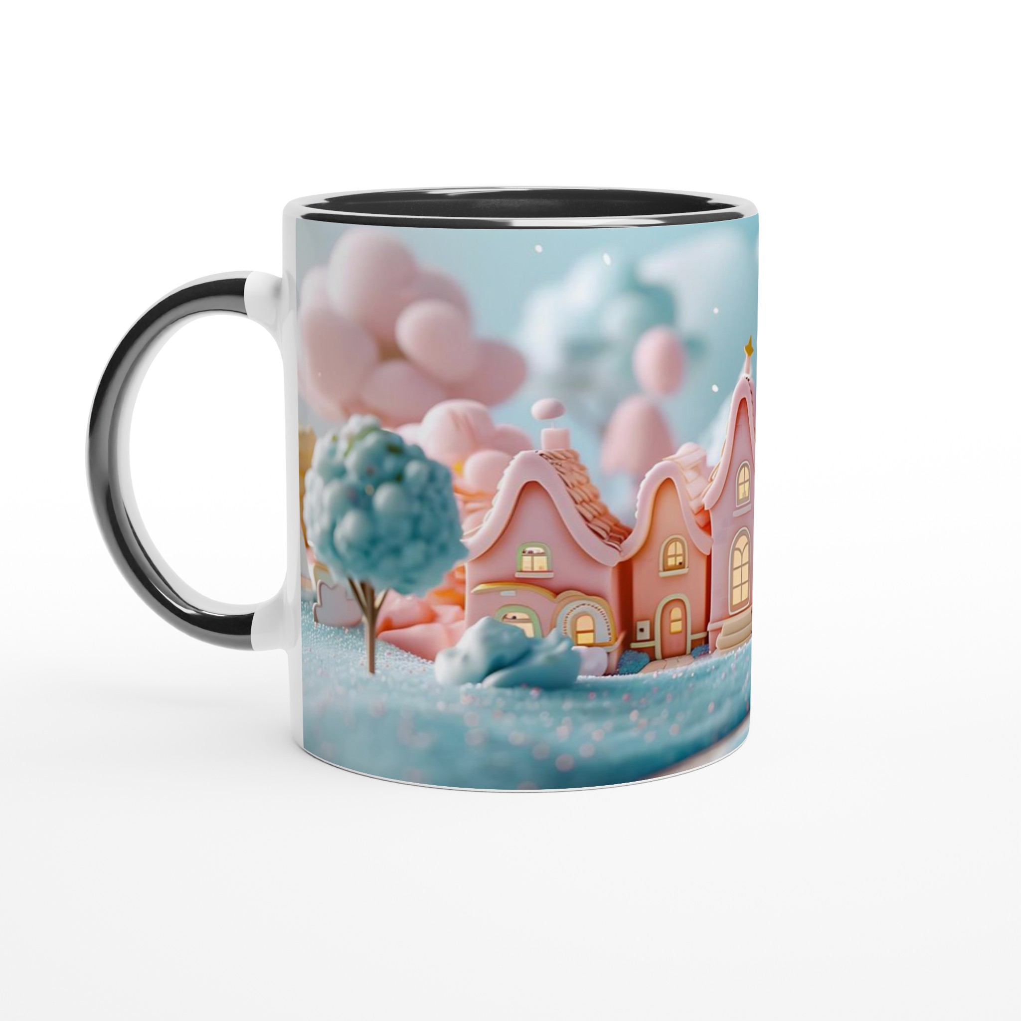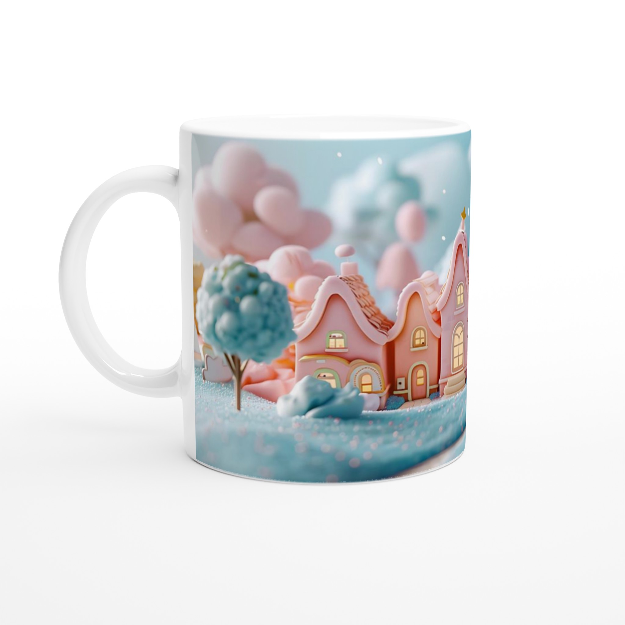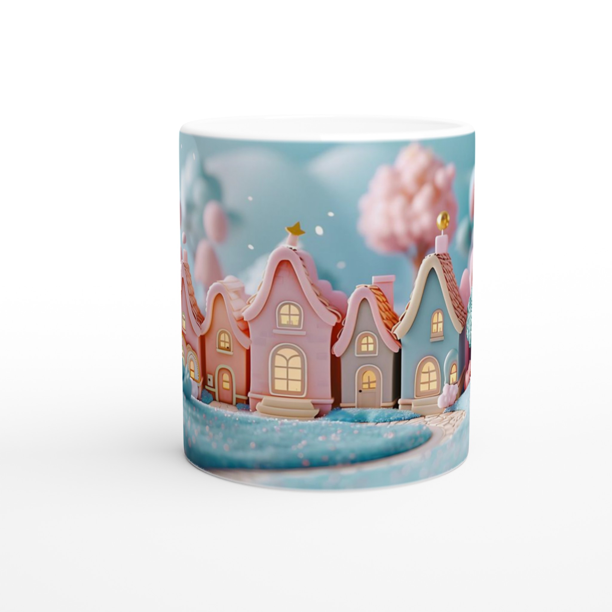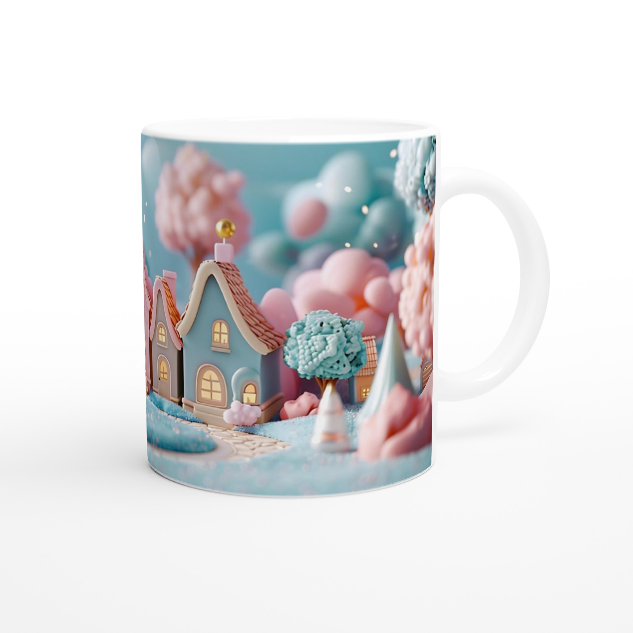 Fånga magin från en sockersöt drömvärld med vår ”Förtrollande Pastellby”-mugg. Inspirerad av bilden, med sina charmiga hus i pastellrosa och ljusblått, omgivna av molnliknande träd och gnistrande landskap, förvandlar denna mugg varje fikastund till en liten flykt. Den här stilrena keramiska muggen blir snabbt en vardagsfavorit. Perfekt för morgonkaffet, kvällens varma choklad eller när du bara vill njuta av en kopp te.