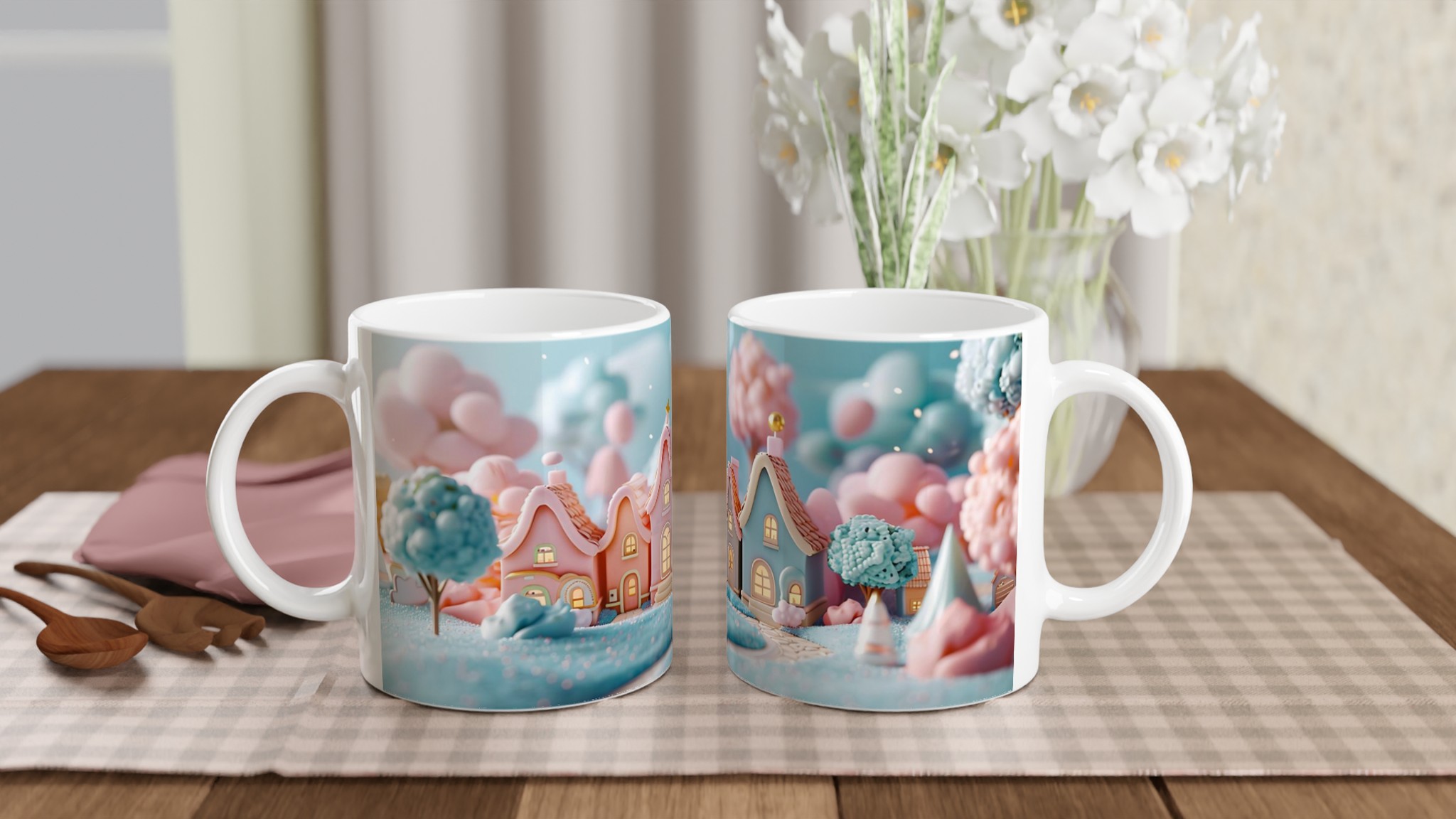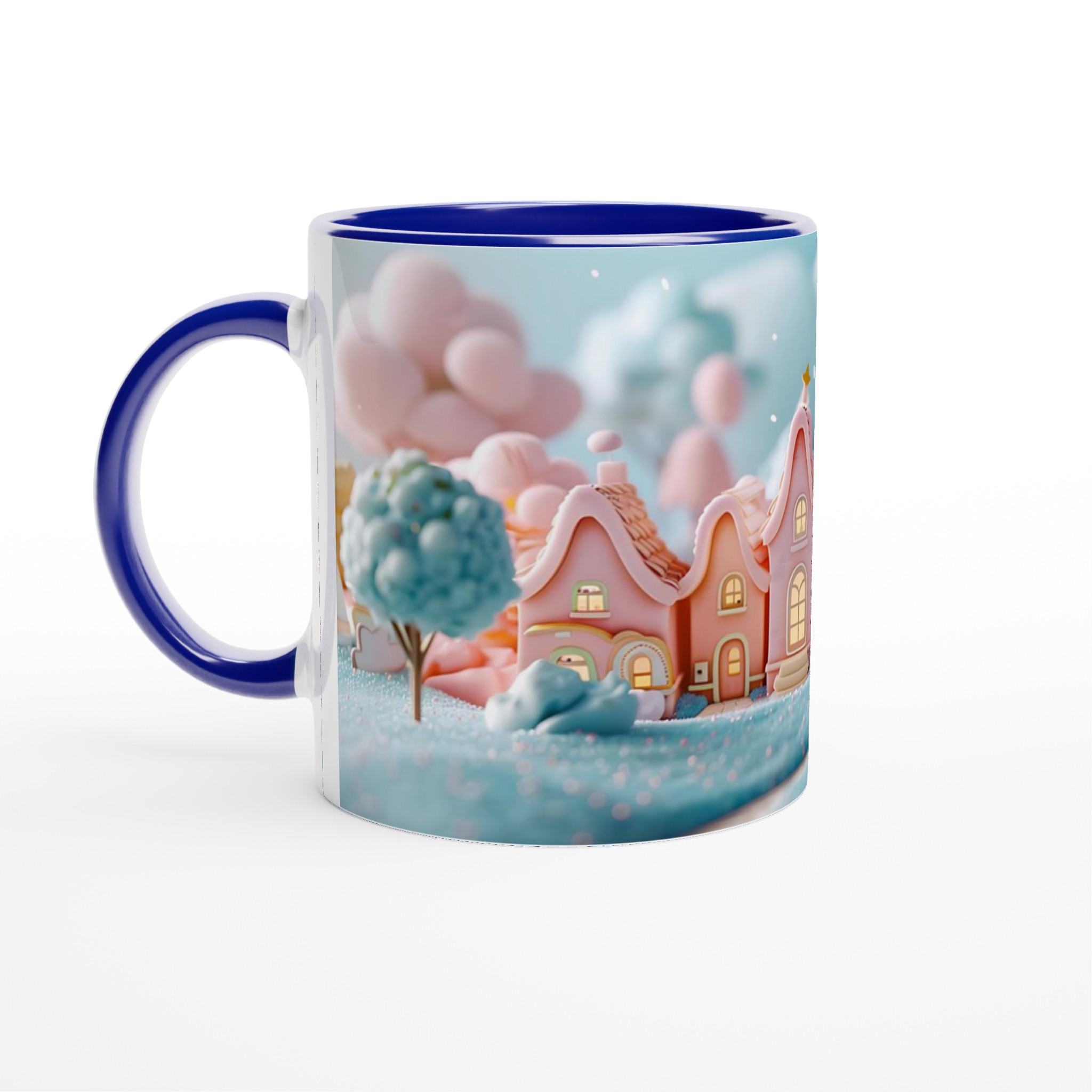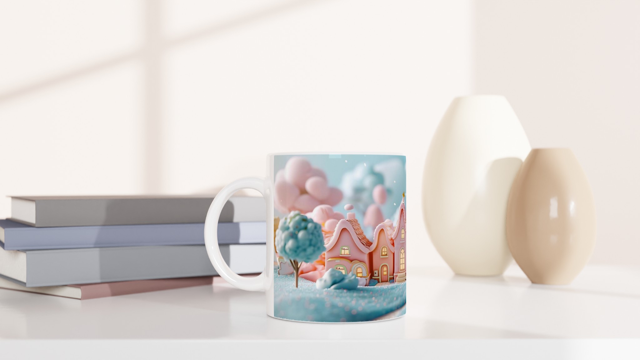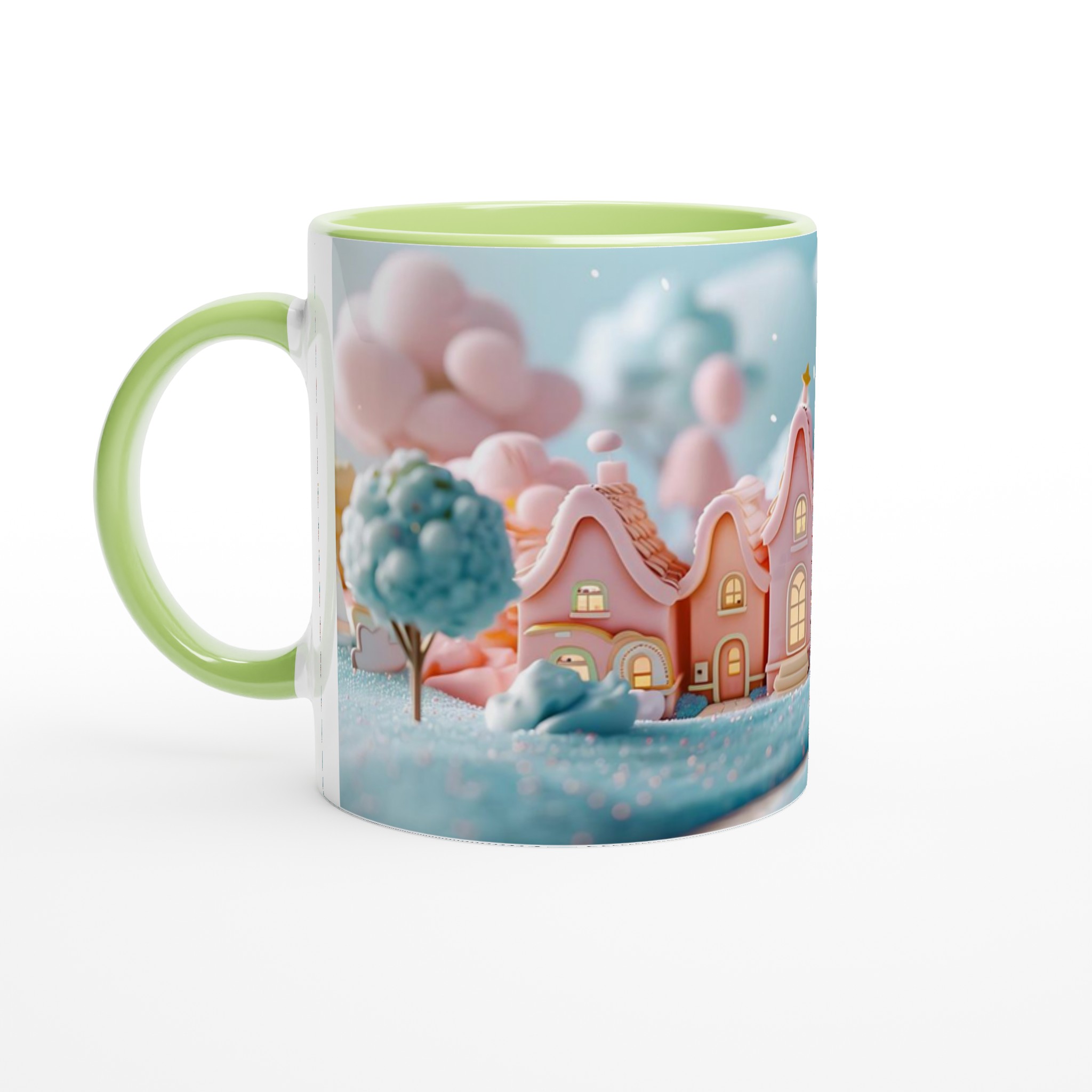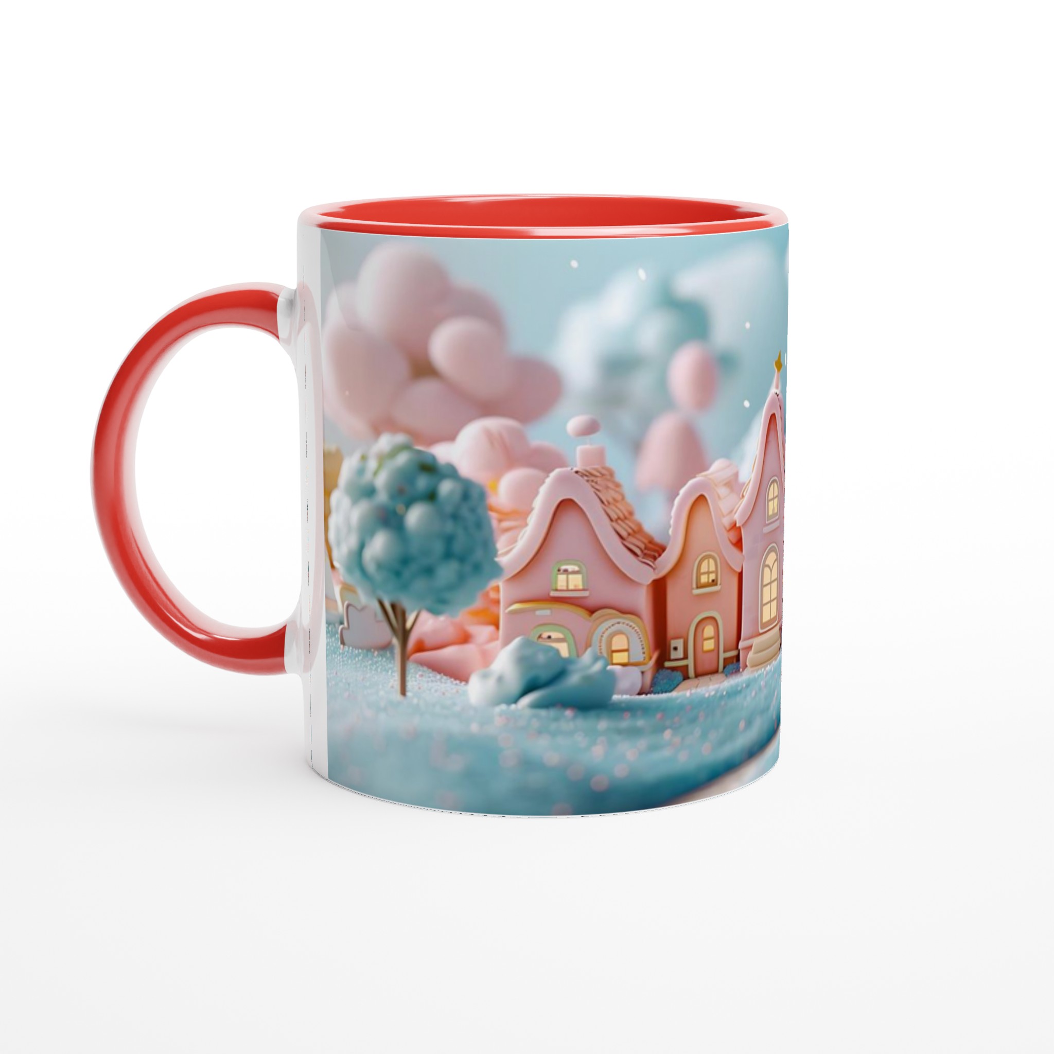 Fånga magin från en sockersöt drömvärld med vår ”Förtrollande Pastellby”-mugg. Inspirerad av bilden, med sina charmiga hus i pastellrosa och ljusblått, omgivna av molnliknande träd och gnistrande landskap, förvandlar denna mugg varje fikastund till en liten flykt. Den här stilrena keramiska muggen blir snabbt en vardagsfavorit. Perfekt för morgonkaffet, kvällens varma choklad eller när du bara vill njuta av en kopp te.
