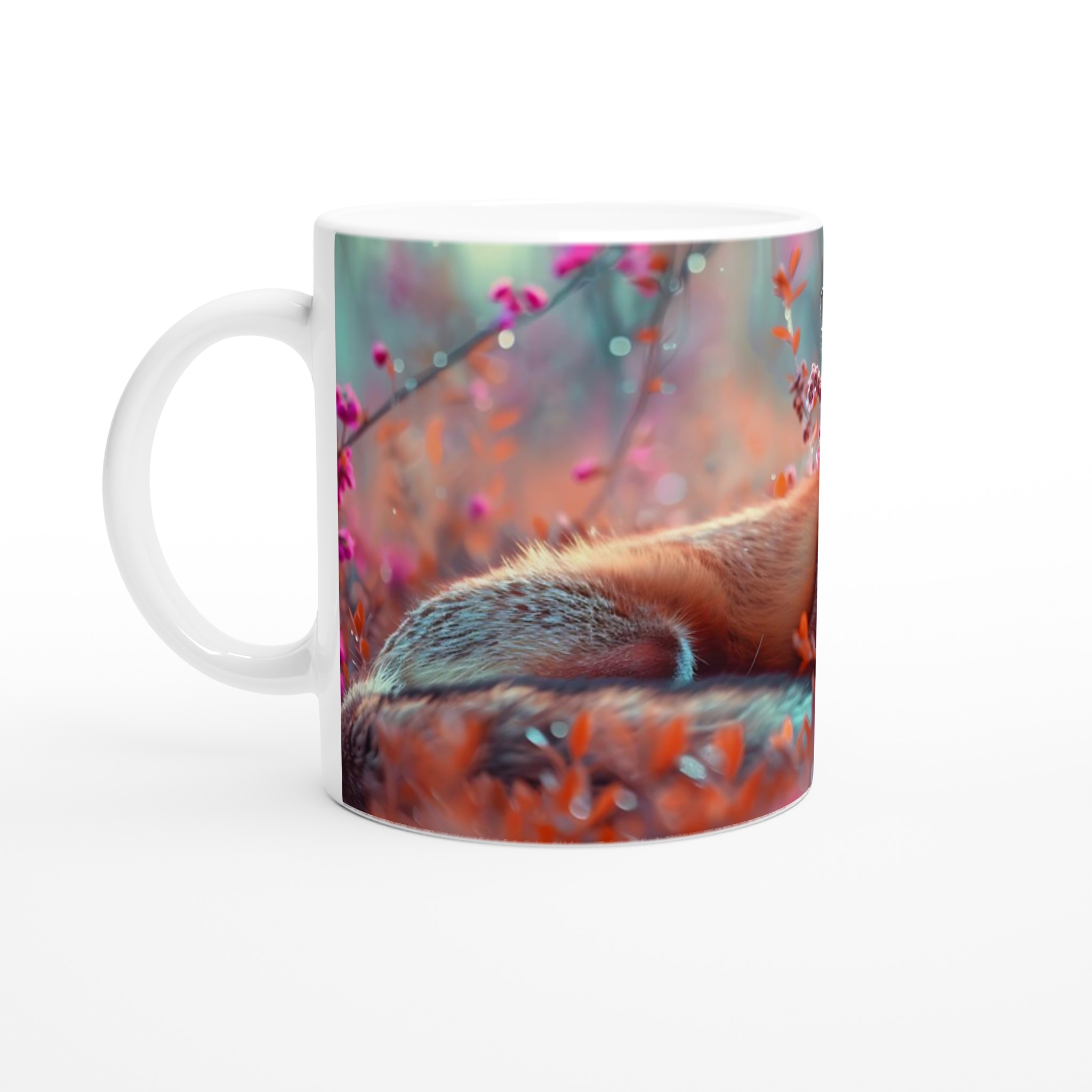 Fånga den magiska känslan av en räv som vilar i gryningens ljuva sken, omgiven av blommande rosa och persikofärgade blad. Denna mugg förvandlar din dryckesupplevelse till en förtrollande stund, perfekt för naturälskaren eller den som uppskattar konstnärliga och drömlika motiv. Den blanka ytan ger ett skarpt och levande tryck som verkligen sticker ut, oavsett om det är en personlig design, ett roligt citat eller en present till någon du tycker om.