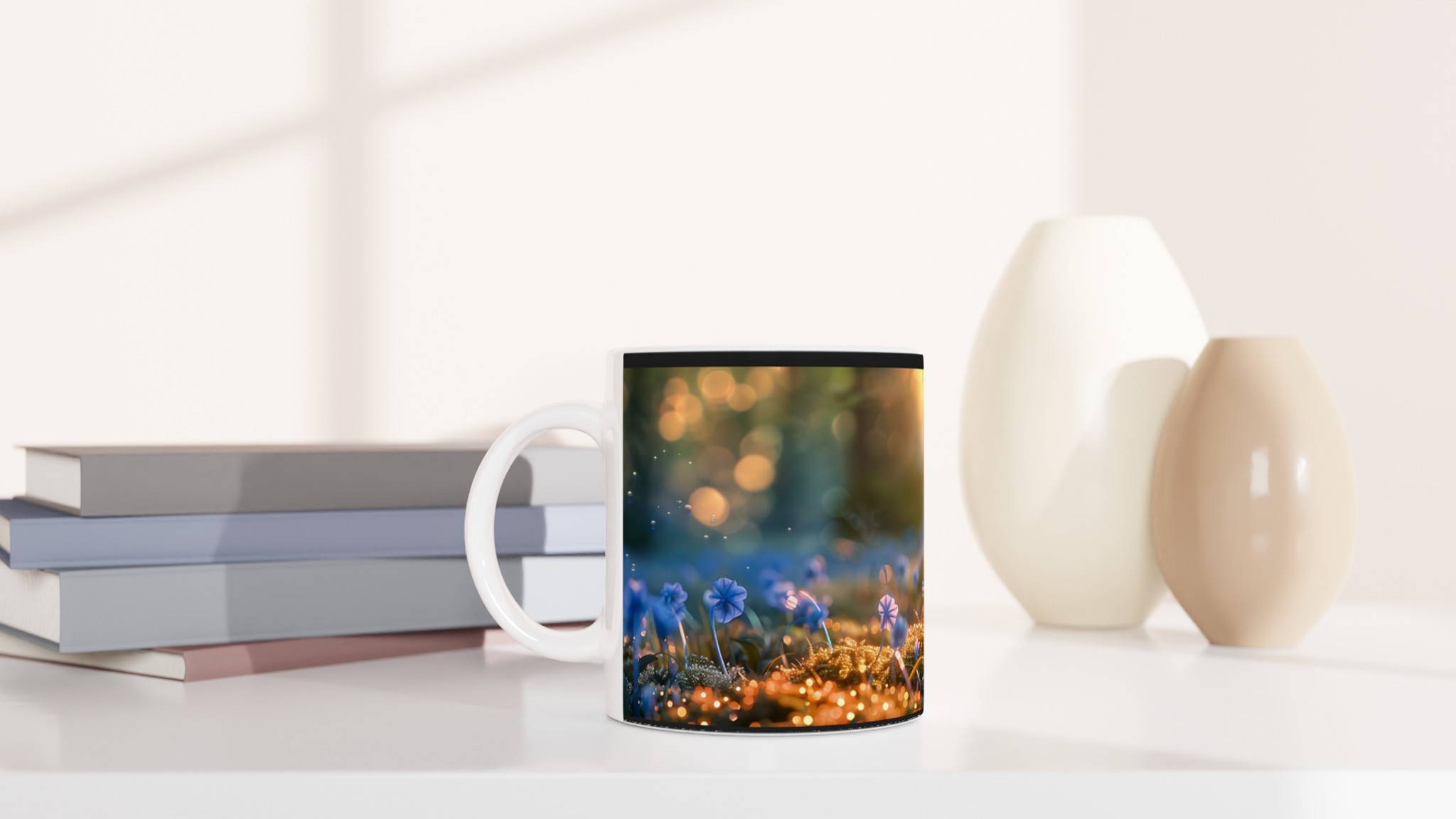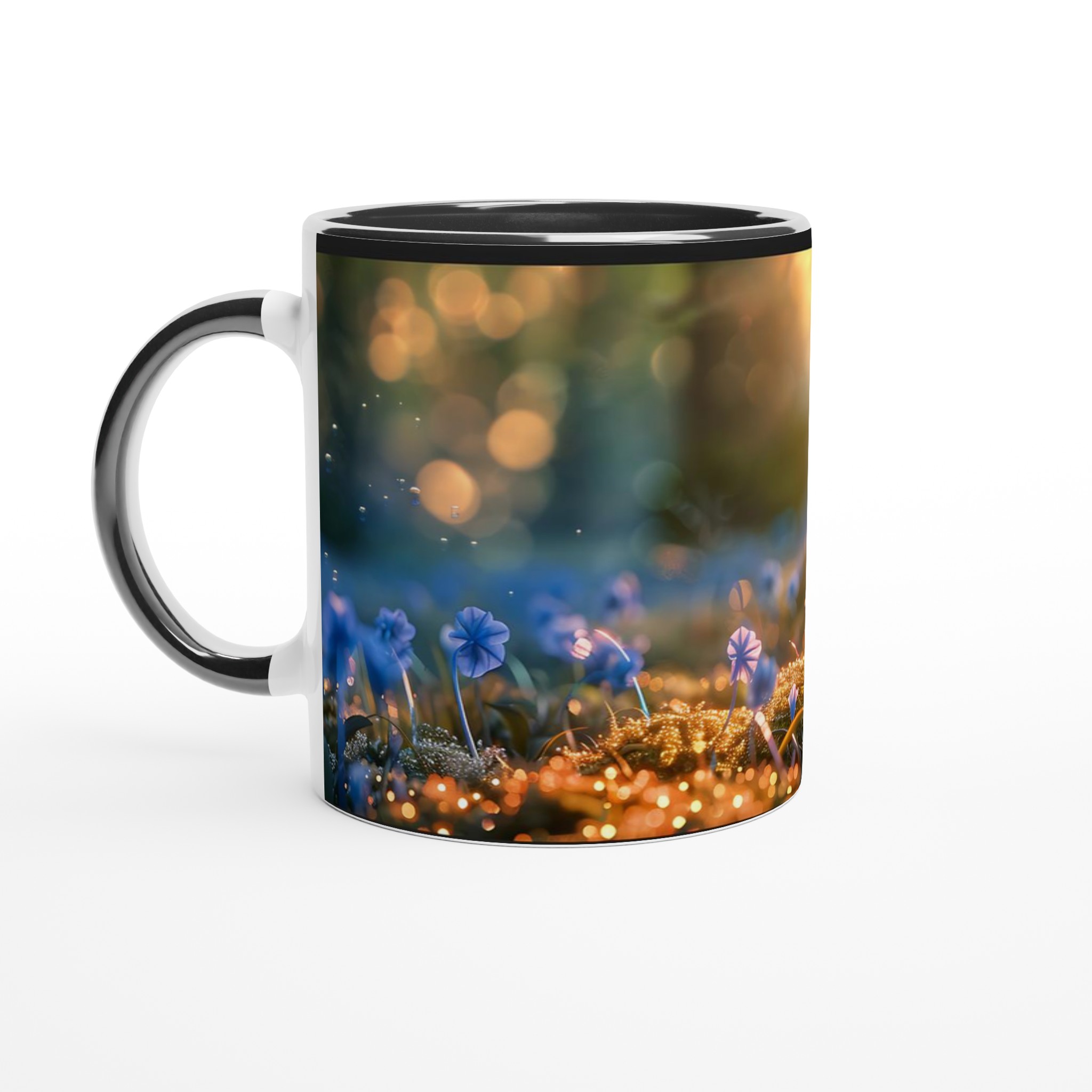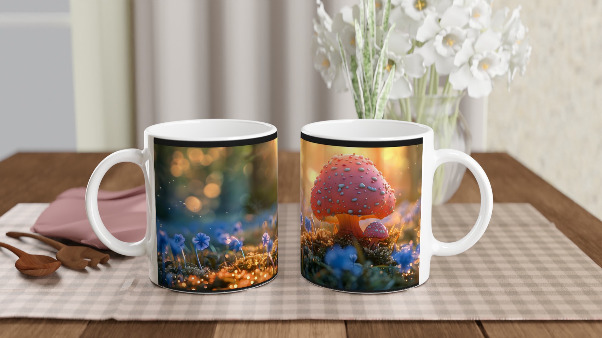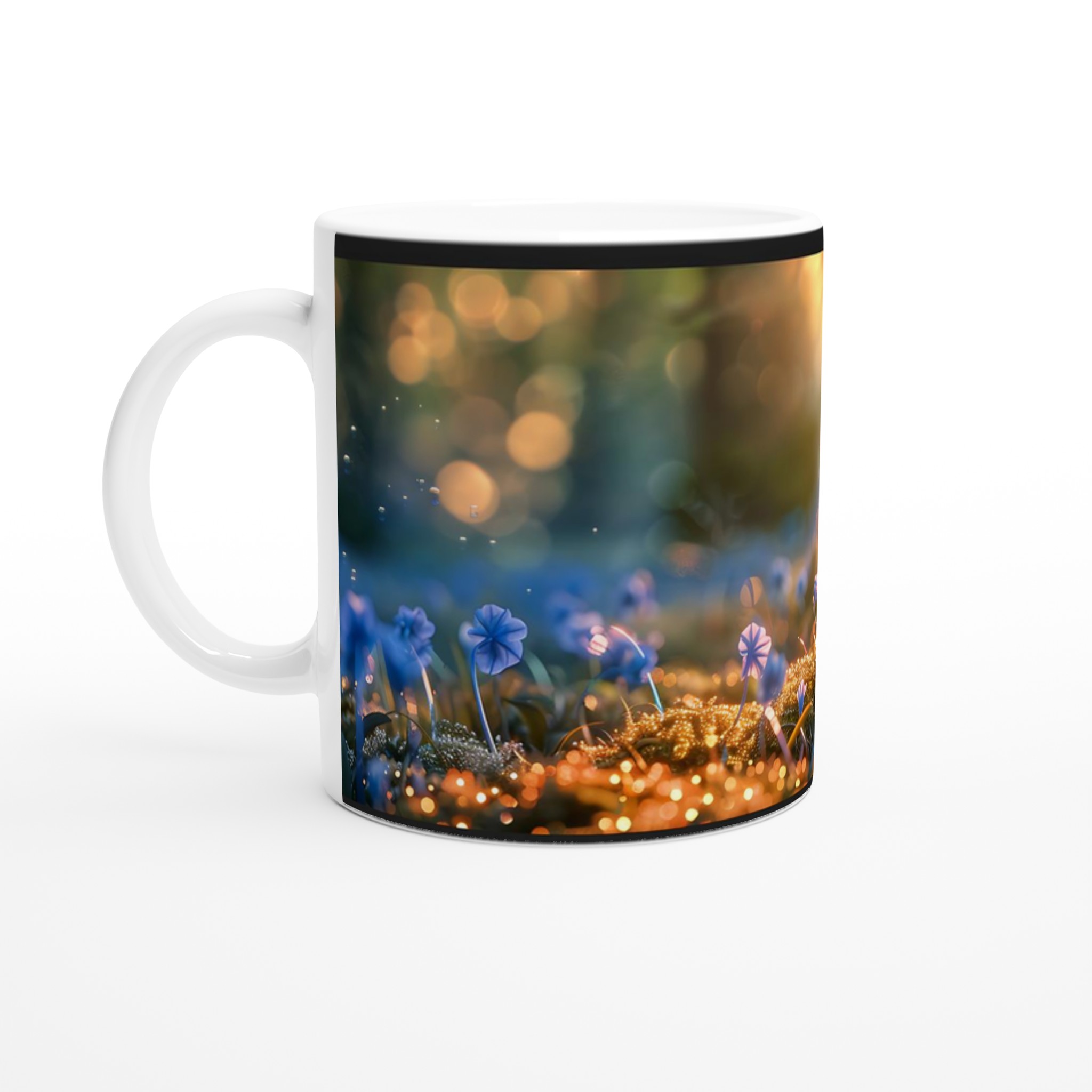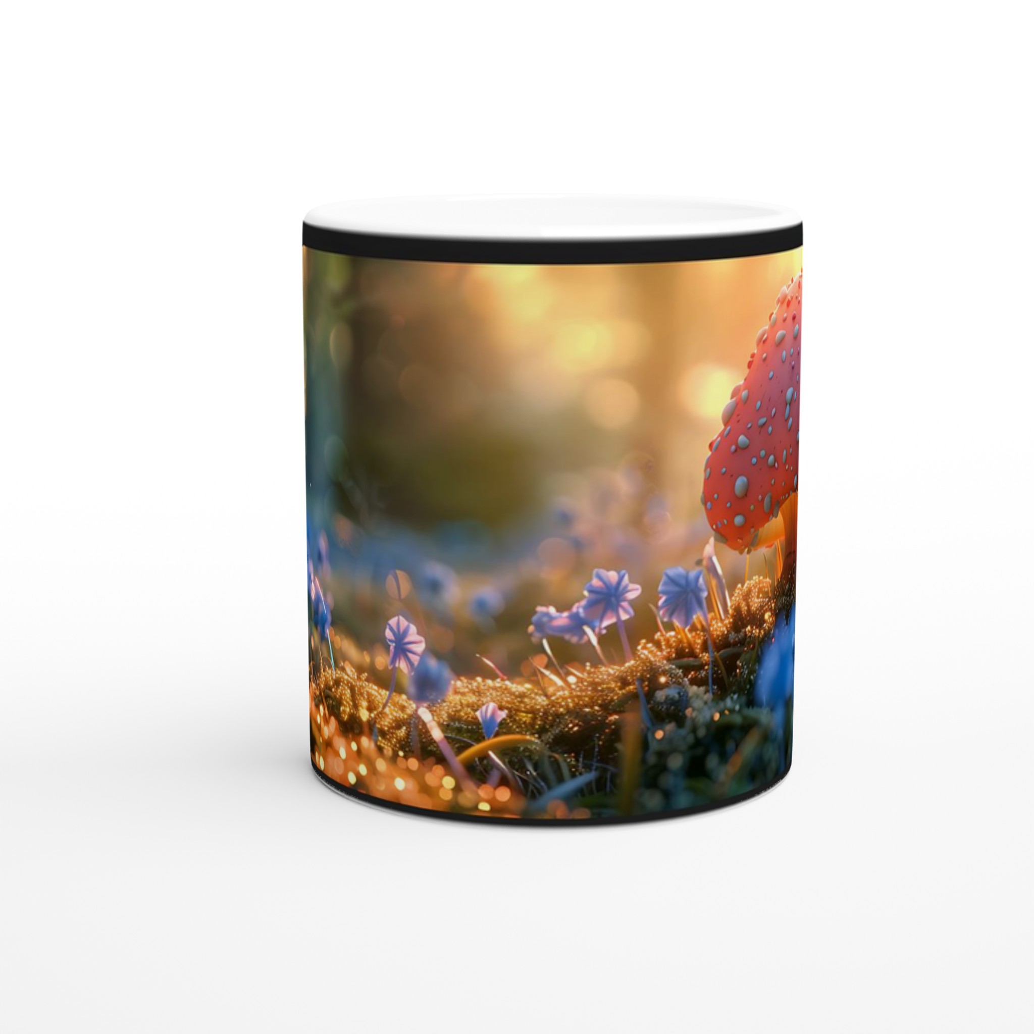 Låt dig svepas med till en magisk värld varje gång du tar en klunk! Denna stilrena keramiska mugg fångar den förtrollande känslan av en mystisk skogsdunge, badad i ett gyllene sken med lekfulla flugsvampar och daggfriska blommor. Den blir snabbt en vardagsfavorit, perfekt för morgonkaffet, kvällens varma choklad eller när du bara vill njuta av en kopp te och drömma dig bort.