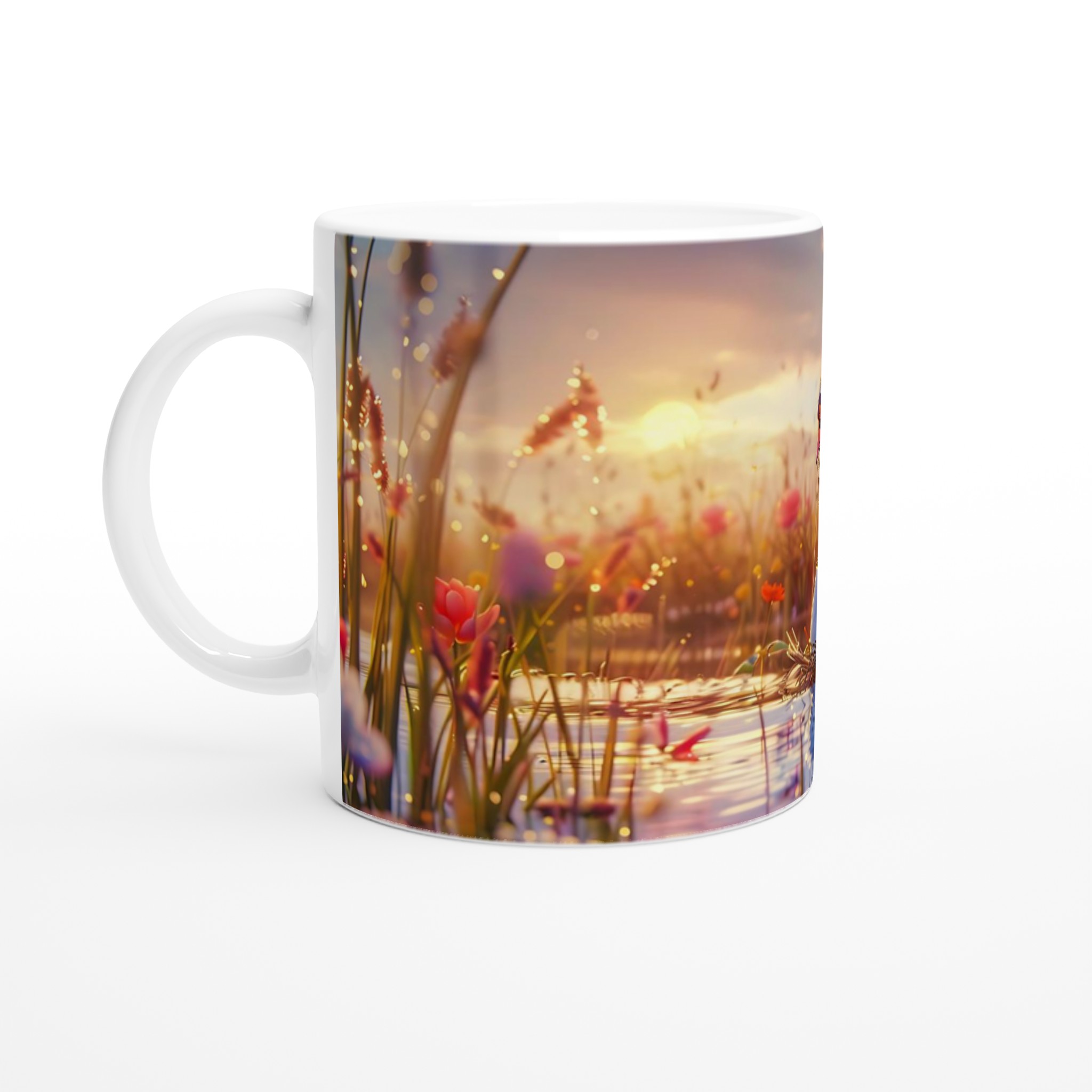 Lyft varje kaffestund med vår premium keramikmugg – stilren, hållbar och skapad för att låta ditt motiv glänsa. Denna mugg fångar den lugna skönheten av en svan vid solnedgången, omgiven av glödande blommor och ett magiskt ljusspel. Låt den rogivande bilden inspirera dig till en stund av avkoppling vid varje användning.