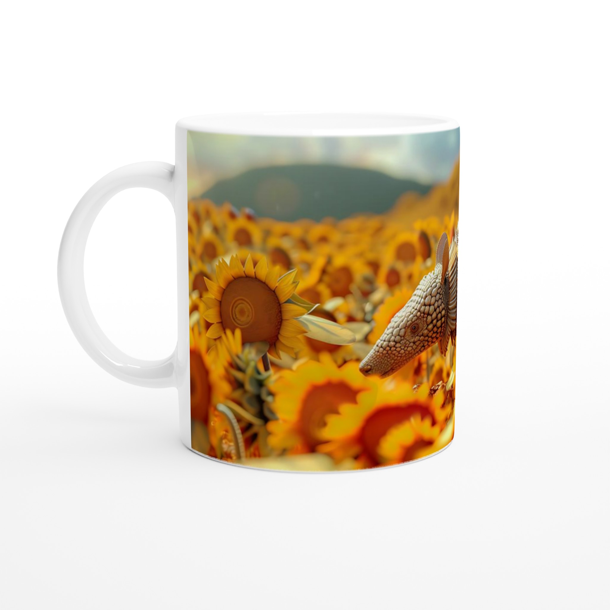 Inspirerad av den varma glöden från ett solrosfält och den unika charmen hos ett bältdjur, fångar denna designmugg ögonblicket. Den blanka vita ytan ger ett skarpt och levande tryck som verkligen sticker ut, oavsett om det är en personlig design, ett roligt citat eller en present till någon du tycker om.