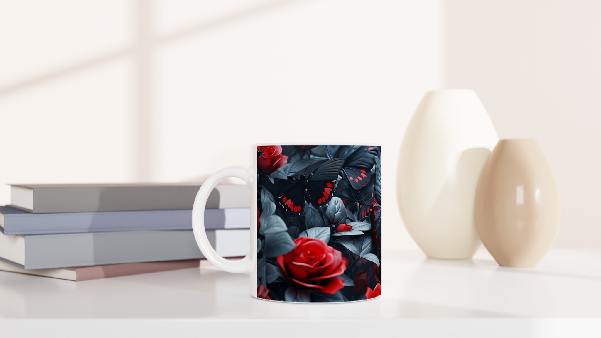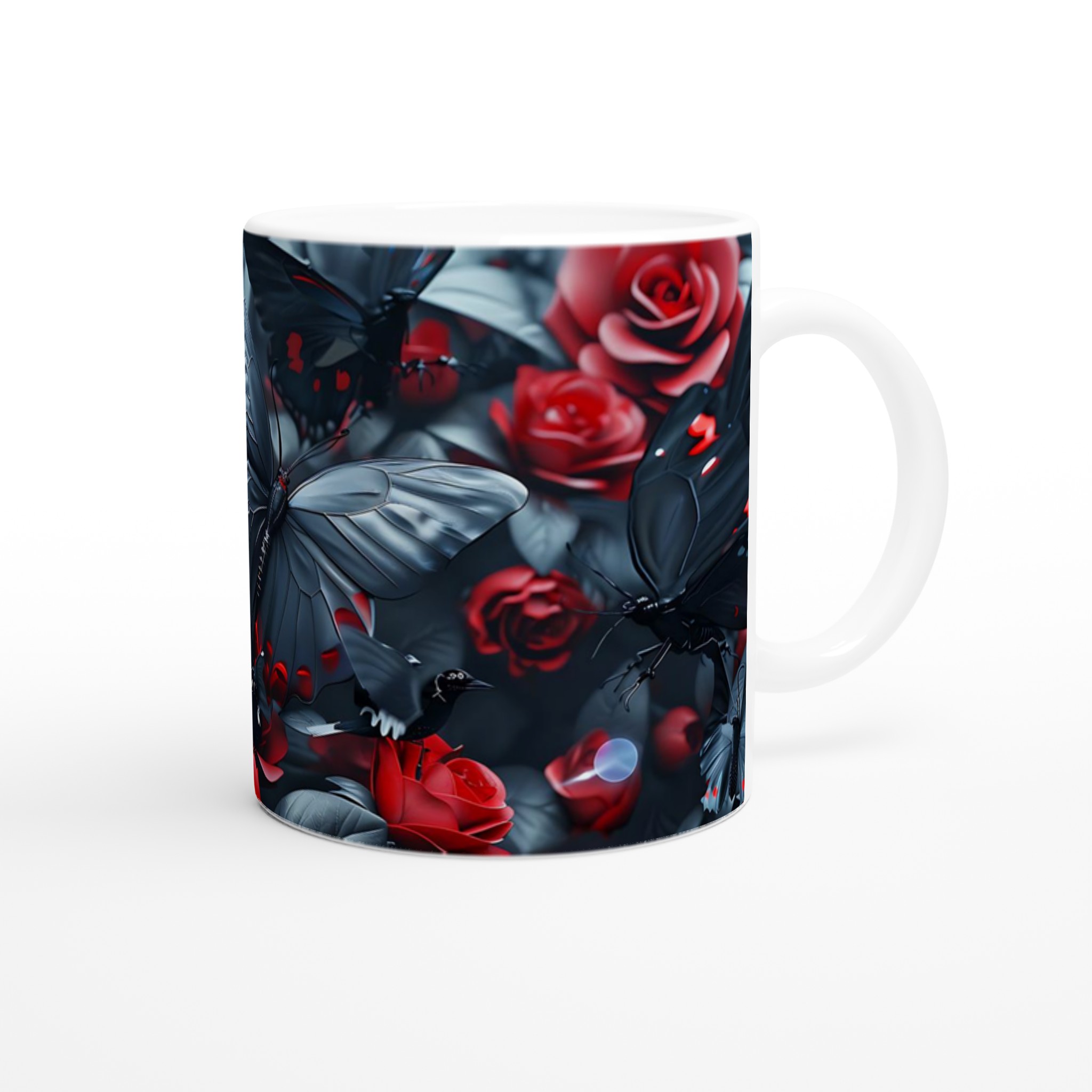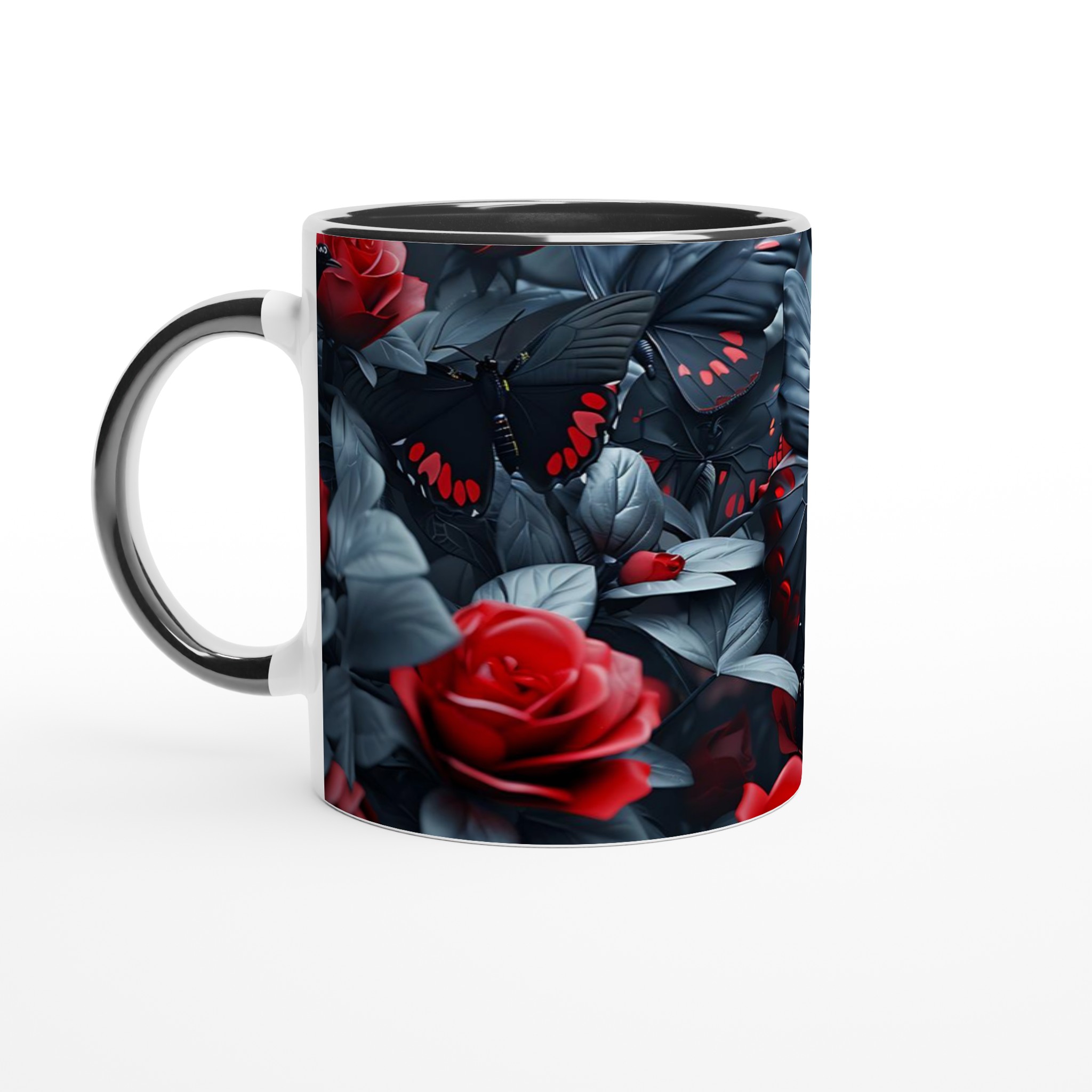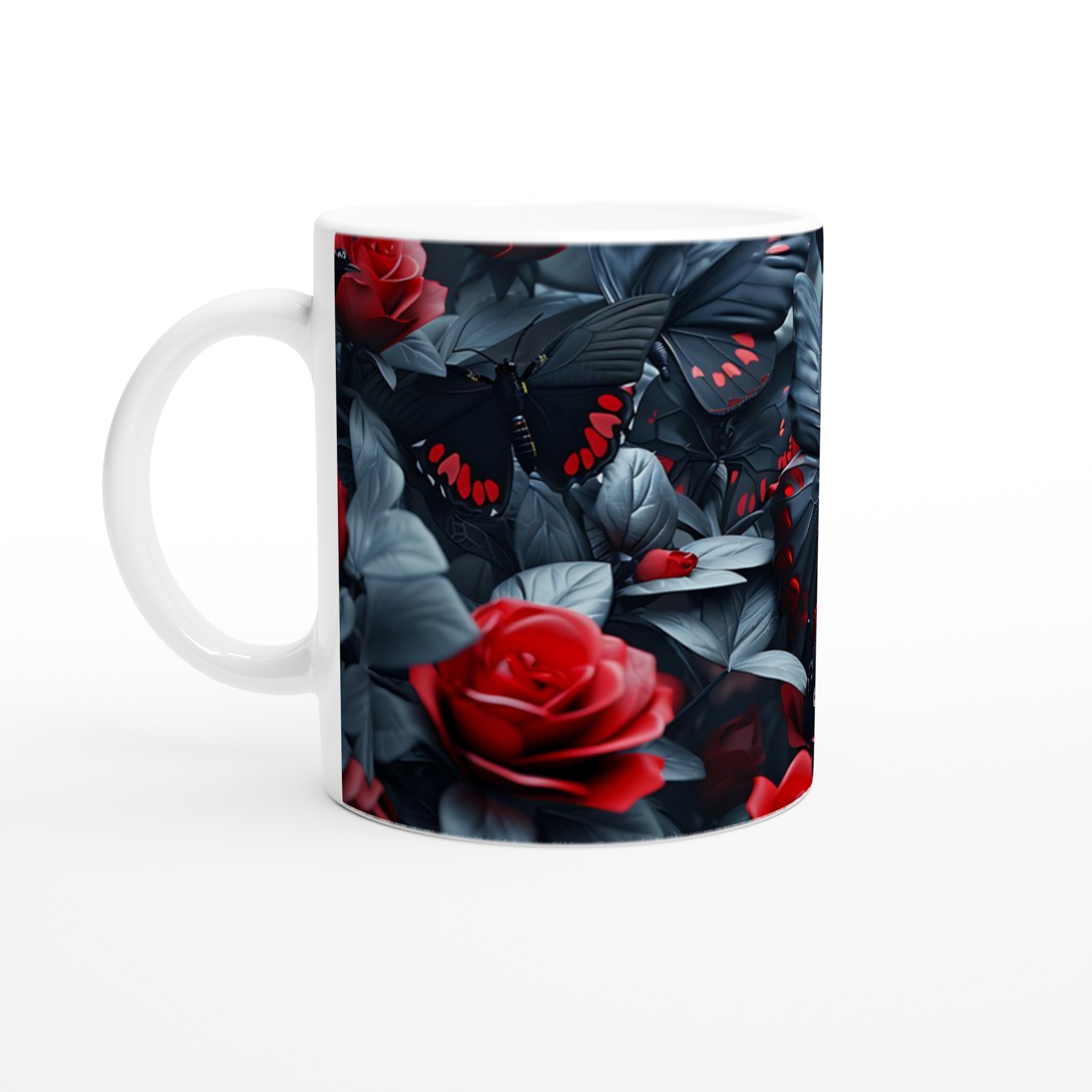 Låt din kaffepaus blomma ut med denna förtrollande keramiska mugg, prydd med en dramatisk design av svarta fjärilar och djupröda rosor. Denna mugg är mer än bara en kopp – den är en konstnärlig upplevelse som förvandlar varje sipp till ett ögonblick av skönhet och elegans. De intensiva färgerna och det sofistikerade motivet gör den till en omedelbar favorit, perfekt för att förhöja din morgonrutin eller som en stilfull detalj i ditt hem.