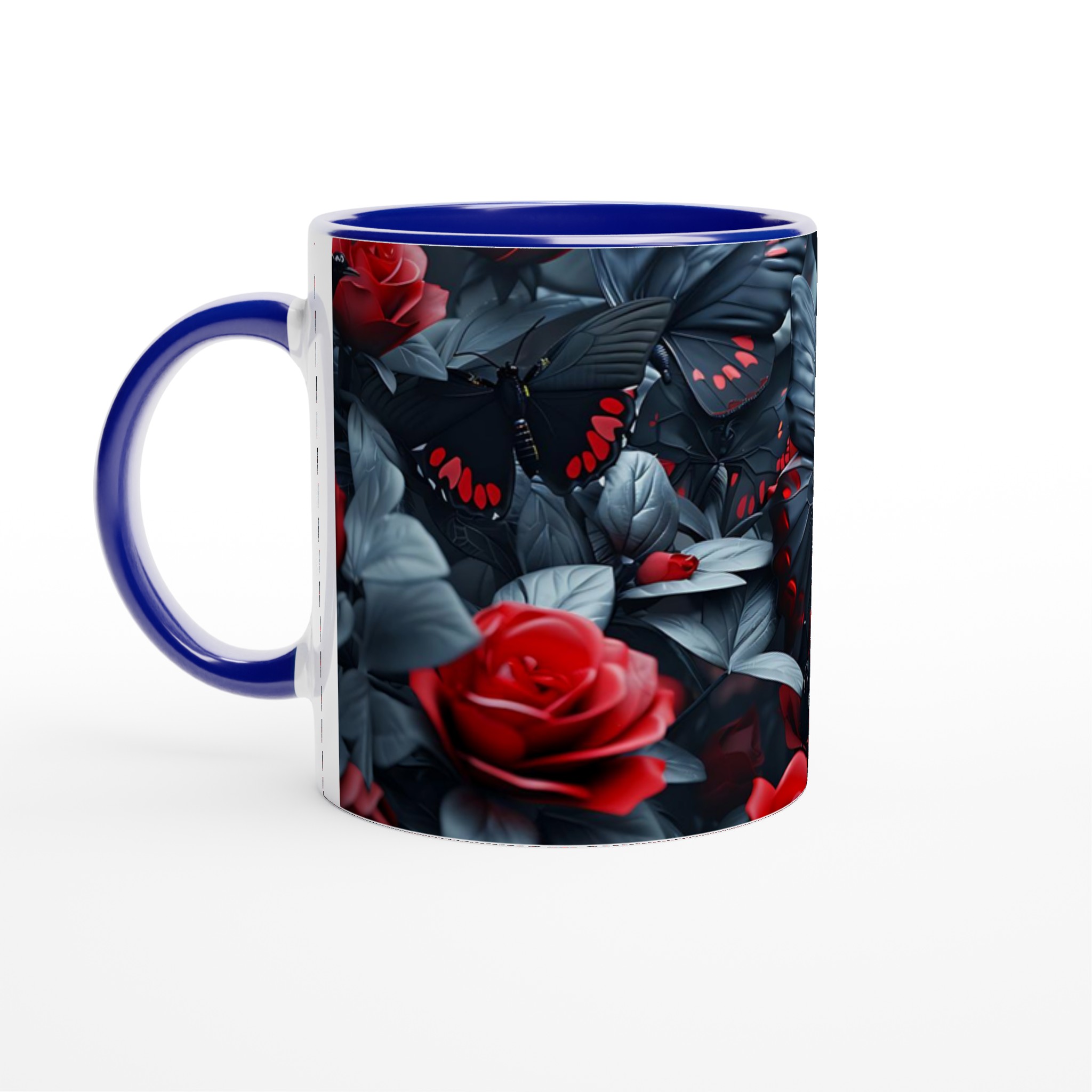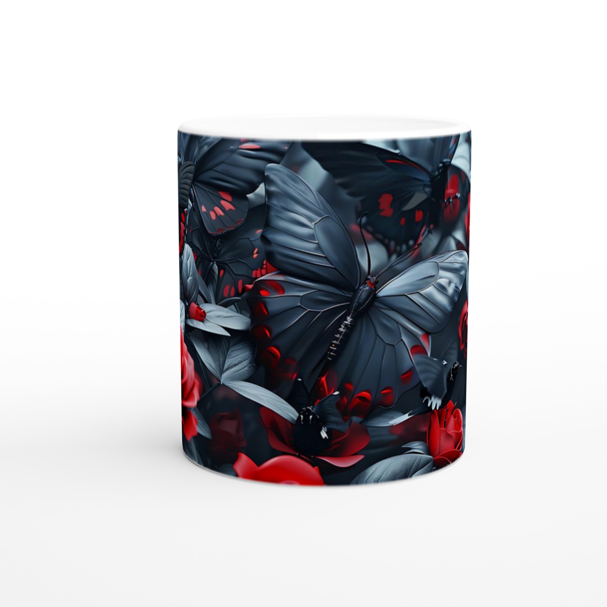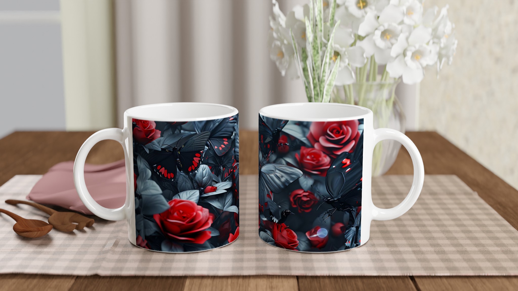 Låt din kaffepaus blomma ut med denna förtrollande keramiska mugg, prydd med en dramatisk design av svarta fjärilar och djupröda rosor. Denna mugg är mer än bara en kopp – den är en konstnärlig upplevelse som förvandlar varje sipp till ett ögonblick av skönhet och elegans. De intensiva färgerna och det sofistikerade motivet gör den till en omedelbar favorit, perfekt för att förhöja din morgonrutin eller som en stilfull detalj i ditt hem.