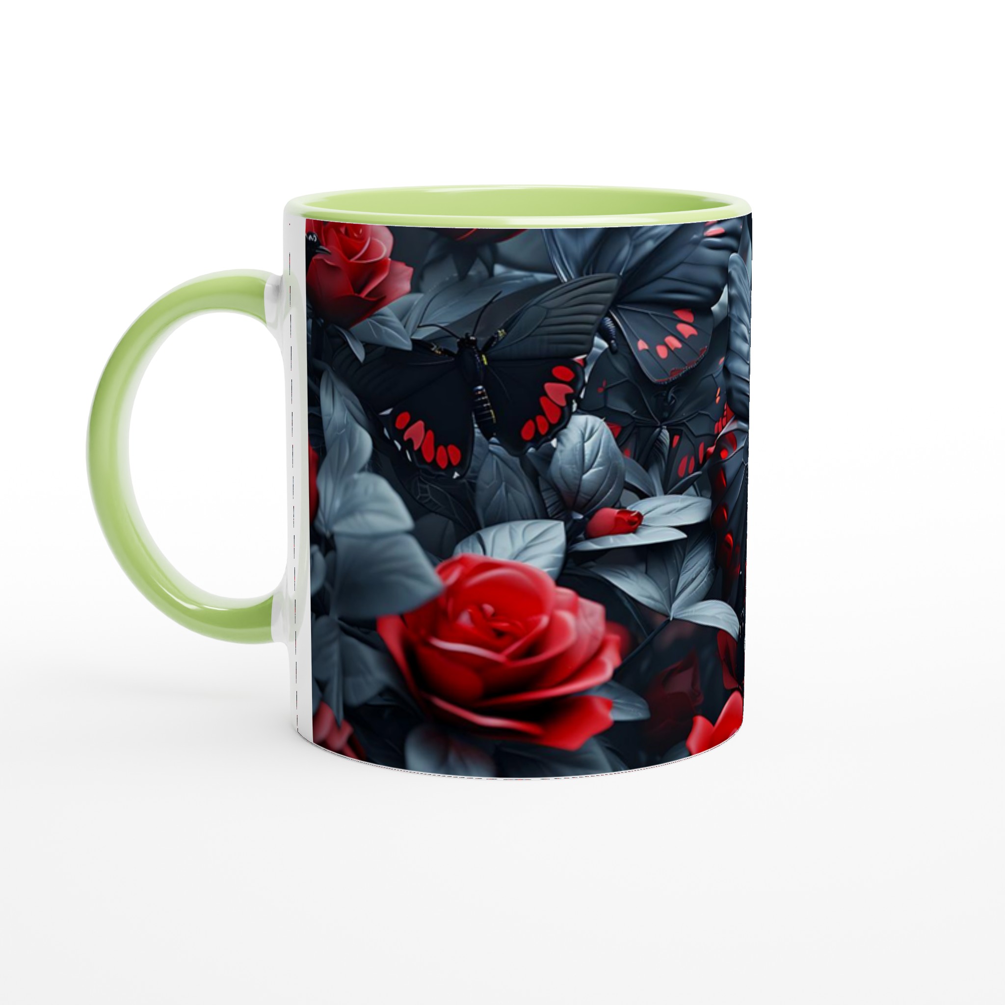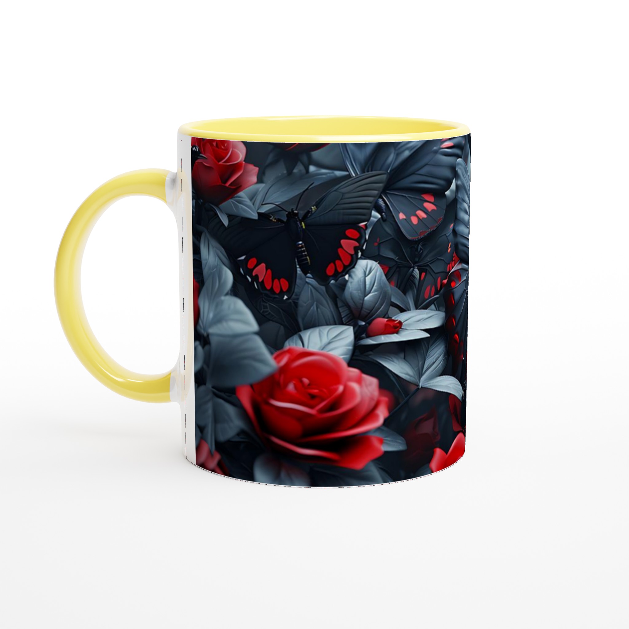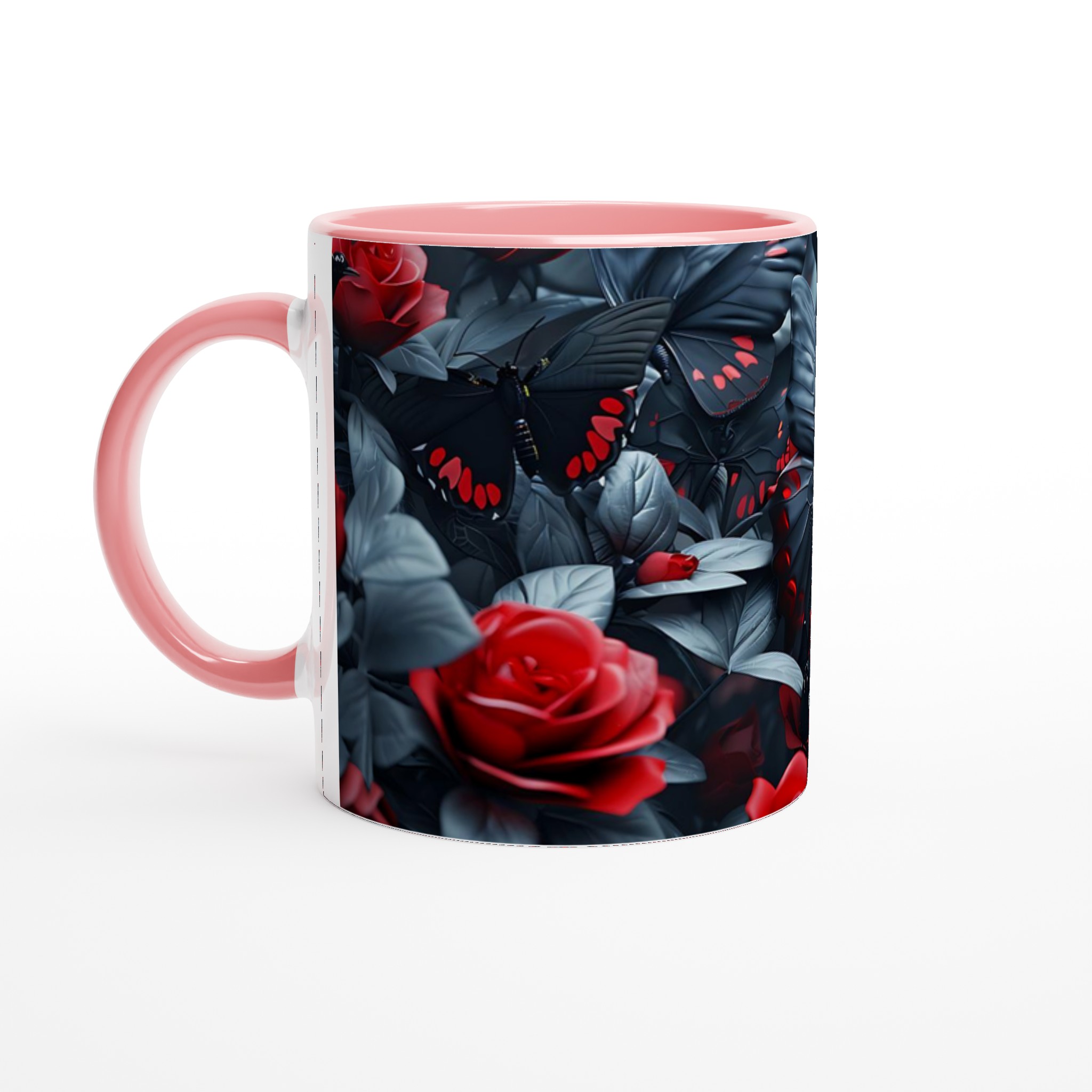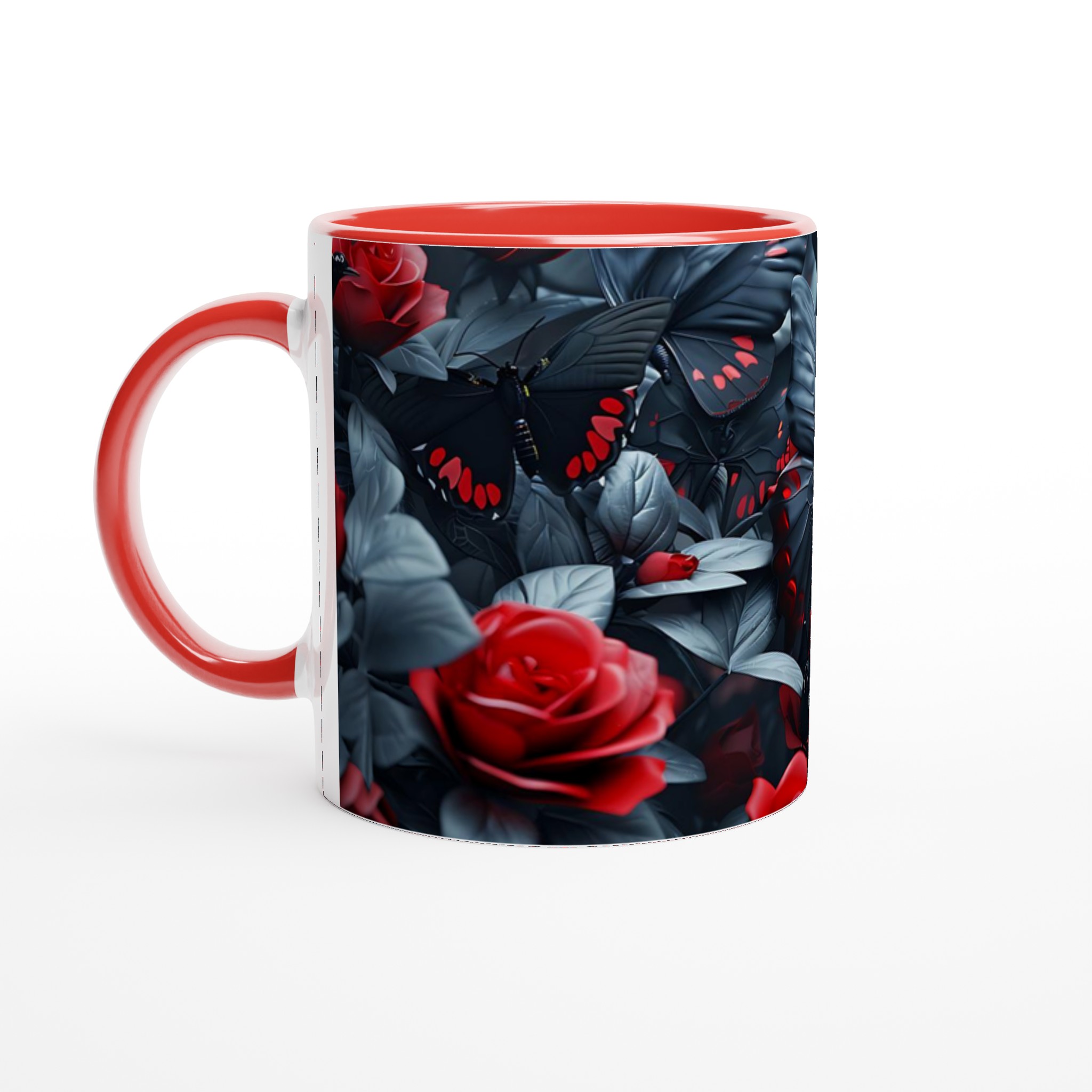 Låt din kaffepaus blomma ut med denna förtrollande keramiska mugg, prydd med en dramatisk design av svarta fjärilar och djupröda rosor. Denna mugg är mer än bara en kopp – den är en konstnärlig upplevelse som förvandlar varje sipp till ett ögonblick av skönhet och elegans. De intensiva färgerna och det sofistikerade motivet gör den till en omedelbar favorit, perfekt för att förhöja din morgonrutin eller som en stilfull detalj i ditt hem.