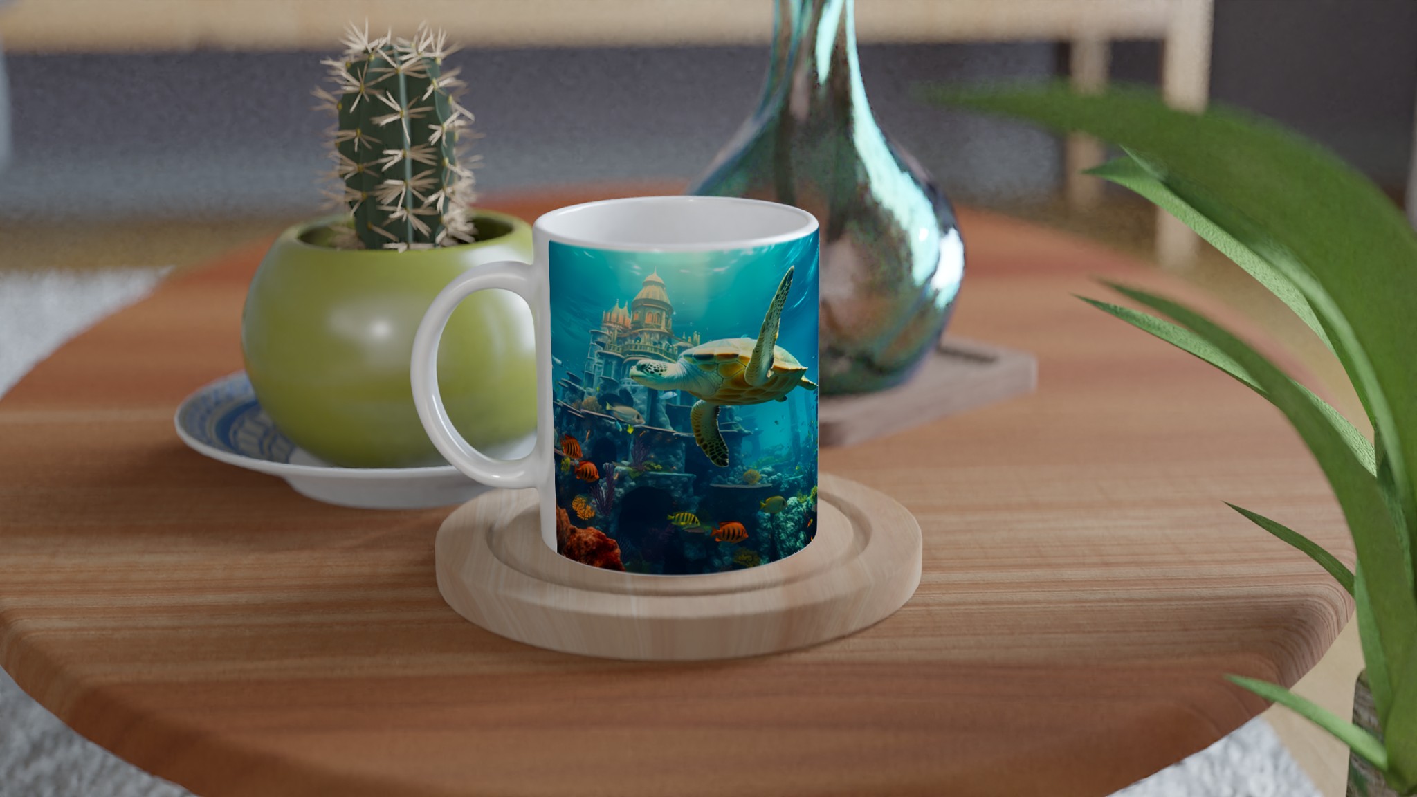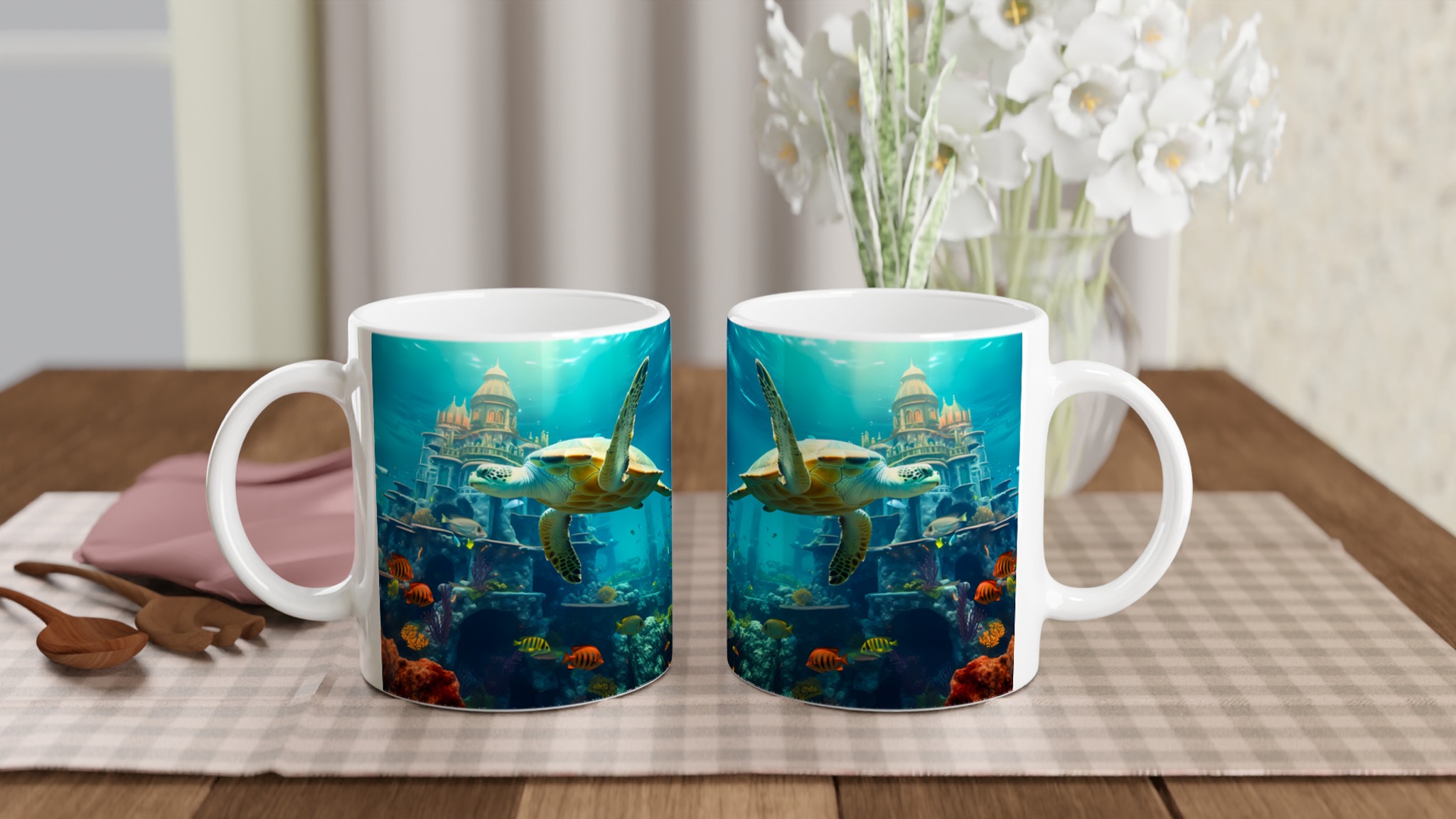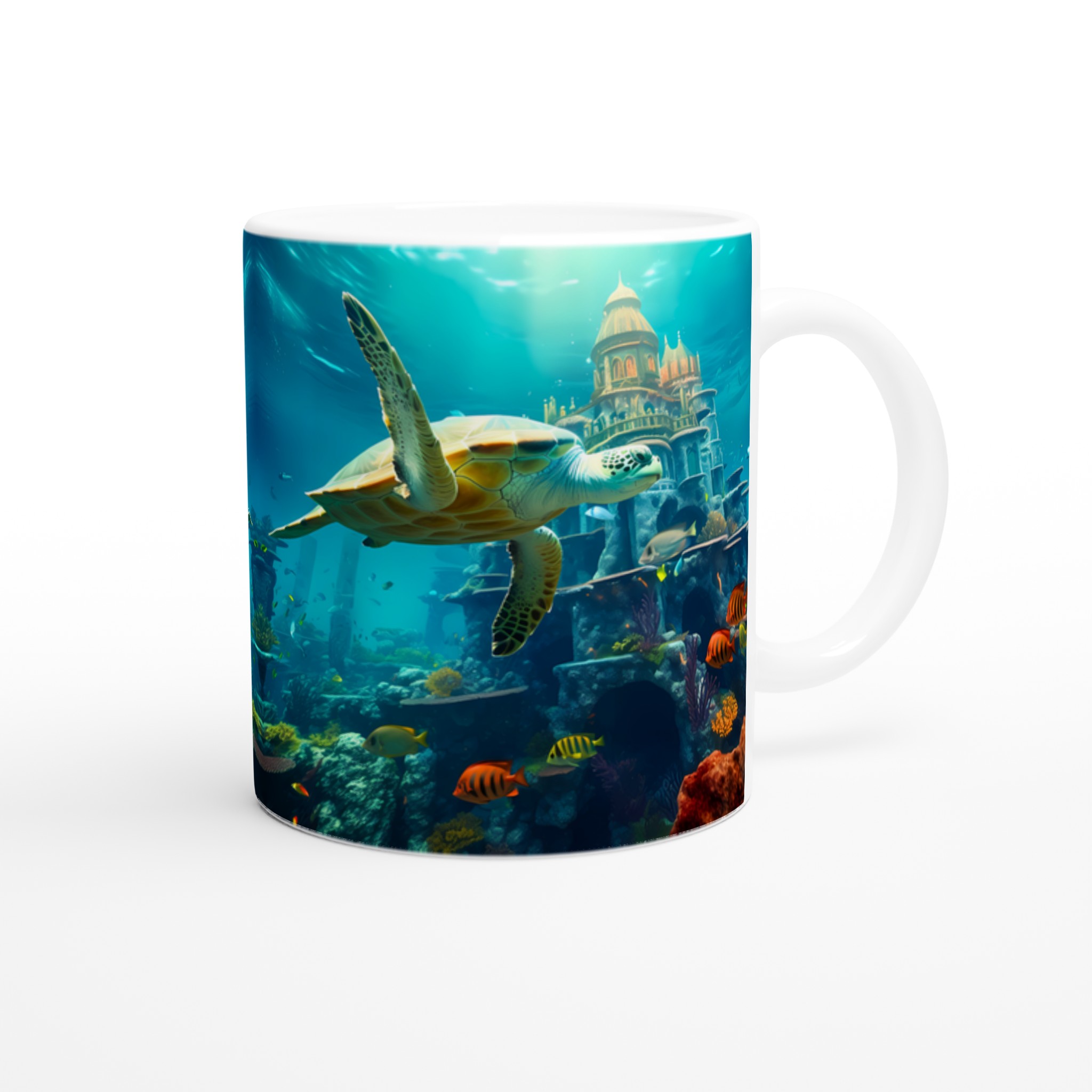 Dyk ner i en värld av under med vår förtrollande keramiska mugg, prydd med ett hisnande undervattensmotiv av majestätiska havssköldpaddor som simmar över ett korallrev och ett mytomspunnet undervattensslott. De levande färgerna och den sagolika stämningen gör varje sip till en liten flykt från vardagen. Den här stilrena keramiska muggen blir snabbt en vardagsfavorit. Perfekt för morgonkaffet, kvällens varma choklad eller när du bara vill njuta av en kopp te.
