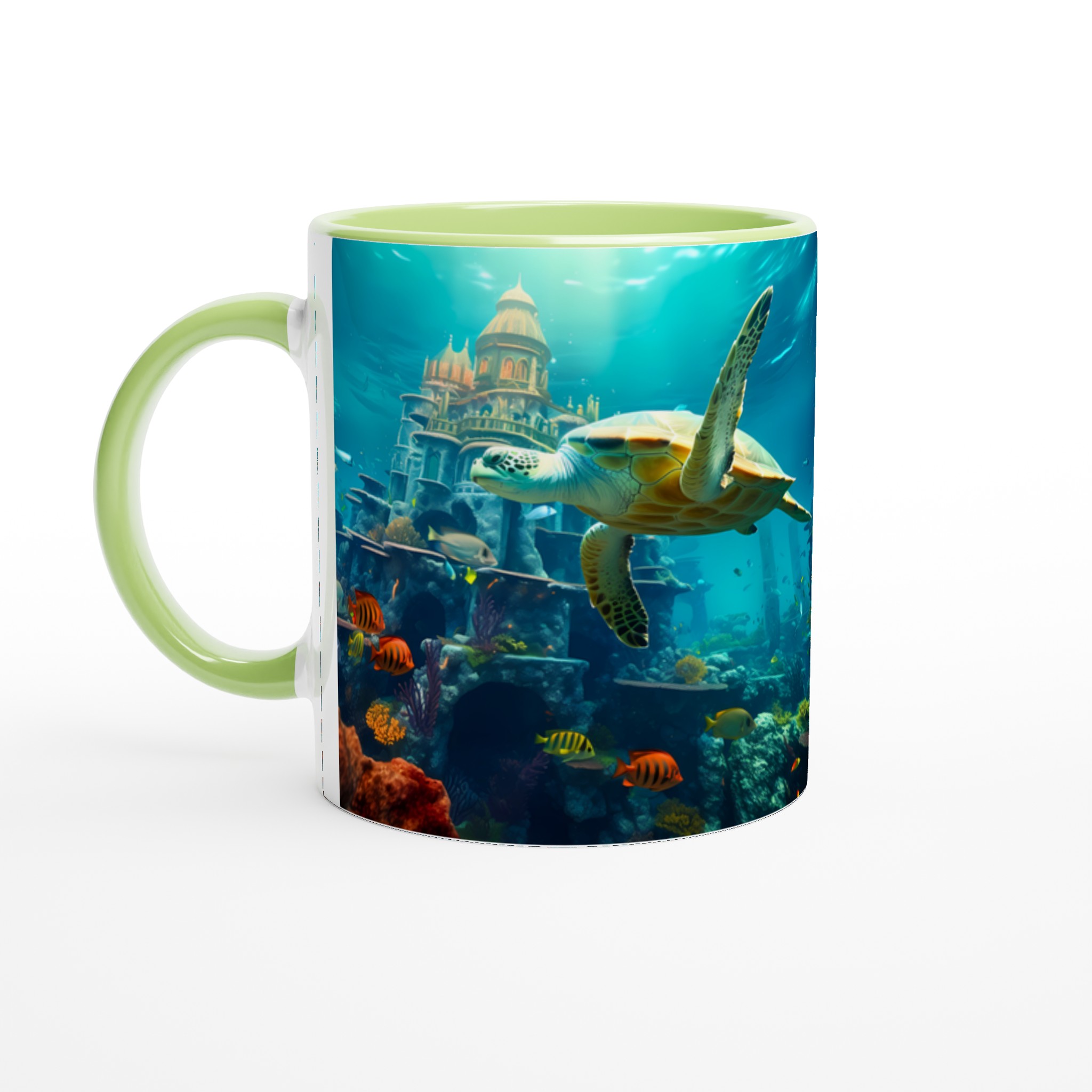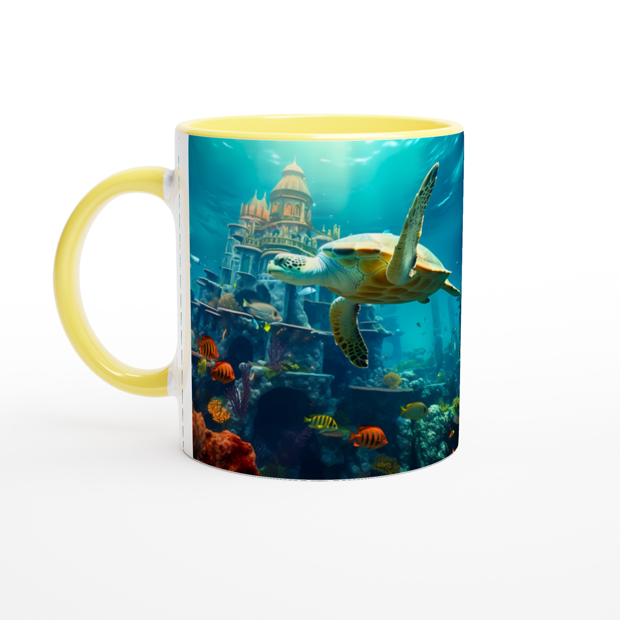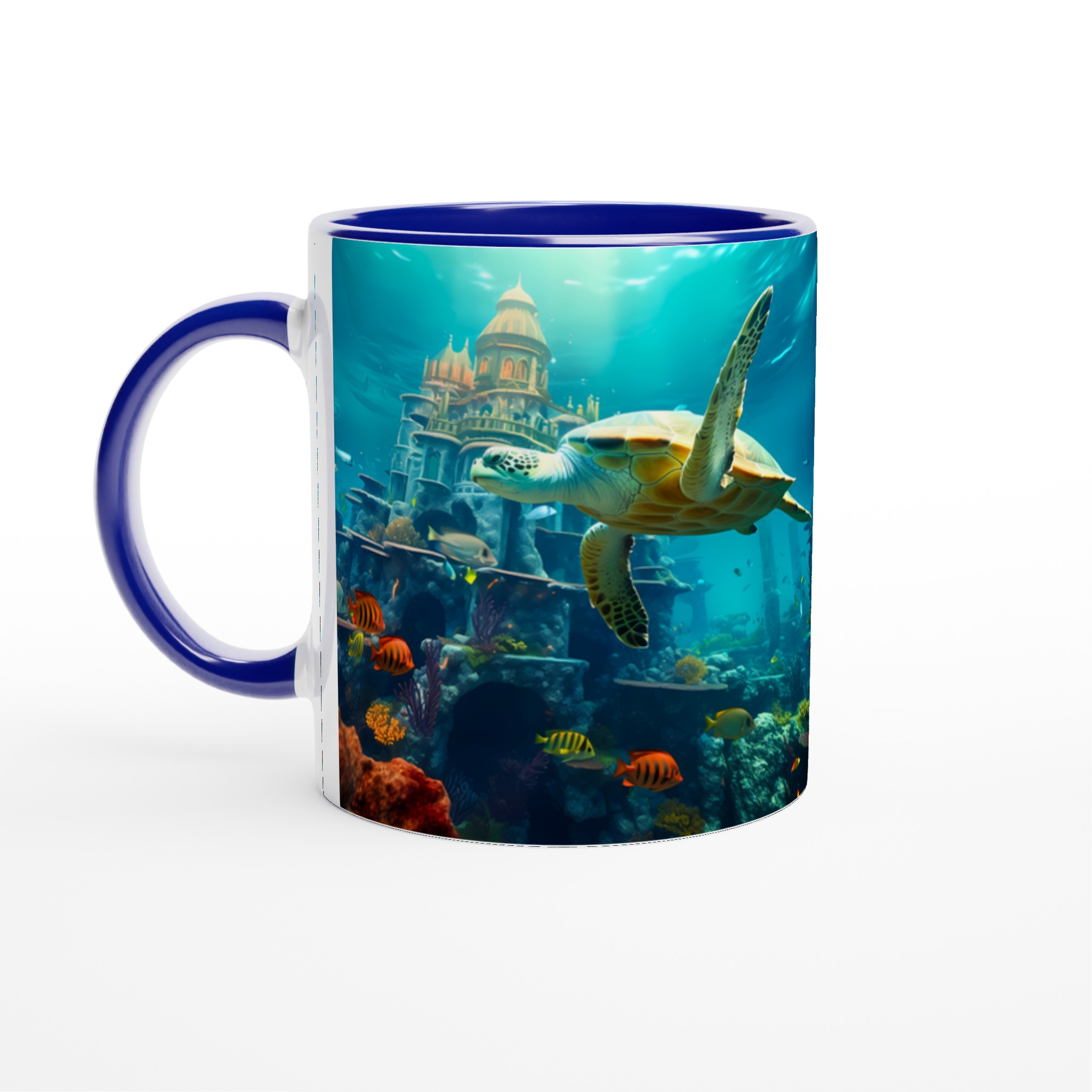 Dyk ner i en värld av under med vår förtrollande keramiska mugg, prydd med ett hisnande undervattensmotiv av majestätiska havssköldpaddor som simmar över ett korallrev och ett mytomspunnet undervattensslott. De levande färgerna och den sagolika stämningen gör varje sip till en liten flykt från vardagen. Den här stilrena keramiska muggen blir snabbt en vardagsfavorit. Perfekt för morgonkaffet, kvällens varma choklad eller när du bara vill njuta av en kopp te.