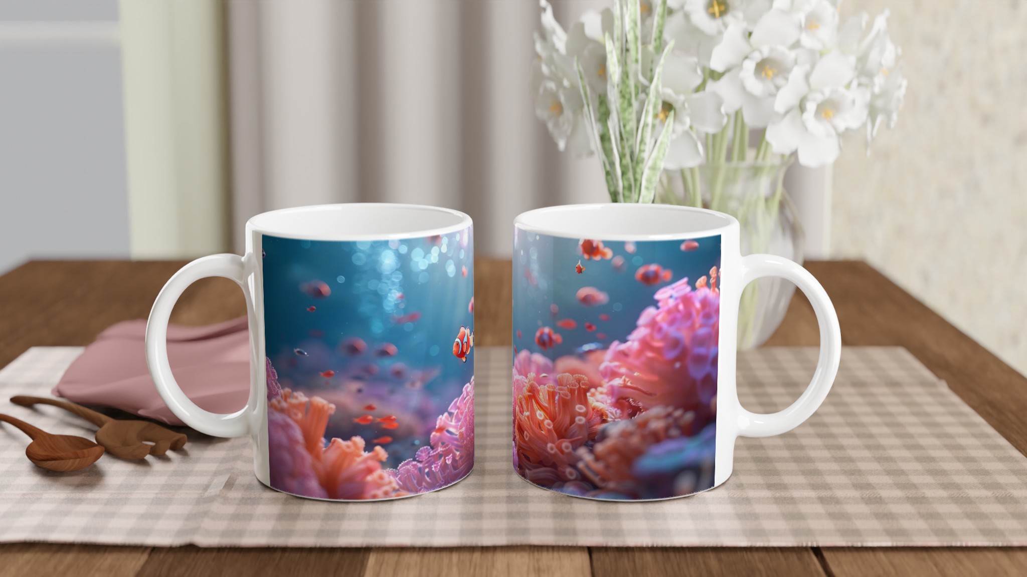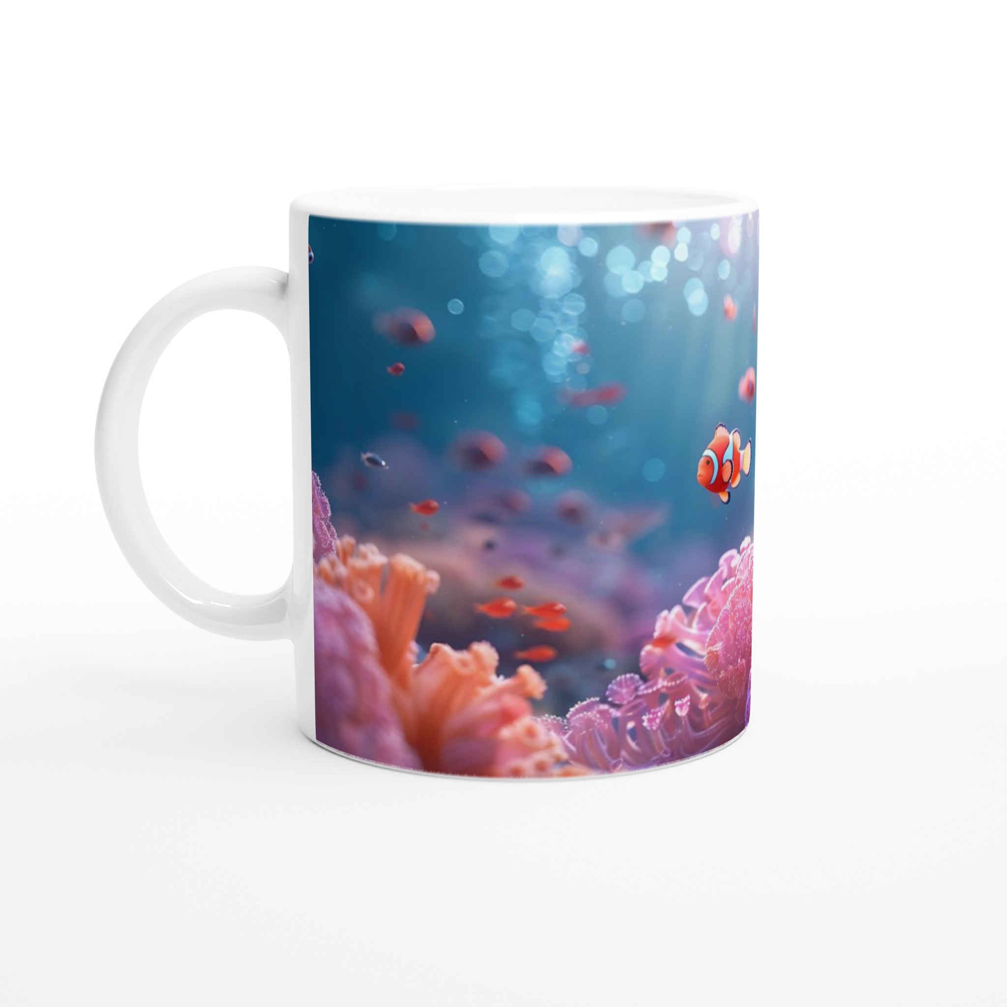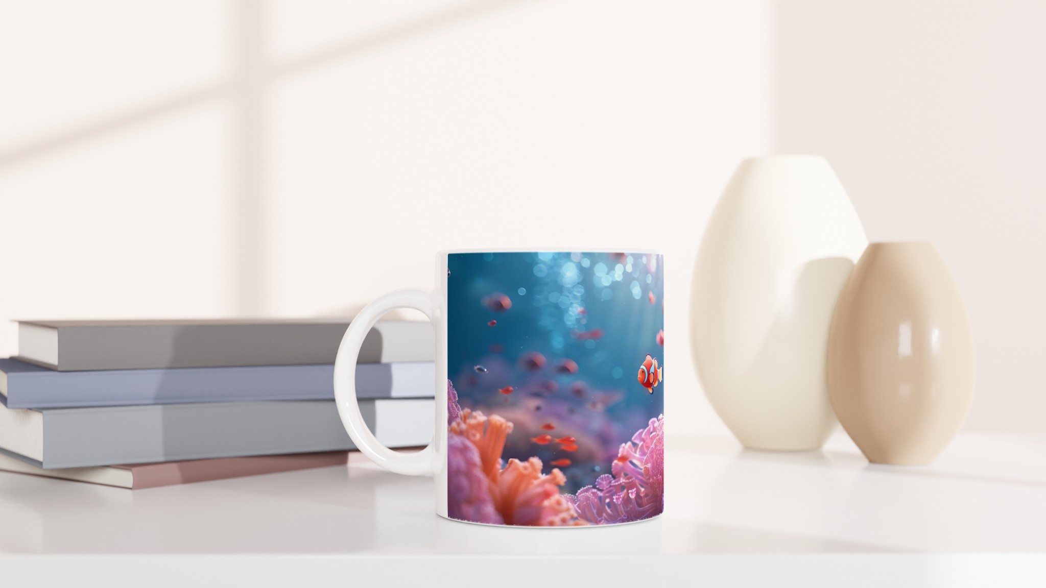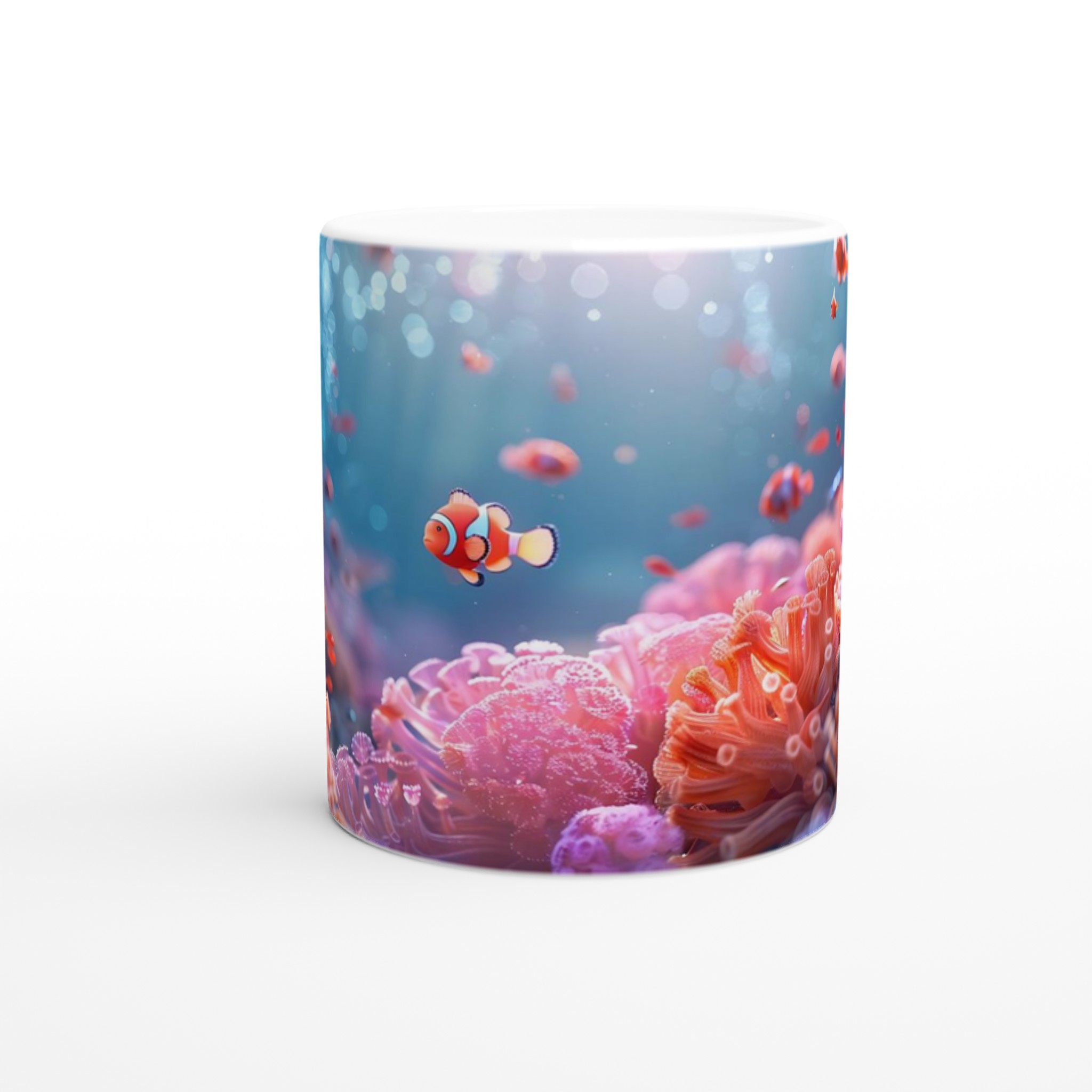 Fånga magin från havets djup med denna förtrollande keramiska mugg, prydd med ett levande undervattensmotiv. Låt dig svepas med av de simmande clownfiskarna och de korallfärgade anemonerna varje gång du njuter av din favoritdryck. Den här stilrena muggen blir snabbt en vardagsfavorit. Perfekt för morgonkaffet, kvällens varma choklad eller när du bara vill njuta av en kopp te. Den blanka ytan gör att trycken framhävs med klara och levande färger, som håller sig fina även efter många turer i mikron och diskmaskinen.