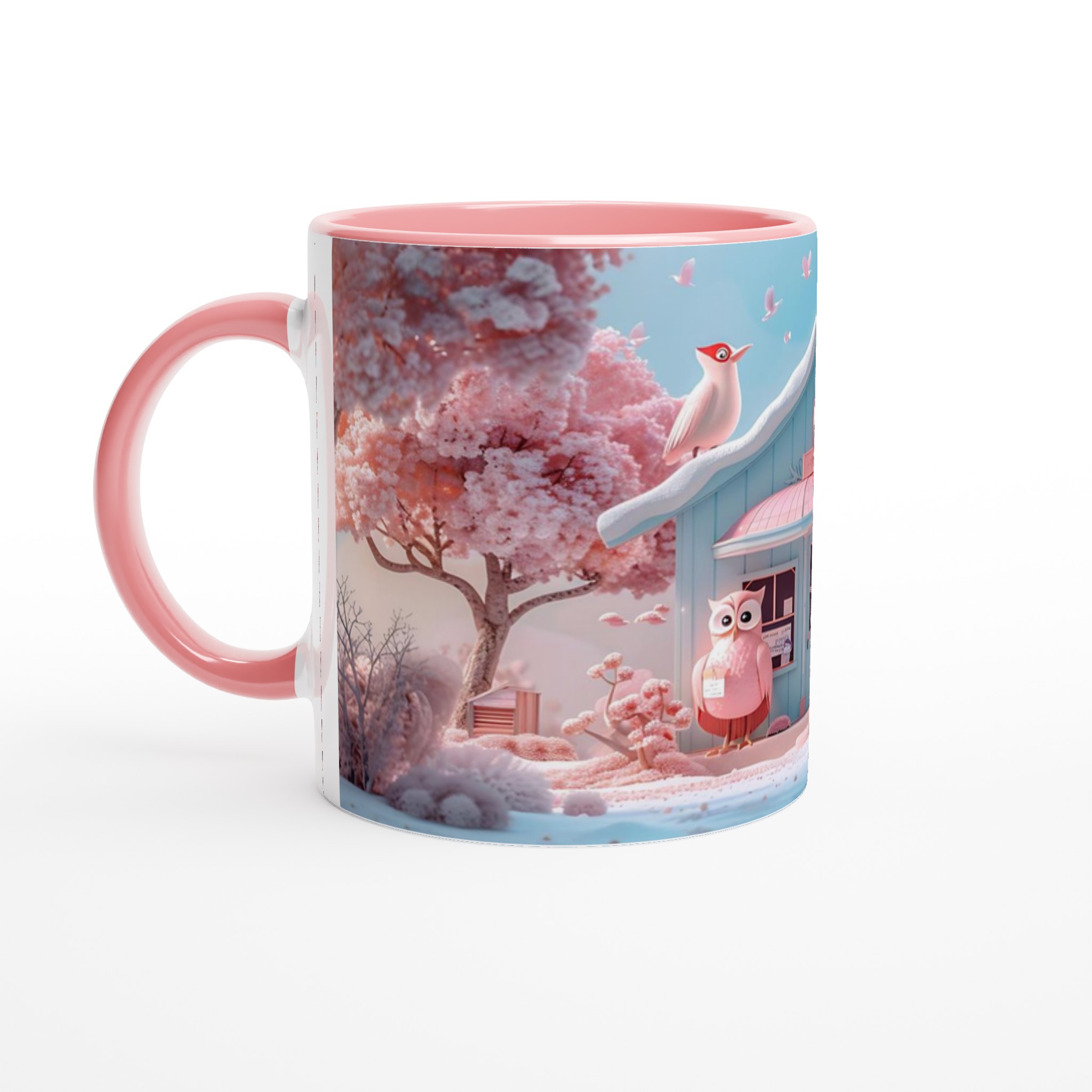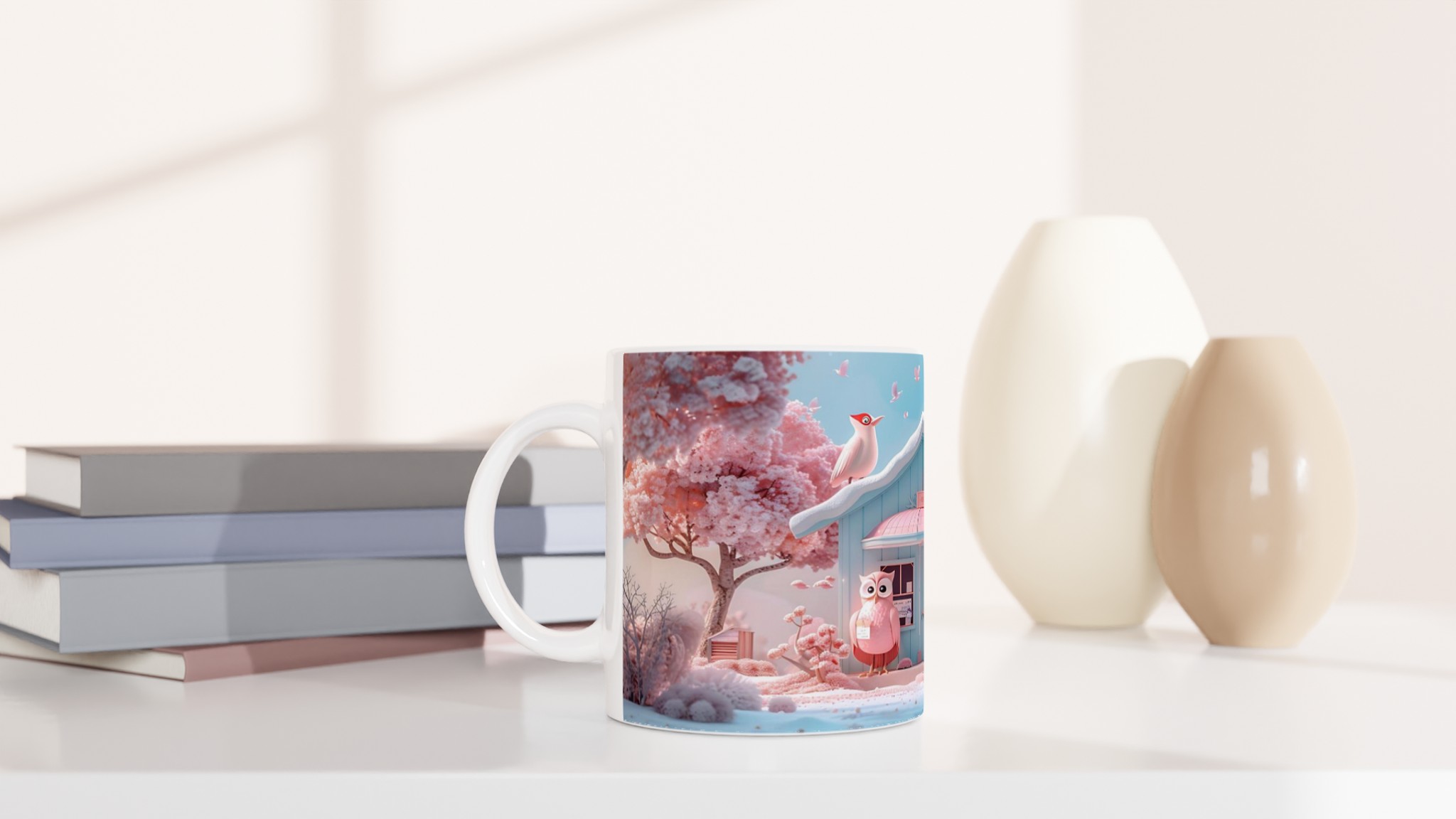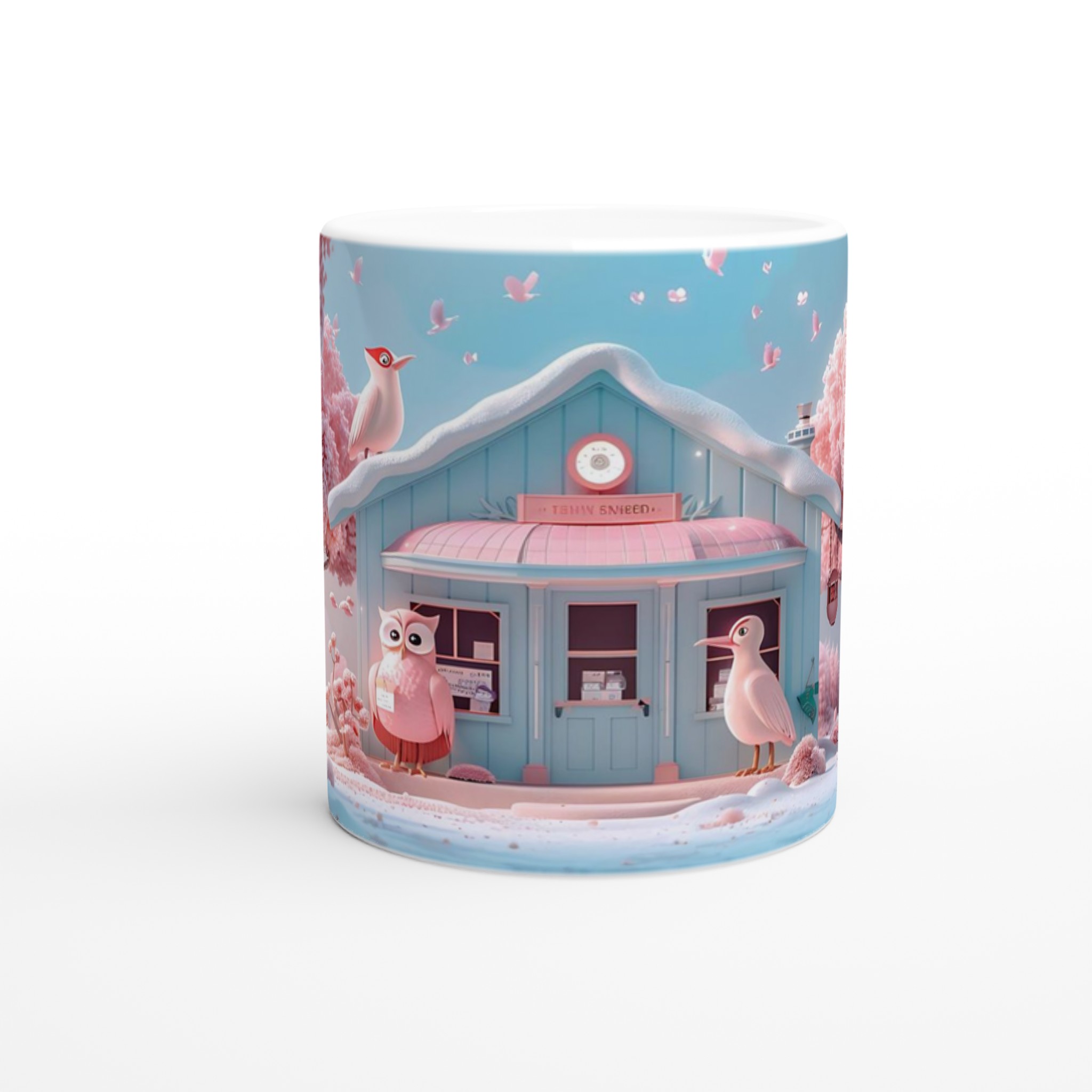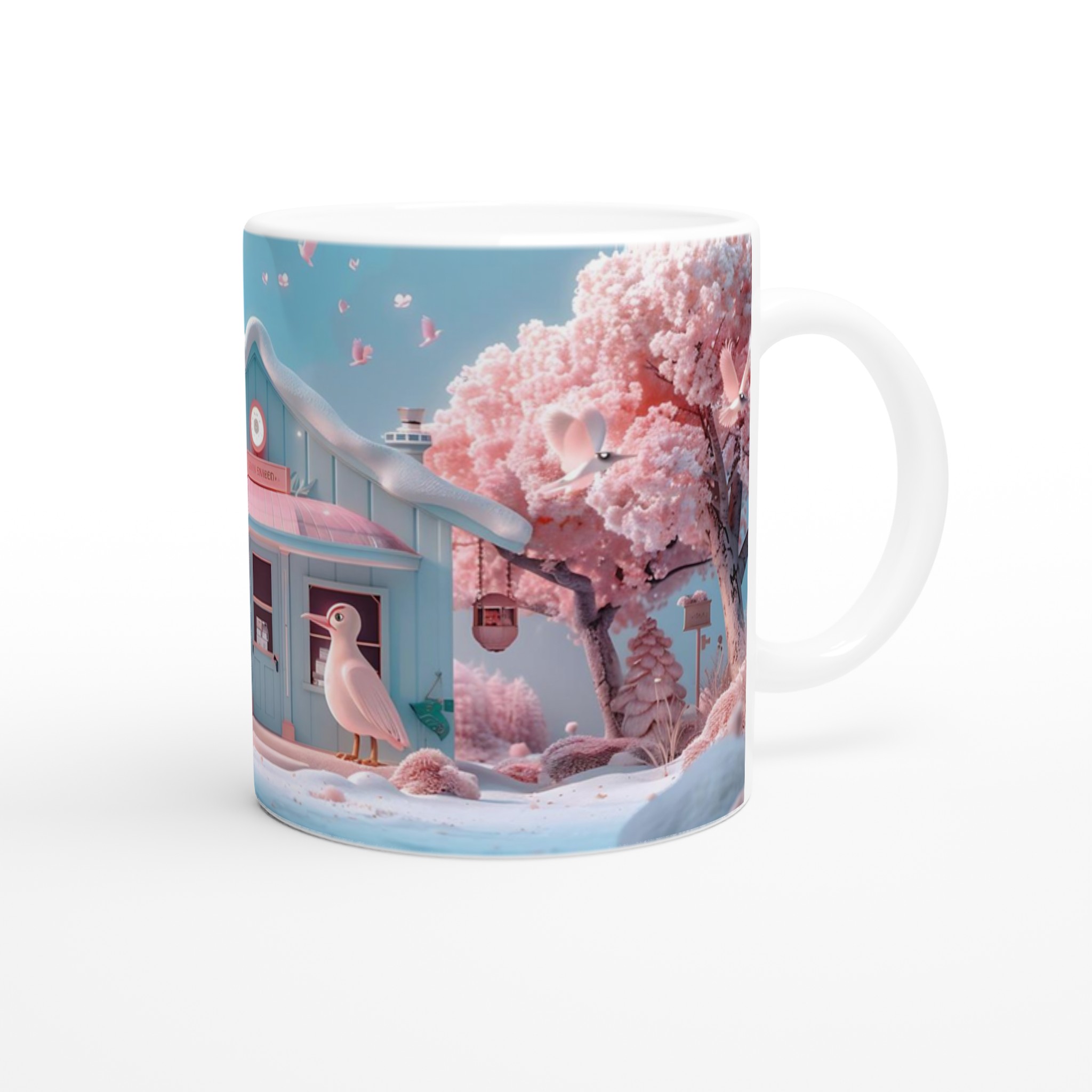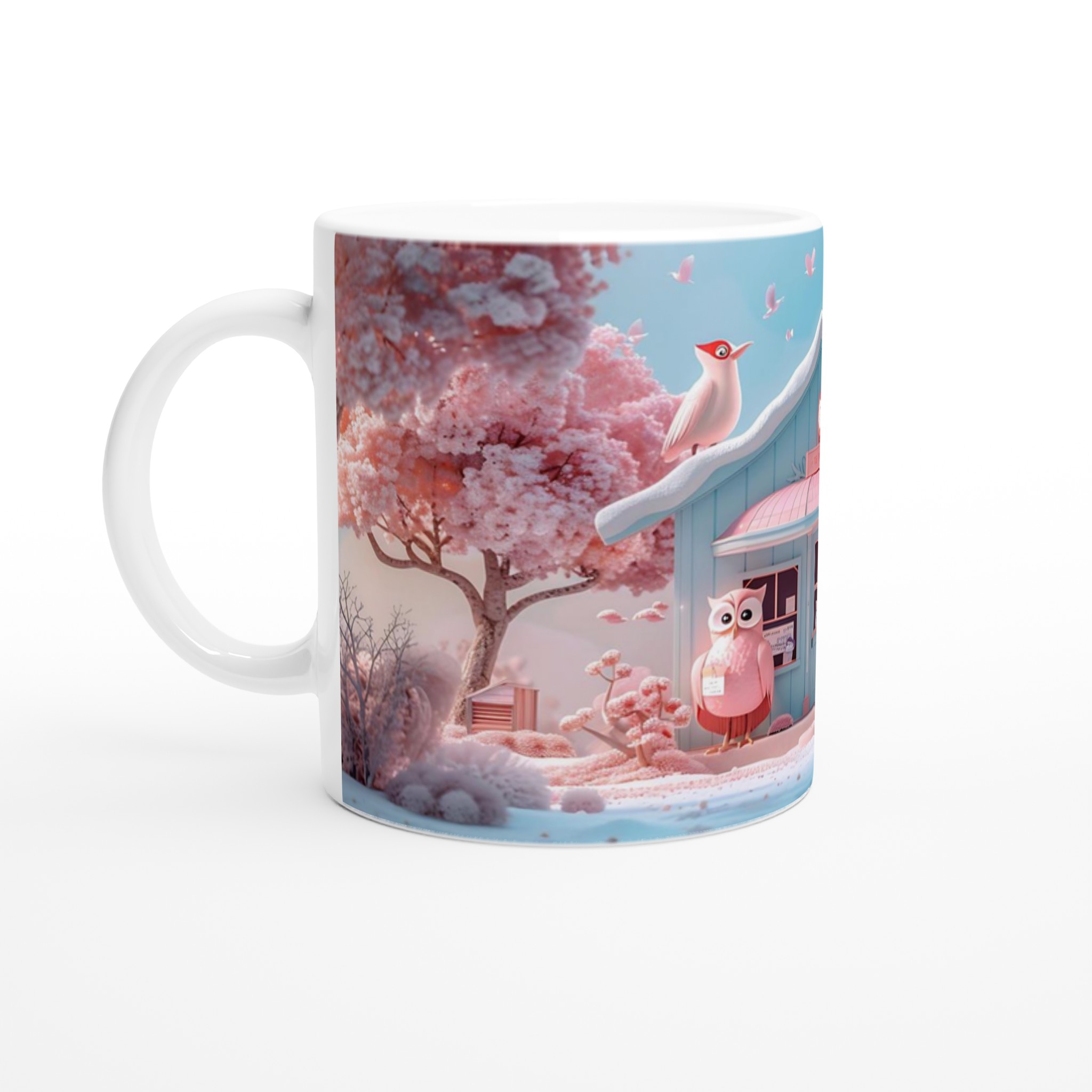 Låt dig svepas bort till en värld av pastellfärger och stillsam charm med vår förtrollande keramiska mugg. Motivet, som andas sötma och magi, visar ett sagolikt vinterlandskap i mjuka rosa och mintgröna toner, fyllt med söta djur och en mysig stuga. Det är den perfekta följeslagaren för ditt morgonkaffe, kvällens varma choklad, eller när du bara vill njuta av en kopp te och drömma dig bort. Den blanka vita ytan framhäver tryckets klara och levande färger, som håller sig fina även efter otaliga turer i mikron och diskmaskinen.