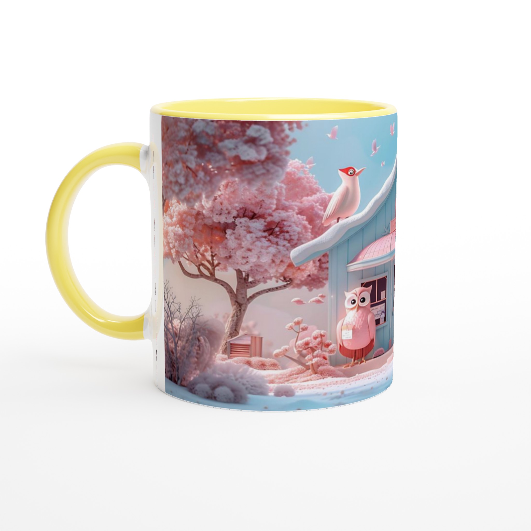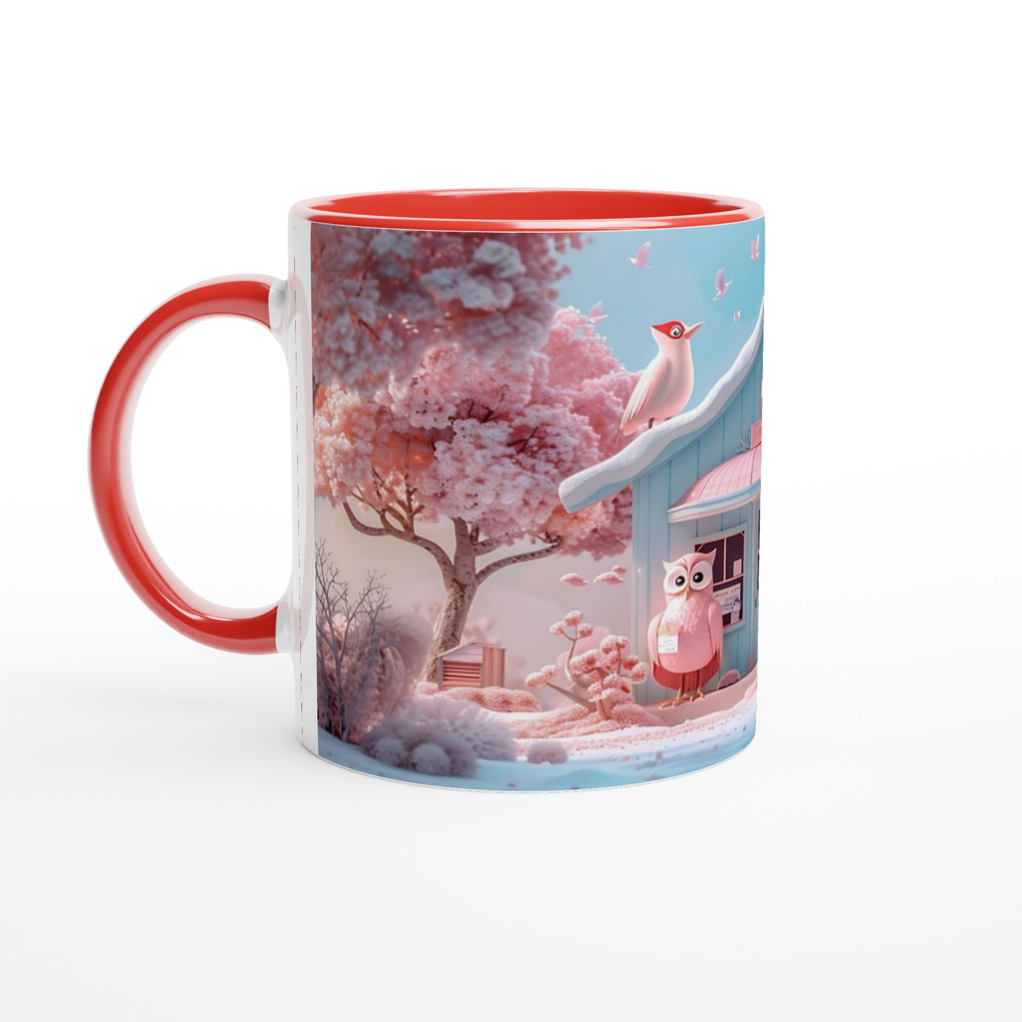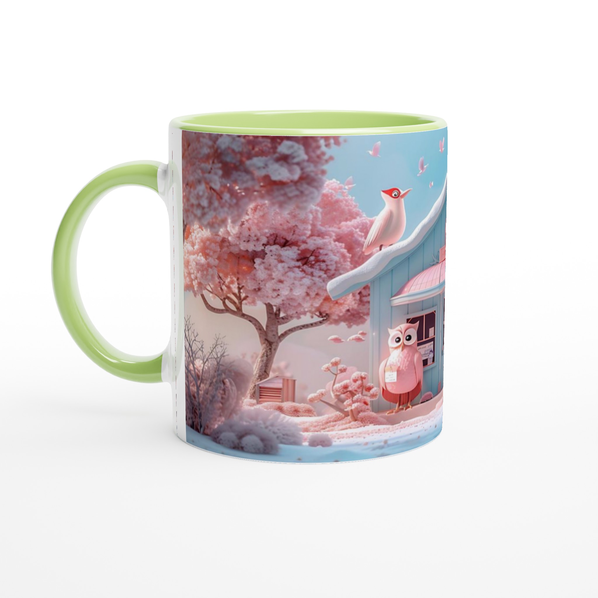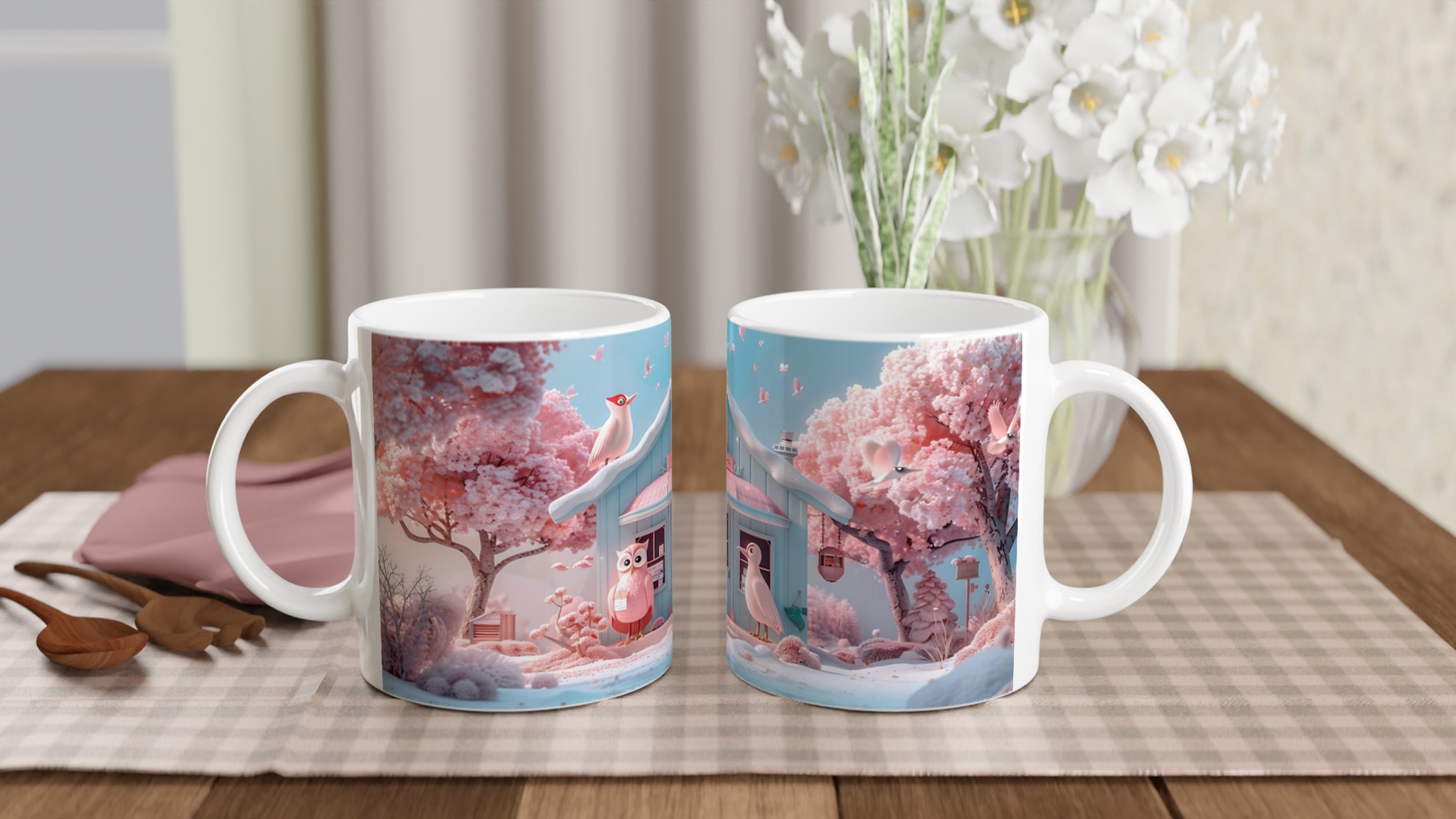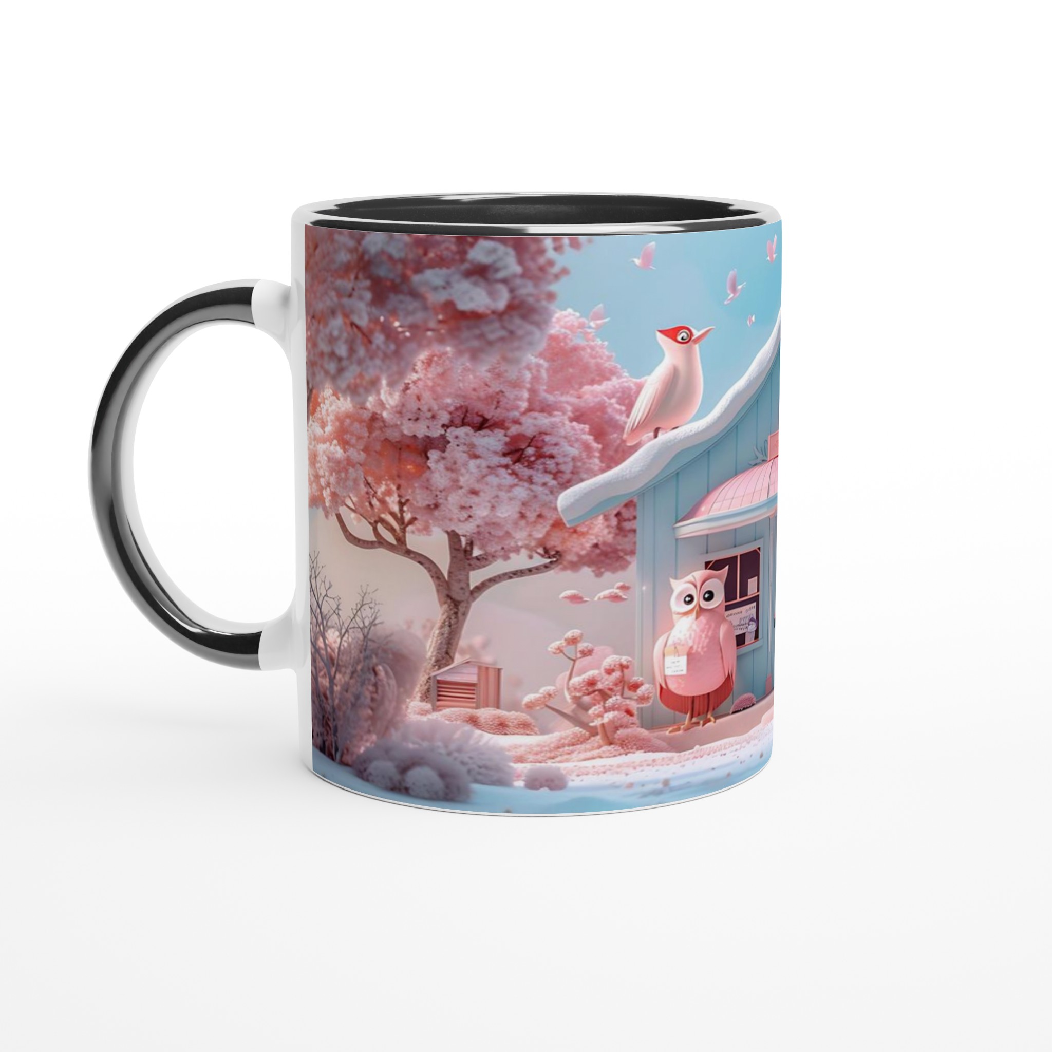 Låt dig svepas bort till en värld av pastellfärger och stillsam charm med vår förtrollande keramiska mugg. Motivet, som andas sötma och magi, visar ett sagolikt vinterlandskap i mjuka rosa och mintgröna toner, fyllt med söta djur och en mysig stuga. Det är den perfekta följeslagaren för ditt morgonkaffe, kvällens varma choklad, eller när du bara vill njuta av en kopp te och drömma dig bort. Den blanka vita ytan framhäver tryckets klara och levande färger, som håller sig fina även efter otaliga turer i mikron och diskmaskinen.